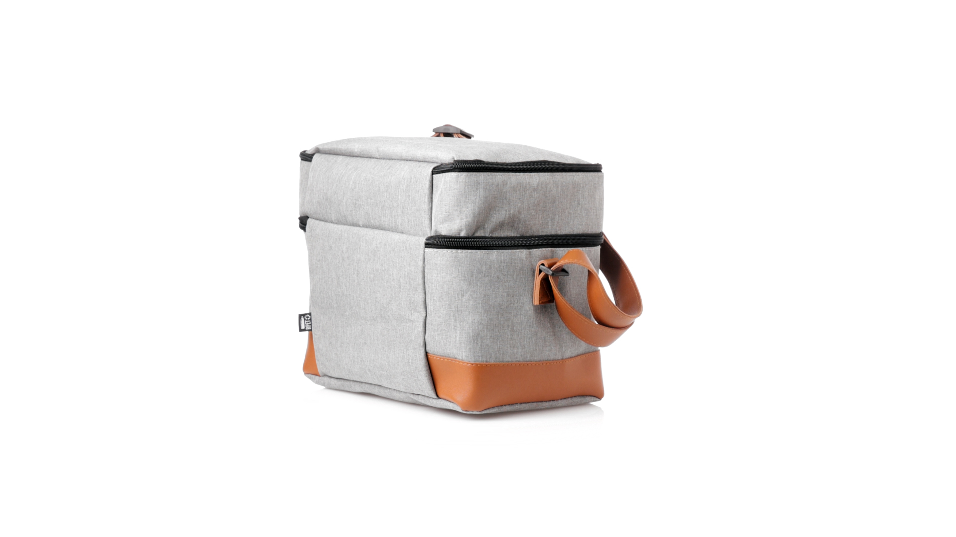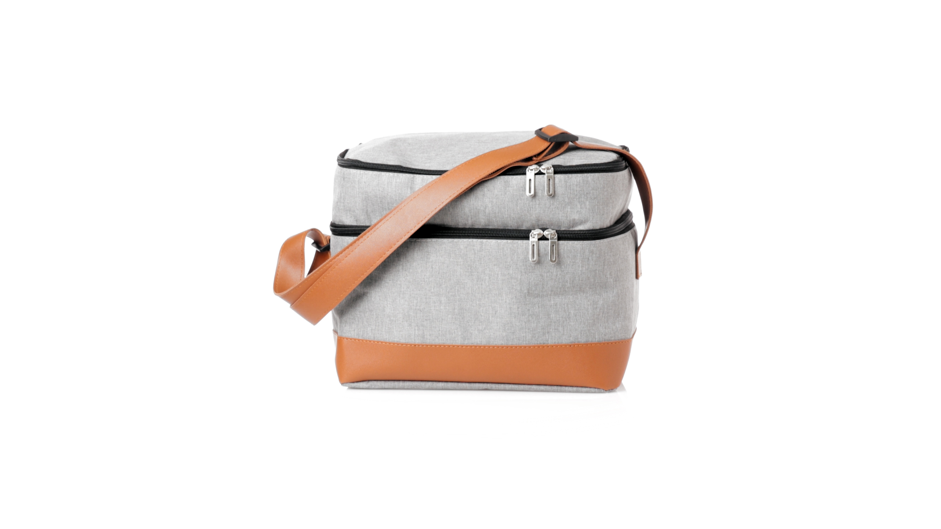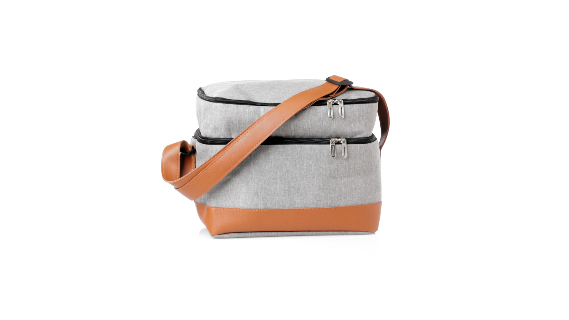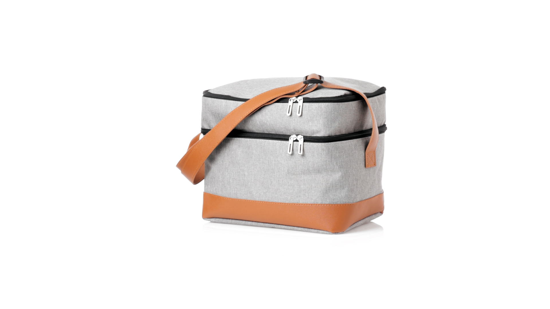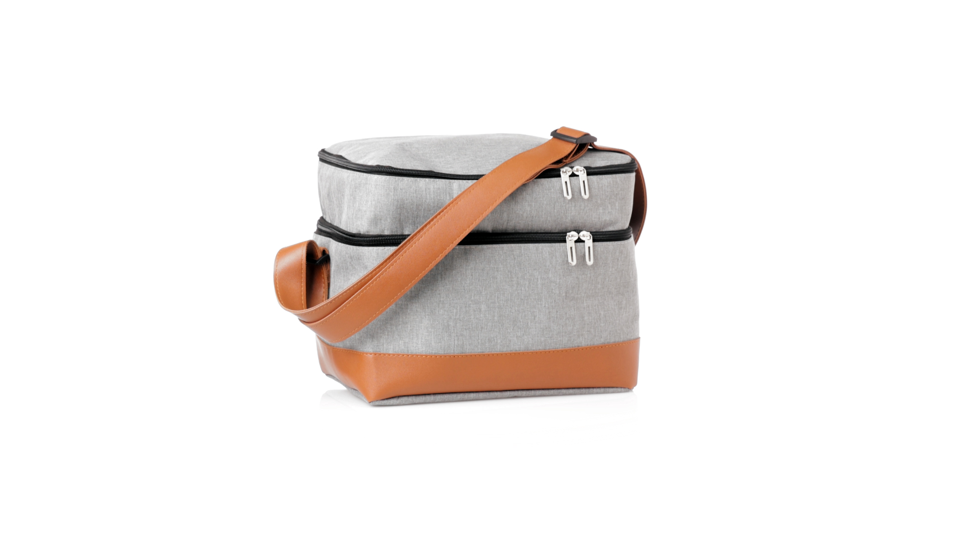 Kühltasche aus widerstandsfähigem 600D RPET. Graue Ausführung, mit braunem PU-Lederboden und Schulterriemen. Mit 2 unabhängigen Fächern, mit Reissverschluss und Metallziehern. Isothermisches PEVA-Innen- und Aussenetikett mit dem RPET-Emblem.Das RPET-Material wird aus recyceltem Kunststoff hergestellt, um die Wiederverwendung von Kunststoffabfällen zu fördern und einen Beitrag zur Nachhaltigkeit unseres Planeten zu leisten.