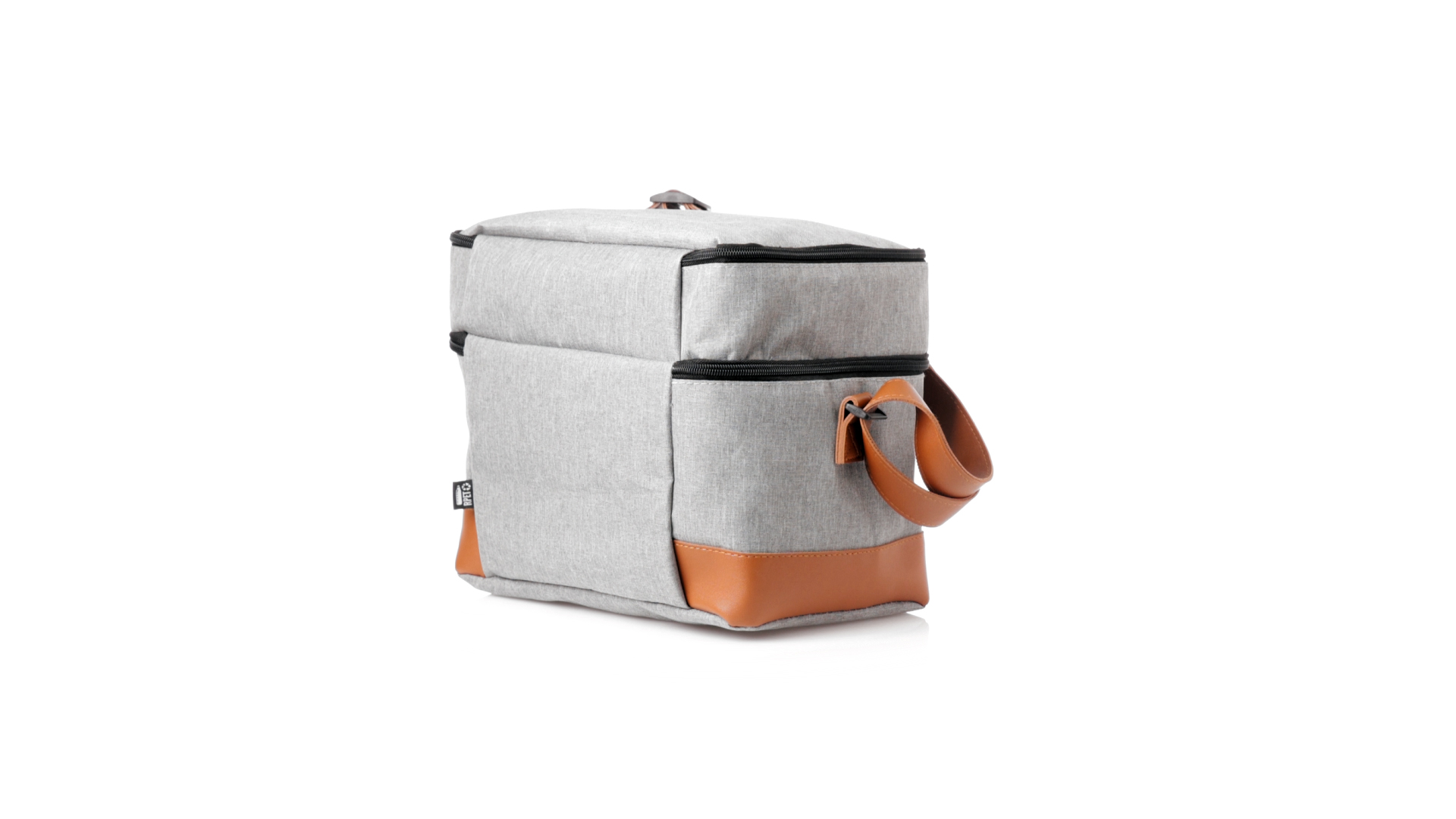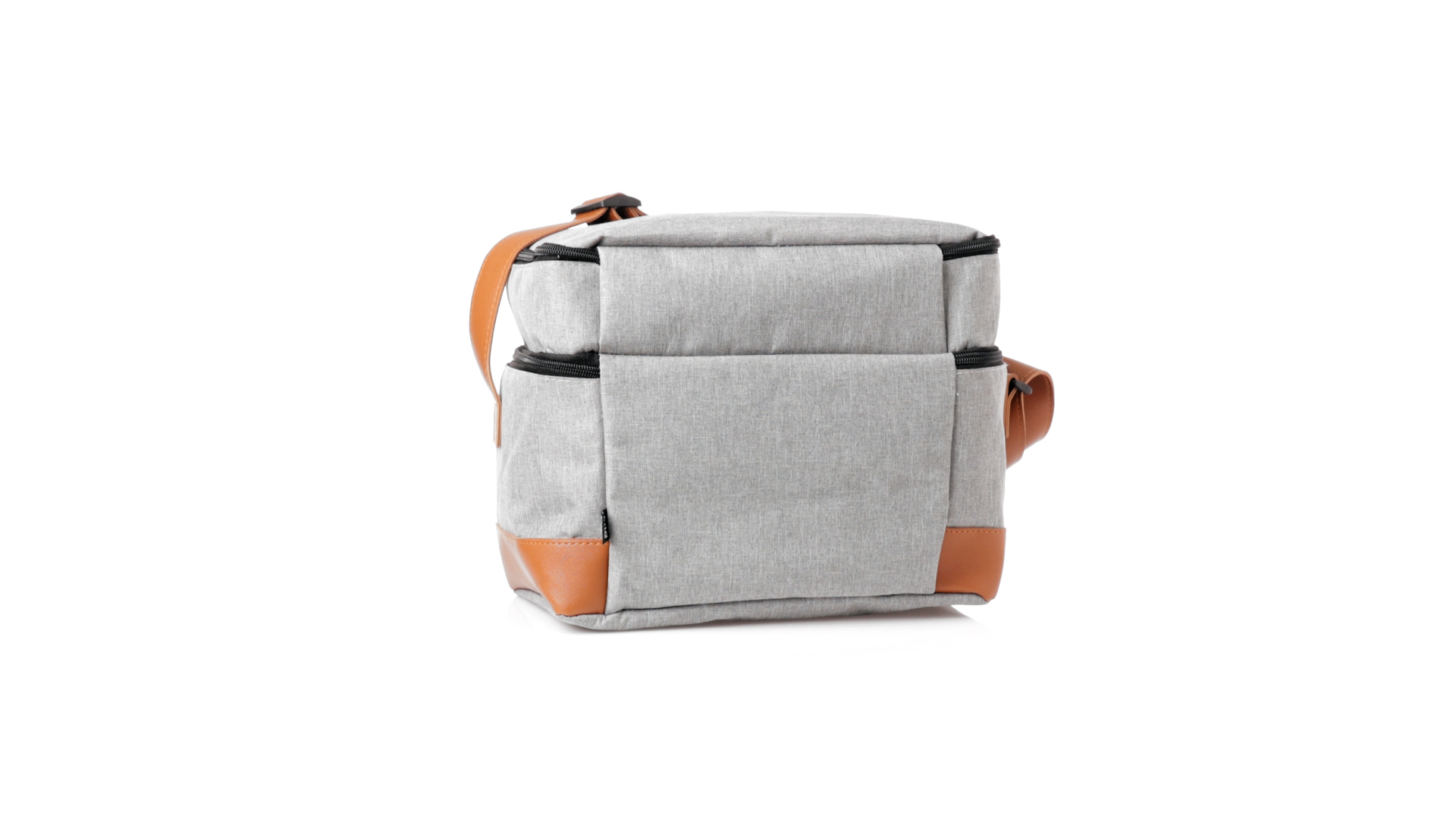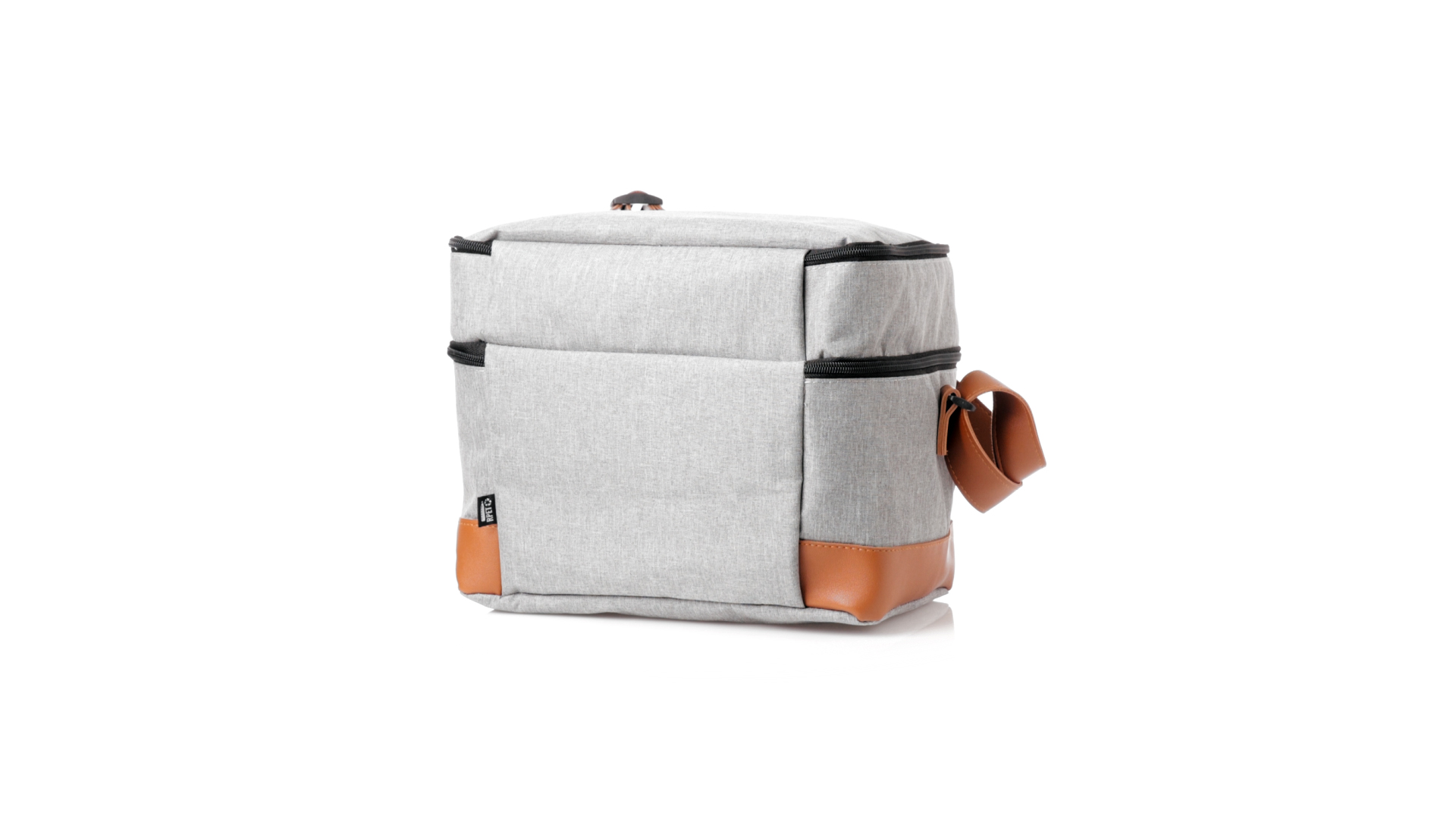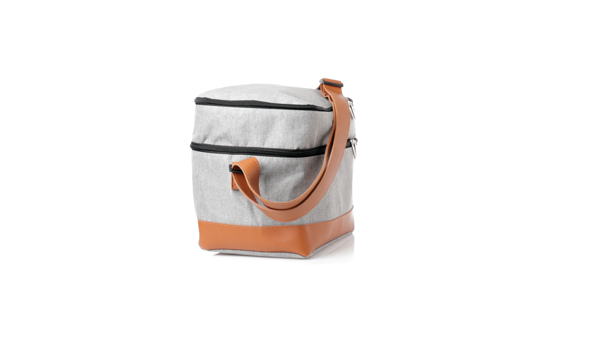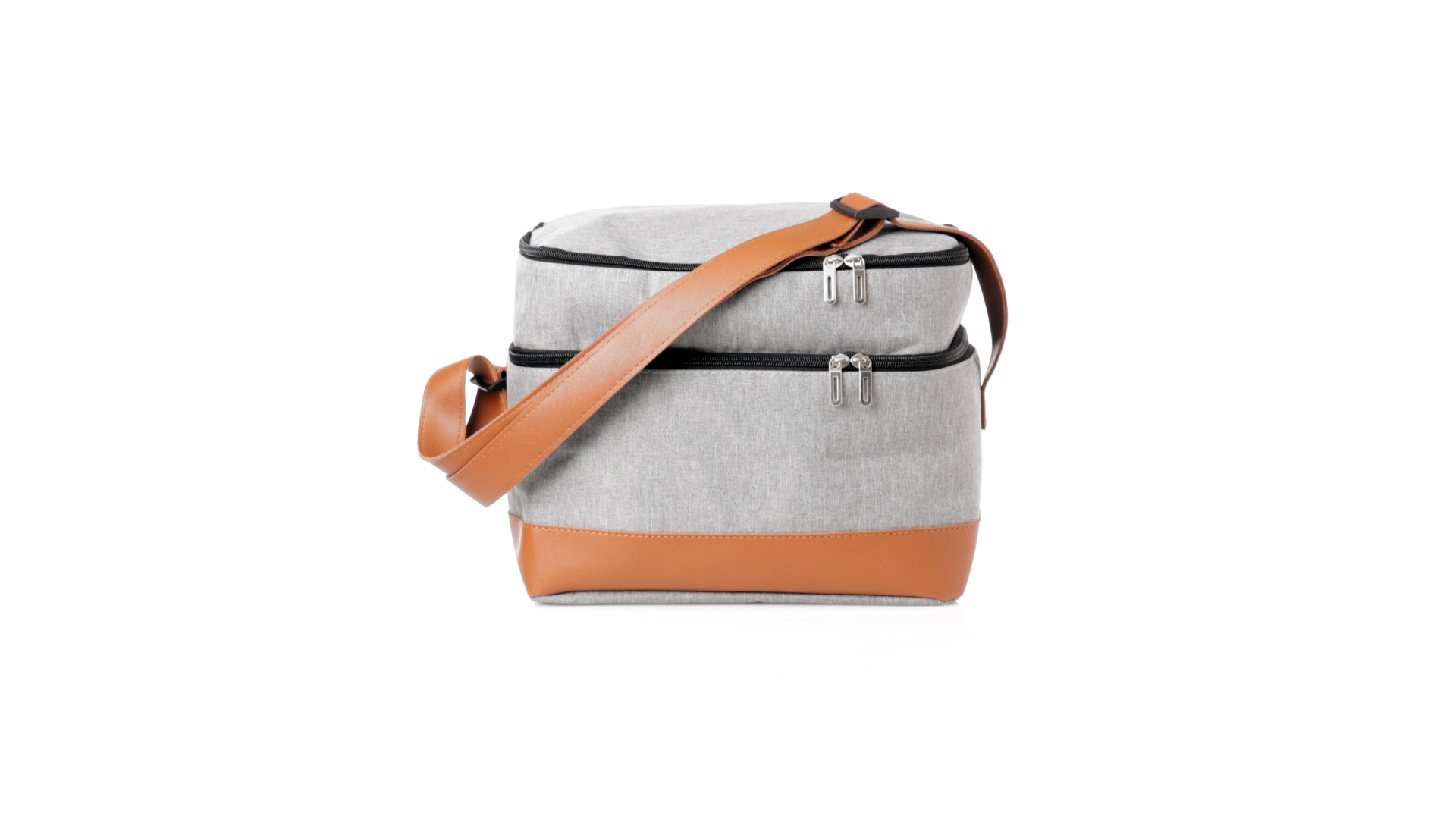 Kühltasche aus widerstandsfähigem 600D RPET. Graue Ausführung, mit braunem PU-Lederboden und Schulterriemen. Mit 2 unabhängigen Fächern, mit Reissverschluss und Metallziehern. Isothermisches PEVA-Innen- und Aussenetikett mit dem RPET-Emblem.Das RPET-Material wird aus recyceltem Kunststoff hergestellt, um die Wiederverwendung von Kunststoffabfällen zu fördern und einen Beitrag zur Nachhaltigkeit unseres Planeten zu leisten.