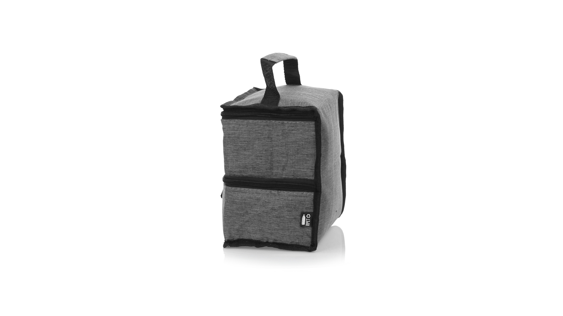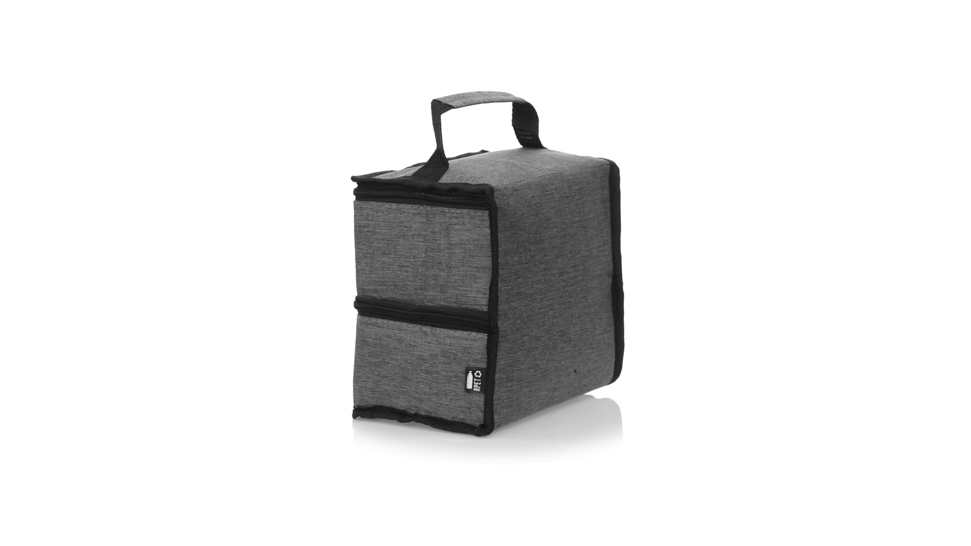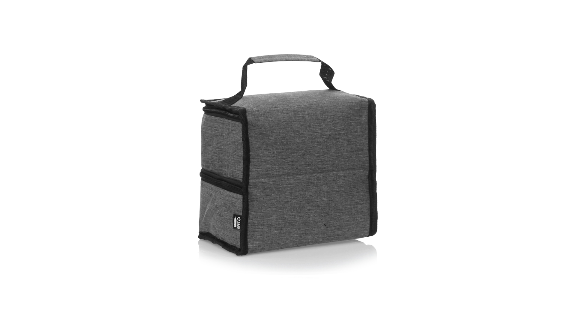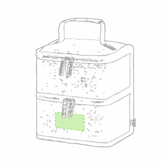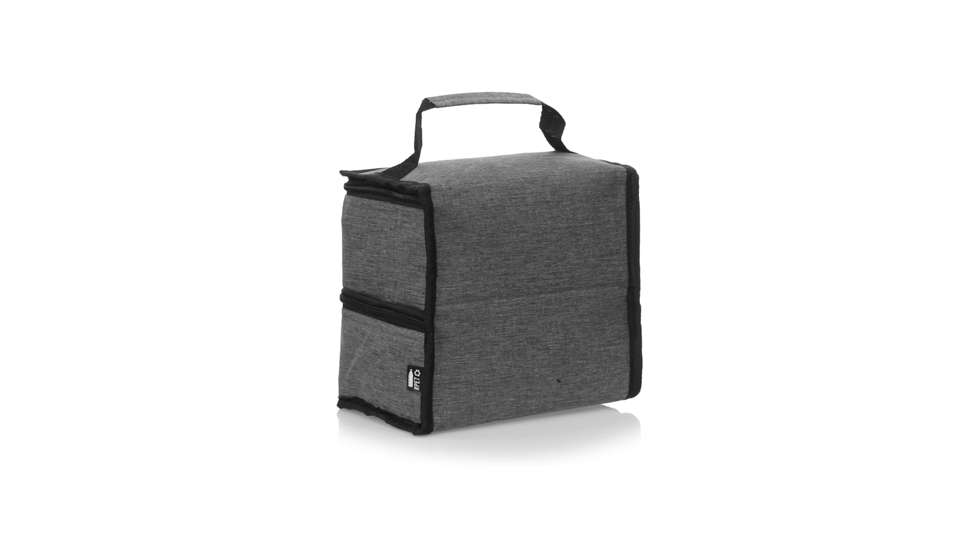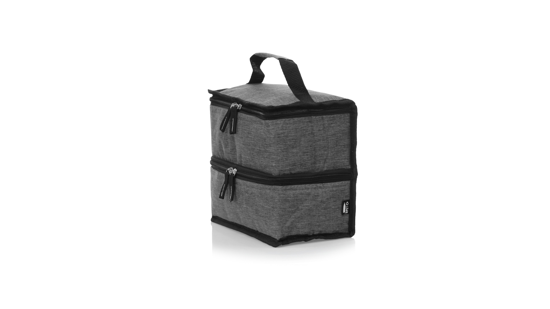 Linie "Natur" Praktische, Kühltasche mit zwei Fächern. Hergestellt aus hochwertigem 600D RPET-Polyester, das aus recyceltem Kunststoff hergestellt wird, um die Wiederverwendung von Kunststoffabfällen zu fördern und zur Nachhaltigkeit unseres Planeten beizutragen. Verstärkter Tragegriff, 2 Fächer mit Reissverschluss und doppeltem Stoffabzieher, mit RPET-Emblem auf dem Aussenetikett: Oberes Fach zum Halten der Wärme, mit isothermischer Innenseite aus Aluminium. Unteres Fach für die Kälte, mit isothermischer Innenseite aus PEVA