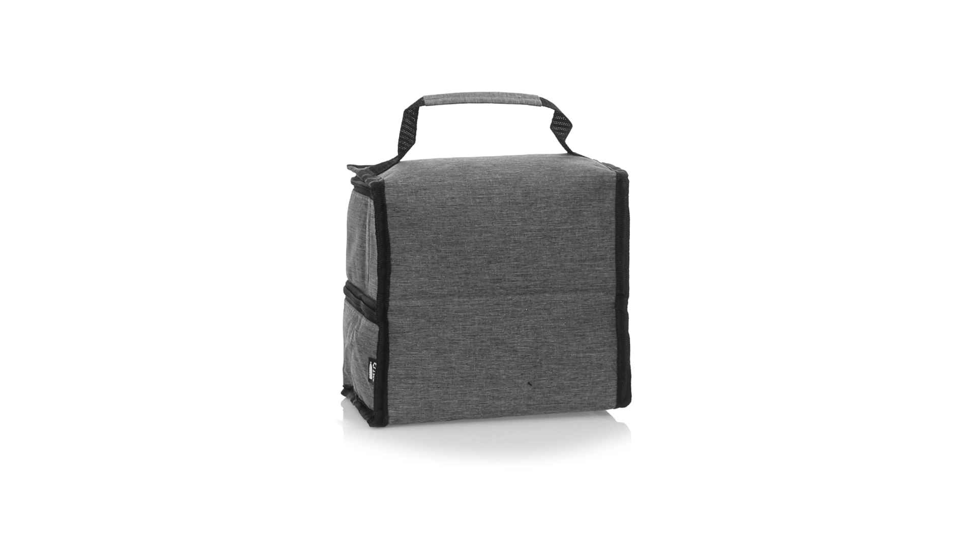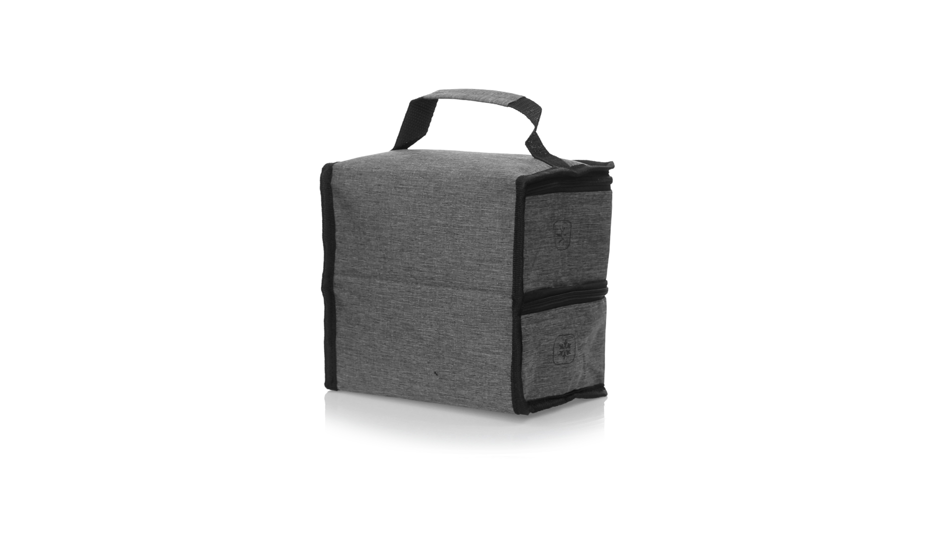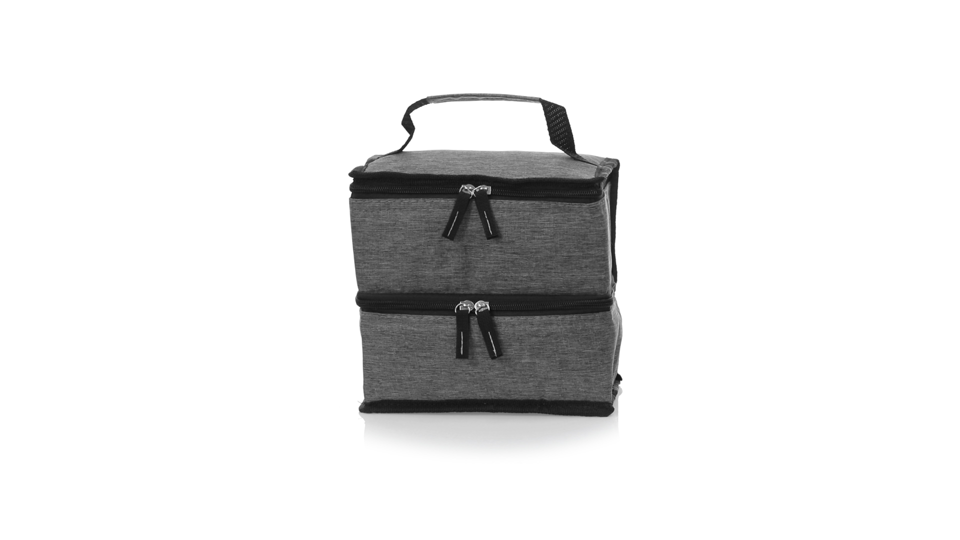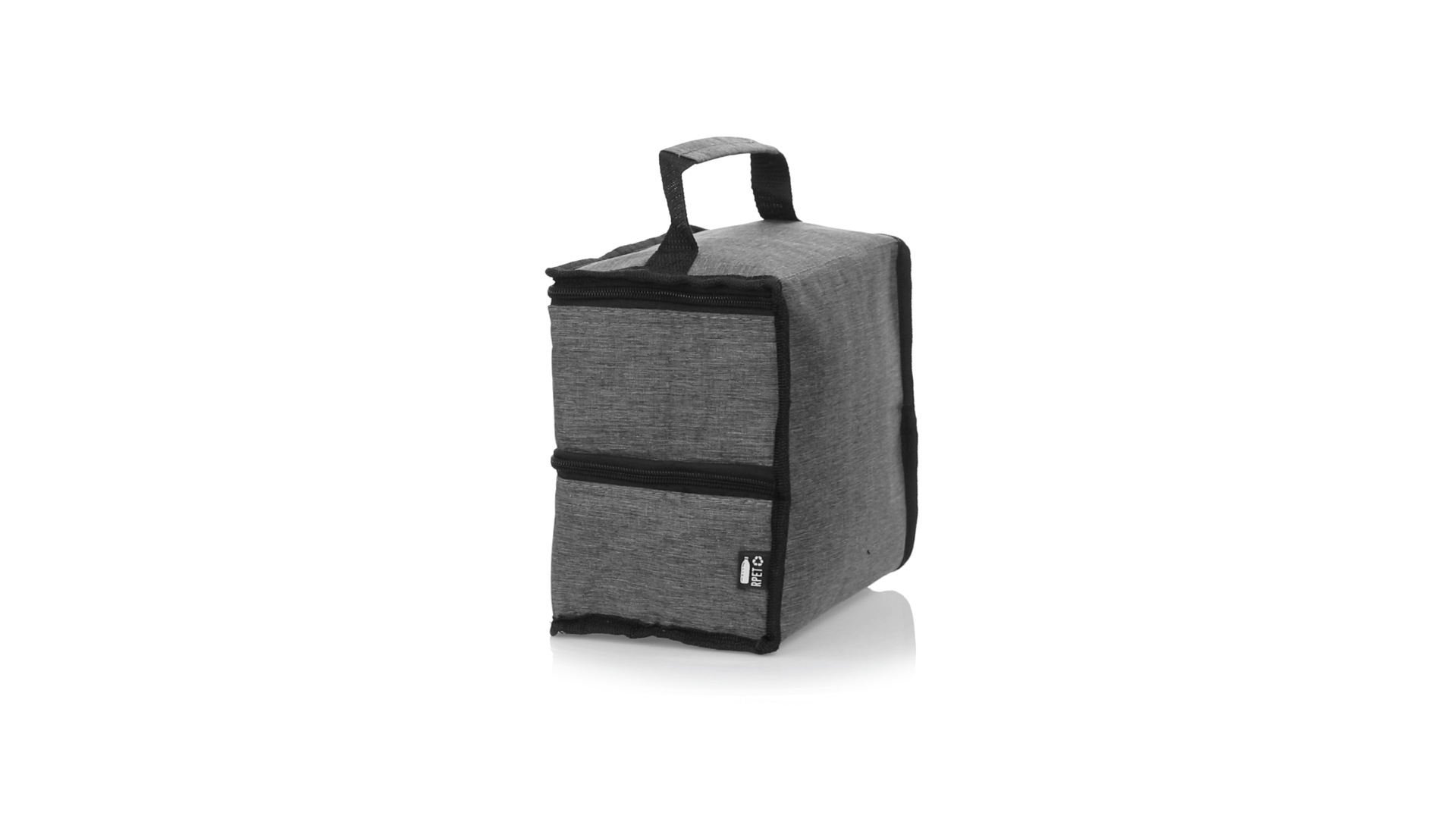 Linie "Natur" Praktische, Kühltasche mit zwei Fächern. Hergestellt aus hochwertigem 600D RPET-Polyester, das aus recyceltem Kunststoff hergestellt wird, um die Wiederverwendung von Kunststoffabfällen zu fördern und zur Nachhaltigkeit unseres Planeten beizutragen. Verstärkter Tragegriff, 2 Fächer mit Reissverschluss und doppeltem Stoffabzieher, mit RPET-Emblem auf dem Aussenetikett: Oberes Fach zum Halten der Wärme, mit isothermischer Innenseite aus Aluminium. Unteres Fach für die Kälte, mit isothermischer Innenseite aus PEVA