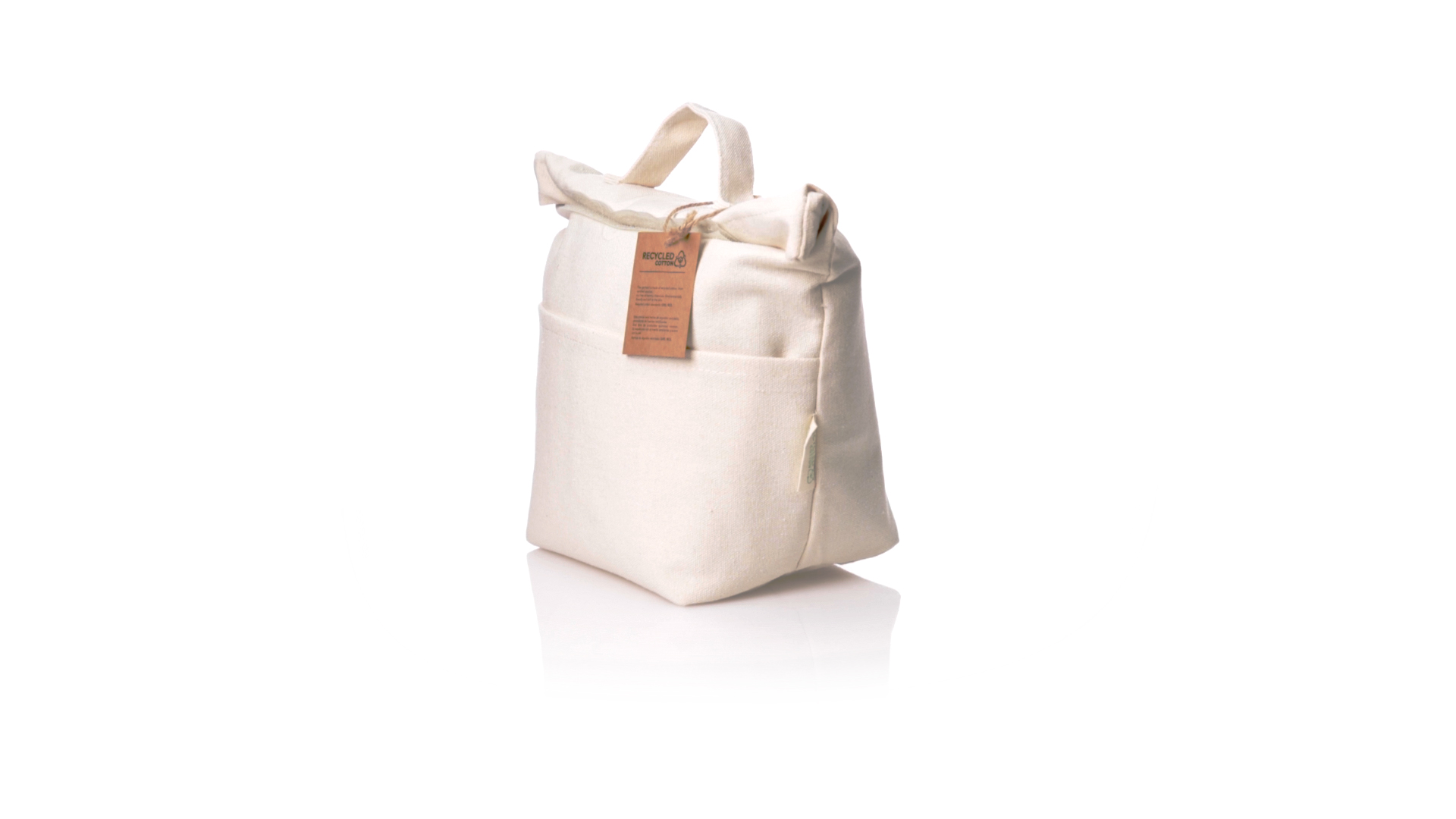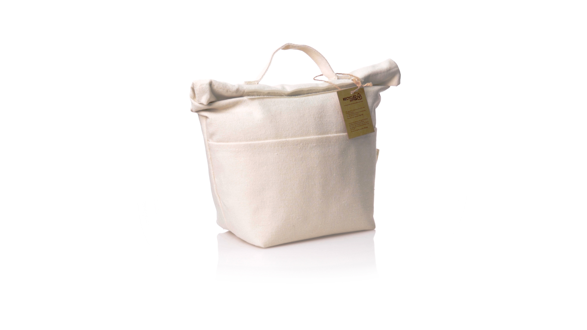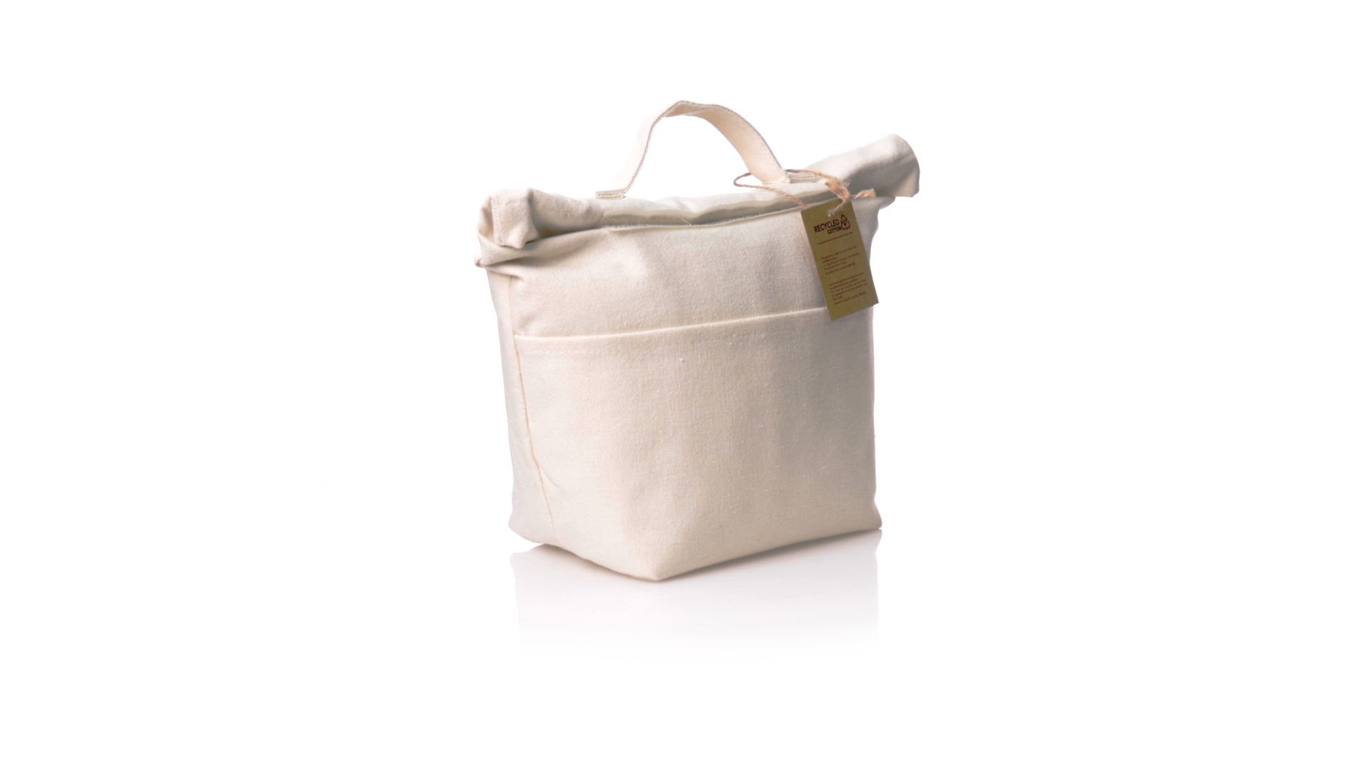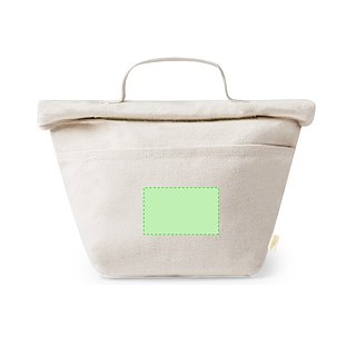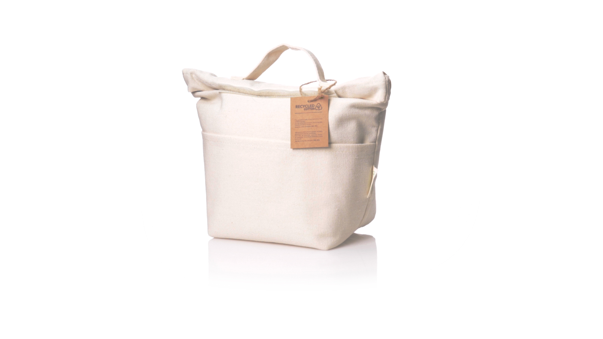 Thermobeutel aus 100 % recyceltem Baumwollmaterial, mit isothermischer Innenseite mit PEVA-Beschichtung zur Aufrechterhaltung der Temperatur. Sie wird mit einem praktischen Klettverschluss verschlossen und verfügt über eine Aussentasche. Mit Griff zum einfachen Tragen. Mit Recycling-Baumwoll-Etikett und präsentiert in einer individuellen Recycling-Tasche.