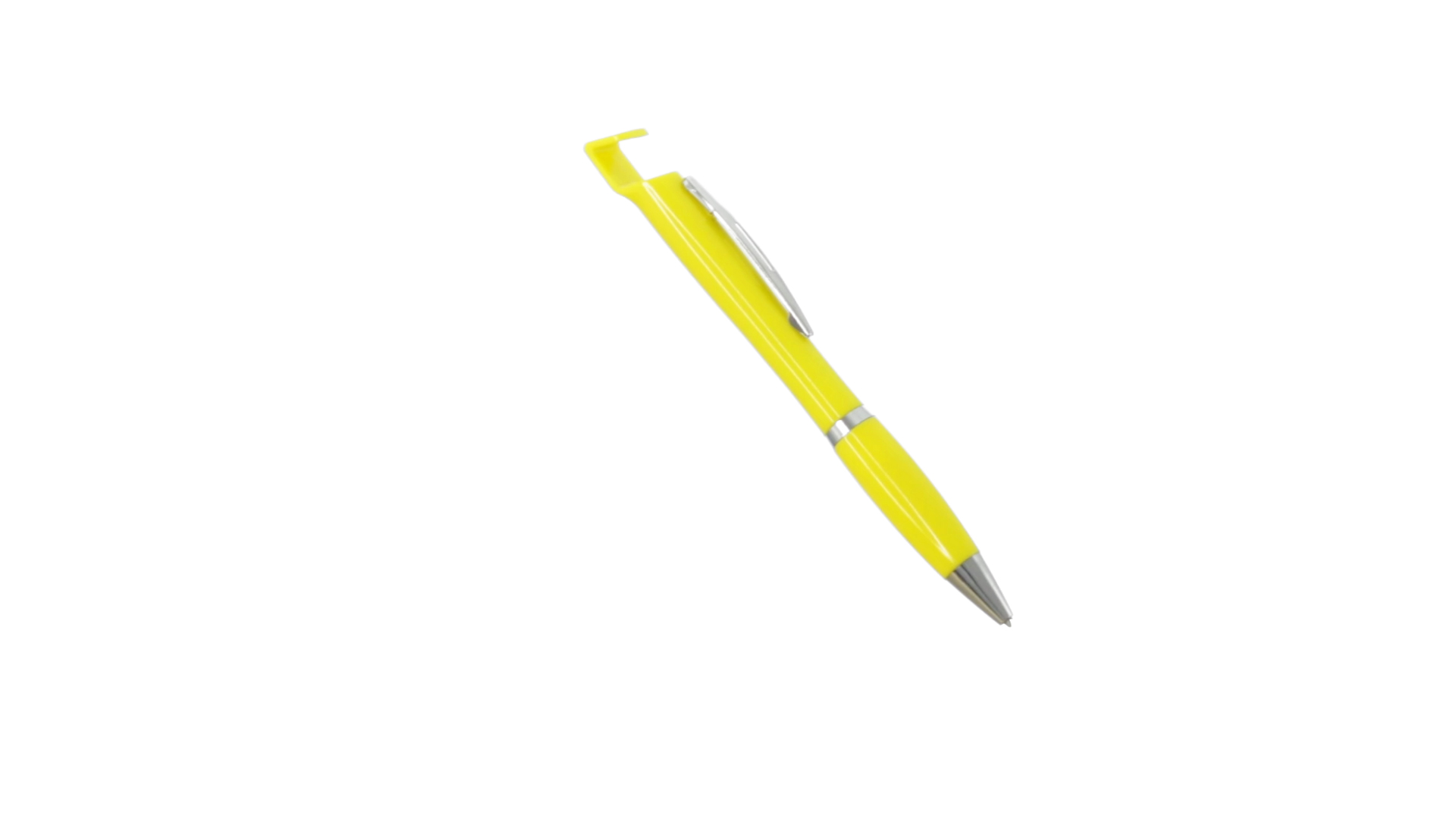 Druck-Kugelschreiber mit Ständer für Mobilgerät sowie auffälligem zweifarbigem Design mit Kontrastdetails in Silber und geschmeidigem Schaft in lebhaften soliden Farben. Mit originellem gestanztem Metallclip in passender Farbe und komfortablem Griff. Blaue Tinte.