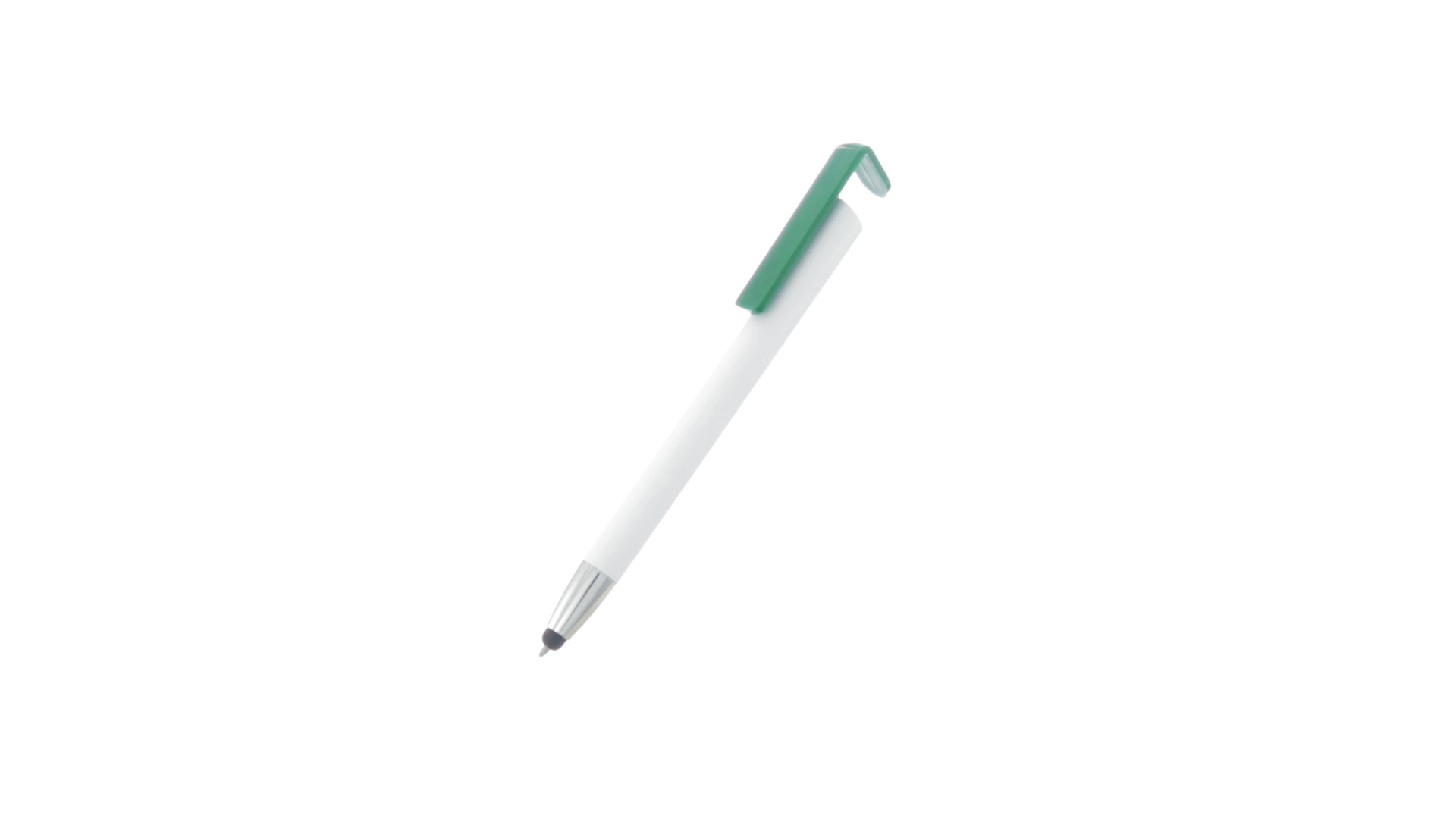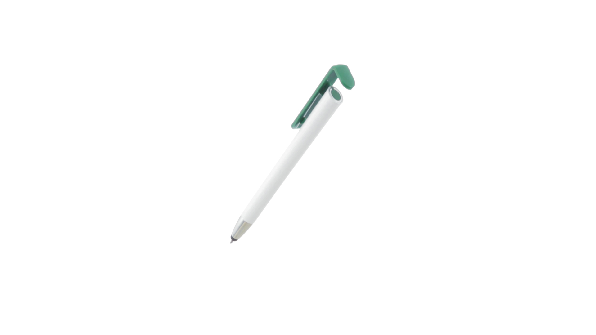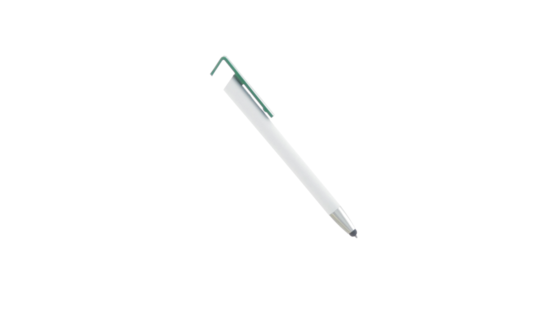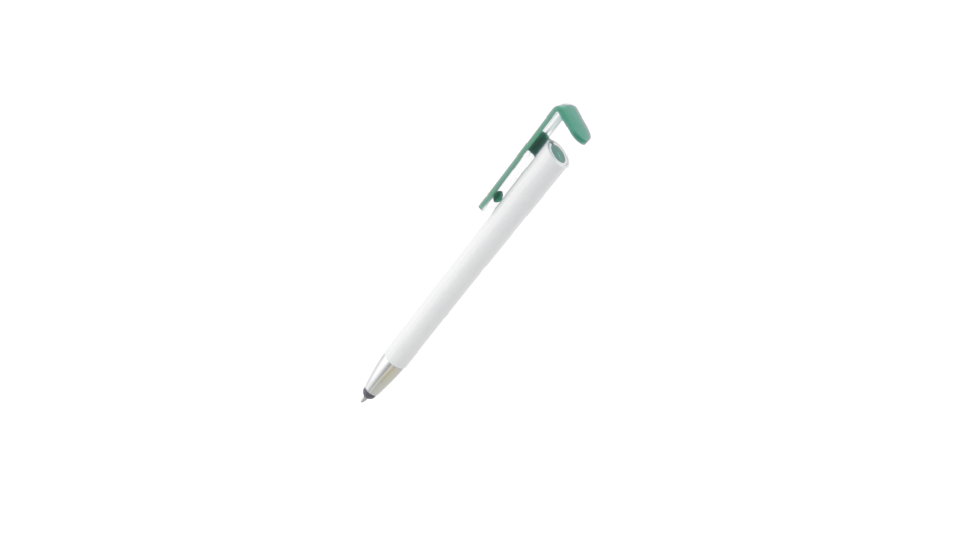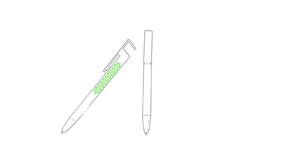 Origineller Druck-Kugelschreiber mit im Clip integriertem Ständer für Mobilgeräte. Mit auffälligem zweifarbigem Design und Schaft in glänzendem Weiss. Clip in auffälligen Farben und Spitze in glänzendem Silber. Blaue Tinte.