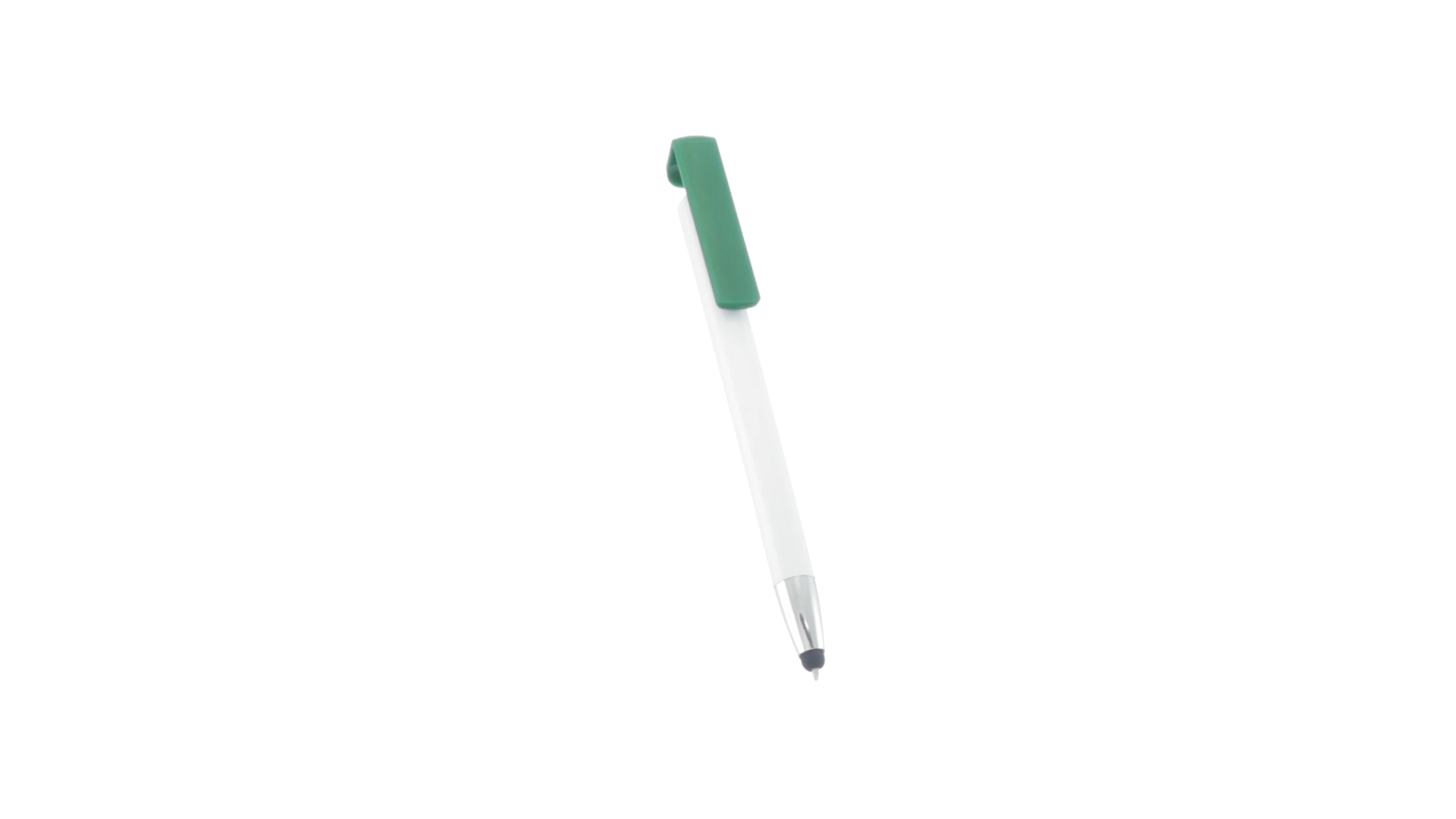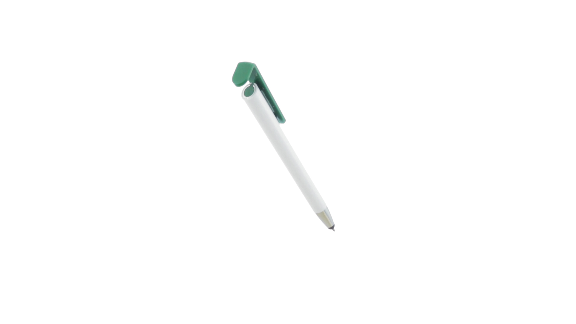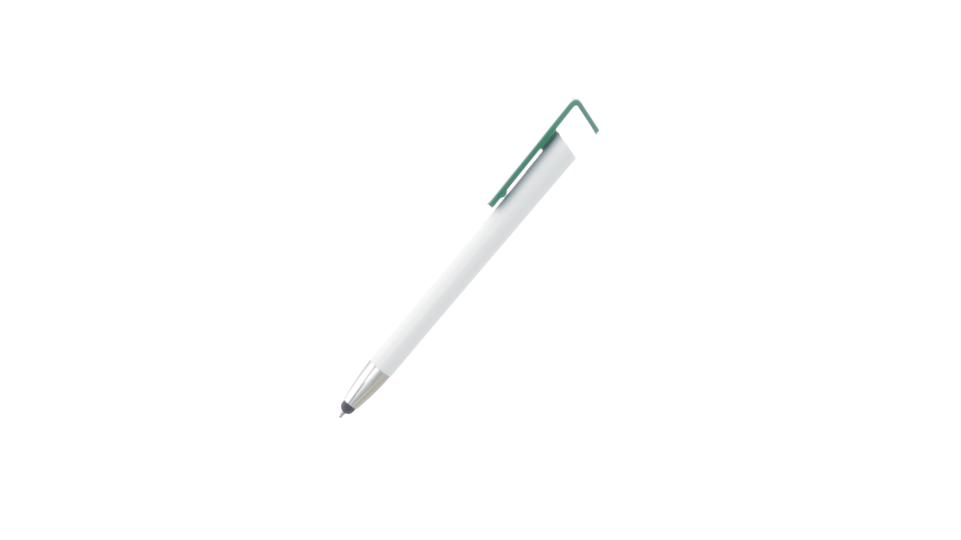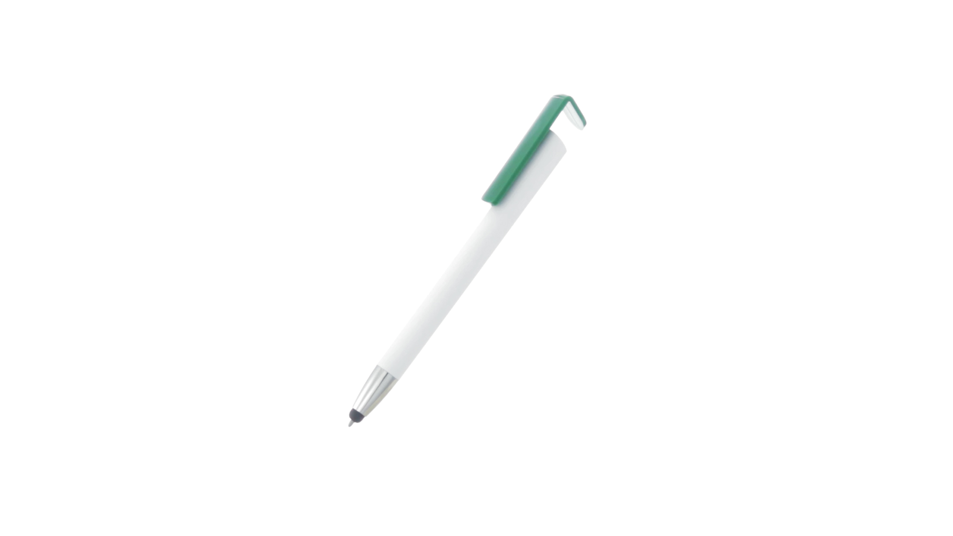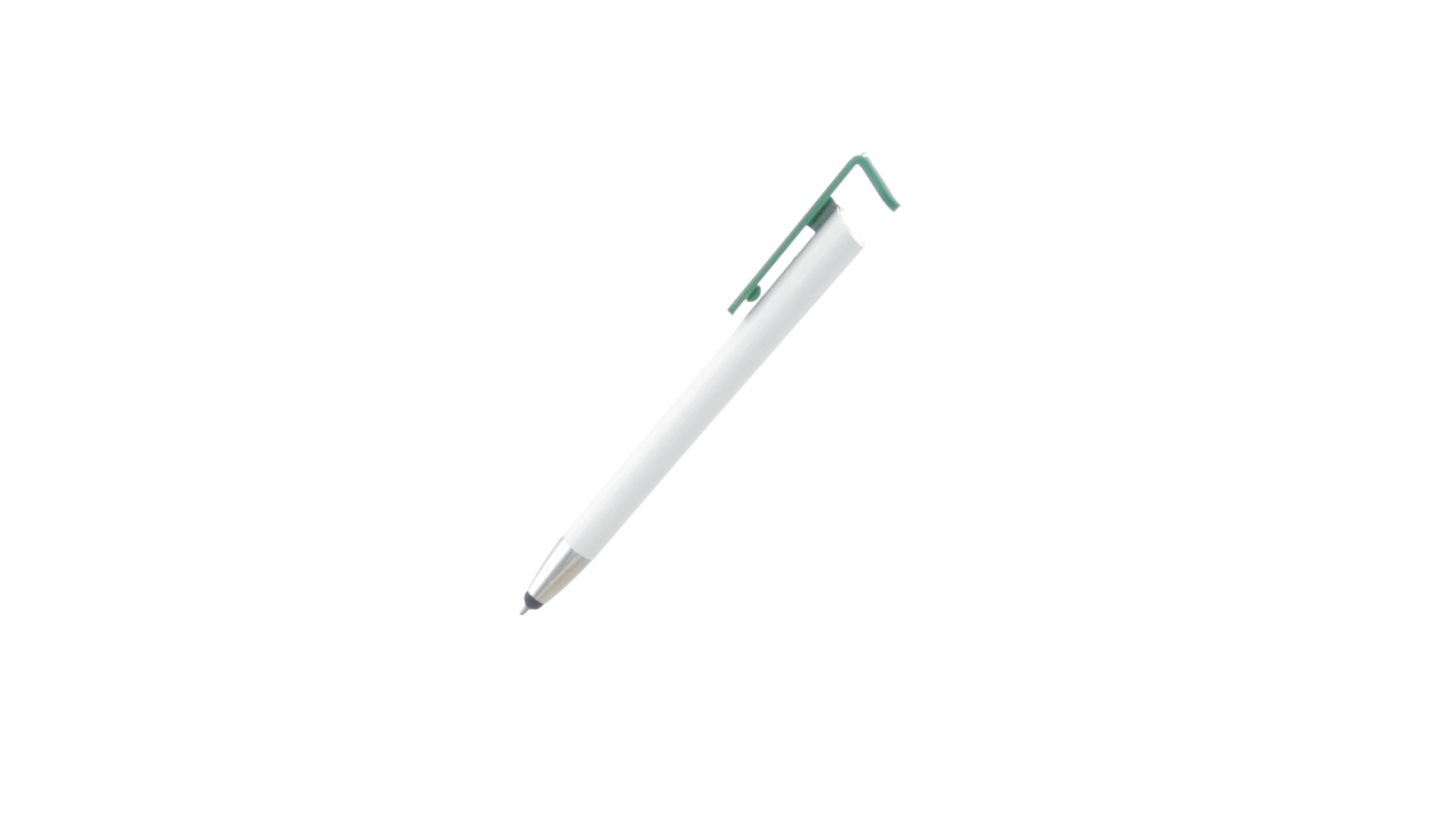 Origineller Druck-Kugelschreiber mit im Clip integriertem Ständer für Mobilgeräte. Mit auffälligem zweifarbigem Design und Schaft in glänzendem Weiss. Clip in auffälligen Farben und Spitze in glänzendem Silber. Blaue Tinte.