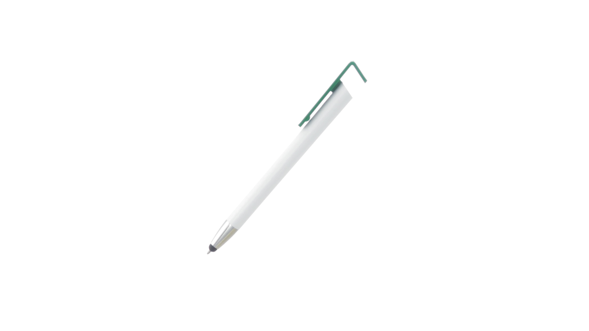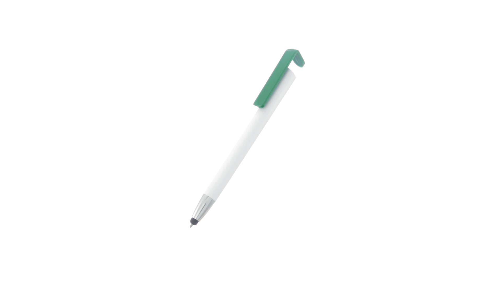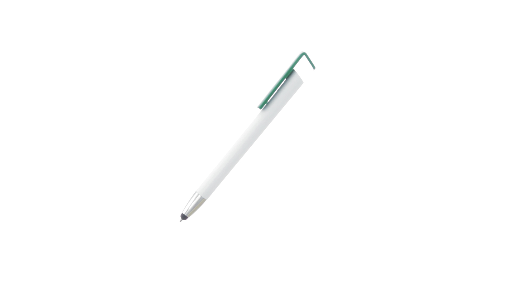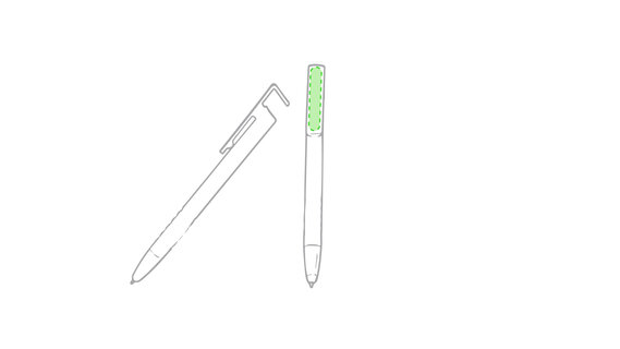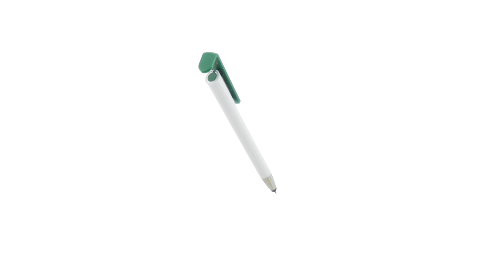 Origineller Druck-Kugelschreiber mit im Clip integriertem Ständer für Mobilgeräte. Mit auffälligem zweifarbigem Design und Schaft in glänzendem Weiss. Clip in auffälligen Farben und Spitze in glänzendem Silber. Blaue Tinte.