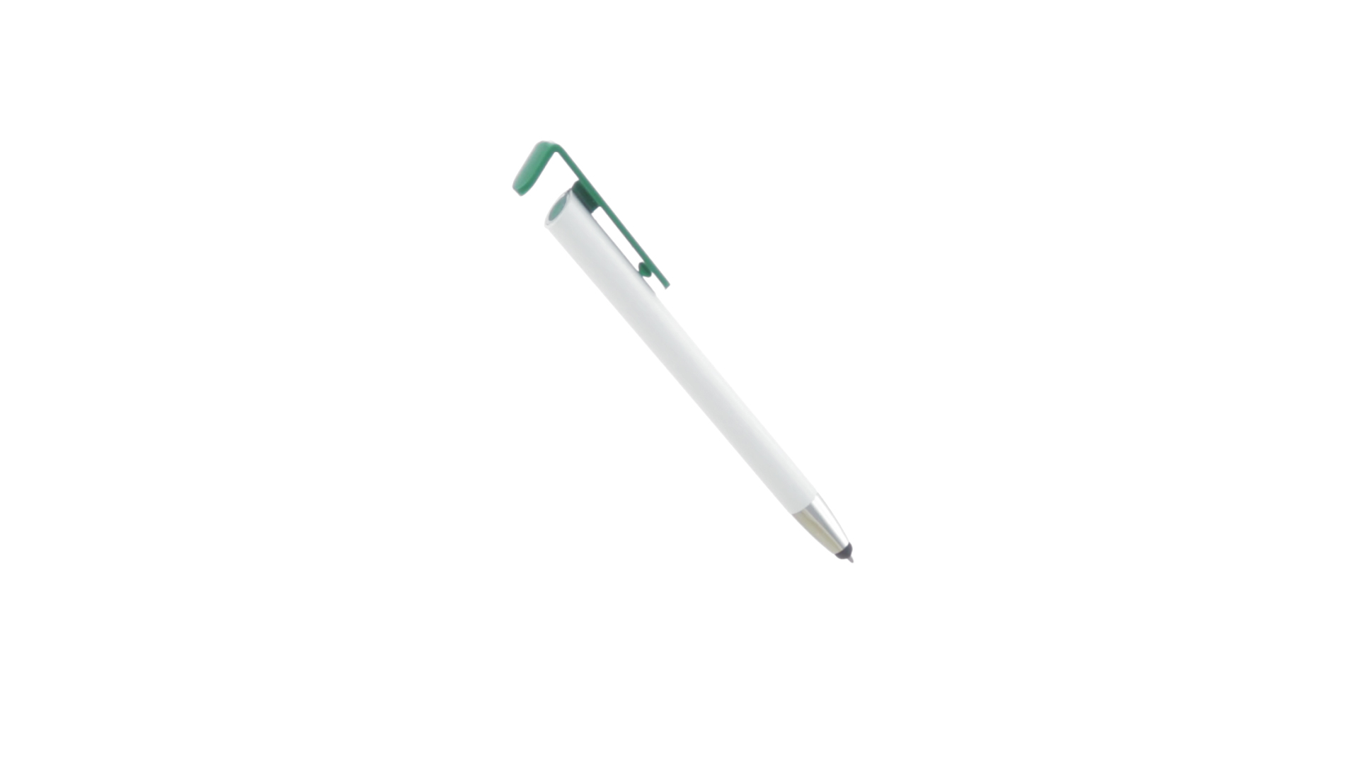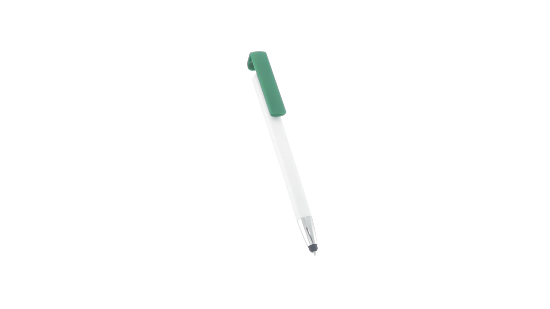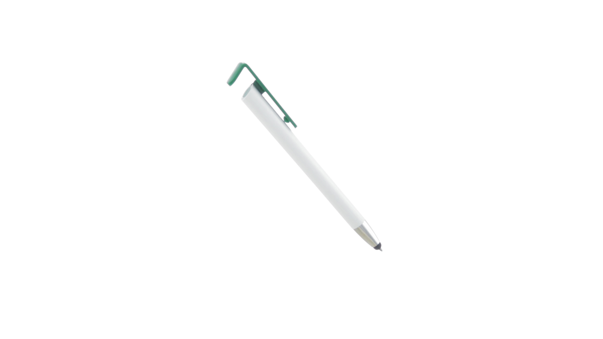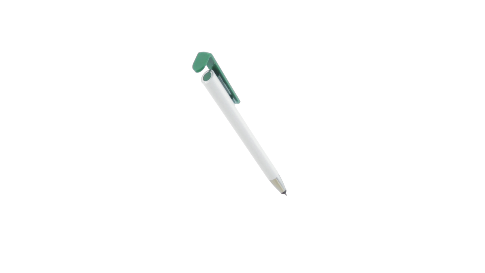 Origineller Druck-Kugelschreiber mit im Clip integriertem Ständer für Mobilgeräte. Mit auffälligem zweifarbigem Design und Schaft in glänzendem Weiss. Clip in auffälligen Farben und Spitze in glänzendem Silber. Blaue Tinte.
