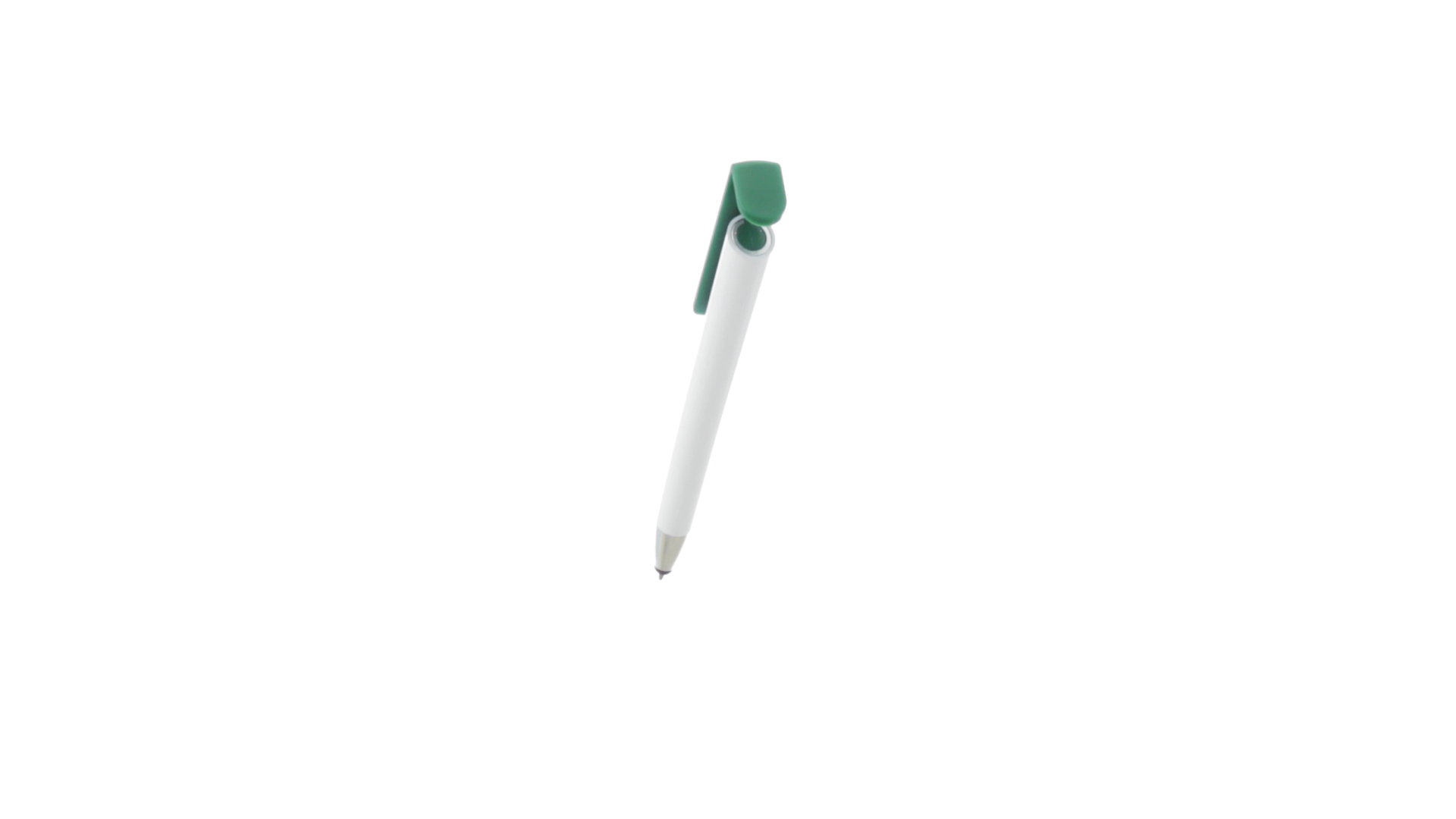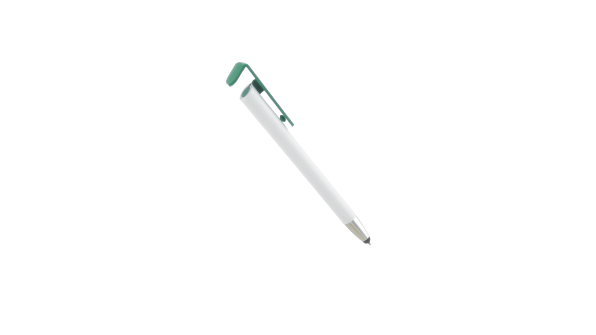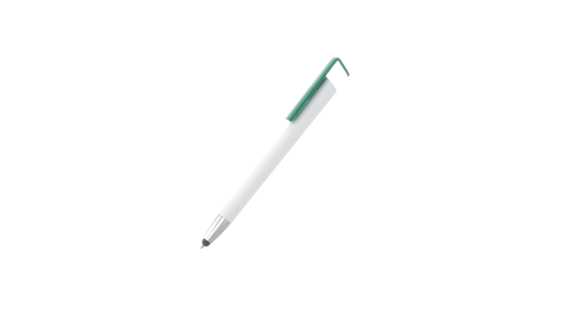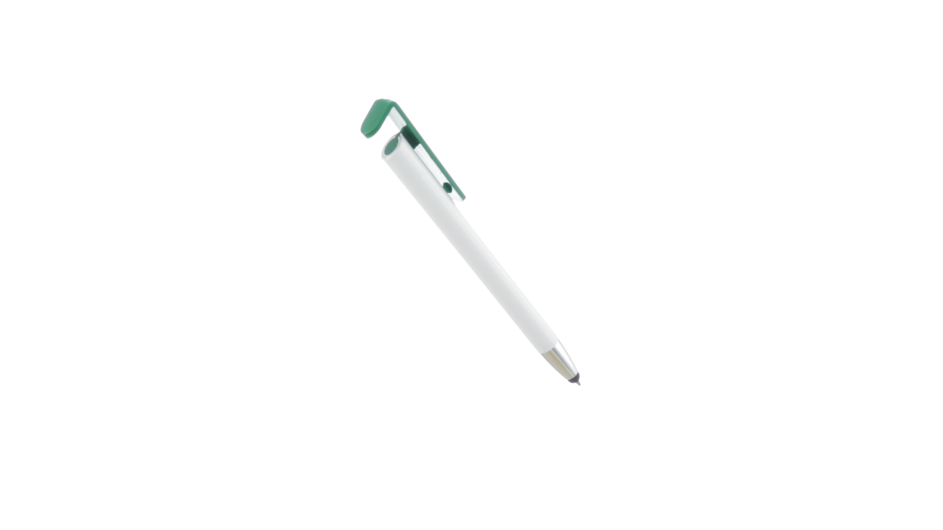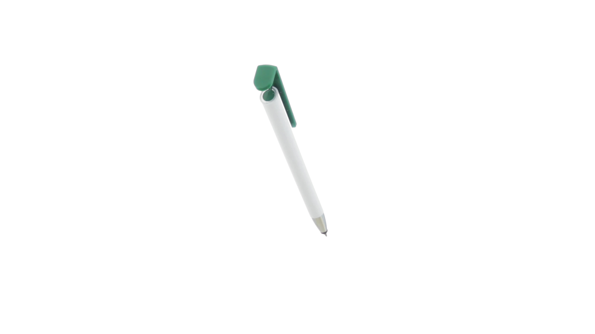 Origineller Druck-Kugelschreiber mit im Clip integriertem Ständer für Mobilgeräte. Mit auffälligem zweifarbigem Design und Schaft in glänzendem Weiss. Clip in auffälligen Farben und Spitze in glänzendem Silber. Blaue Tinte.