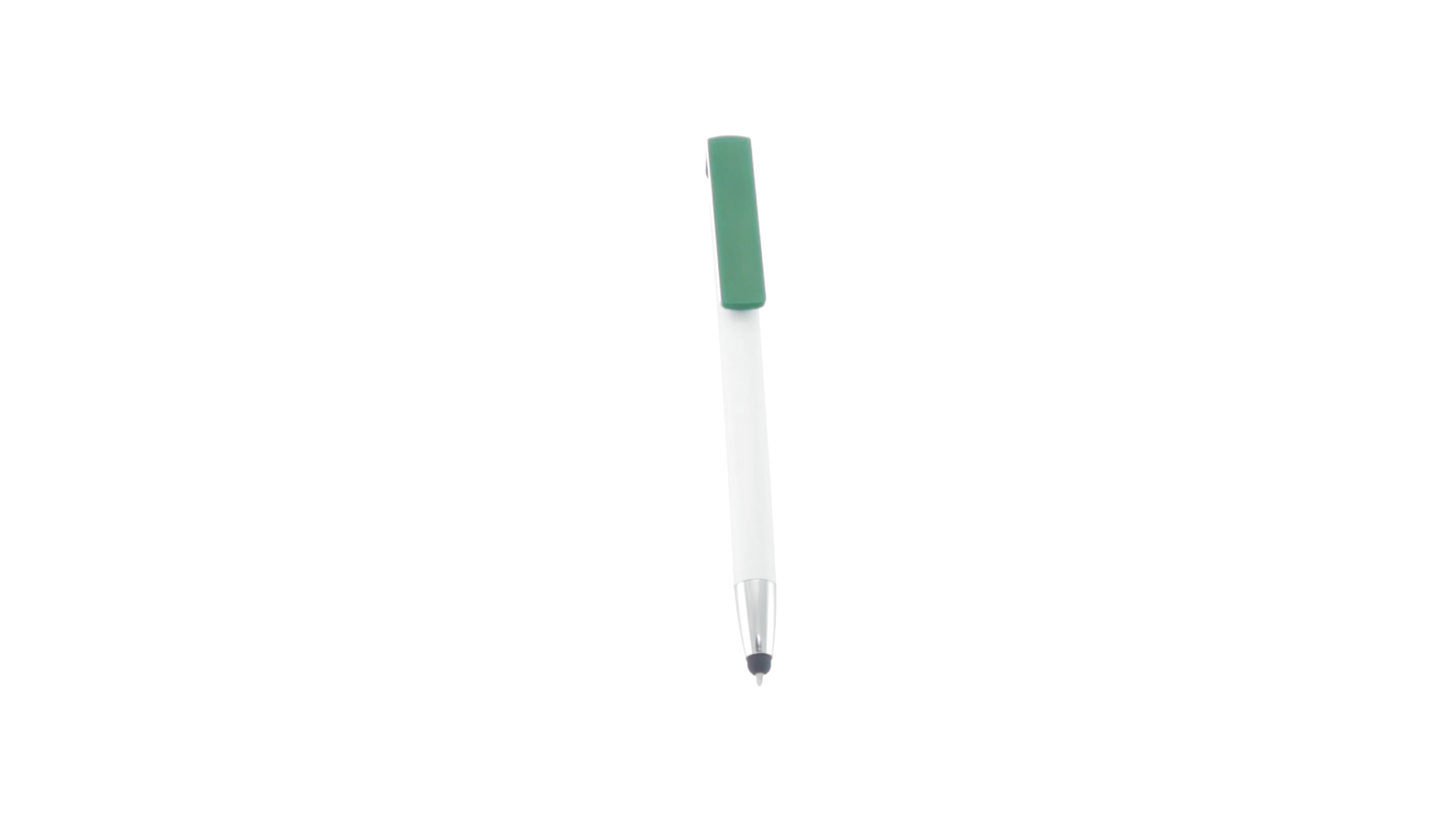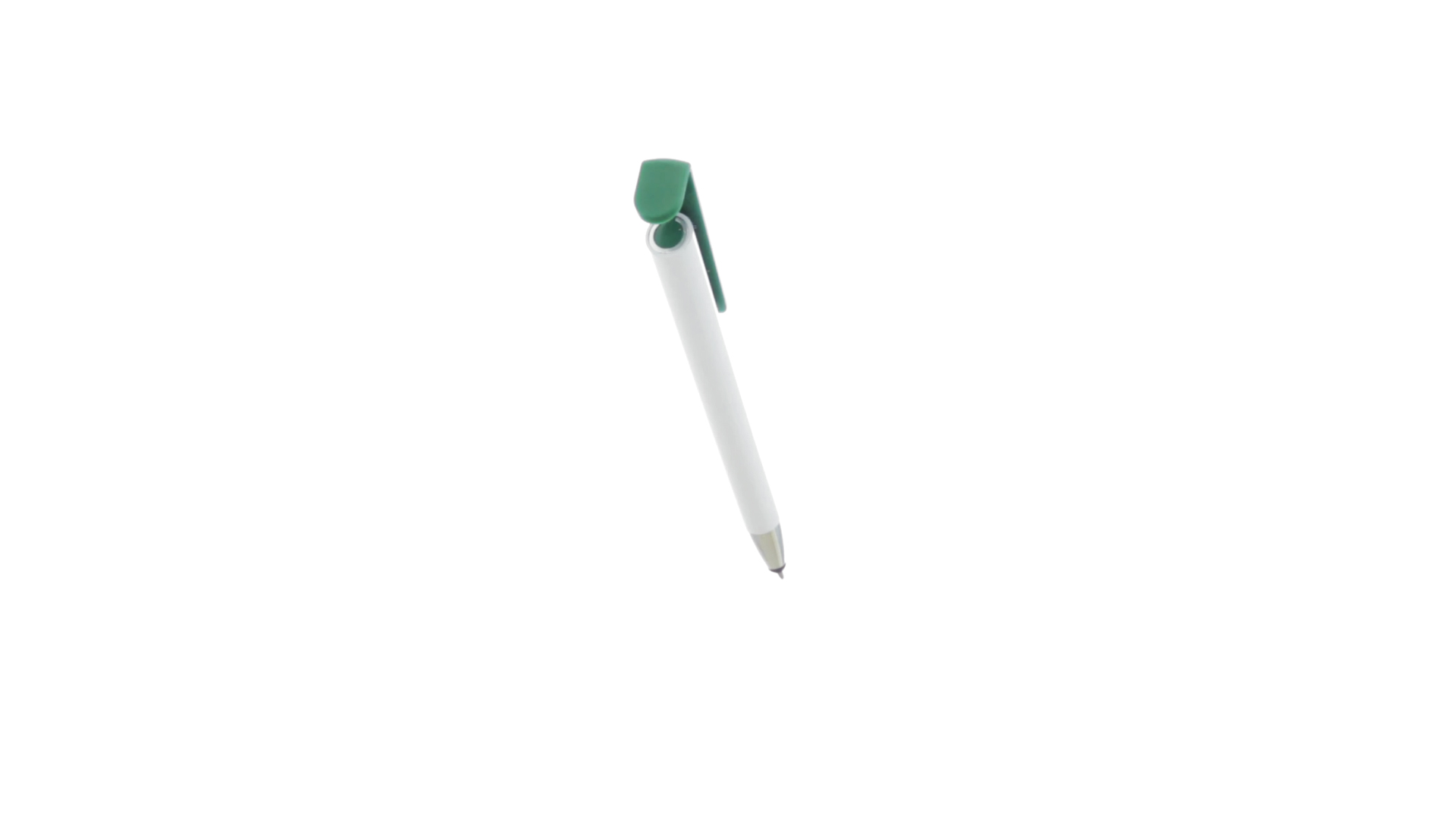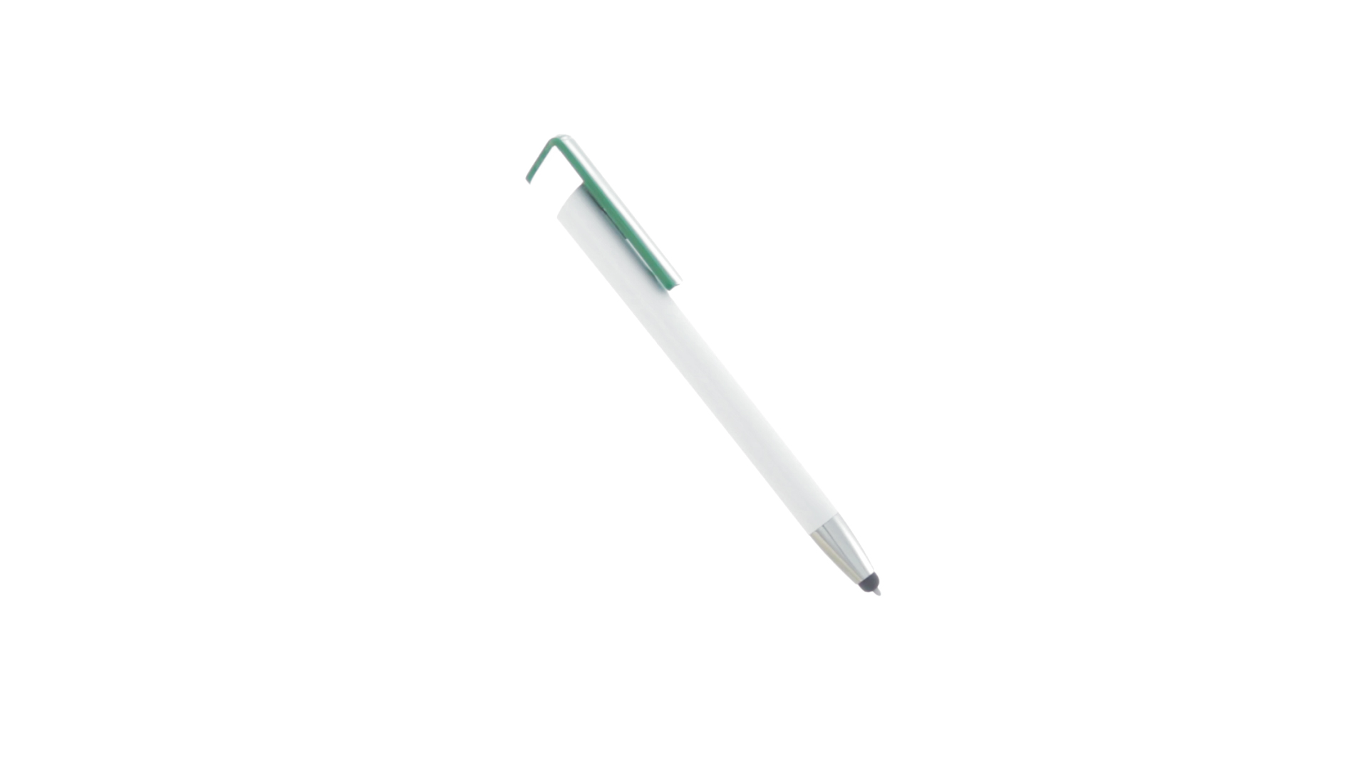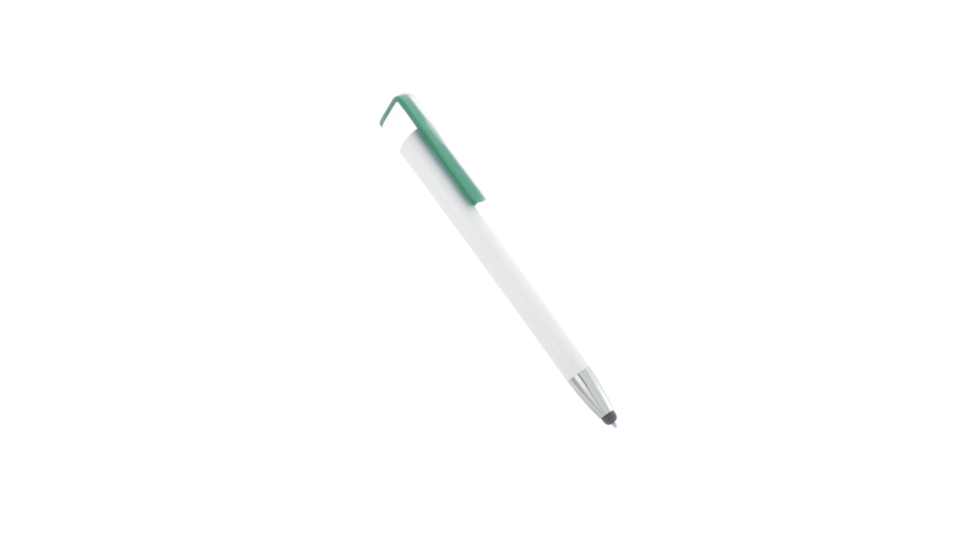 Origineller Druck-Kugelschreiber mit im Clip integriertem Ständer für Mobilgeräte. Mit auffälligem zweifarbigem Design und Schaft in glänzendem Weiss. Clip in auffälligen Farben und Spitze in glänzendem Silber. Blaue Tinte.