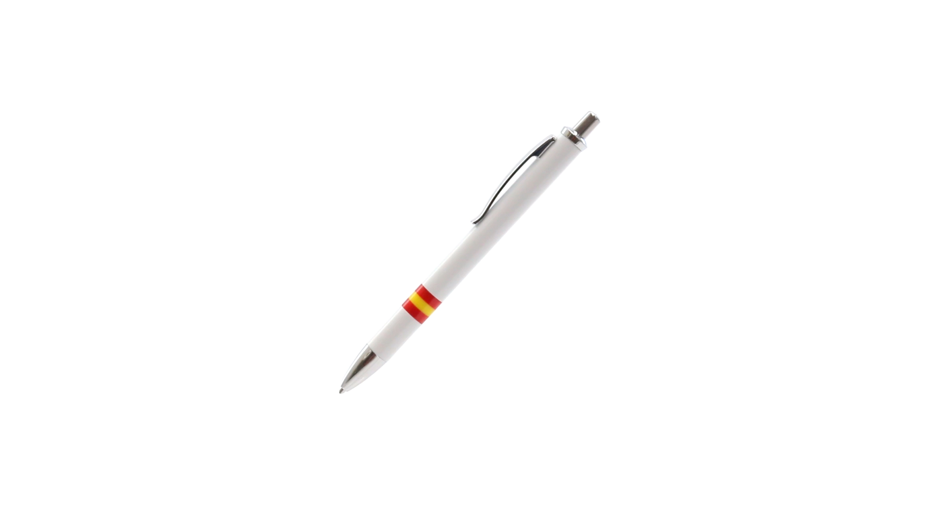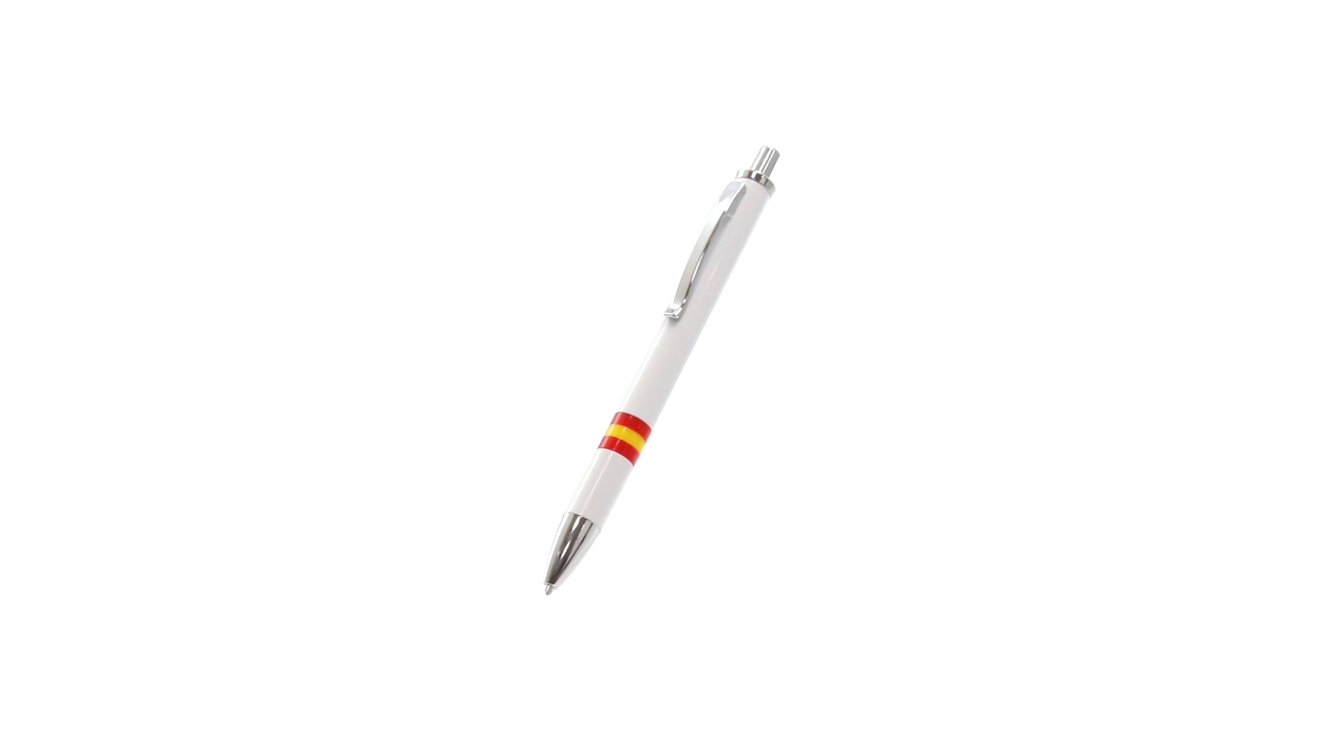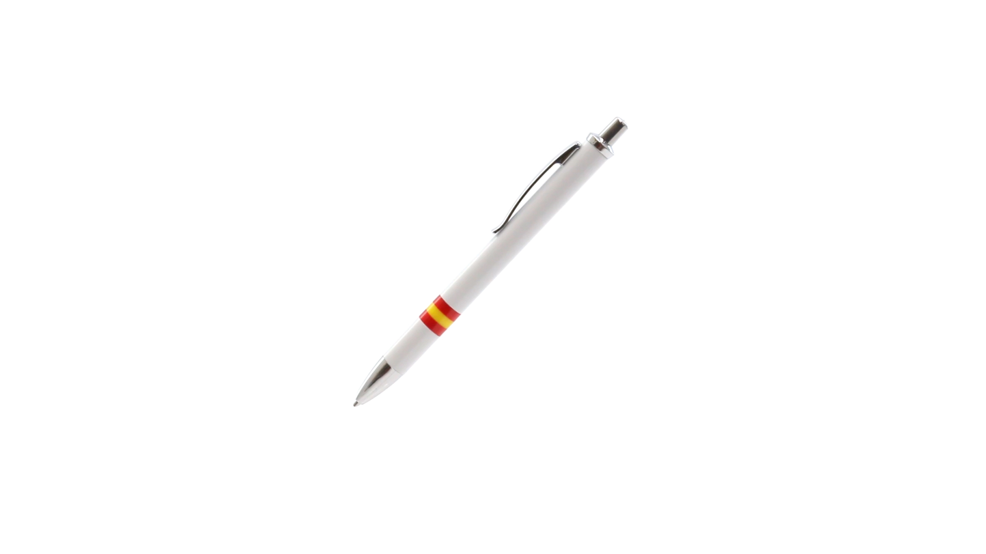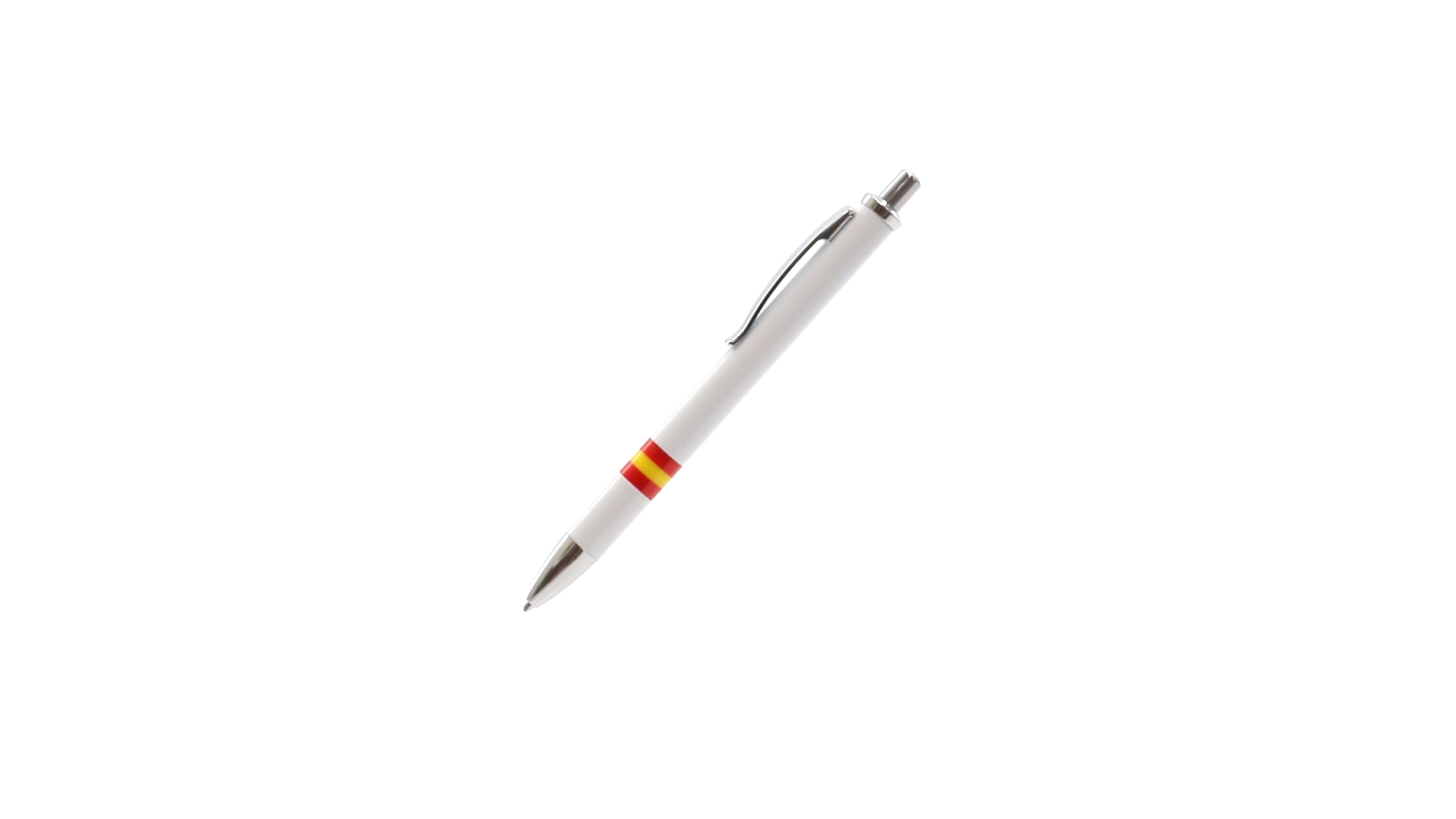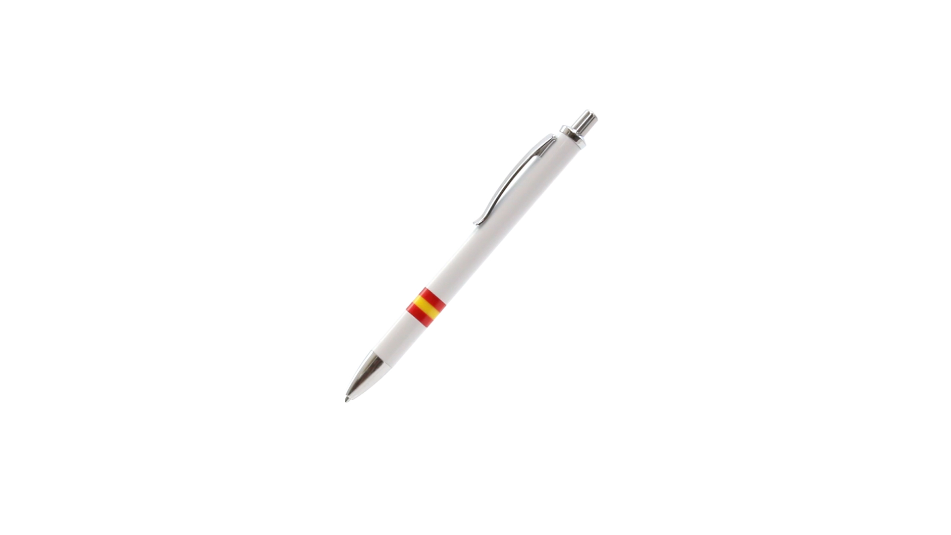 Druck-Kugelschreiber mit elegantem, zweifarbigem Design und Kontrastelementen in glänzendem Silber sowie Körper in glänzendem Weiss mit der spanischen Nationalflagge. Mit Metallclip und Jumbo-Patrone mit blauer Tinte.