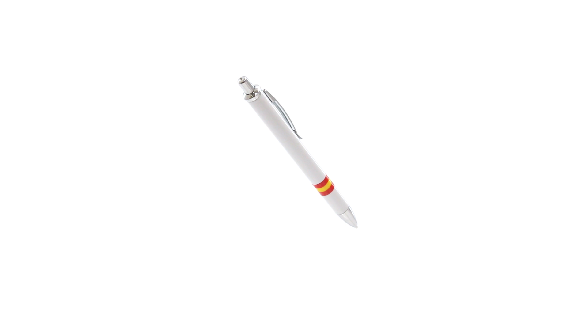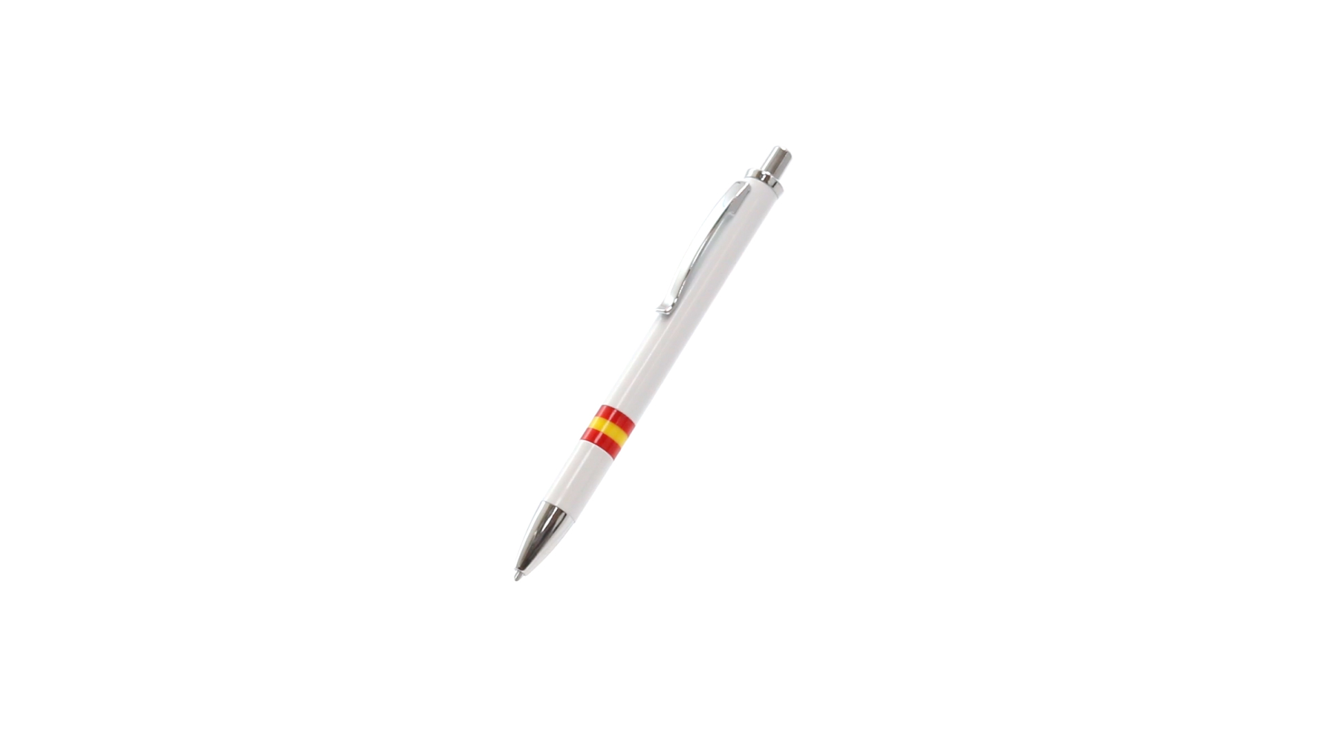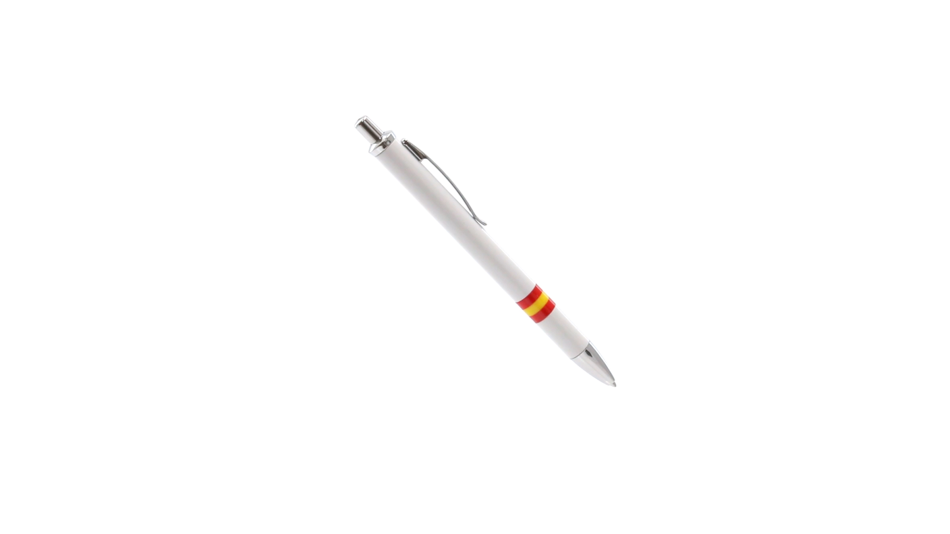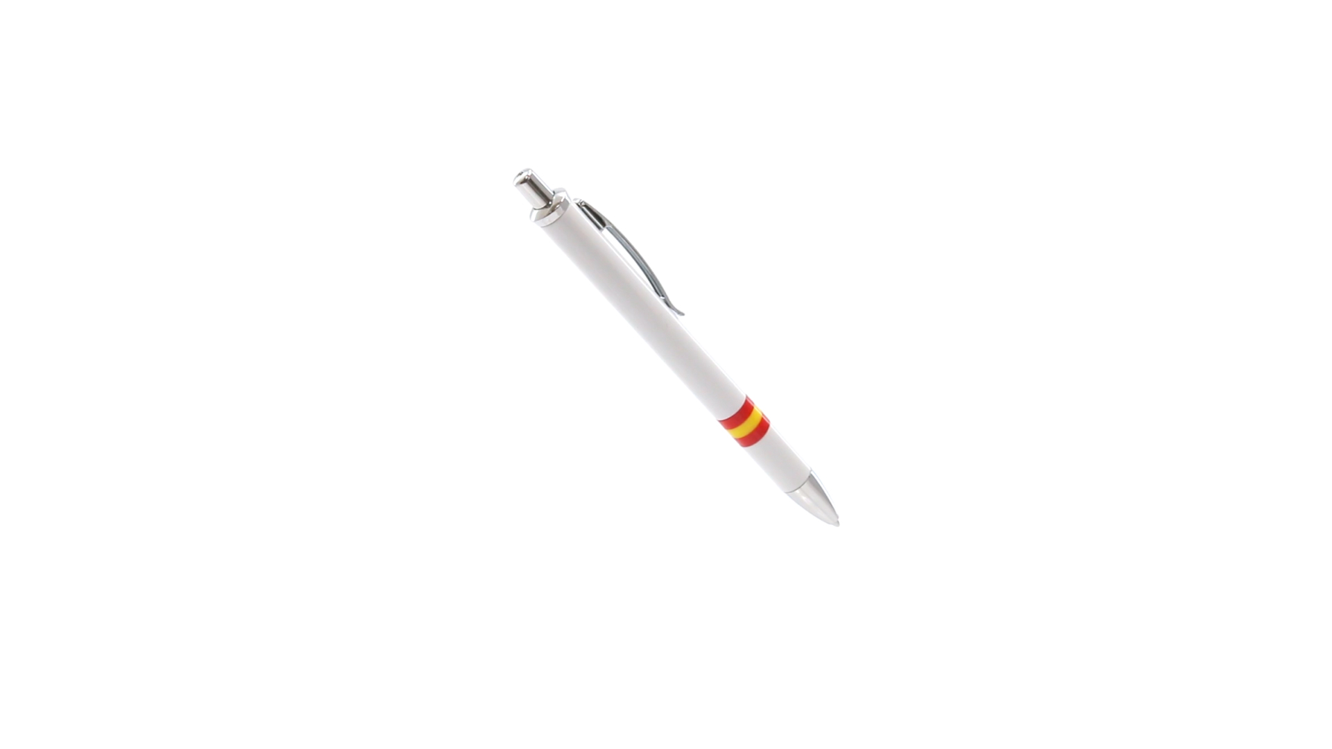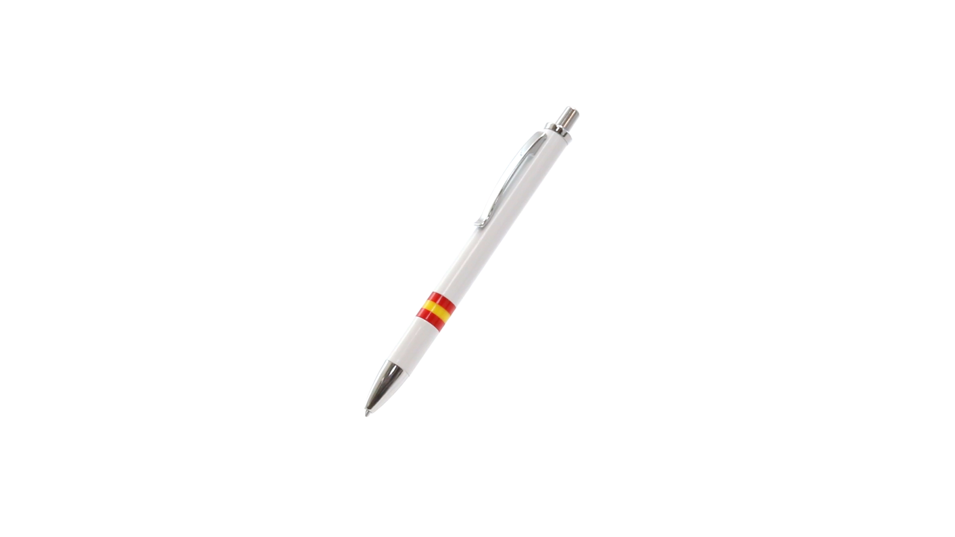Druck-Kugelschreiber mit elegantem, zweifarbigem Design und Kontrastelementen in glänzendem Silber sowie Körper in glänzendem Weiss mit der spanischen Nationalflagge. Mit Metallclip und Jumbo-Patrone mit blauer Tinte.