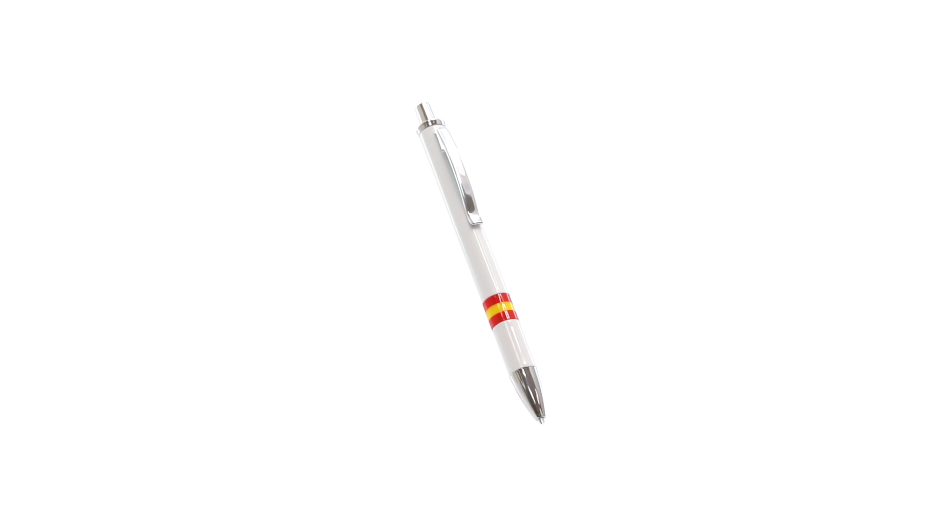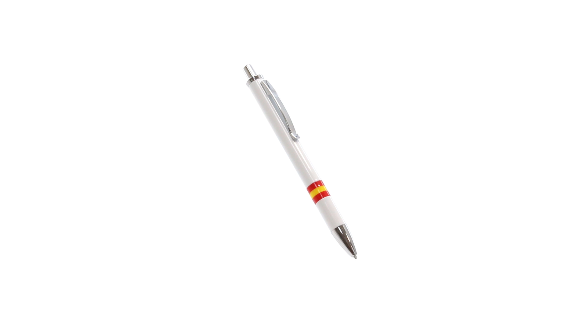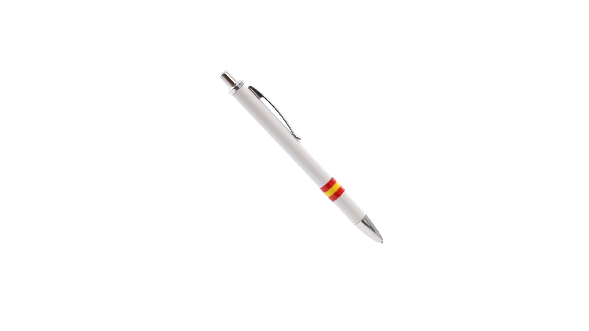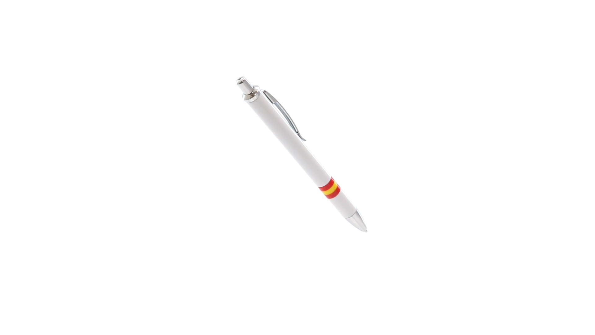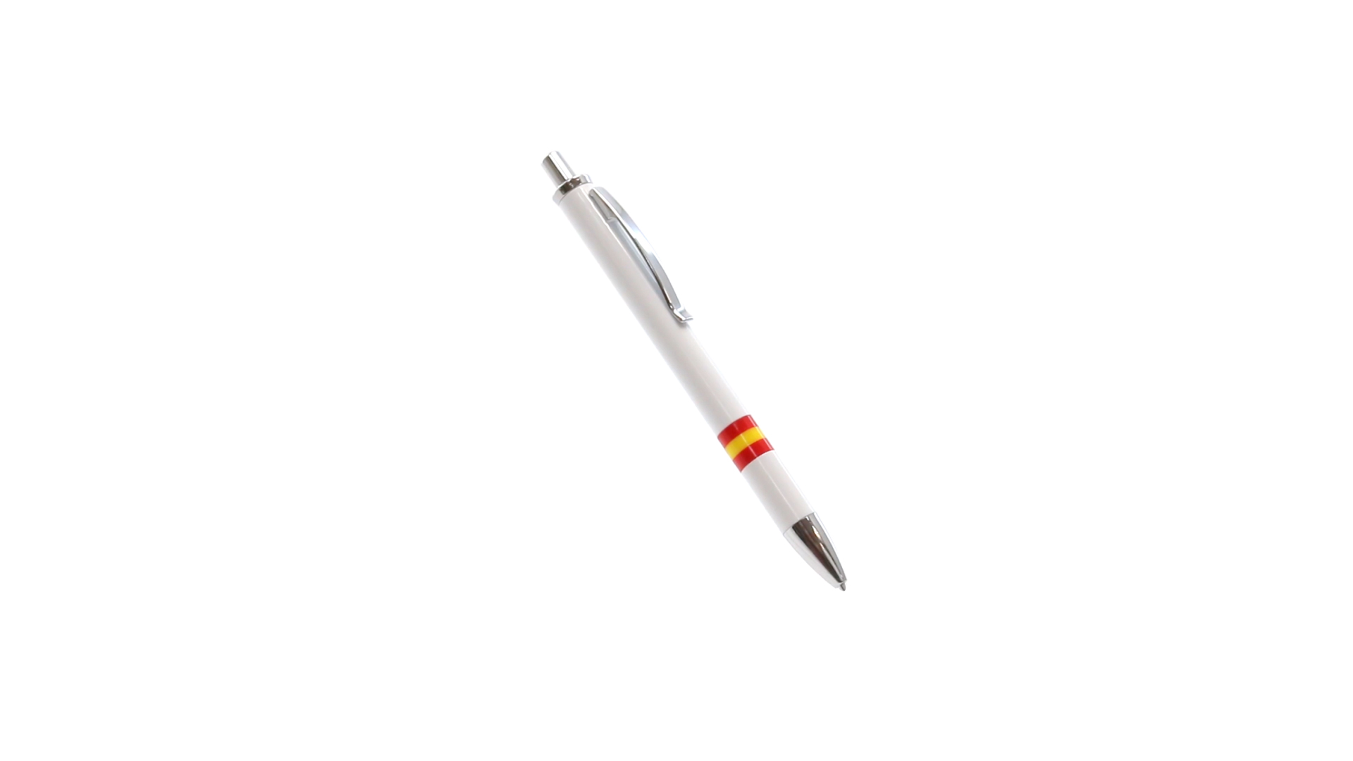 Druck-Kugelschreiber mit elegantem, zweifarbigem Design und Kontrastelementen in glänzendem Silber sowie Körper in glänzendem Weiss mit der spanischen Nationalflagge. Mit Metallclip und Jumbo-Patrone mit blauer Tinte.