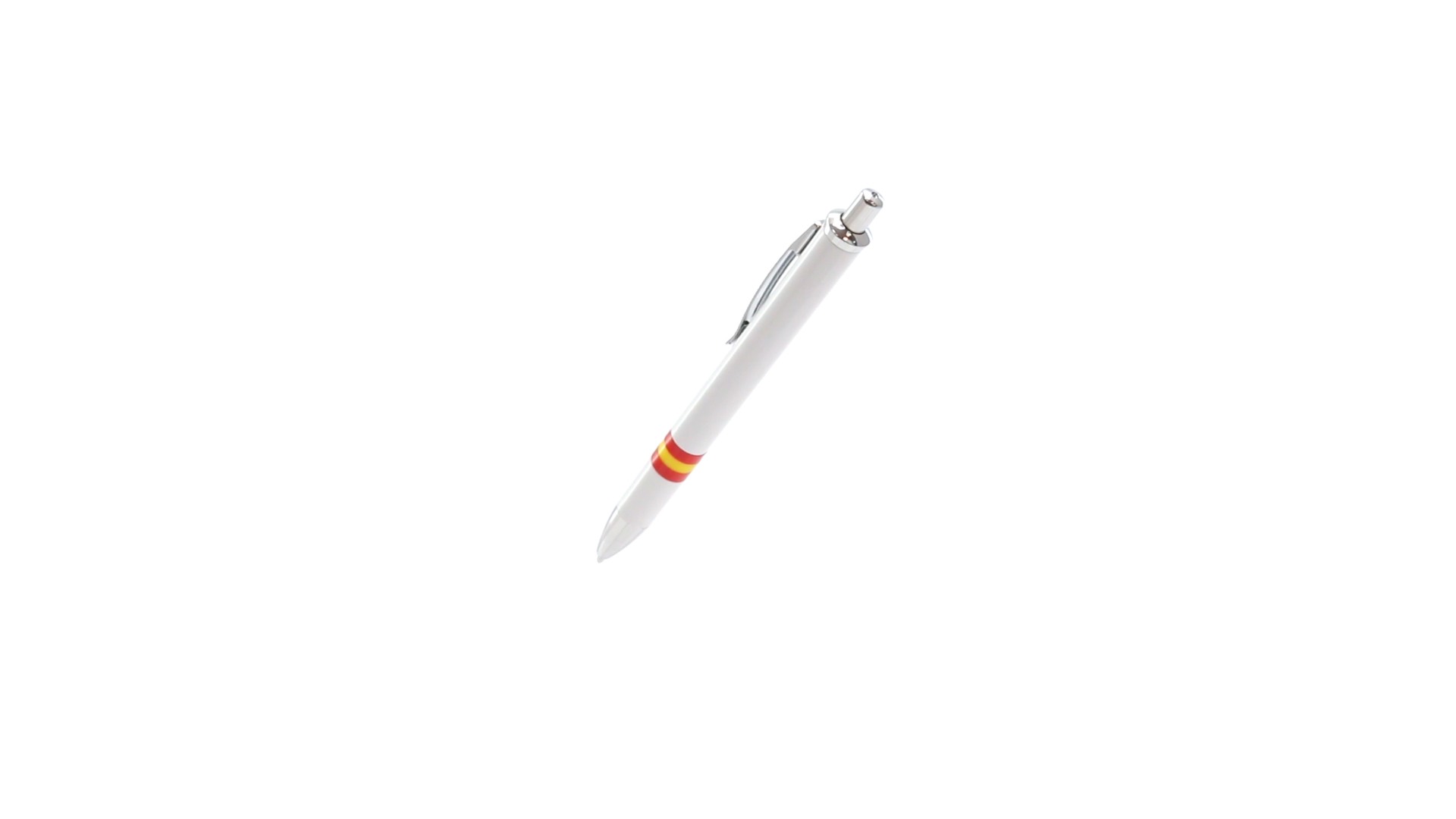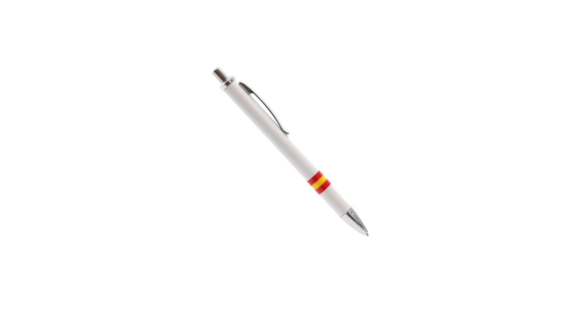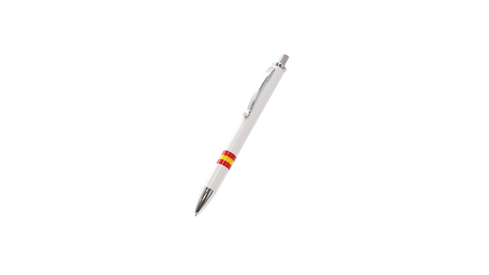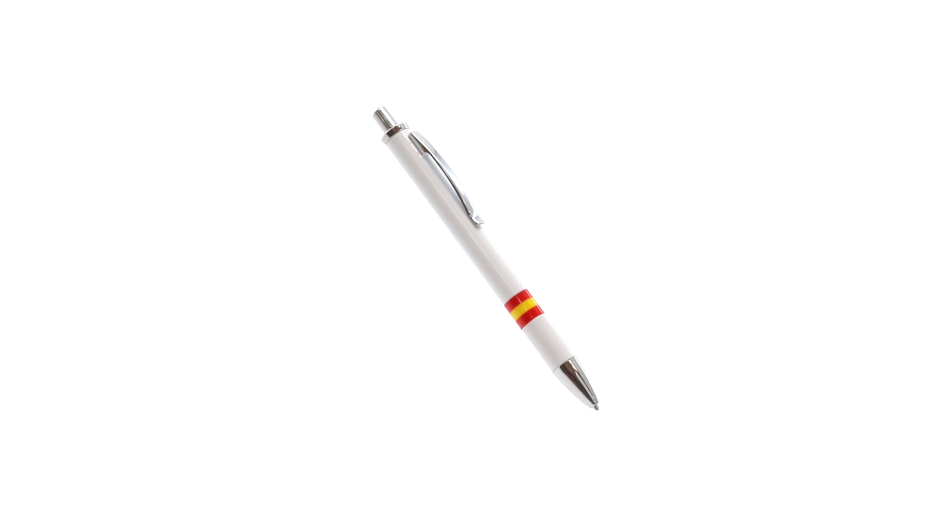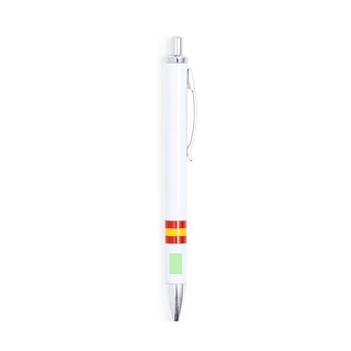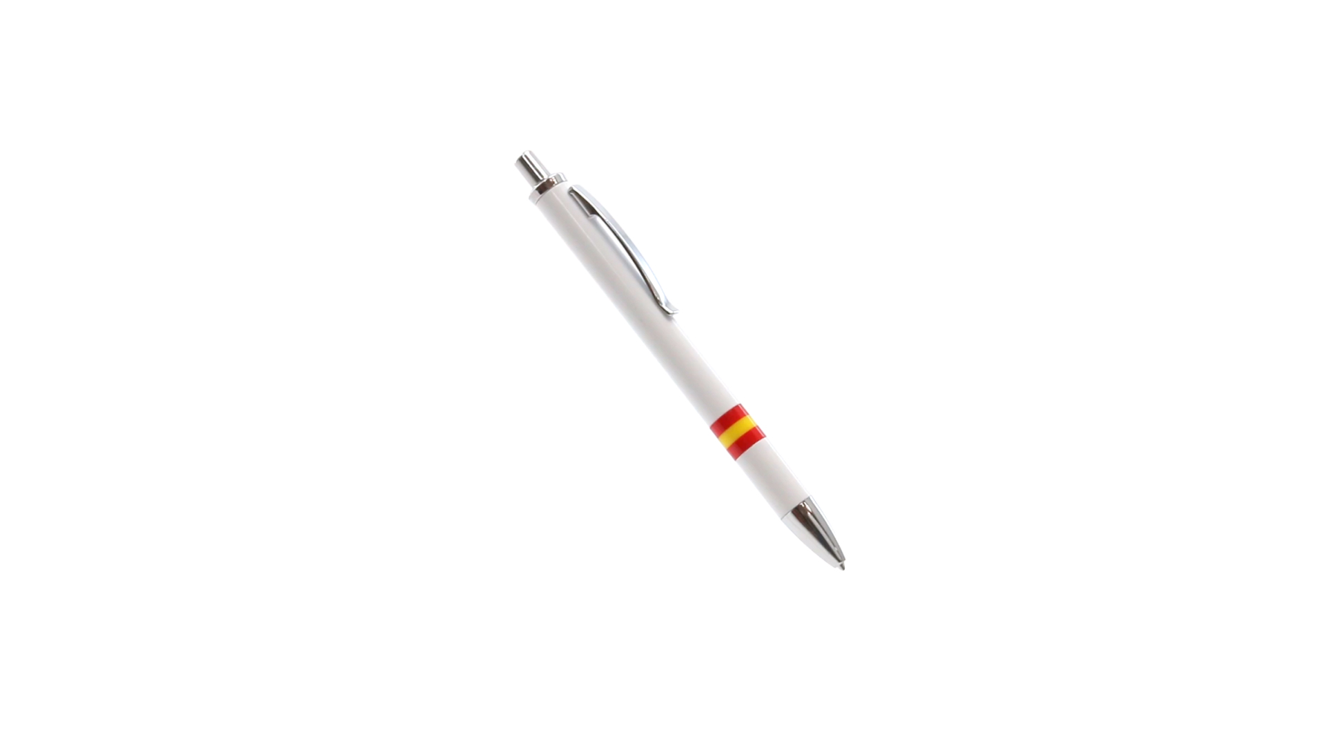 Druck-Kugelschreiber mit elegantem, zweifarbigem Design und Kontrastelementen in glänzendem Silber sowie Körper in glänzendem Weiss mit der spanischen Nationalflagge. Mit Metallclip und Jumbo-Patrone mit blauer Tinte.