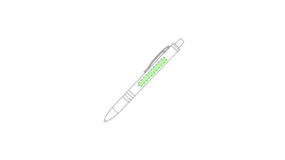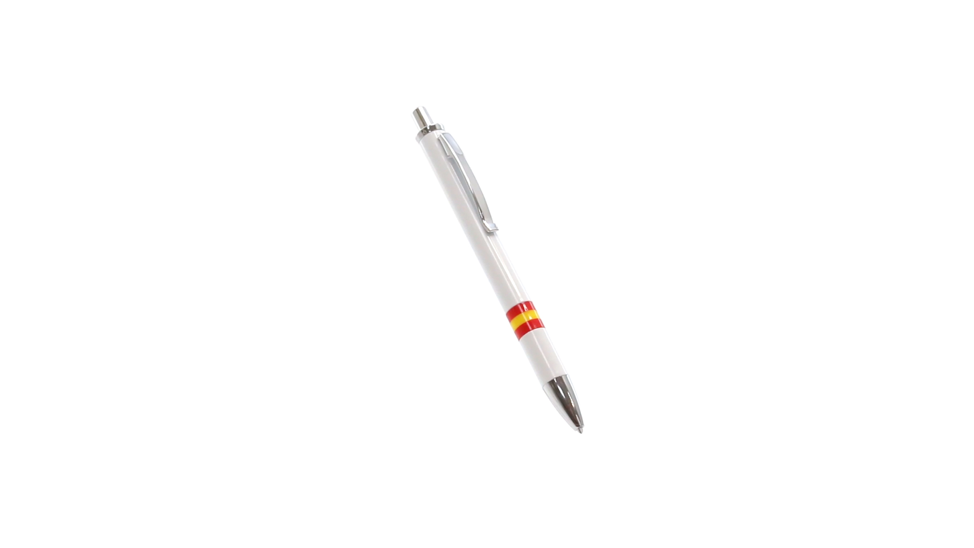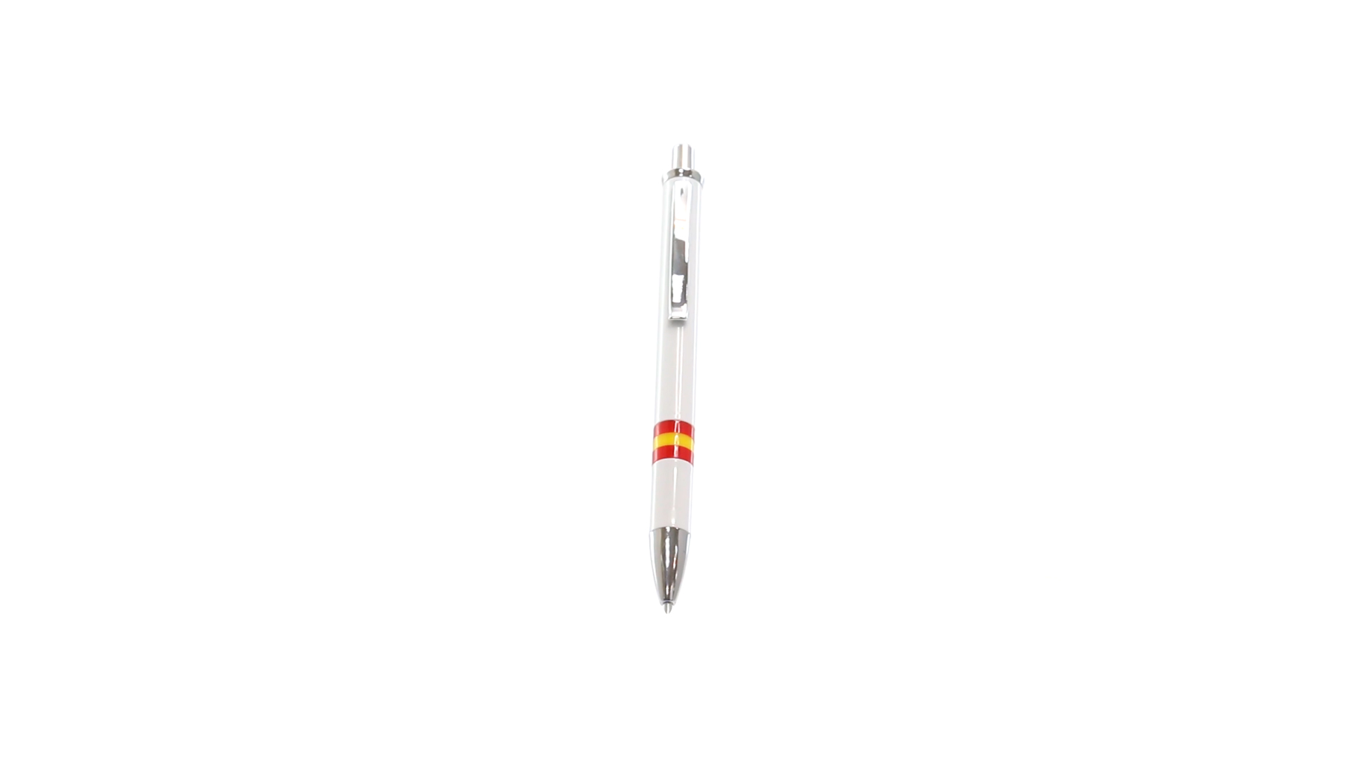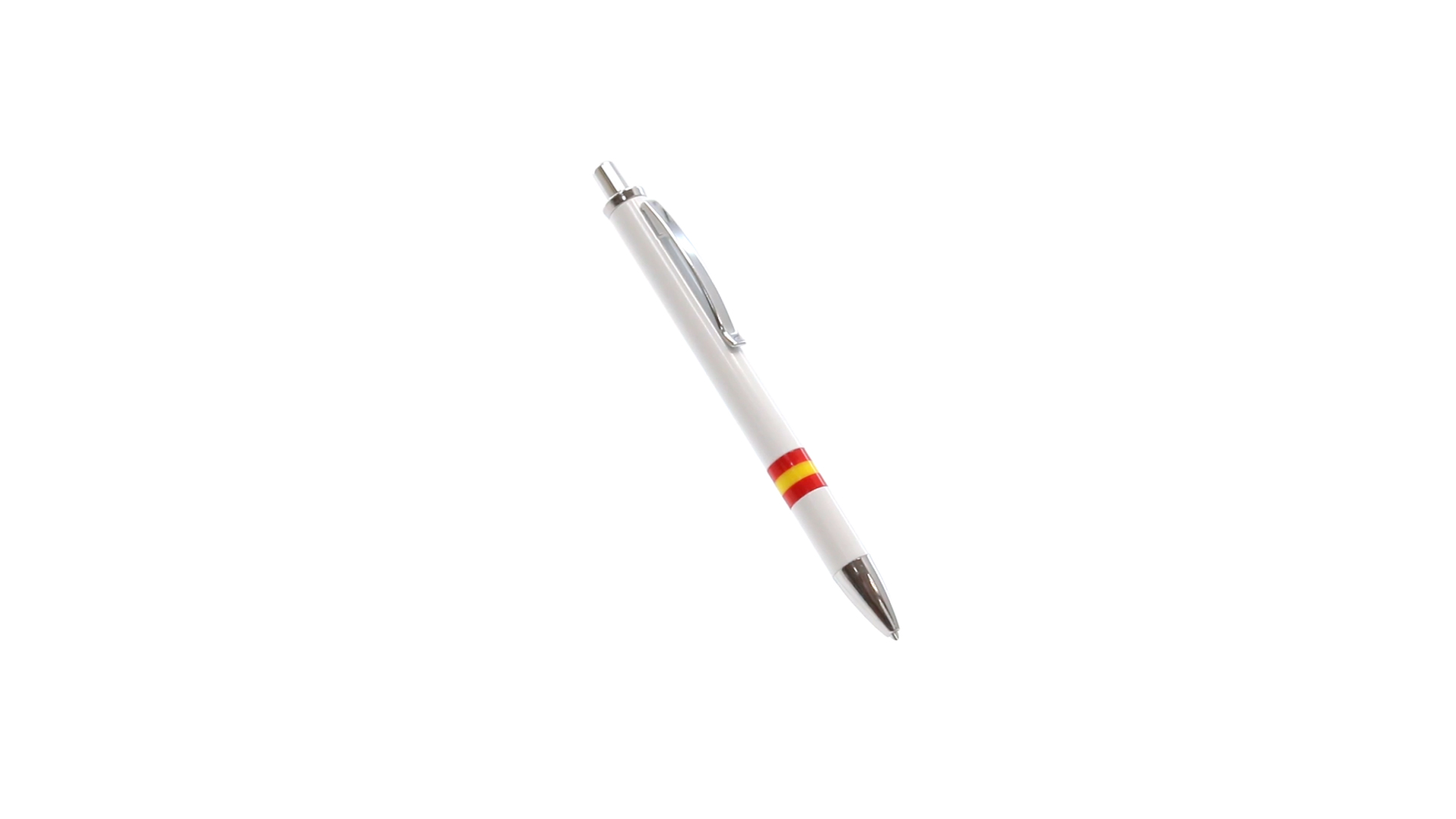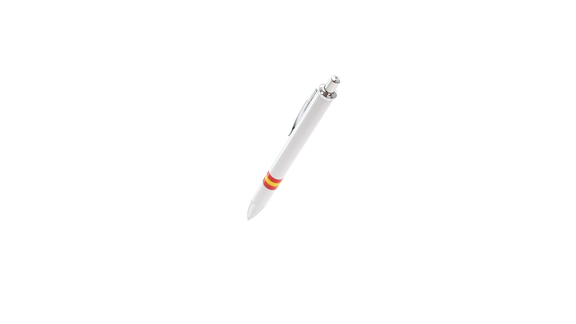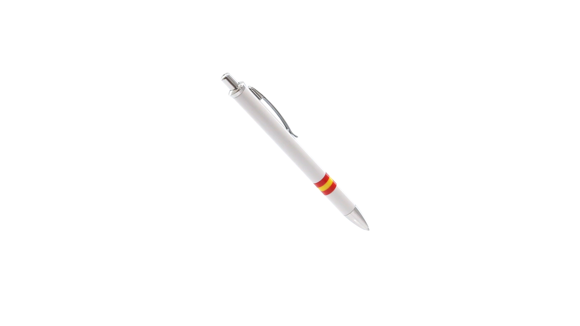Druck-Kugelschreiber mit elegantem, zweifarbigem Design und Kontrastelementen in glänzendem Silber sowie Körper in glänzendem Weiss mit der spanischen Nationalflagge. Mit Metallclip und Jumbo-Patrone mit blauer Tinte.