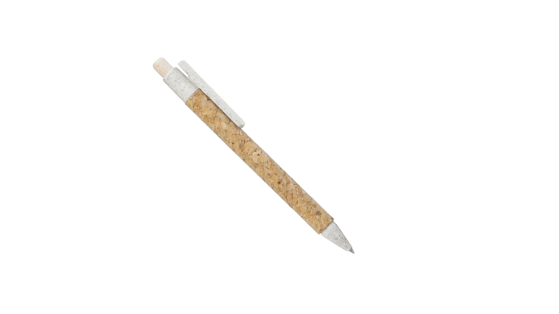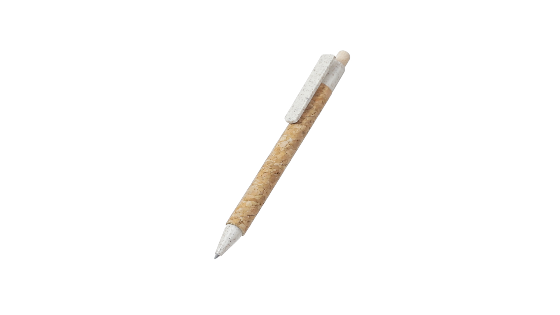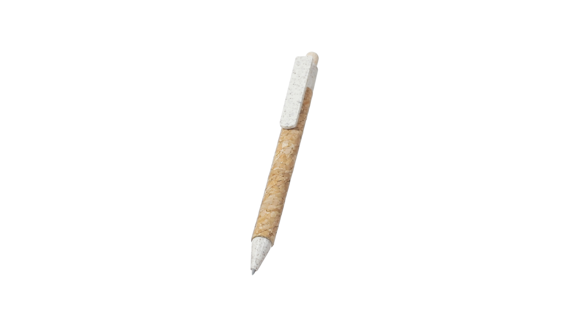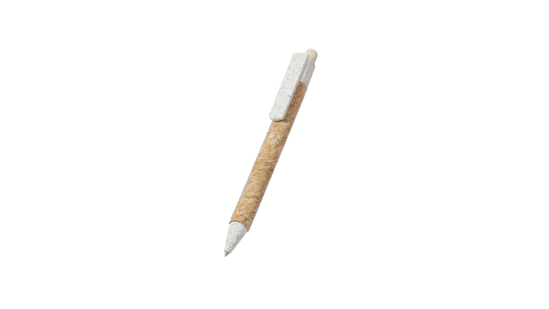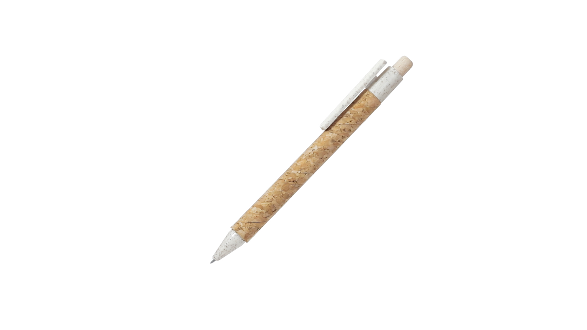 Kugelschreiber der Nature-Linie mit Gehäuse aus Naturkork. Clip, Spitze und Stopfer aus Weizenstroh, um die Verwendung natürlicher Rohstoffe zu fördern und den Schadstoffausstoss zu reduzieren. Clip speziell für den Tampondruck, mit Push-Up-Mechanismus und blauer Tintenmine.