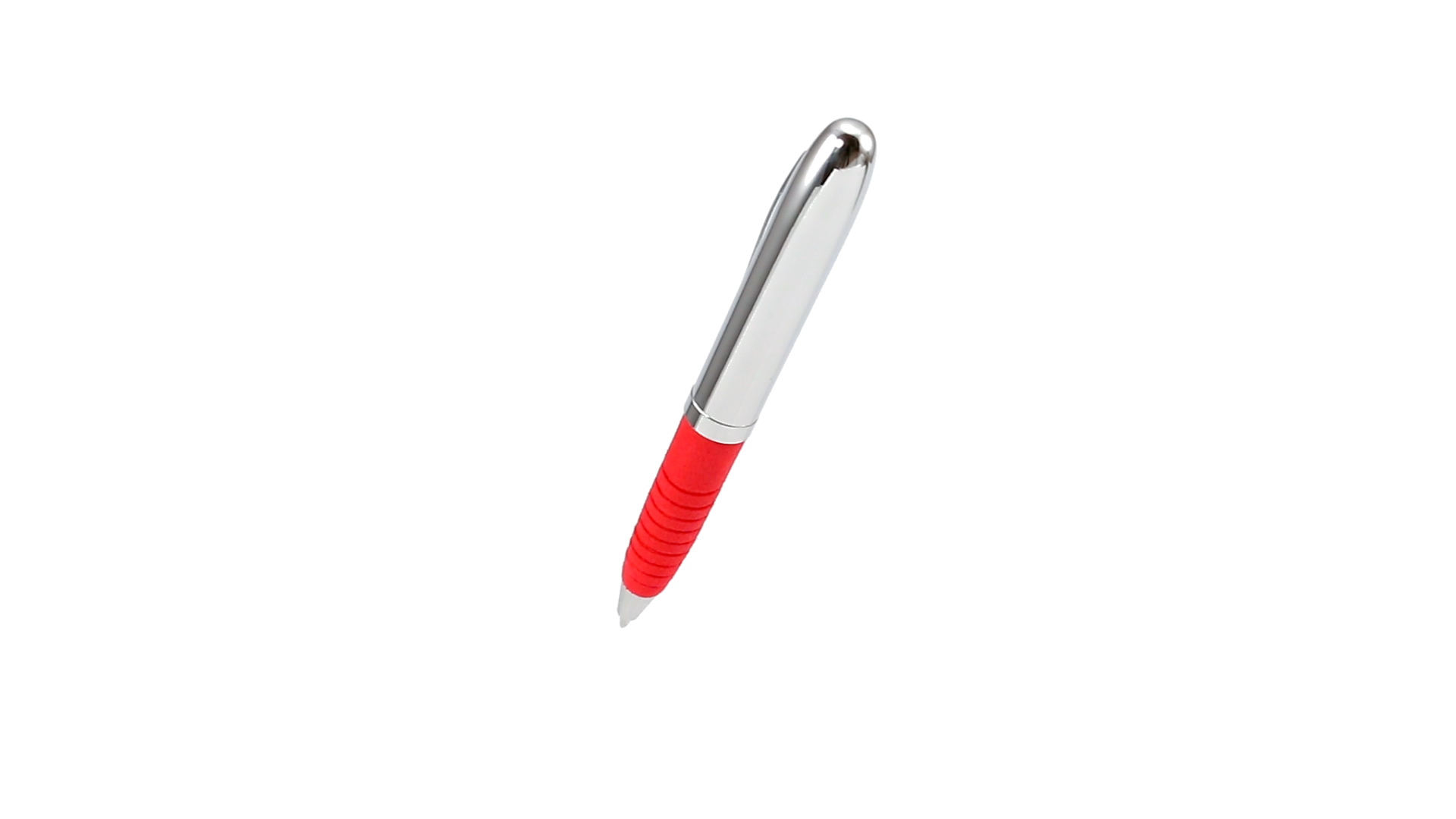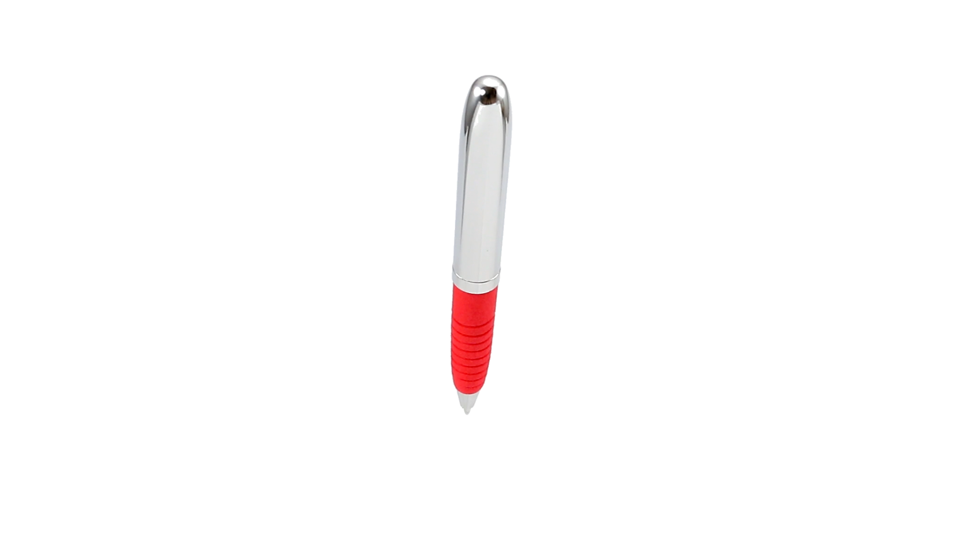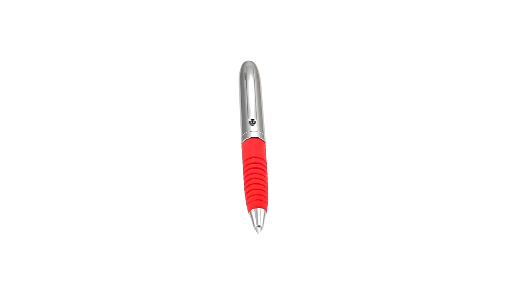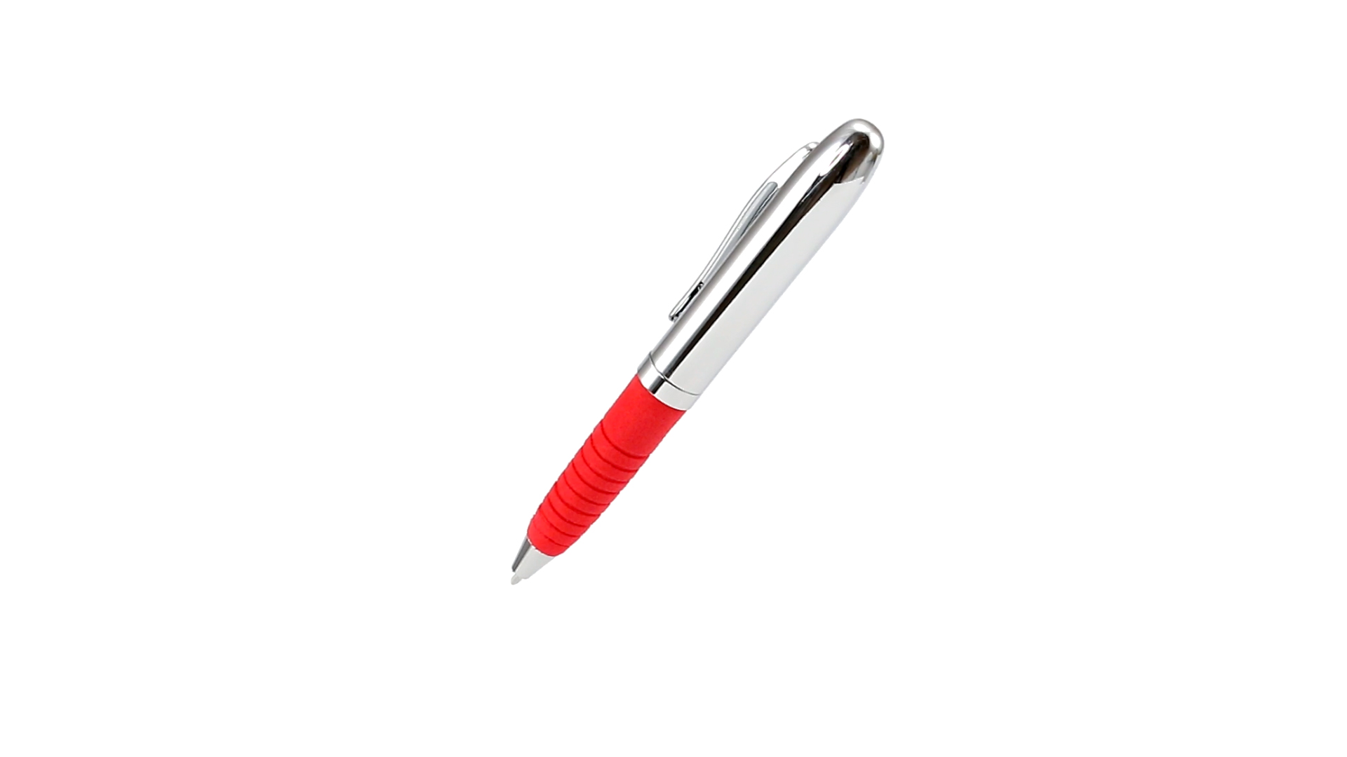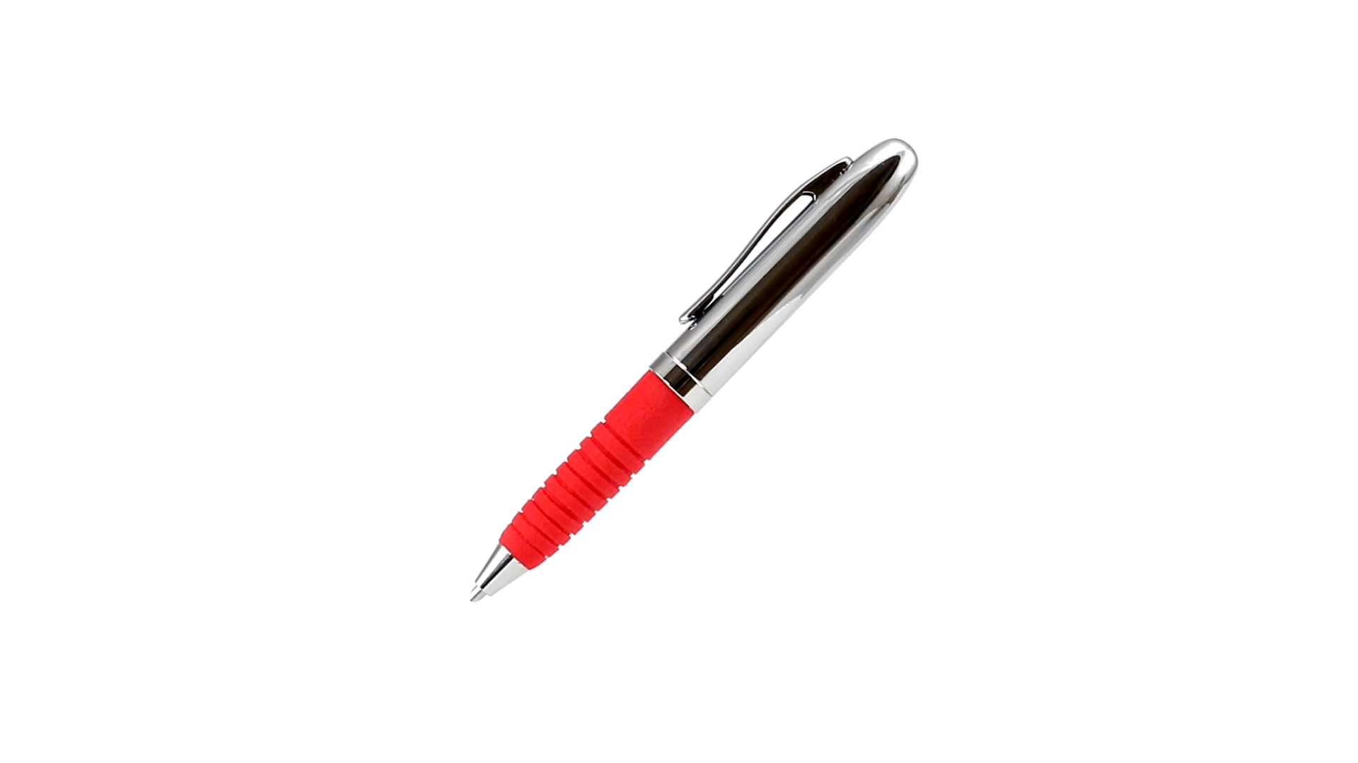 Origineller Metall-Kugelschreiber mit elegantem, zweifarbigem Design. Griff aus angenehm weichem EVA-Kunststoff in verschiedenen Farben. Ringe und Spitze in Silber. Blaue Tinte.