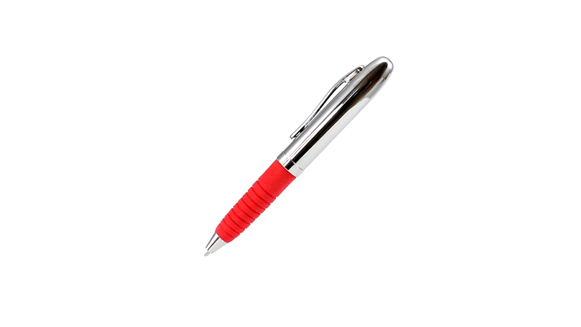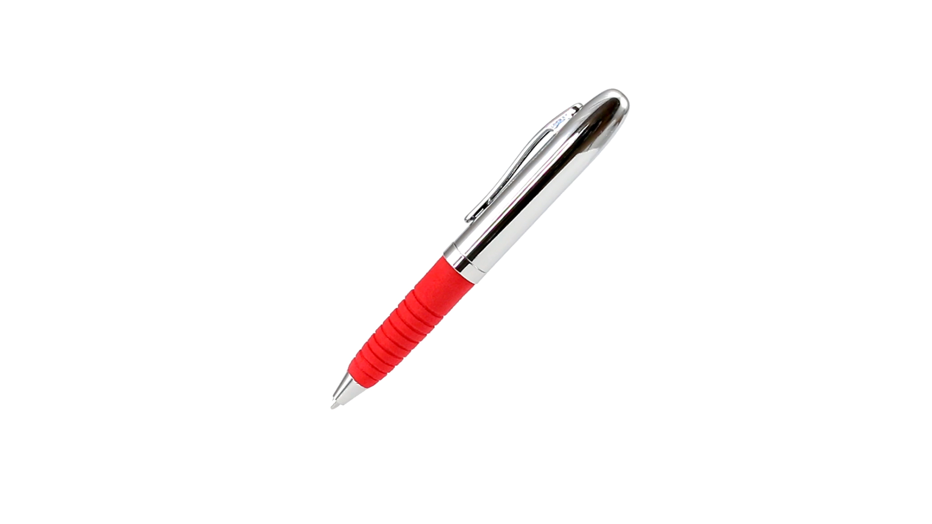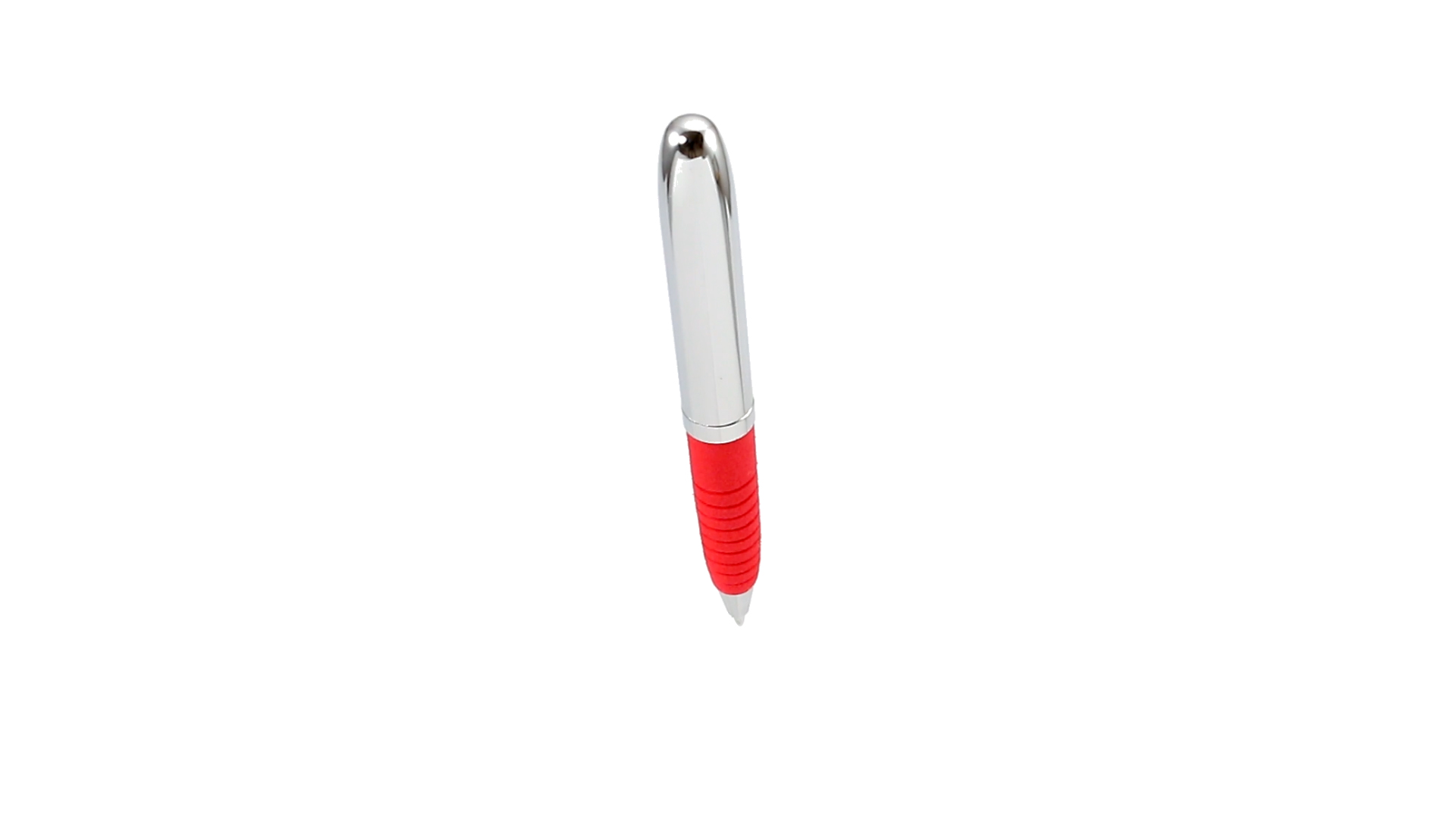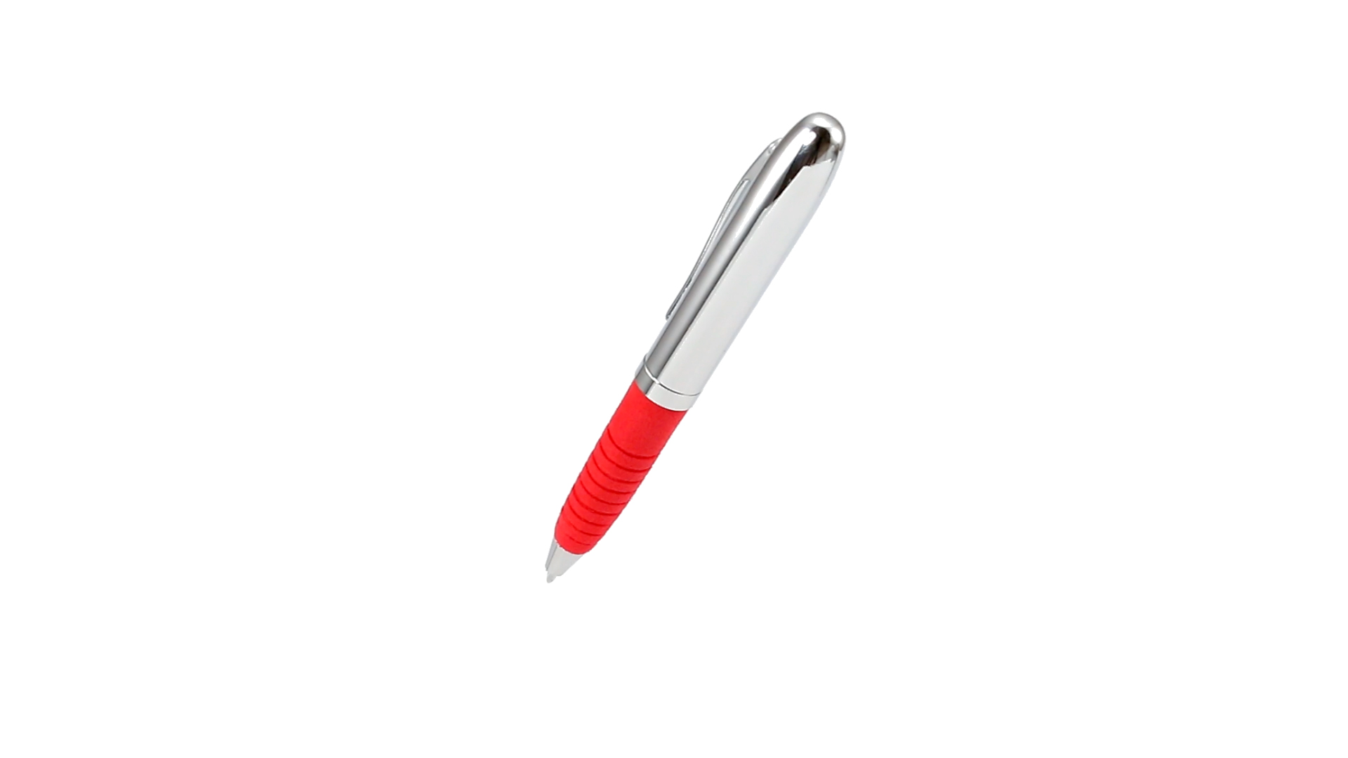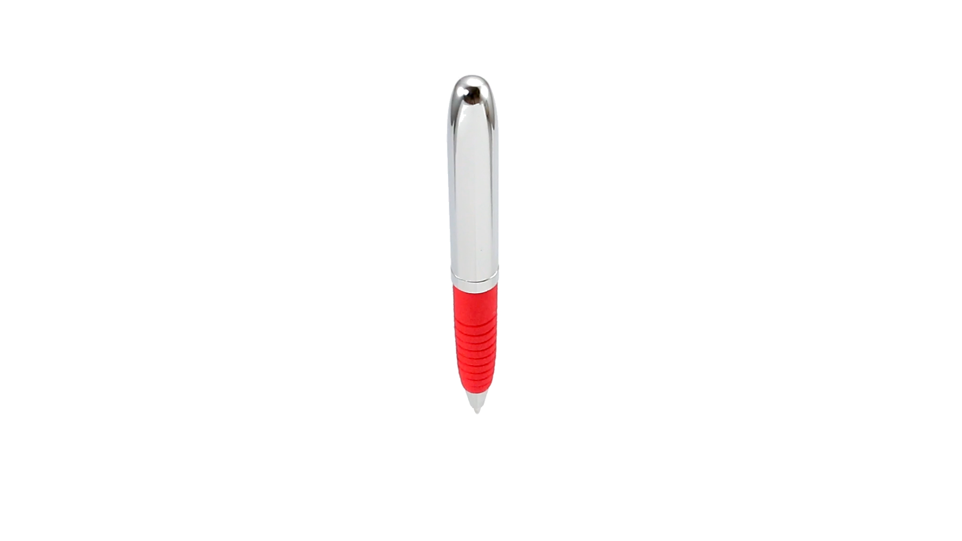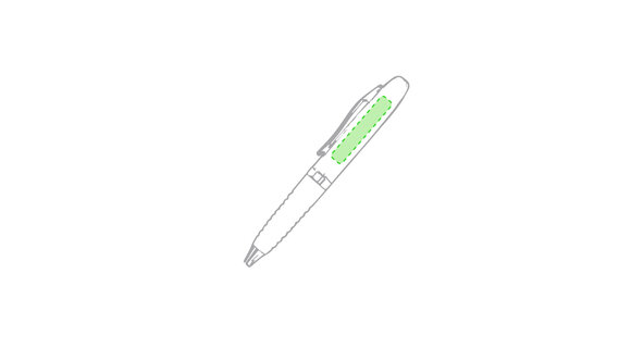 Origineller Metall-Kugelschreiber mit elegantem, zweifarbigem Design. Griff aus angenehm weichem EVA-Kunststoff in verschiedenen Farben. Ringe und Spitze in Silber. Blaue Tinte.