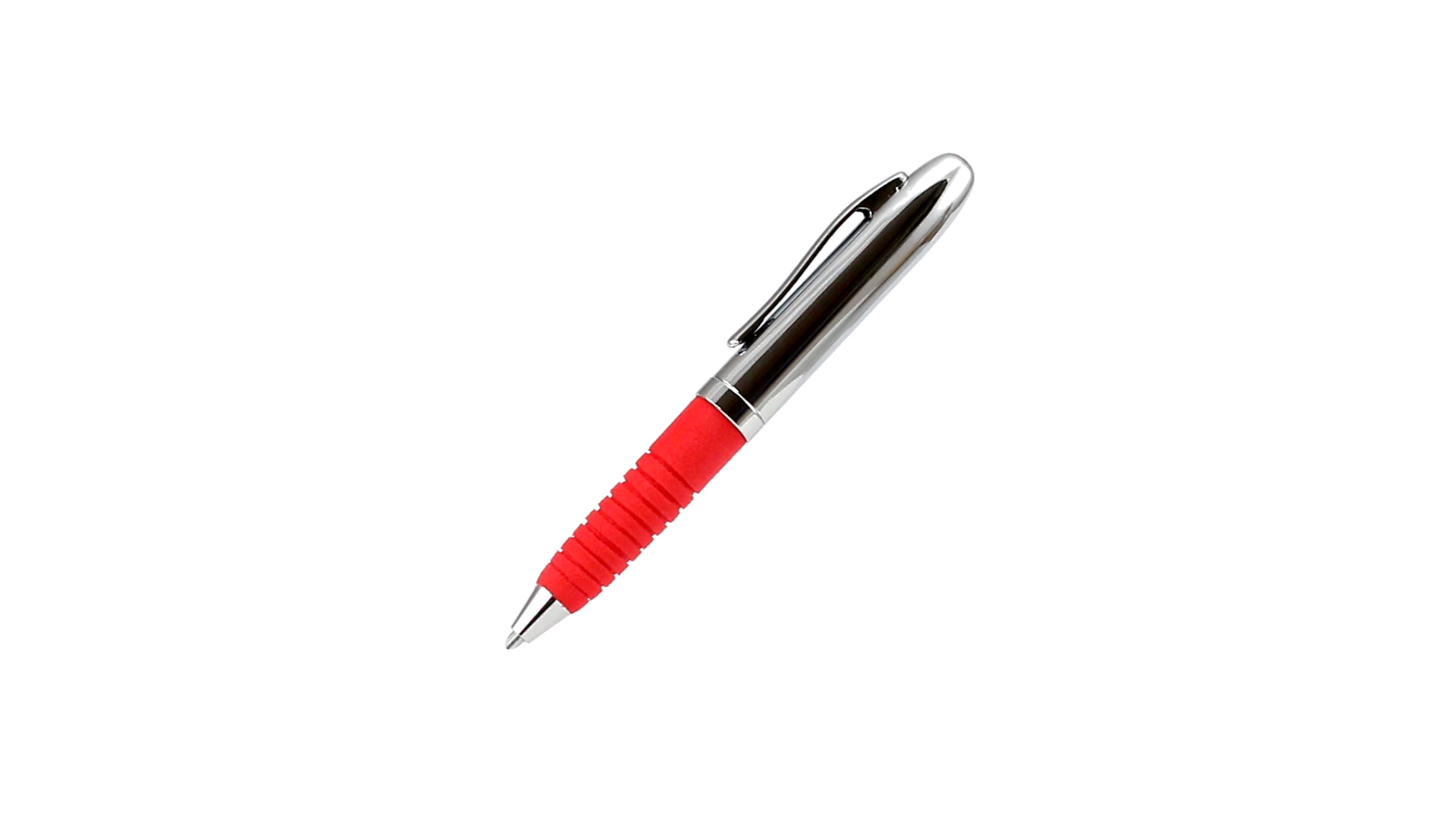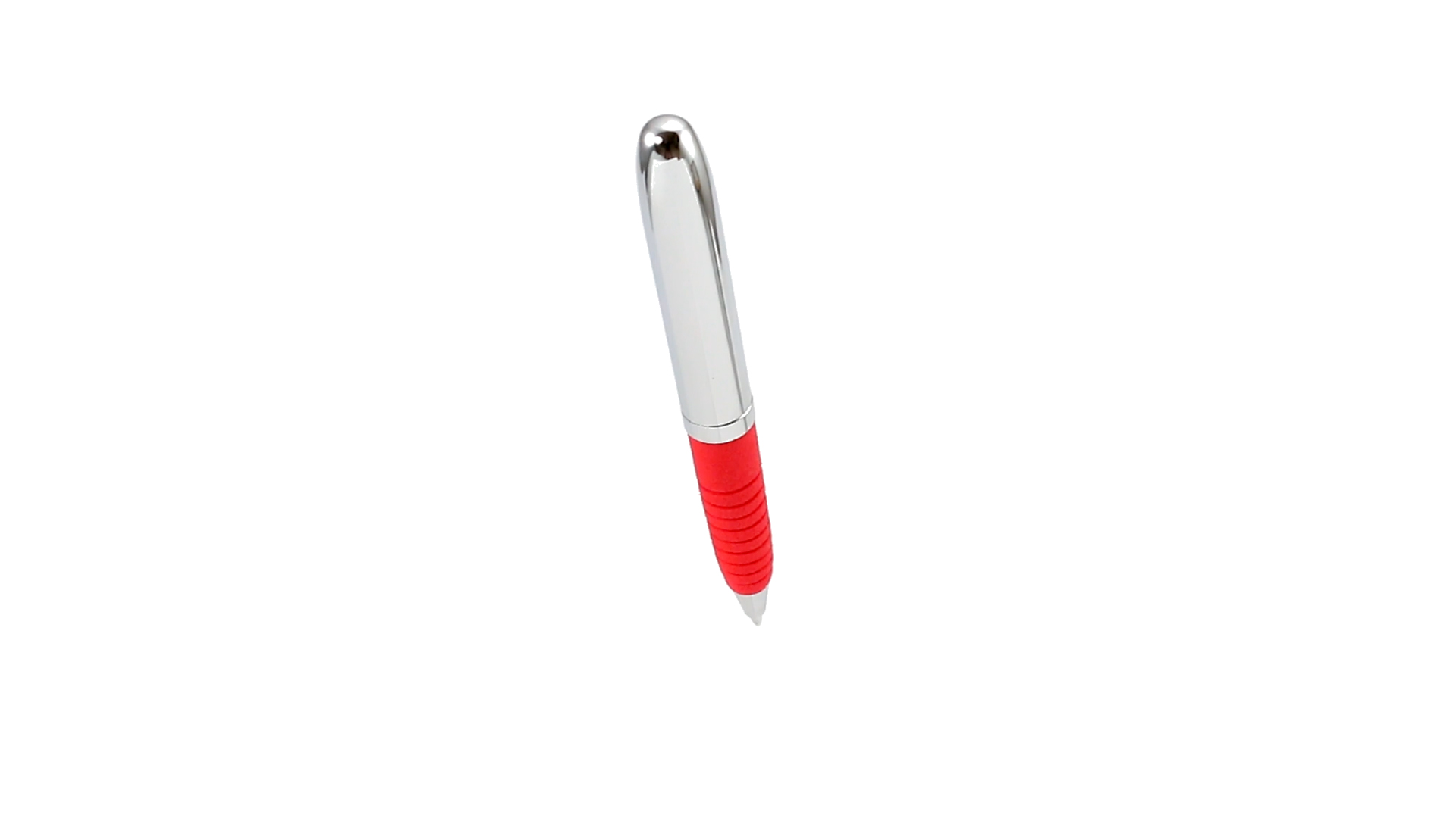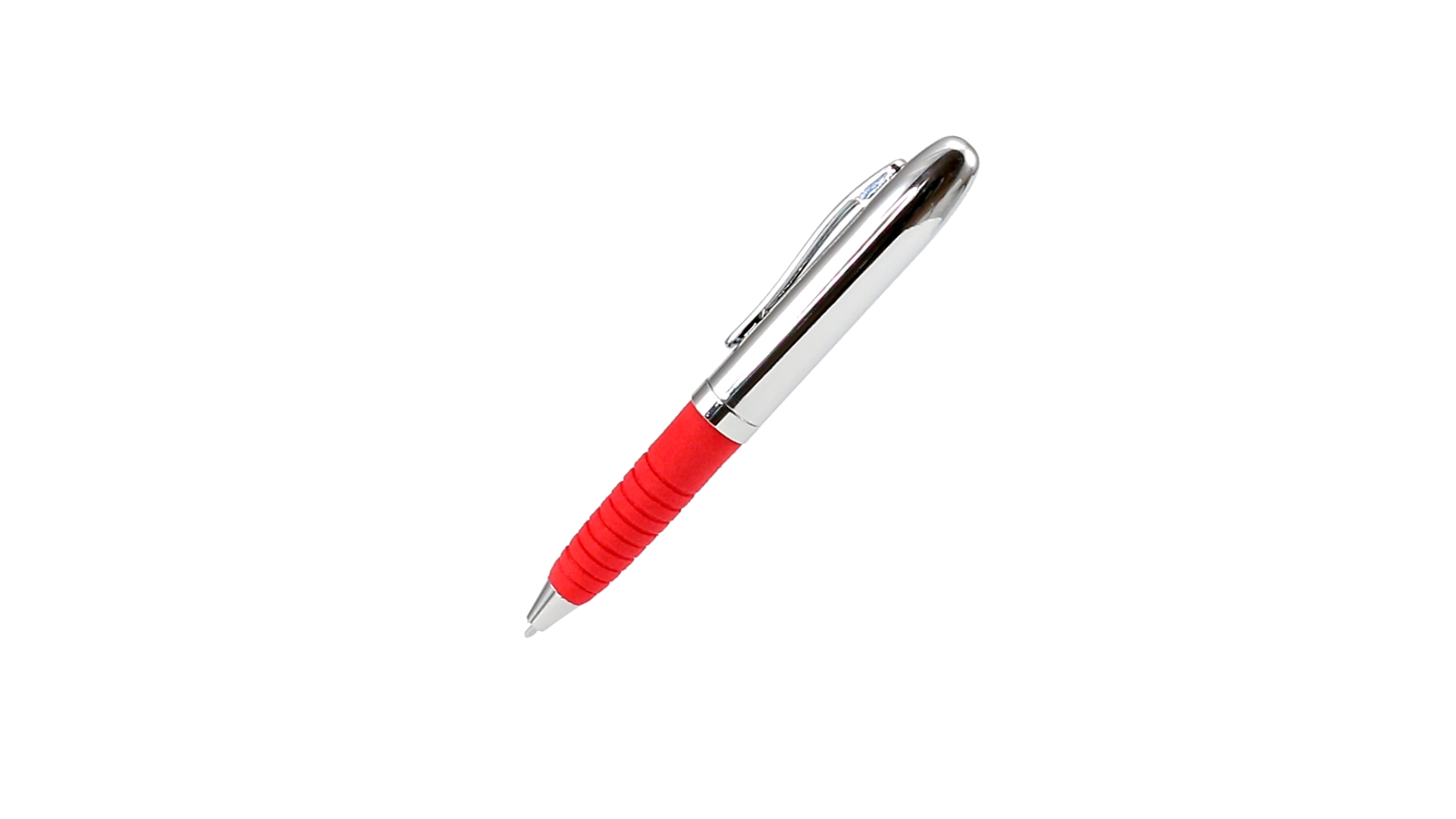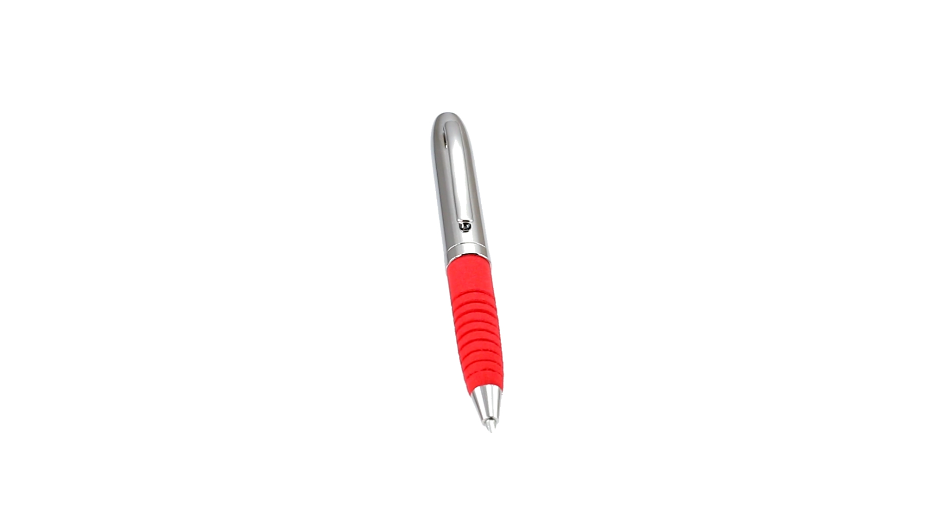 Origineller Metall-Kugelschreiber mit elegantem, zweifarbigem Design. Griff aus angenehm weichem EVA-Kunststoff in verschiedenen Farben. Ringe und Spitze in Silber. Blaue Tinte.