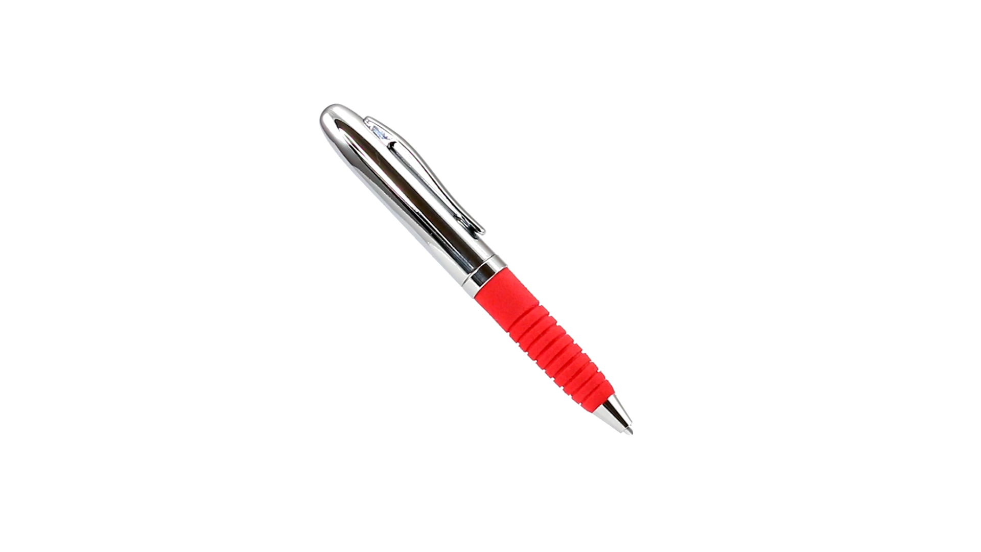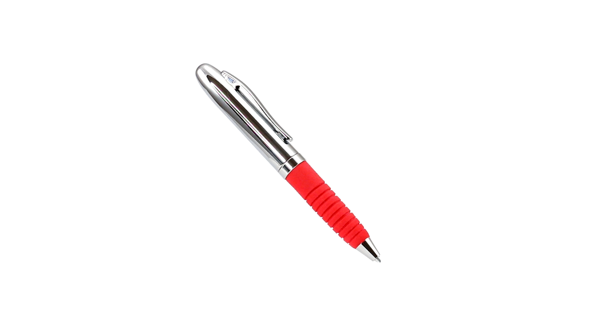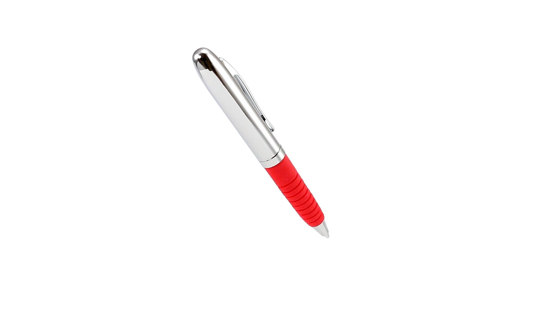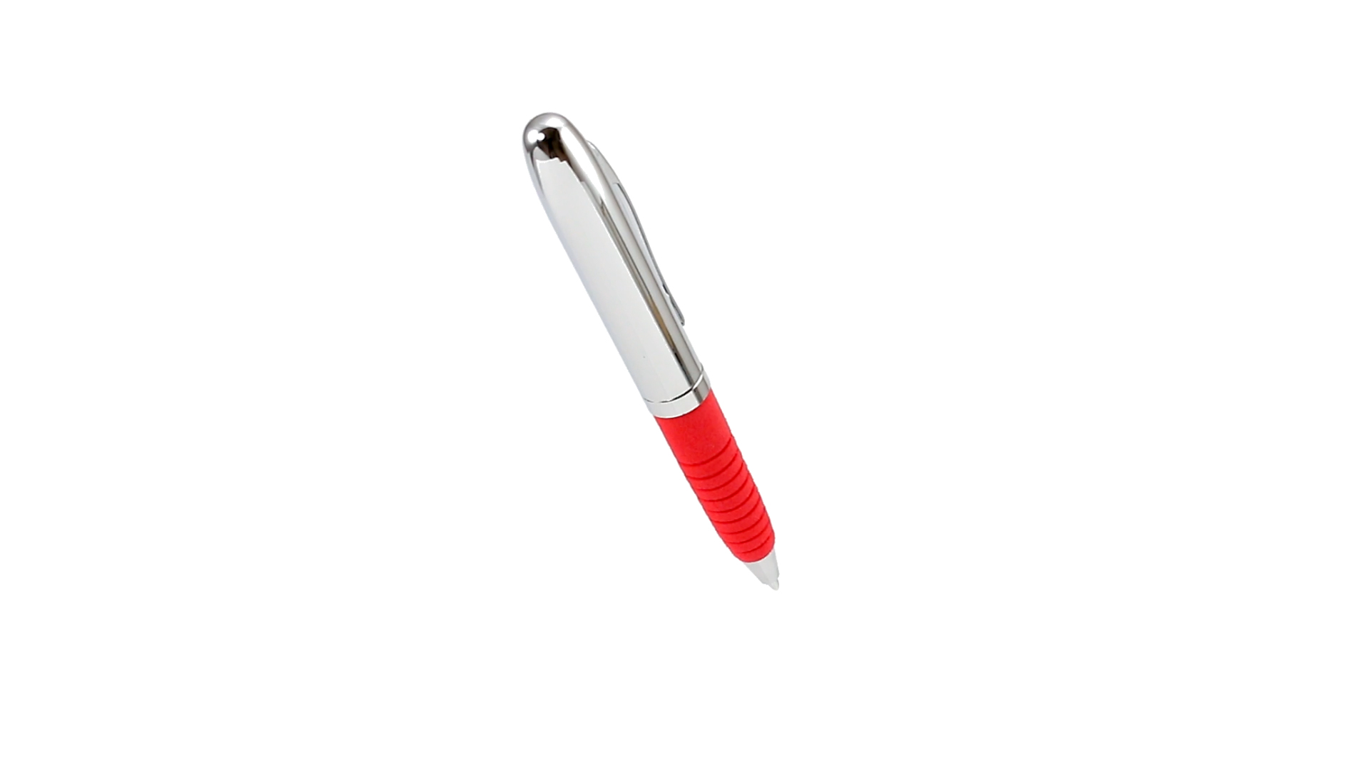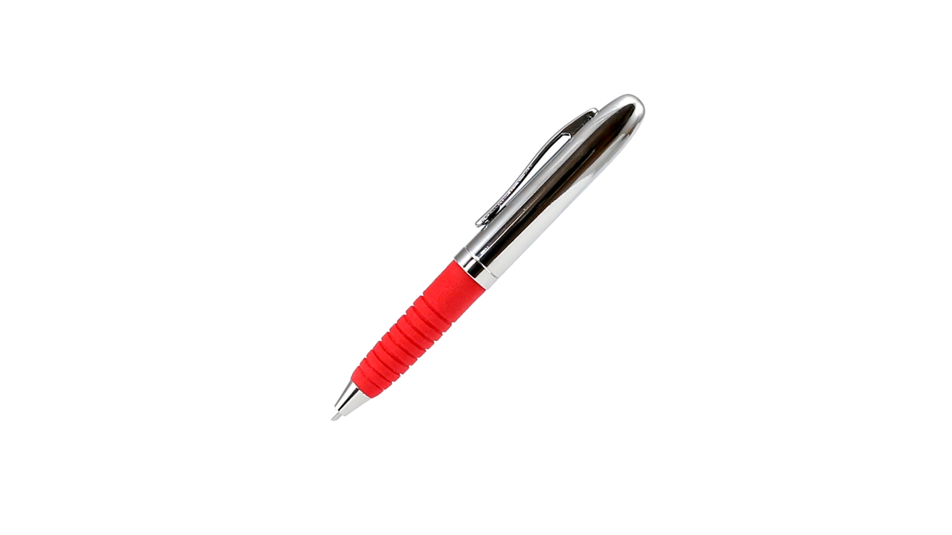 Origineller Metall-Kugelschreiber mit elegantem, zweifarbigem Design. Griff aus angenehm weichem EVA-Kunststoff in verschiedenen Farben. Ringe und Spitze in Silber. Blaue Tinte.