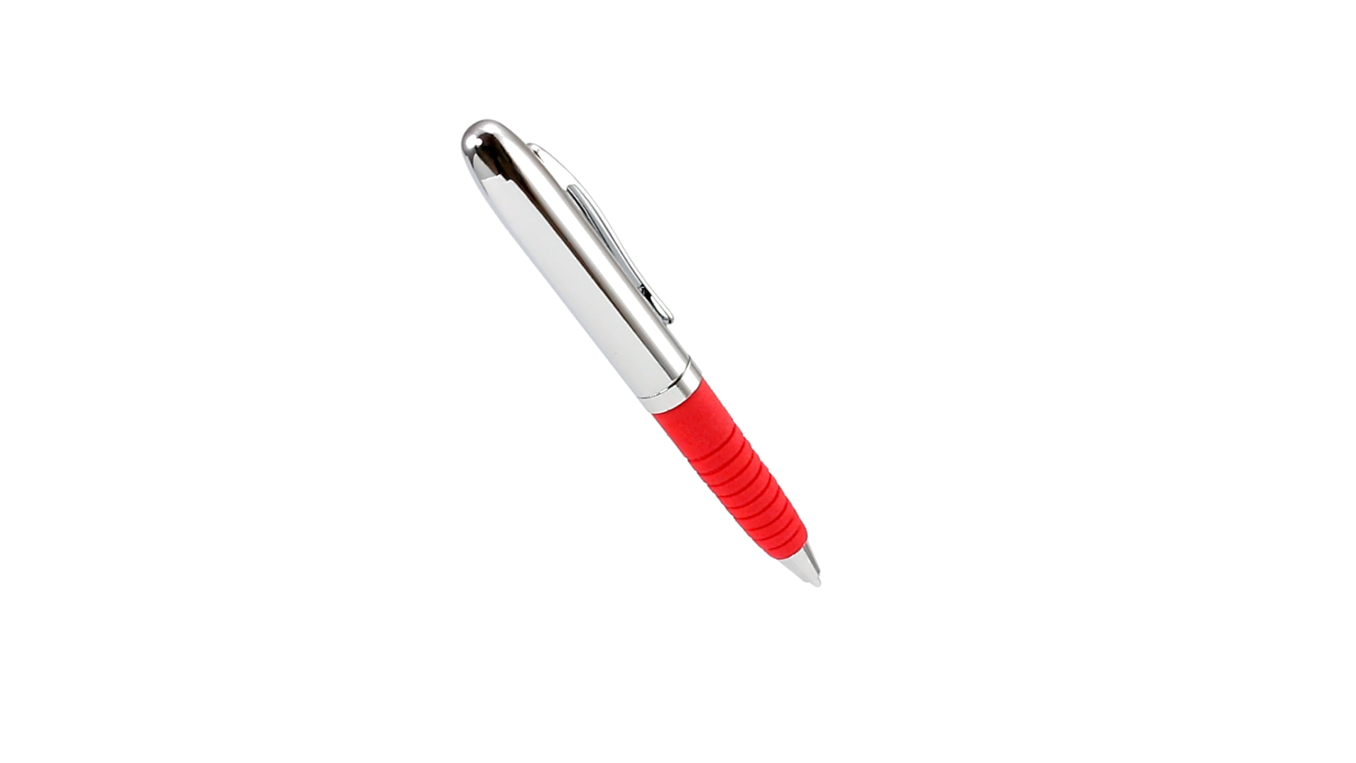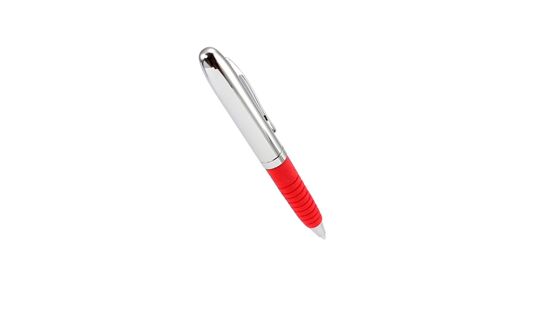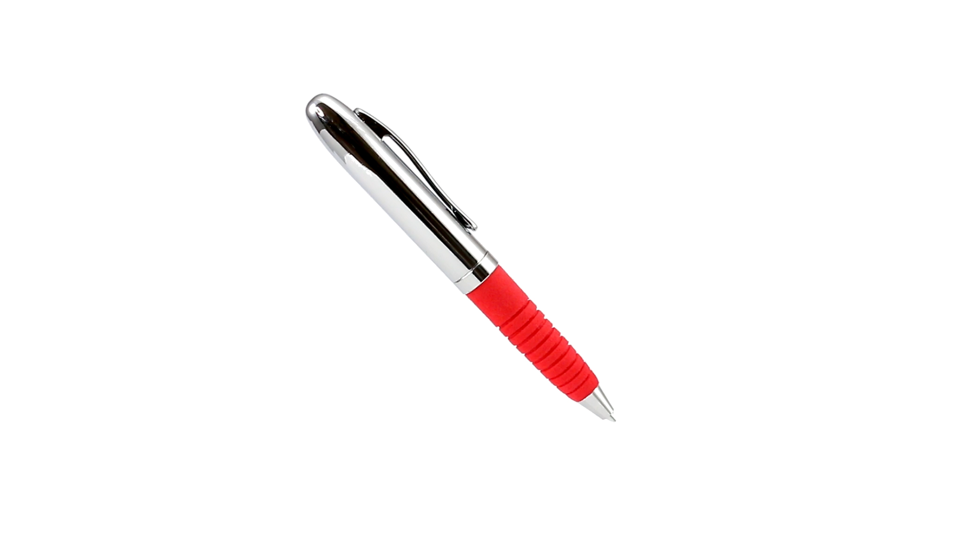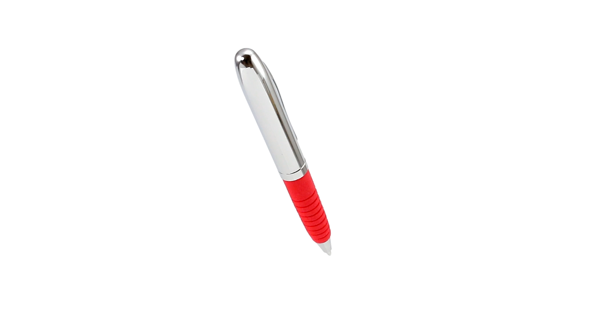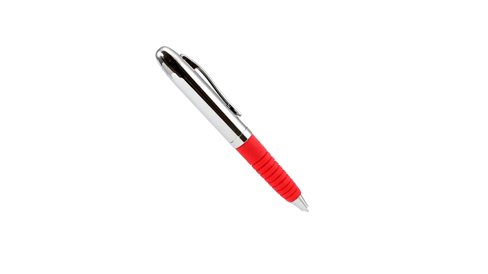 Origineller Metall-Kugelschreiber mit elegantem, zweifarbigem Design. Griff aus angenehm weichem EVA-Kunststoff in verschiedenen Farben. Ringe und Spitze in Silber. Blaue Tinte.