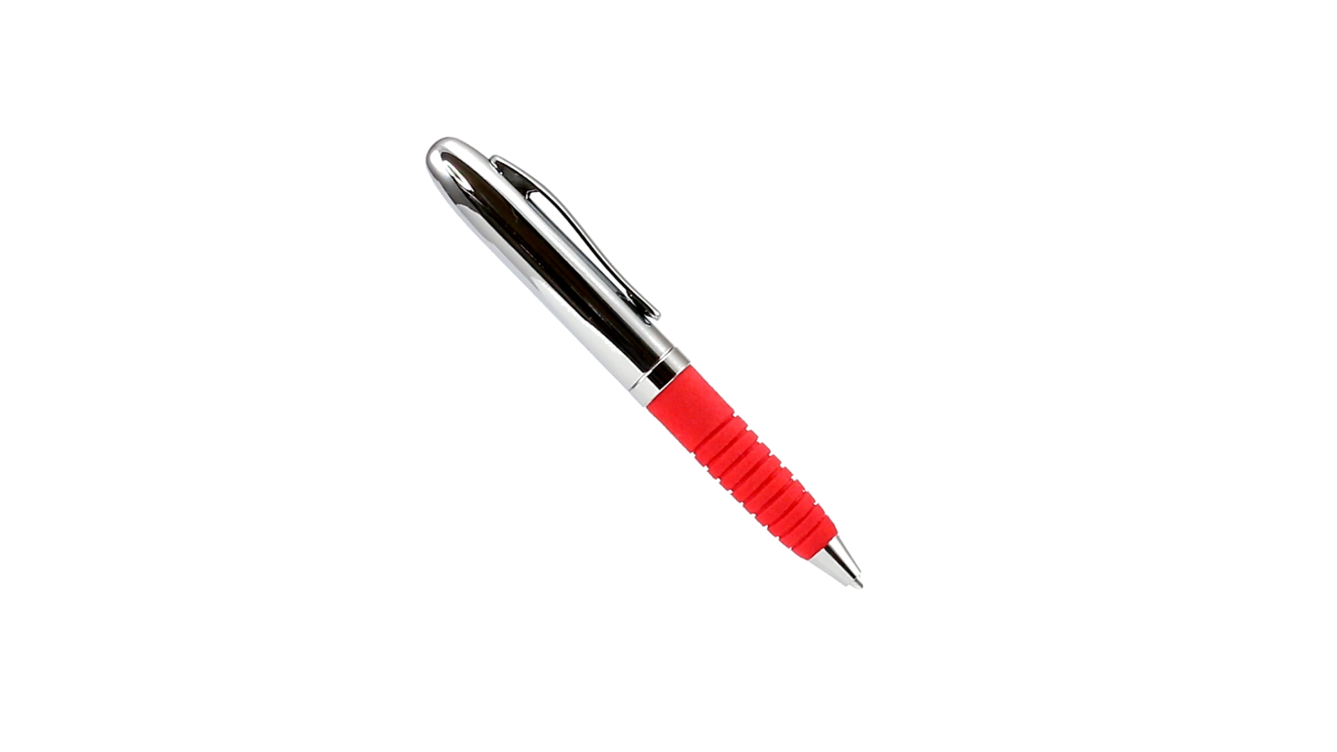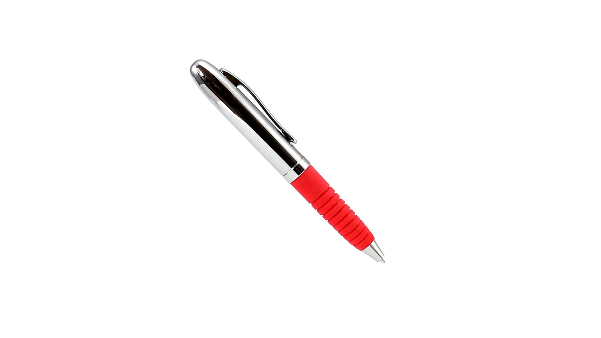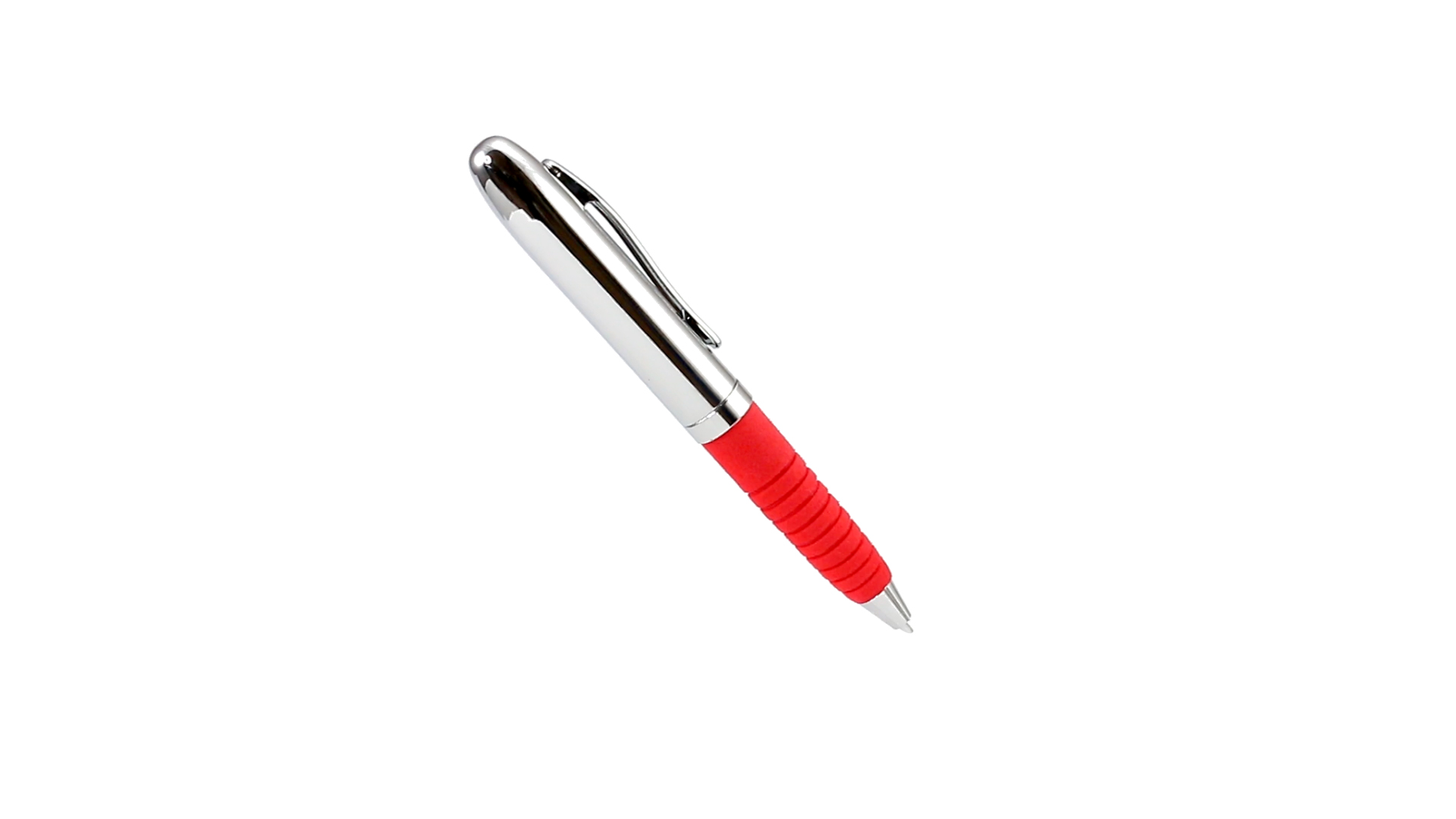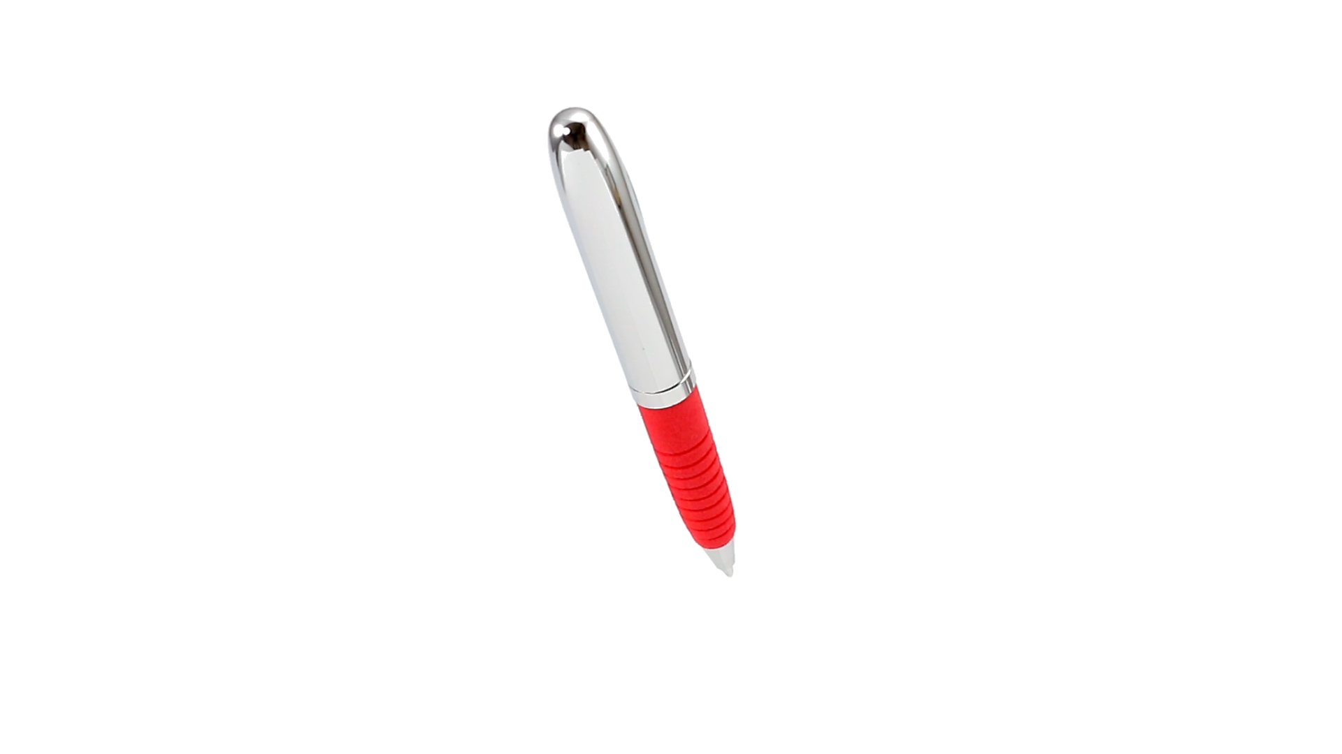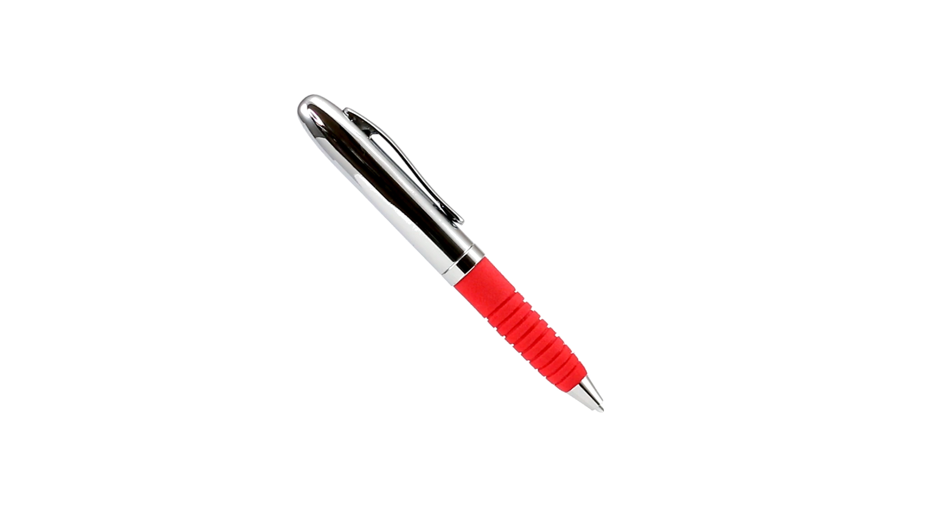 Origineller Metall-Kugelschreiber mit elegantem, zweifarbigem Design. Griff aus angenehm weichem EVA-Kunststoff in verschiedenen Farben. Ringe und Spitze in Silber. Blaue Tinte.
