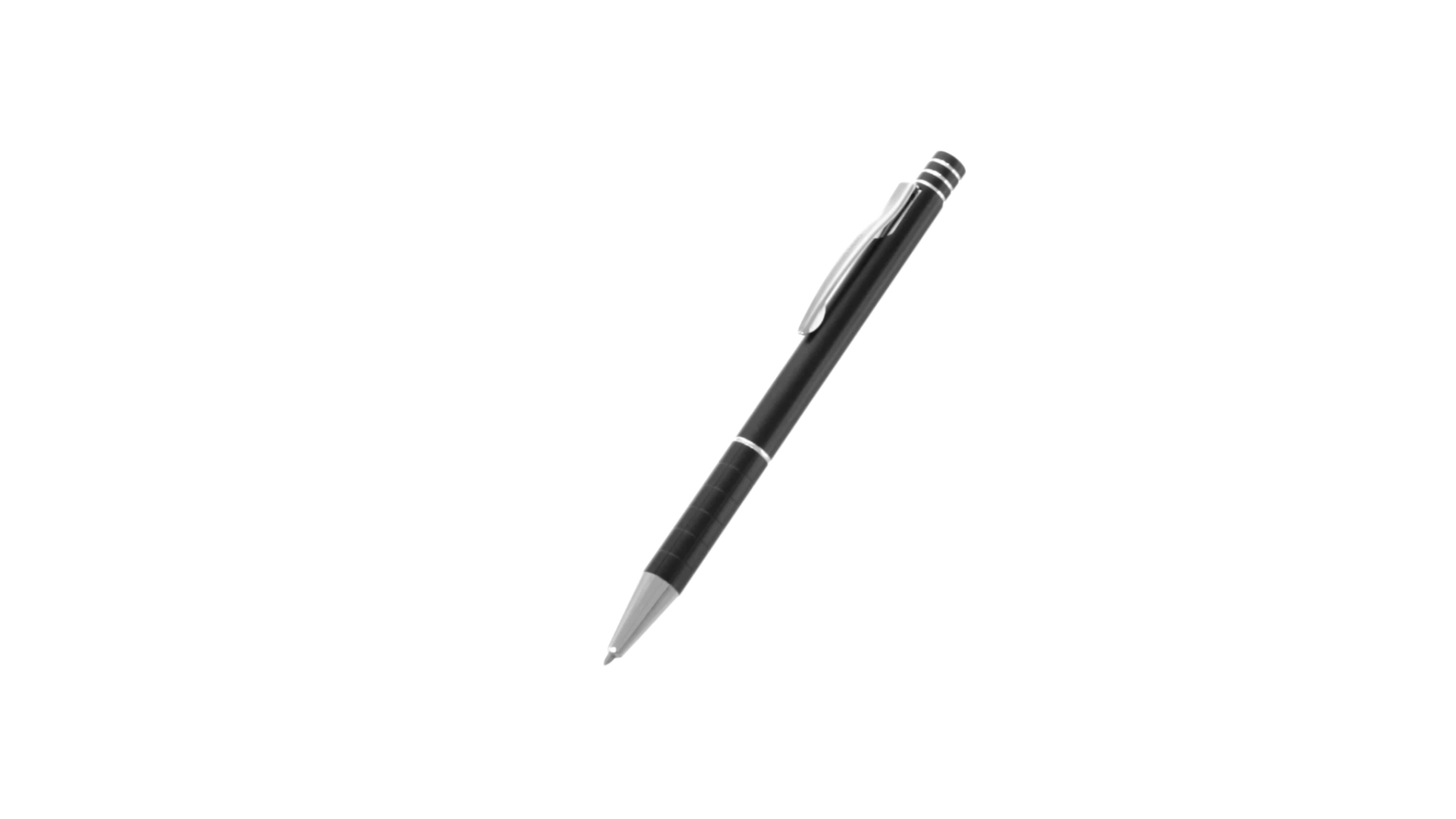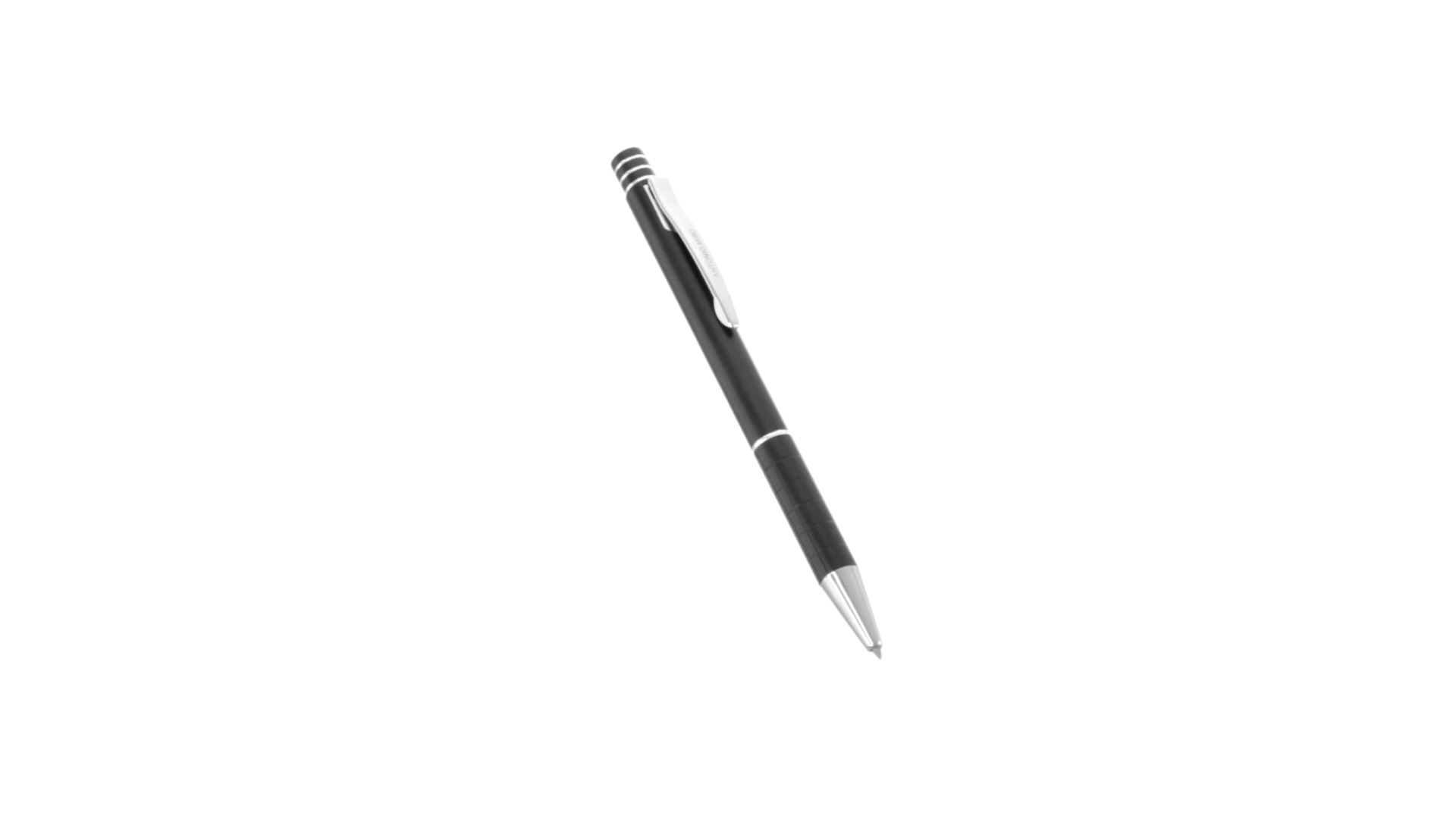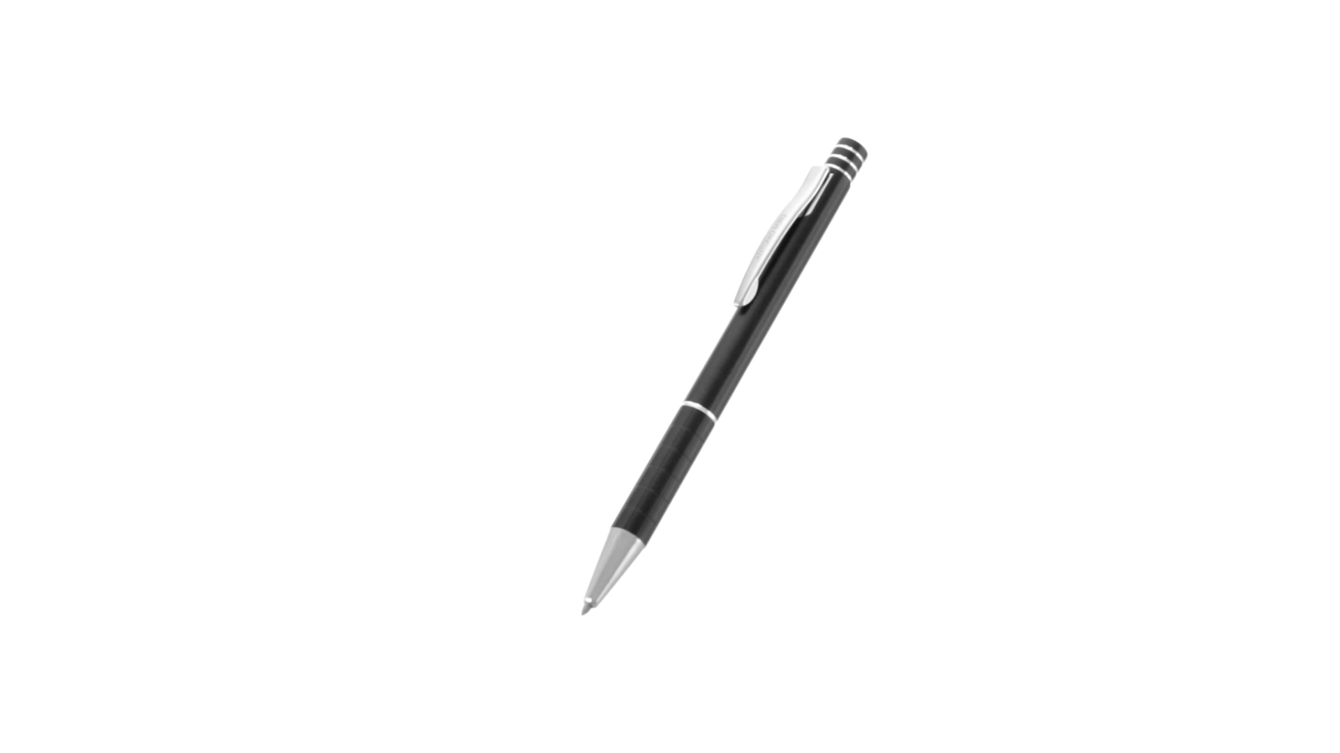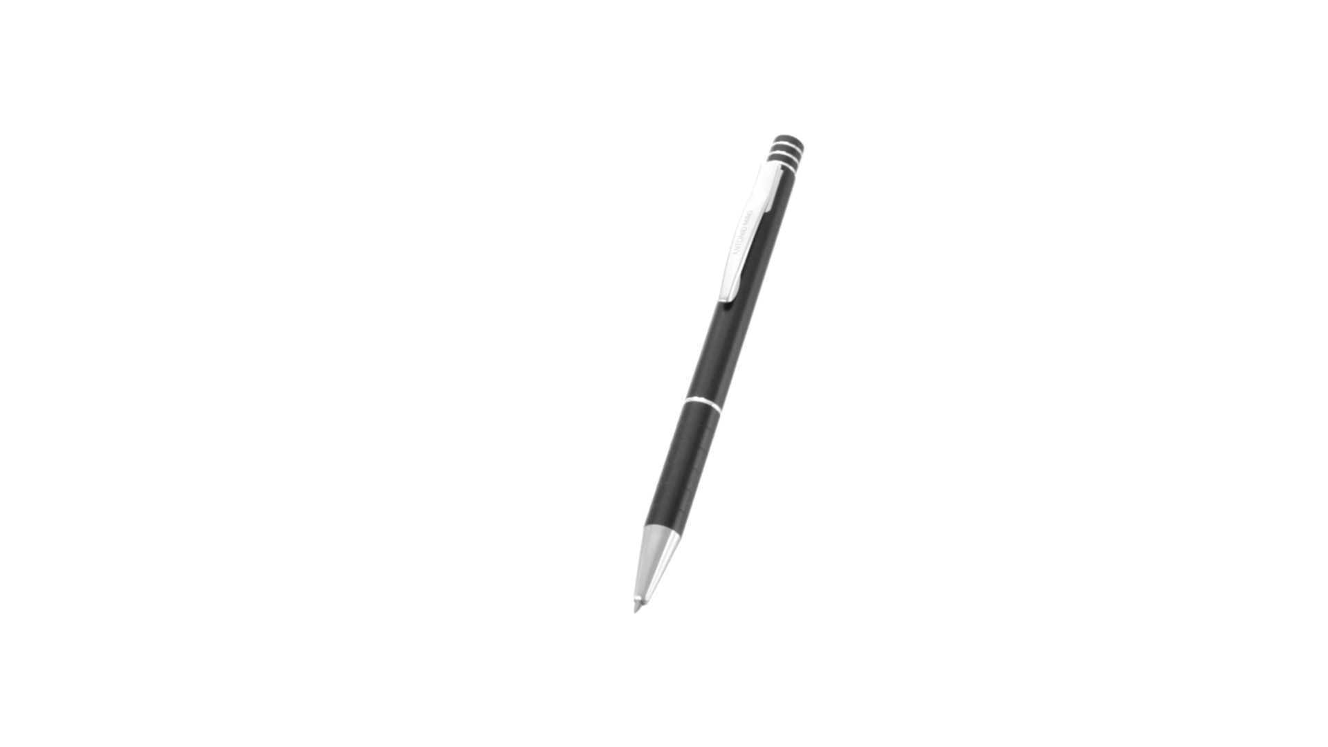Dreh-Kugelschreiber von Antonio Miró mit elegantem Design und geschmeidigem Aluminiumgehäuse mit silbernen Kontrastdetails. Druckknopf mit Ring-Design und origineller Metallclip. Präsentiert in einem individuellen Aluminium-Case in Schwarz mit dem Markenlogo. Blaue Tinte.