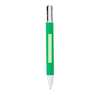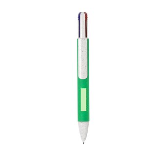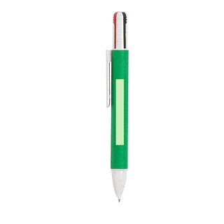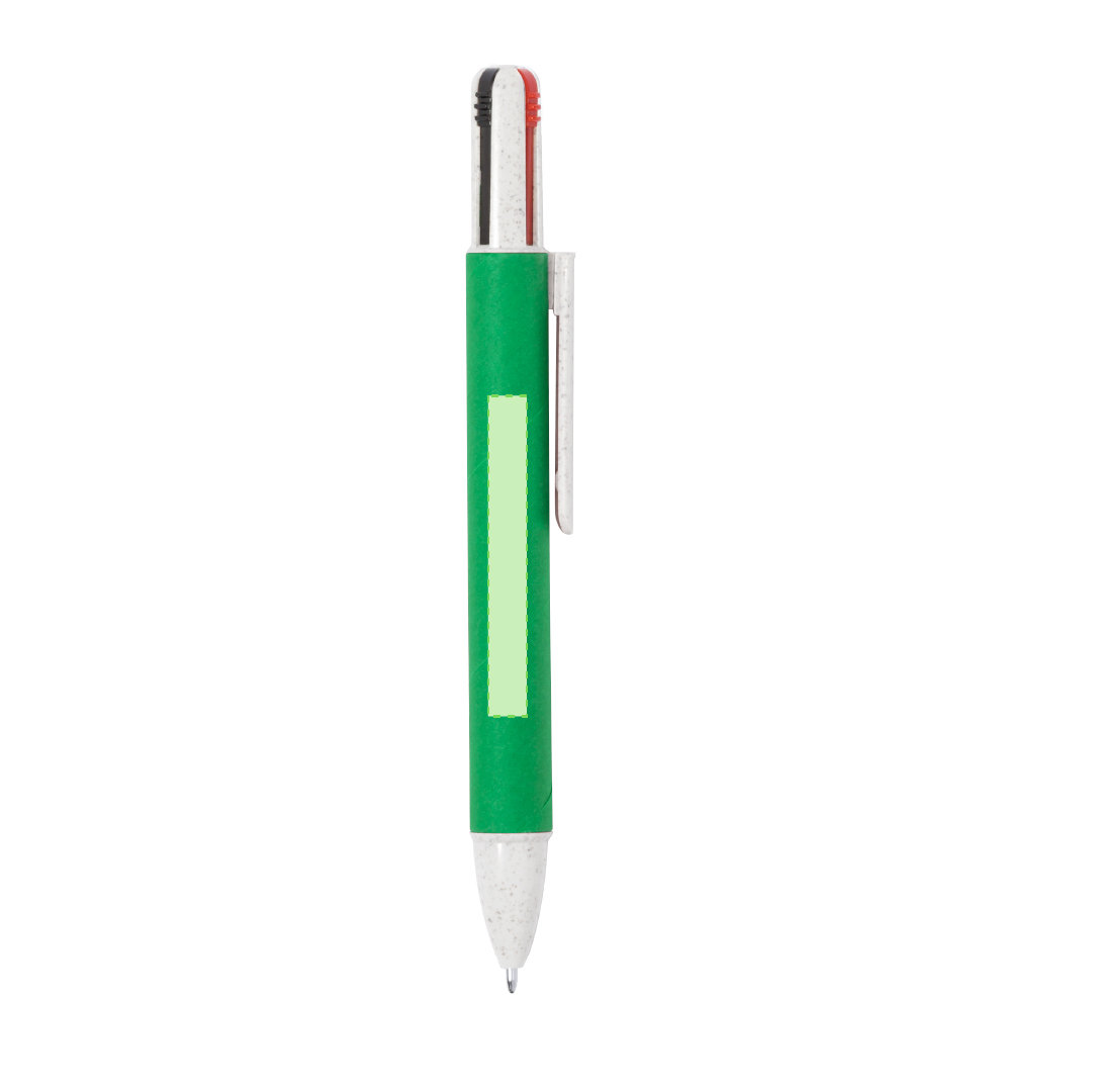 4-in-1-Kugelschreiber mit Druckknopf-Einziehmechanismus. Kombination aus einem Fass aus natürlichem Recyclingkarton und Zubehör aus Weizenstroh und ABS, um die Nutzung und das Recycling von Rohstoffen zu fördern und so den Schadstoffausstoss zu reduzieren. Mit 4 Patronen in blauer, roter, schwarzer und grüner Tinte.
