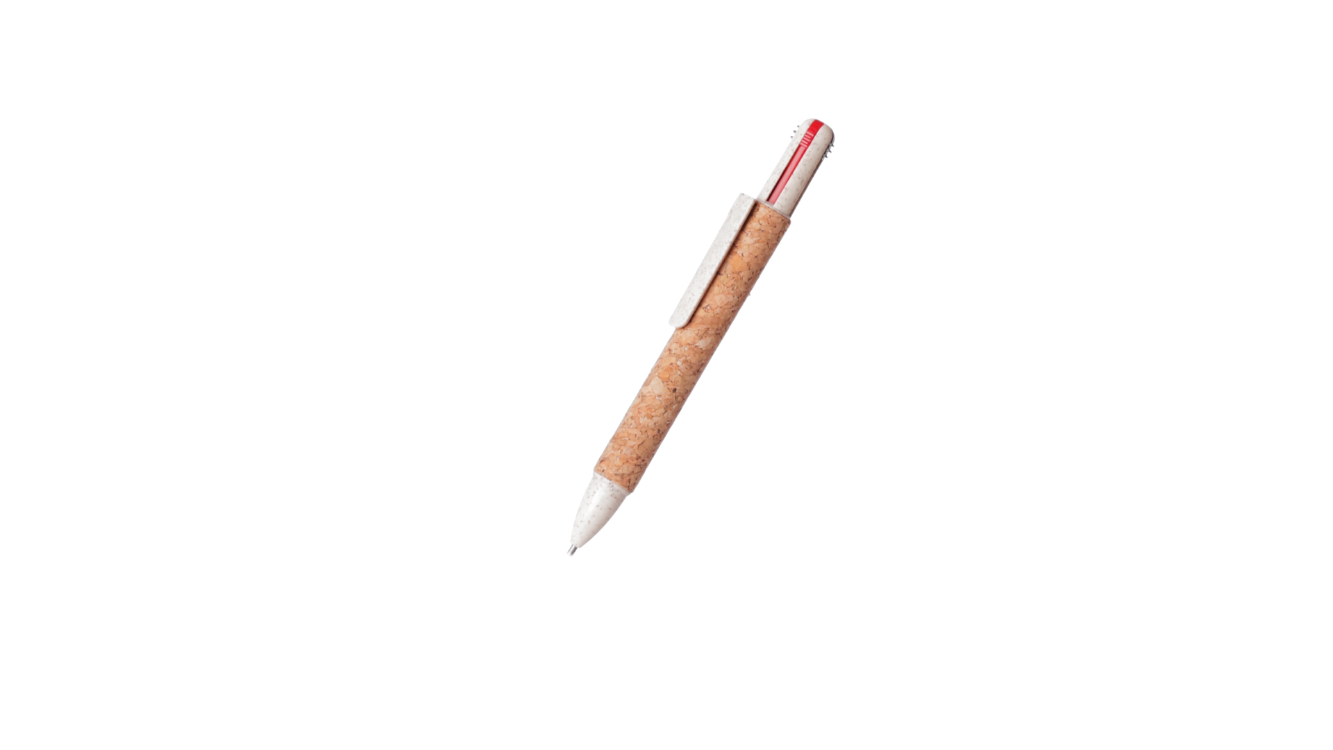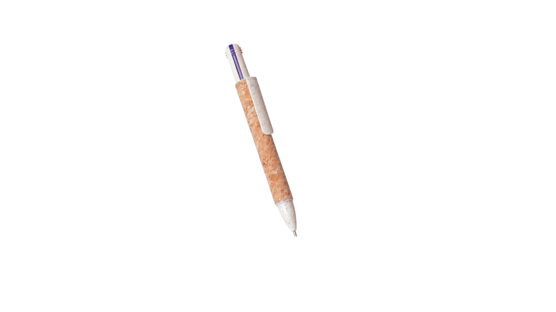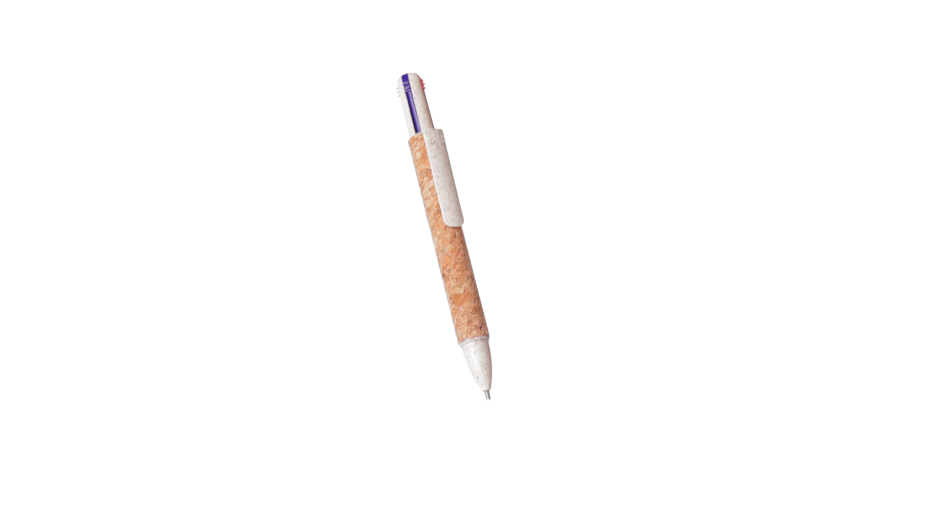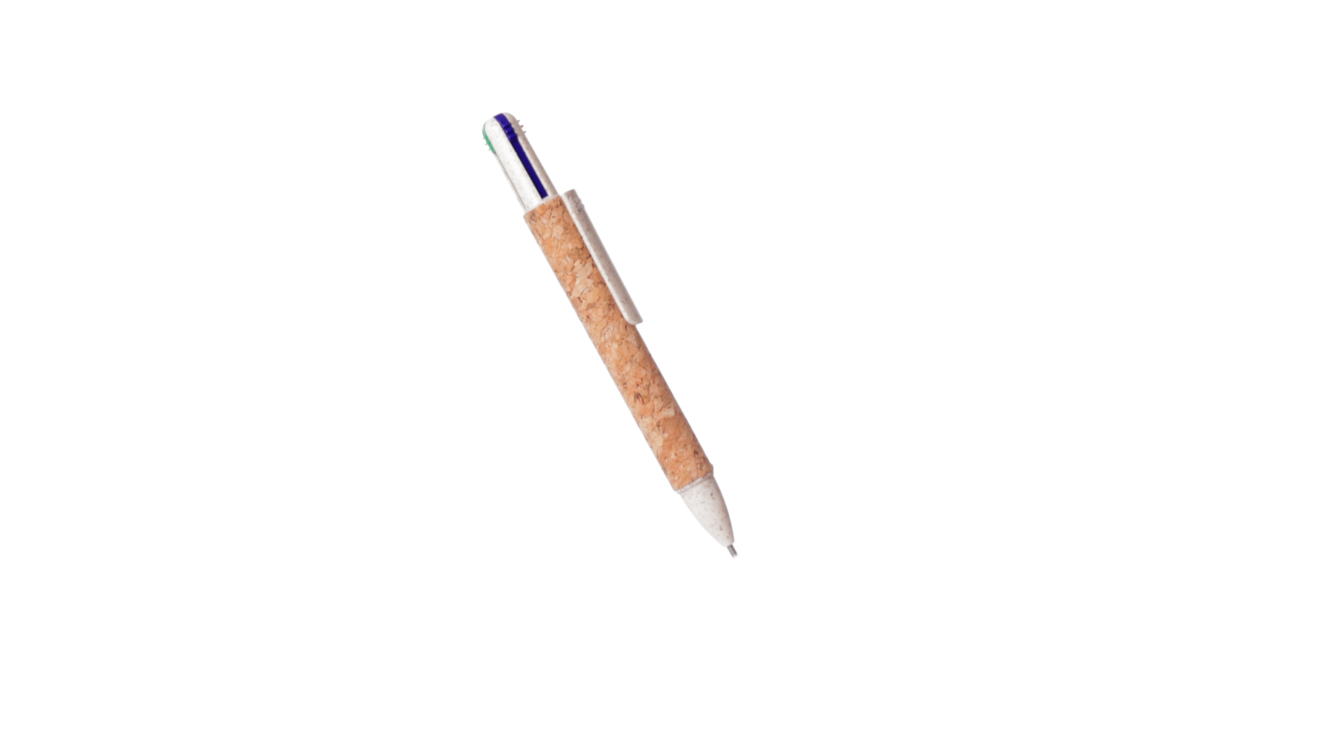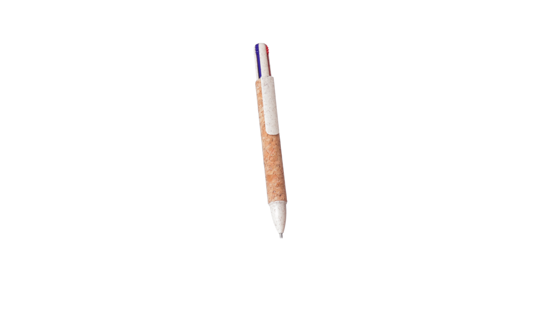 4-in-1 Kugelschreiber mit einziehbarem Druckknopfmechanismus. Kombination aus Naturkorkzylinder und Zubehör aus Weizenrohr und ABS, um die Verwendung und das Recycling von Rohstoffen zu fördern und so die Schadstoffemissionen zu reduzieren. Mit 4 Patronen in blauer, roter, schwarzer und grüner Tinte.Hergestellt aus pflanzlichen Bestandteilen, um die Verwendung natürlicher Rohstoffe zu fördern und die Schadstoffemissionen zu reduzieren.