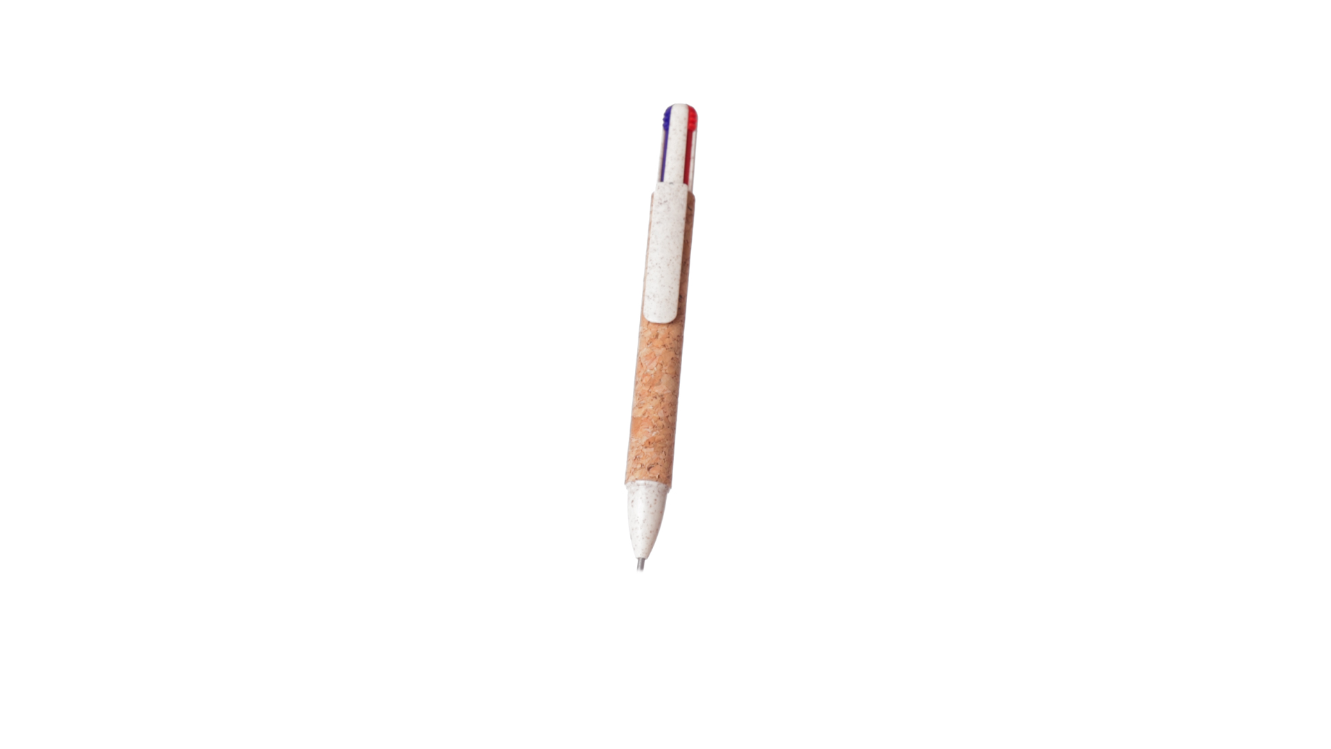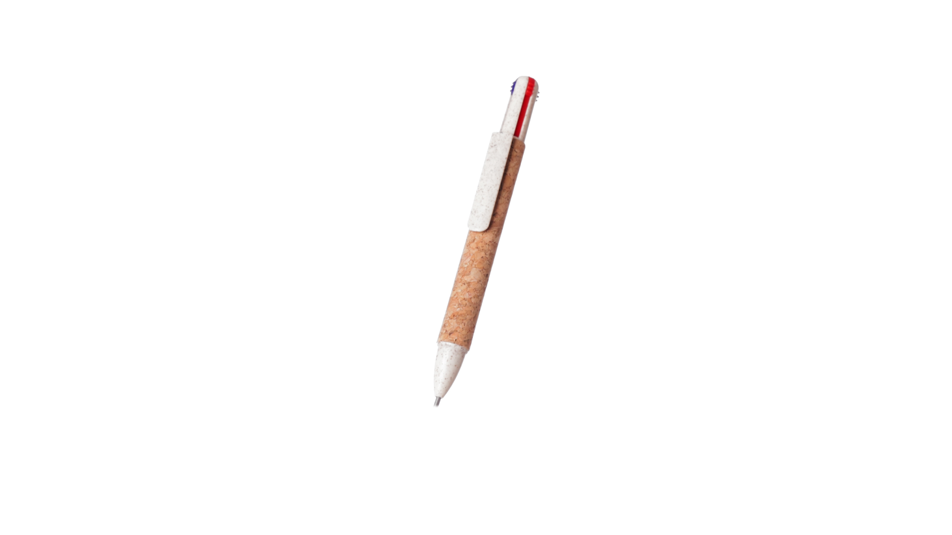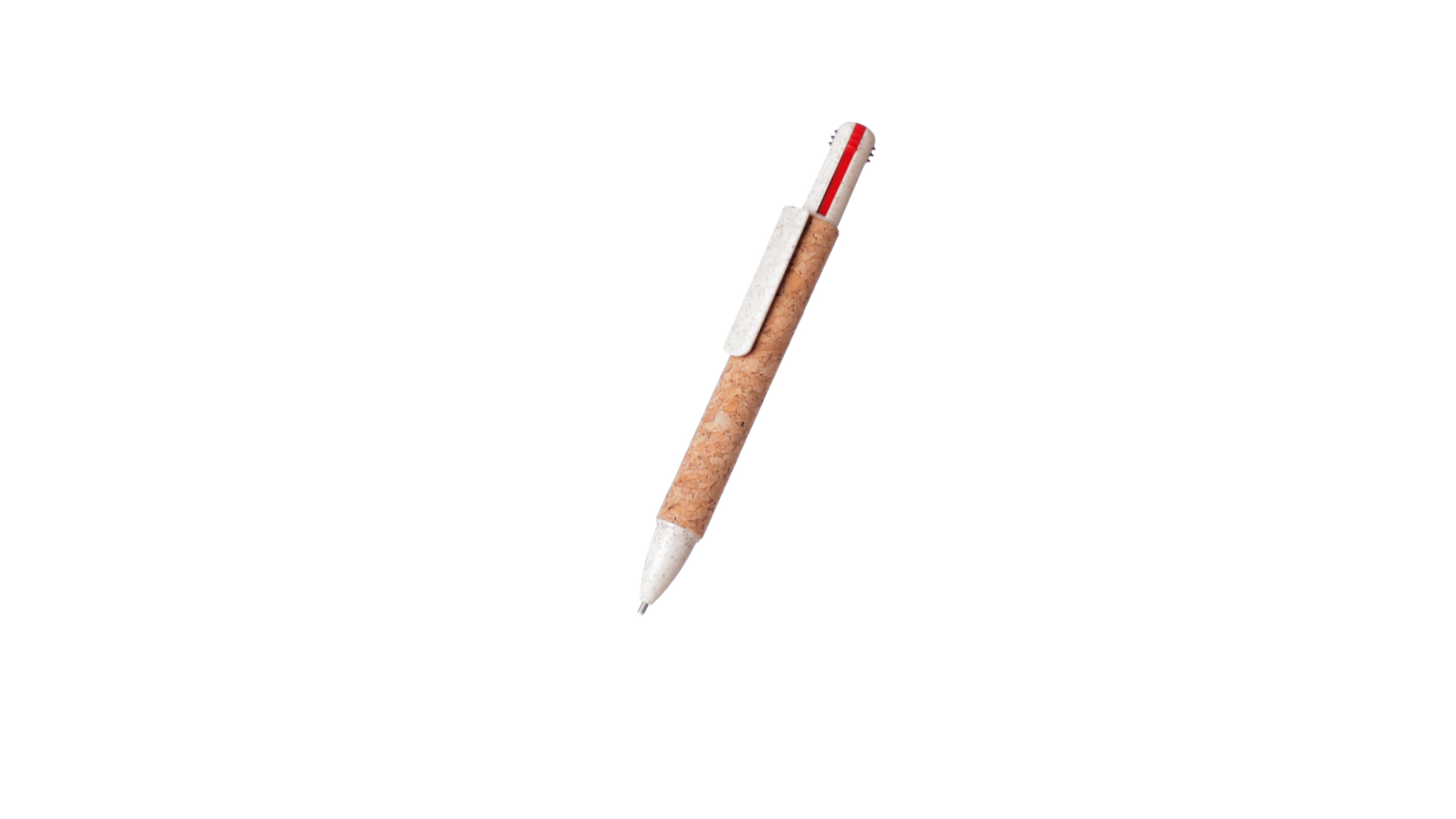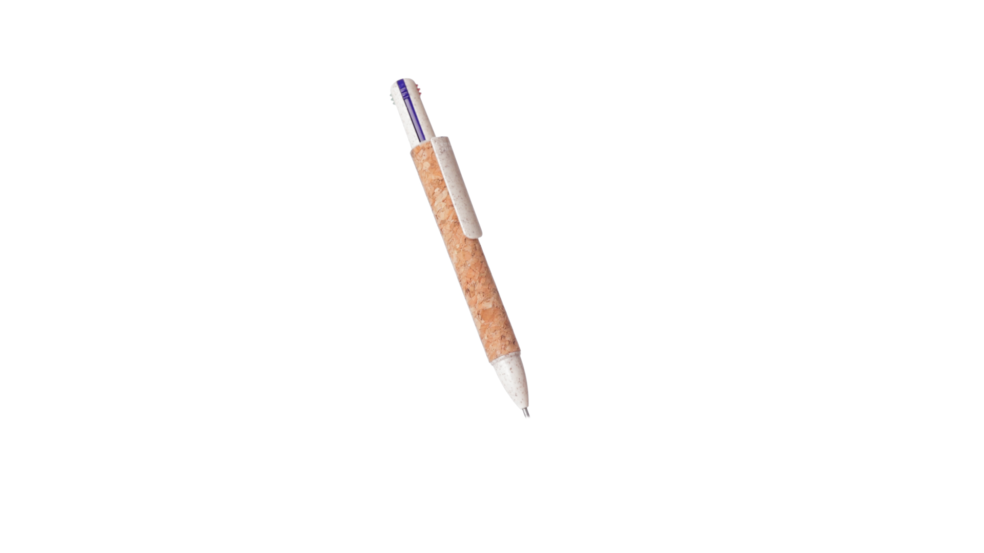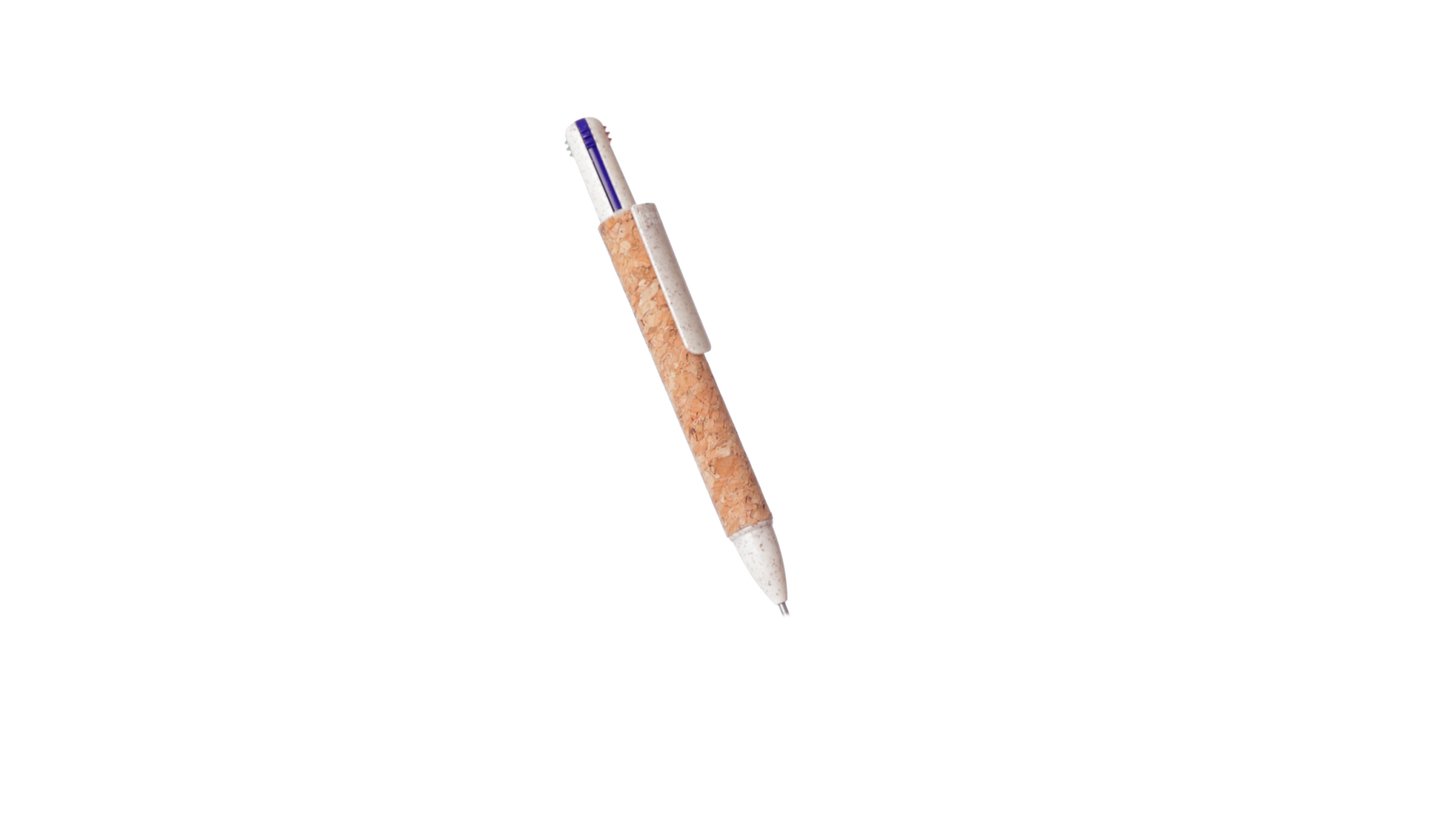 4-in-1 Kugelschreiber mit einziehbarem Druckknopfmechanismus. Kombination aus Naturkorkzylinder und Zubehör aus Weizenrohr und ABS, um die Verwendung und das Recycling von Rohstoffen zu fördern und so die Schadstoffemissionen zu reduzieren. Mit 4 Patronen in blauer, roter, schwarzer und grüner Tinte.Hergestellt aus pflanzlichen Bestandteilen, um die Verwendung natürlicher Rohstoffe zu fördern und die Schadstoffemissionen zu reduzieren.