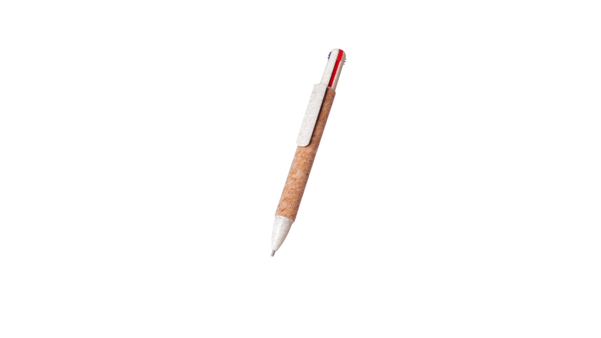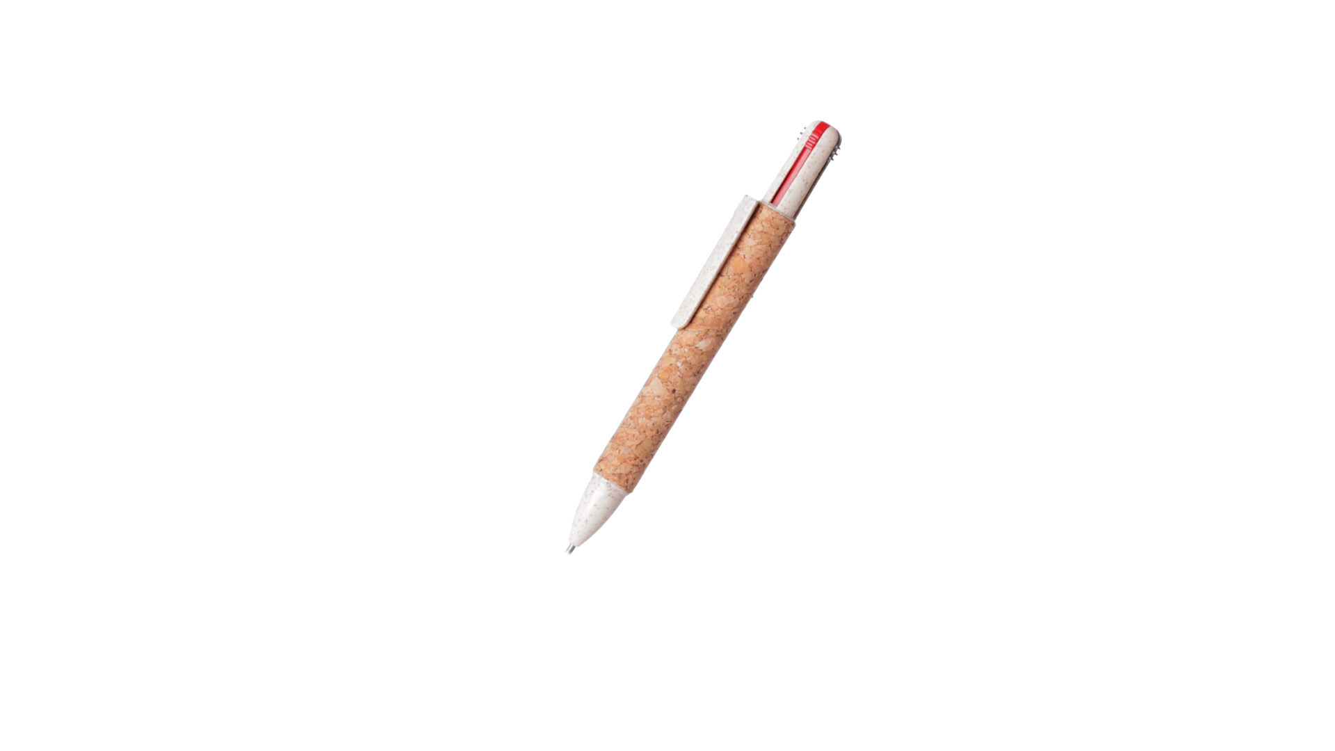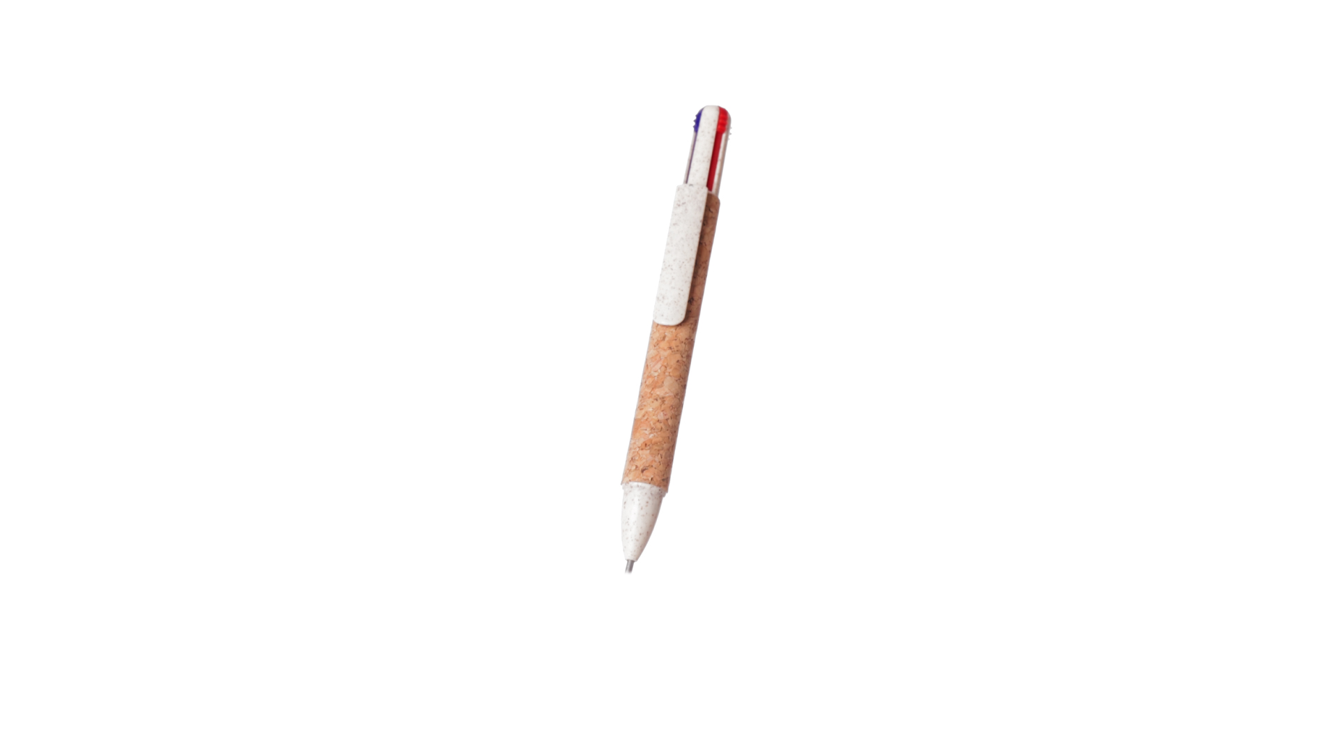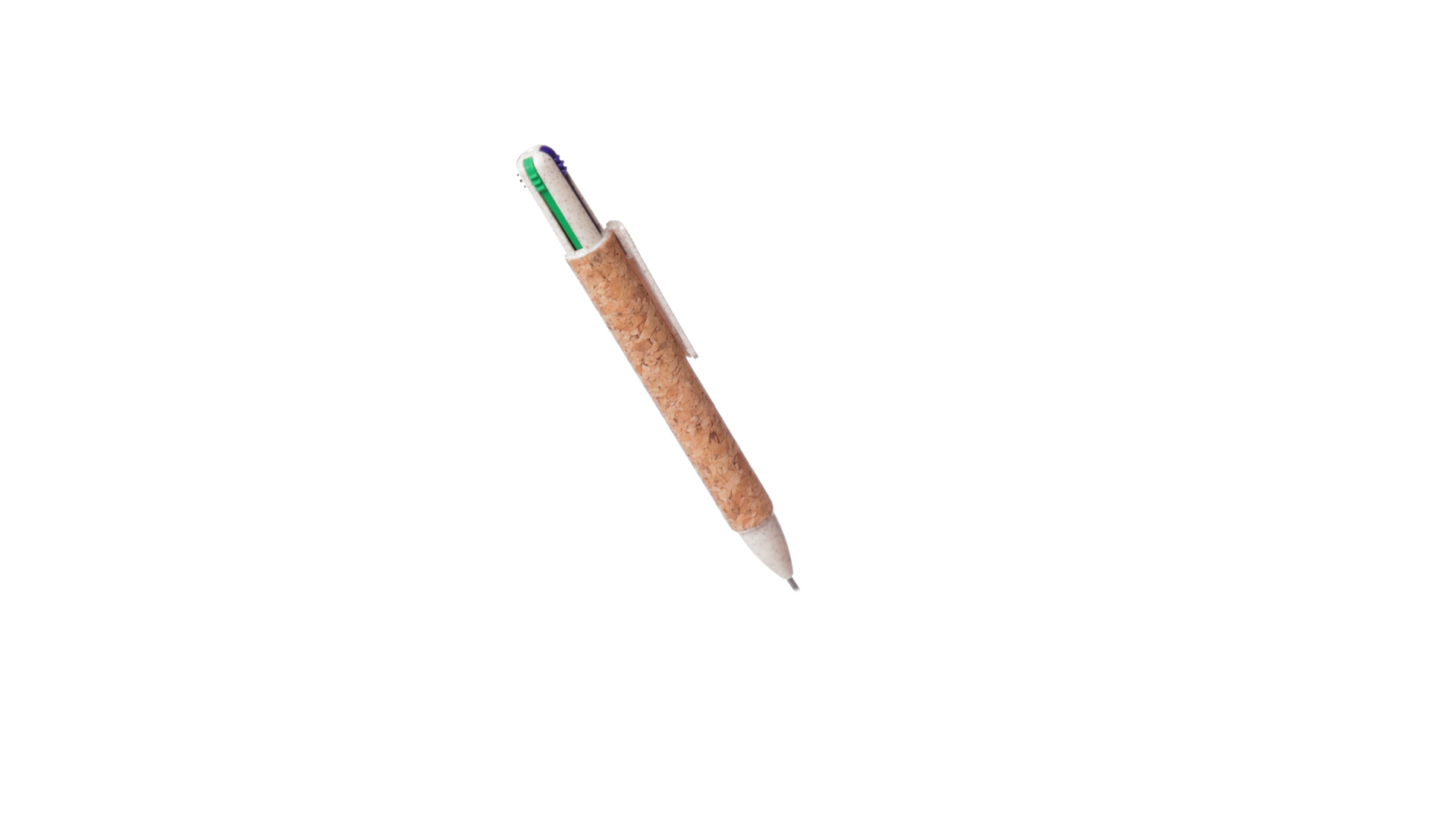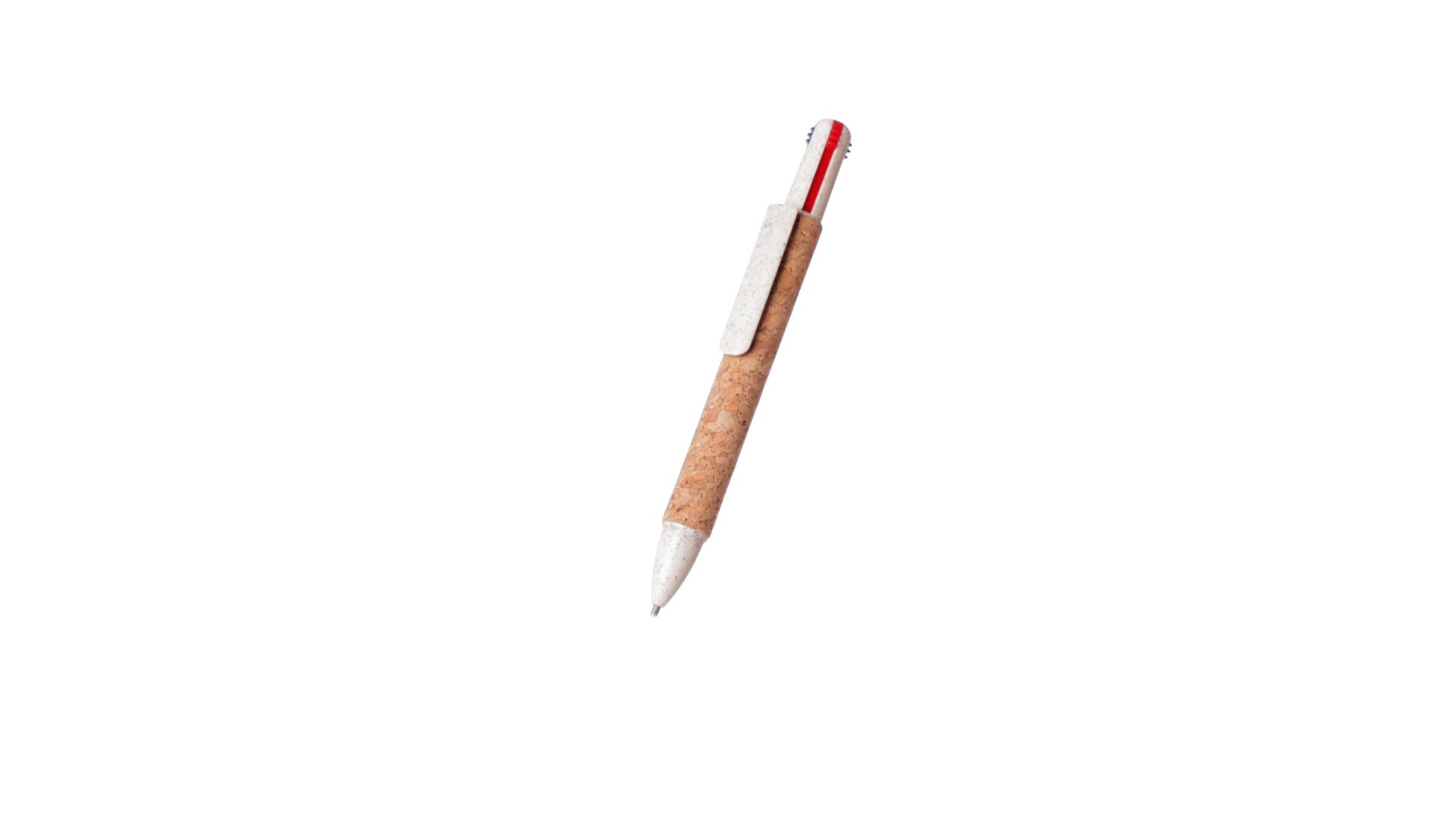 4-in-1 Kugelschreiber mit einziehbarem Druckknopfmechanismus. Kombination aus Naturkorkzylinder und Zubehör aus Weizenrohr und ABS, um die Verwendung und das Recycling von Rohstoffen zu fördern und so die Schadstoffemissionen zu reduzieren. Mit 4 Patronen in blauer, roter, schwarzer und grüner Tinte.Hergestellt aus pflanzlichen Bestandteilen, um die Verwendung natürlicher Rohstoffe zu fördern und die Schadstoffemissionen zu reduzieren.