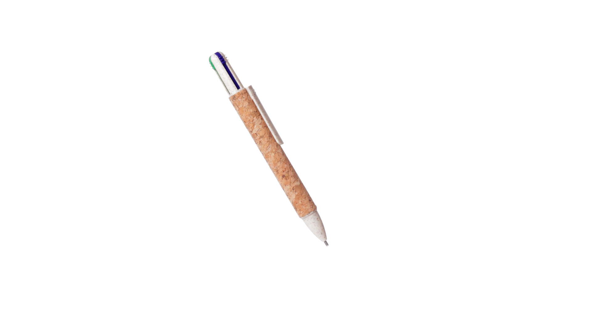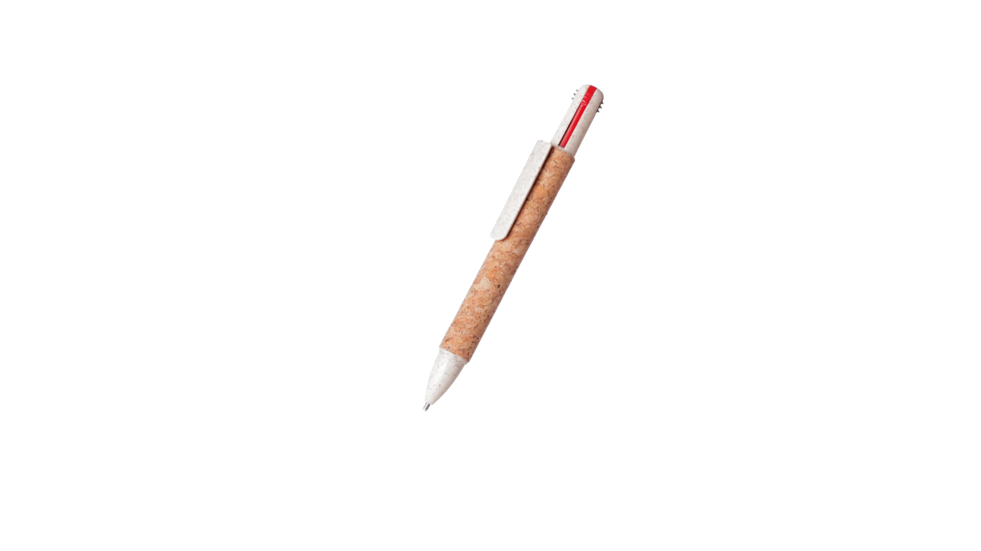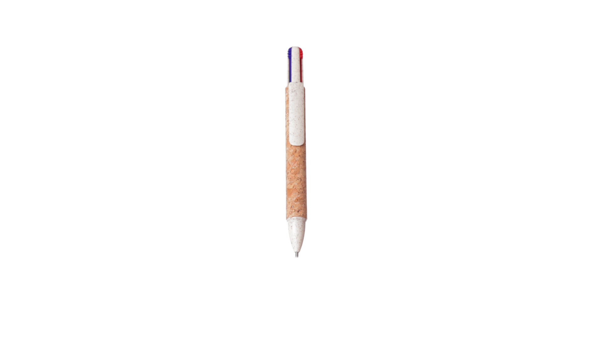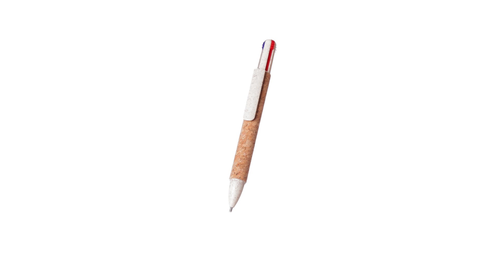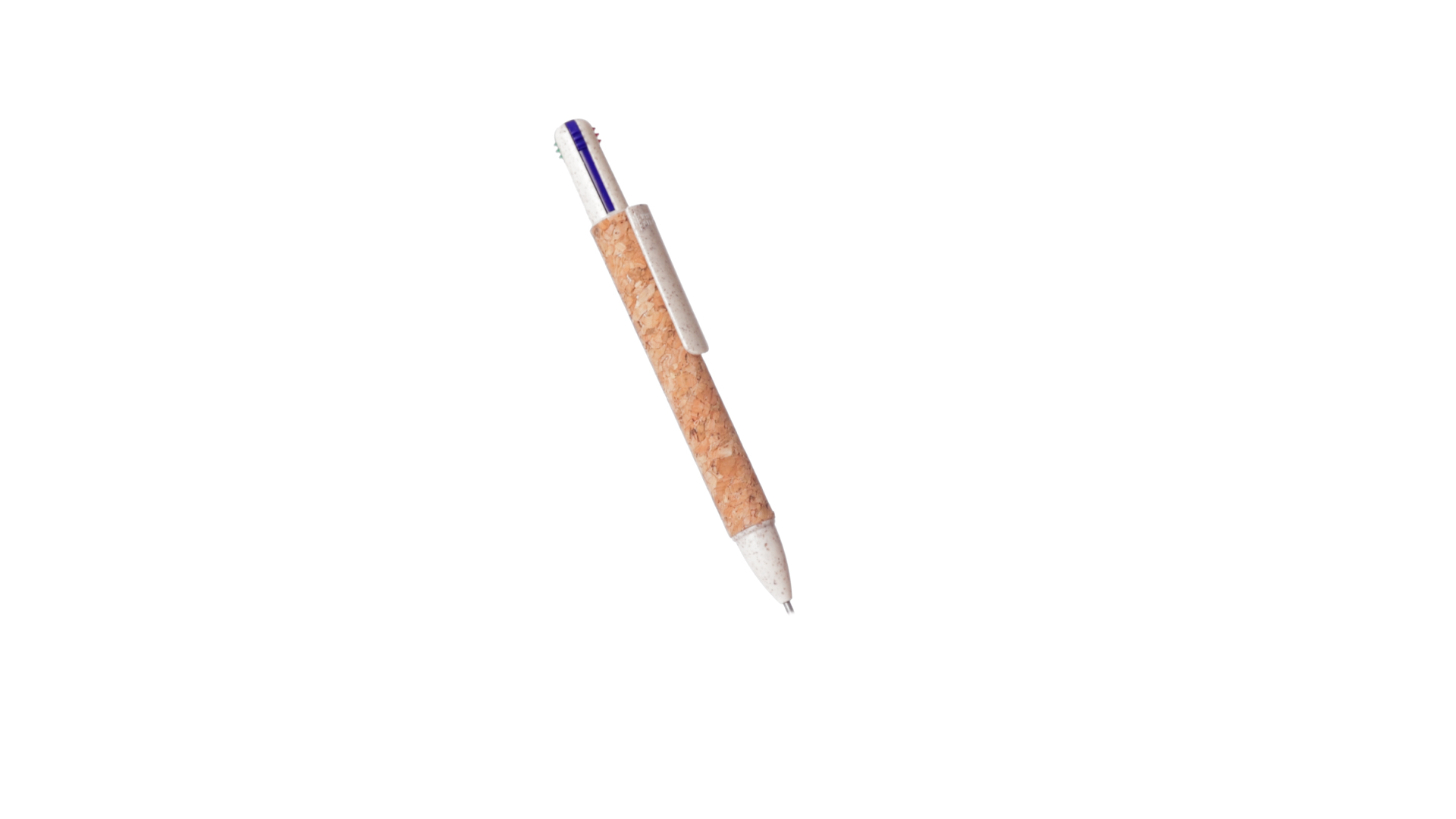 4-in-1 Kugelschreiber mit einziehbarem Druckknopfmechanismus. Kombination aus Naturkorkzylinder und Zubehör aus Weizenrohr und ABS, um die Verwendung und das Recycling von Rohstoffen zu fördern und so die Schadstoffemissionen zu reduzieren. Mit 4 Patronen in blauer, roter, schwarzer und grüner Tinte.Hergestellt aus pflanzlichen Bestandteilen, um die Verwendung natürlicher Rohstoffe zu fördern und die Schadstoffemissionen zu reduzieren.