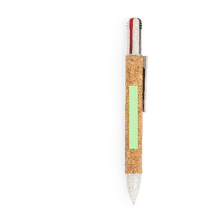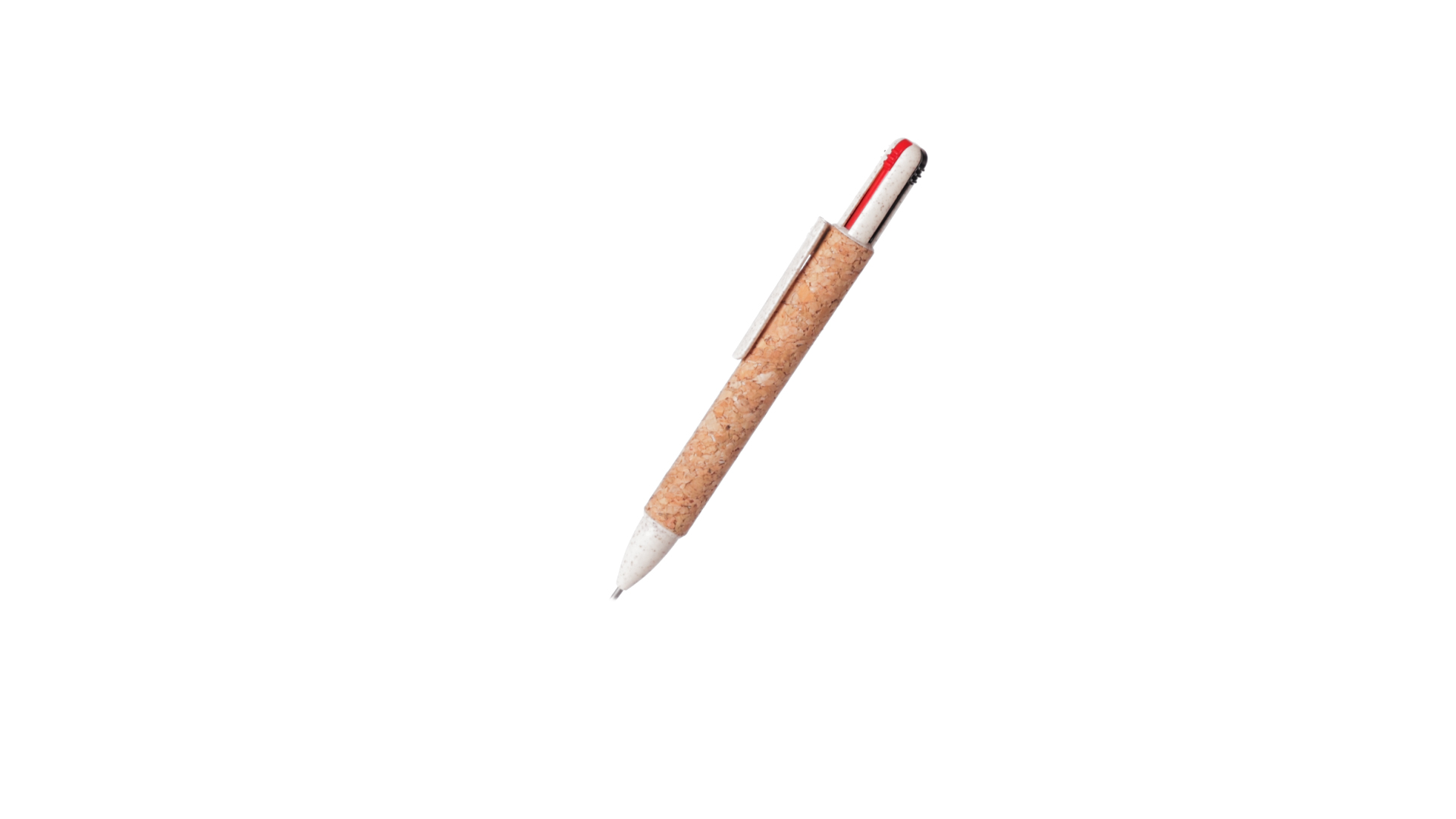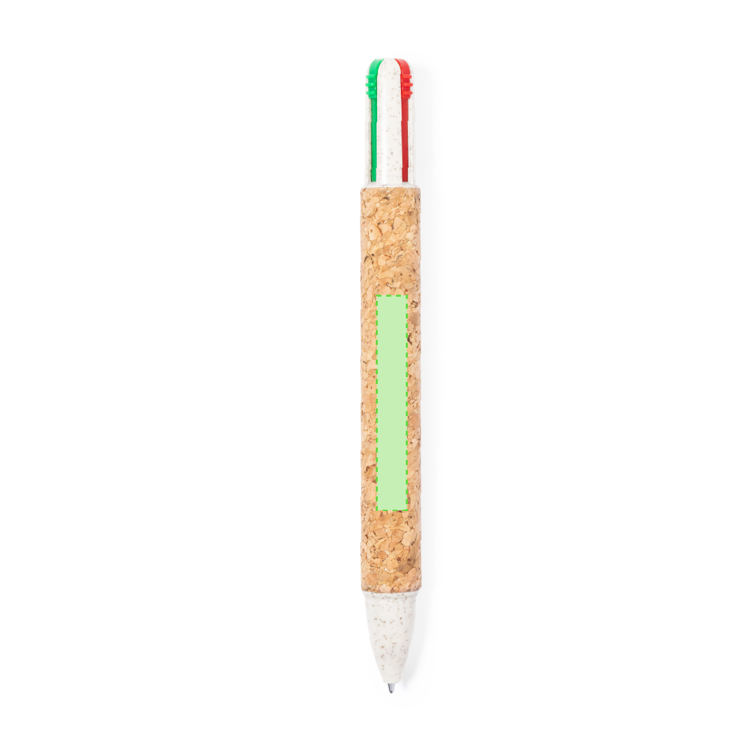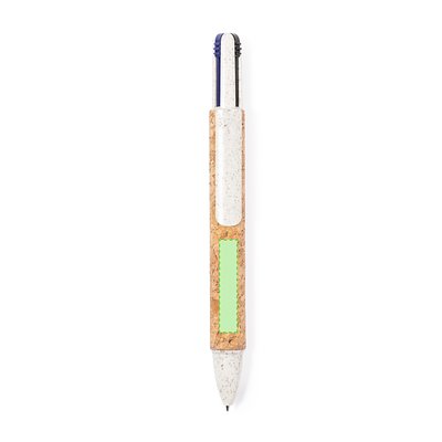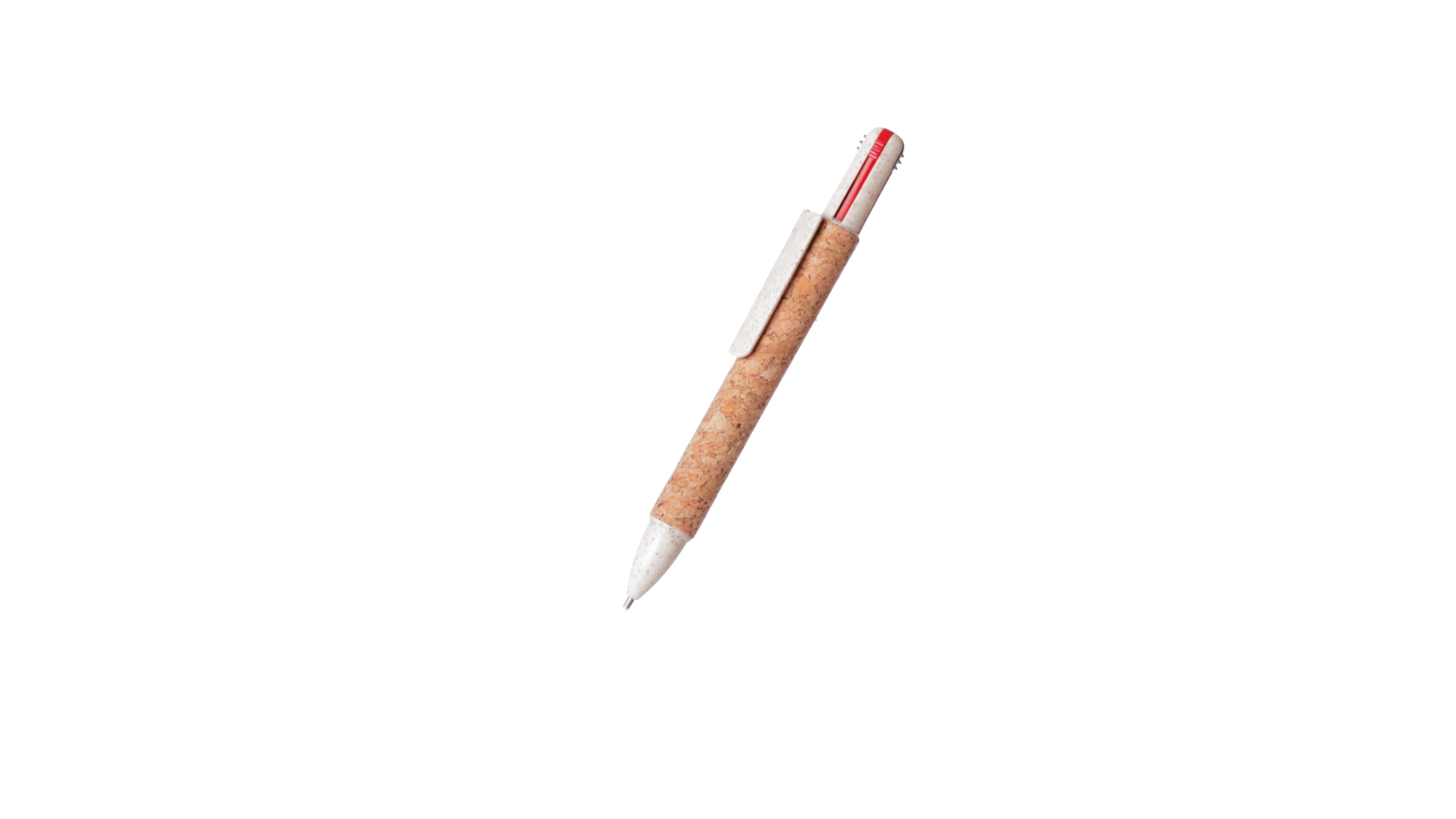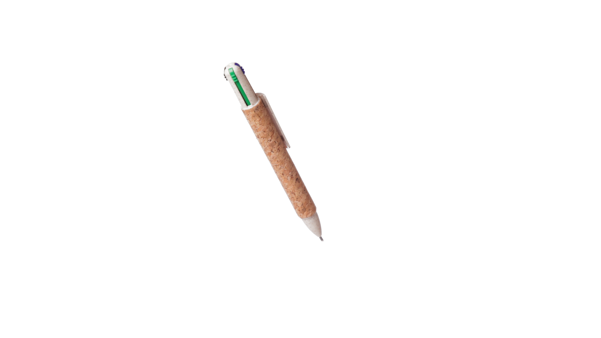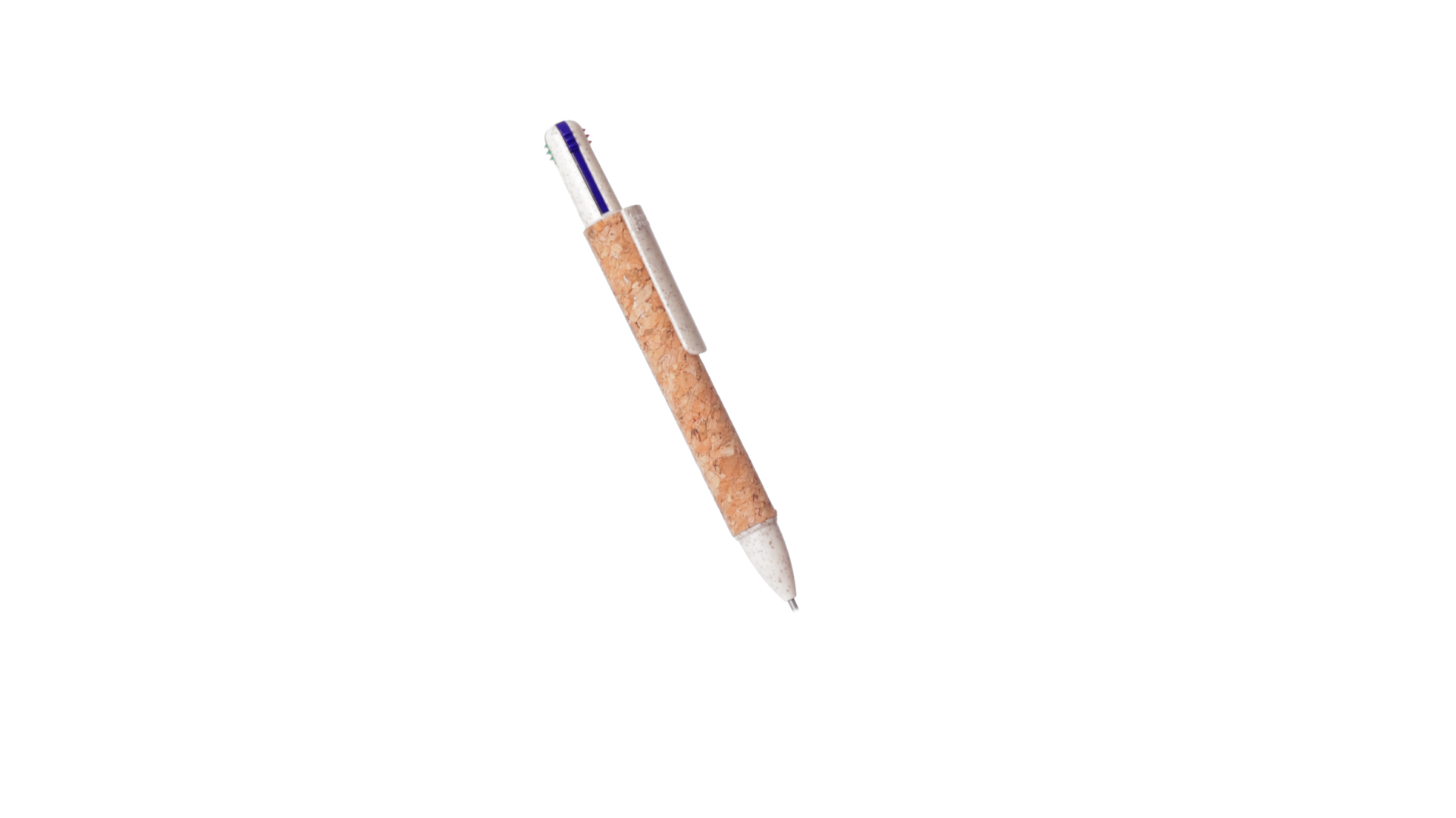 4-in-1 Kugelschreiber mit einziehbarem Druckknopfmechanismus. Kombination aus Naturkorkzylinder und Zubehör aus Weizenrohr und ABS, um die Verwendung und das Recycling von Rohstoffen zu fördern und so die Schadstoffemissionen zu reduzieren. Mit 4 Patronen in blauer, roter, schwarzer und grüner Tinte.Hergestellt aus pflanzlichen Bestandteilen, um die Verwendung natürlicher Rohstoffe zu fördern und die Schadstoffemissionen zu reduzieren.