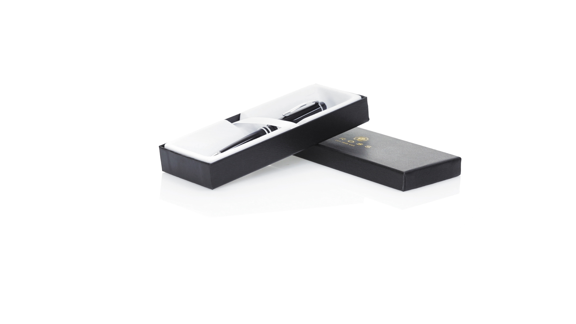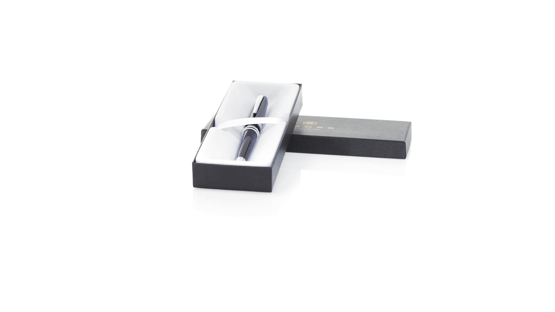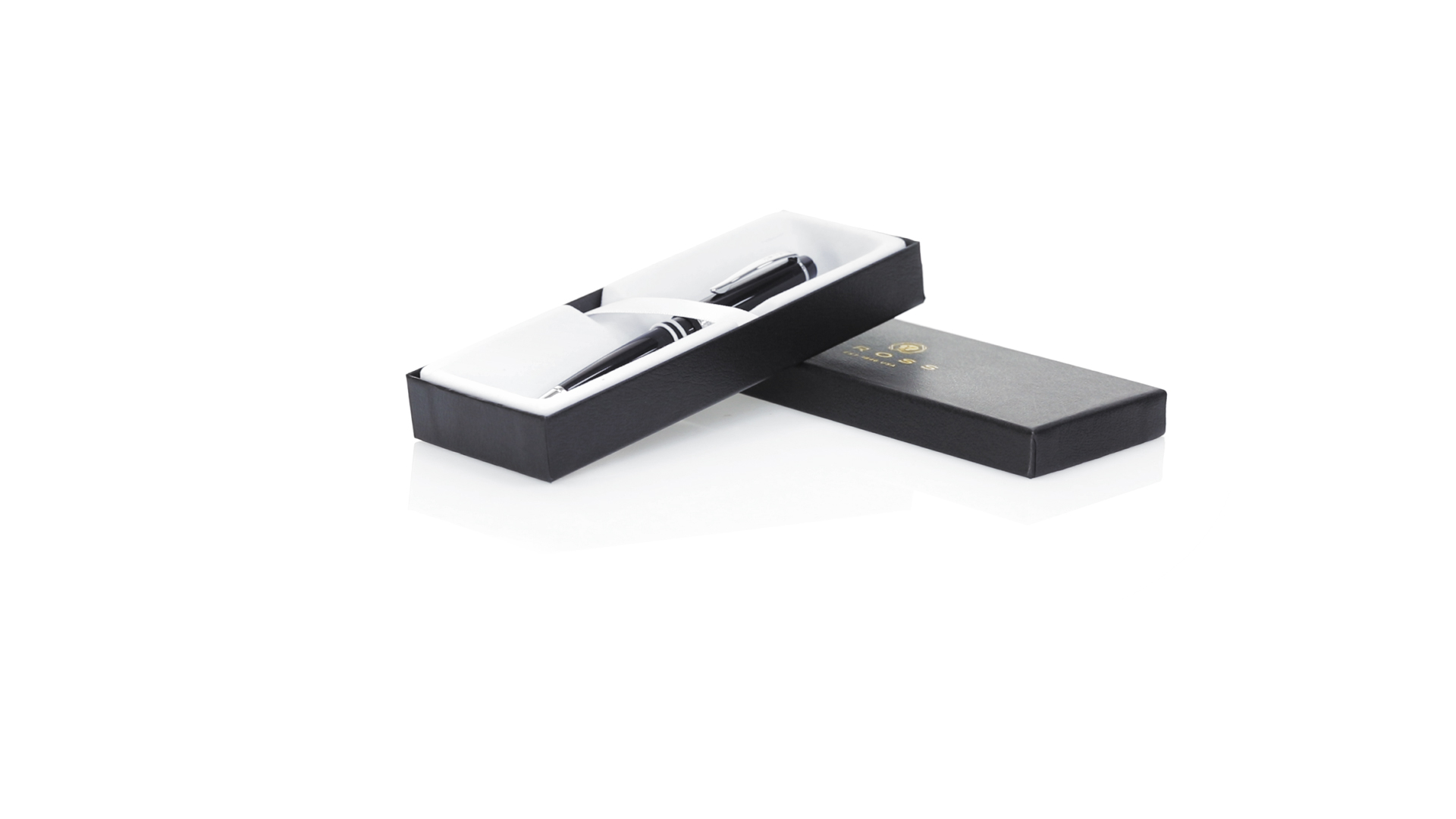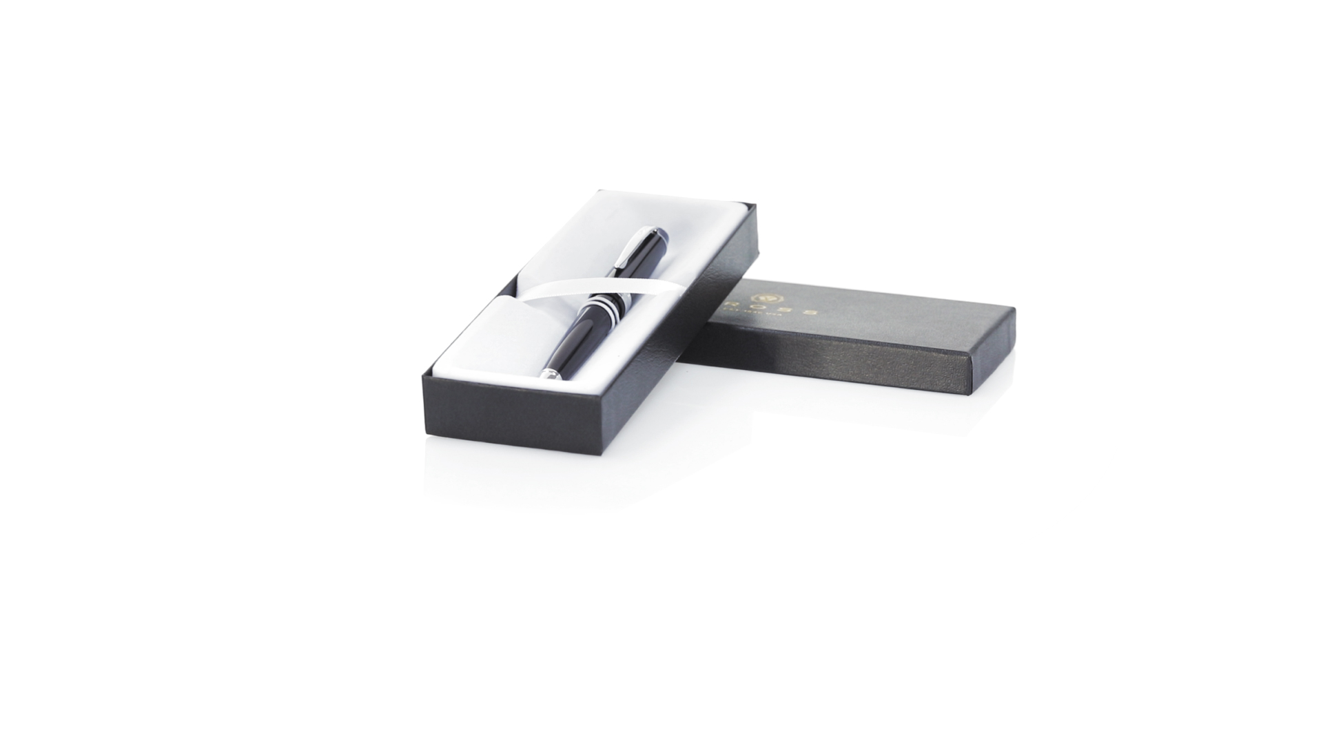 Kugelschreiber Cross Bailey Light, kombiniert ein hochglänzendes Harz mit einem polierten Chrom, metallisches Finish. Jumbo-Patrone in schwarzer Tinte. Präsentiert in einem eleganten, schwarzen Etui mit Markenlogo und weichem Wildlederfutter.