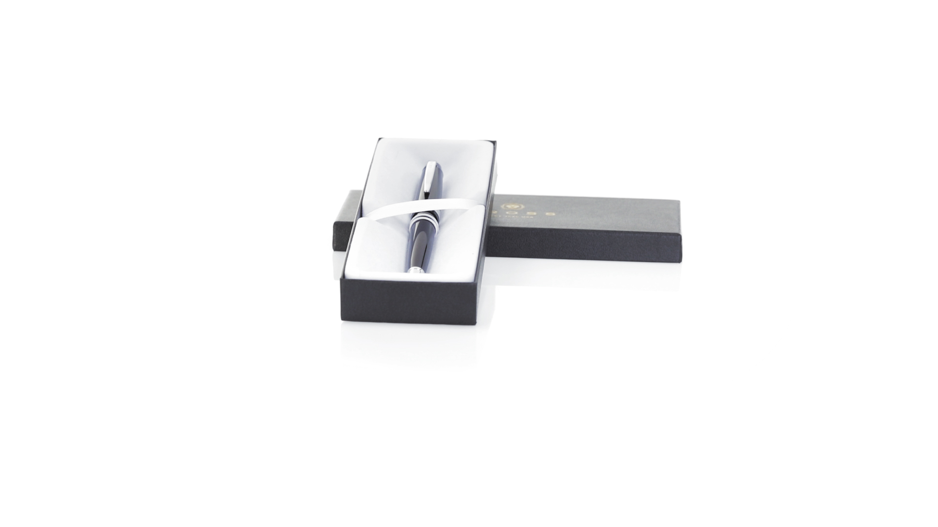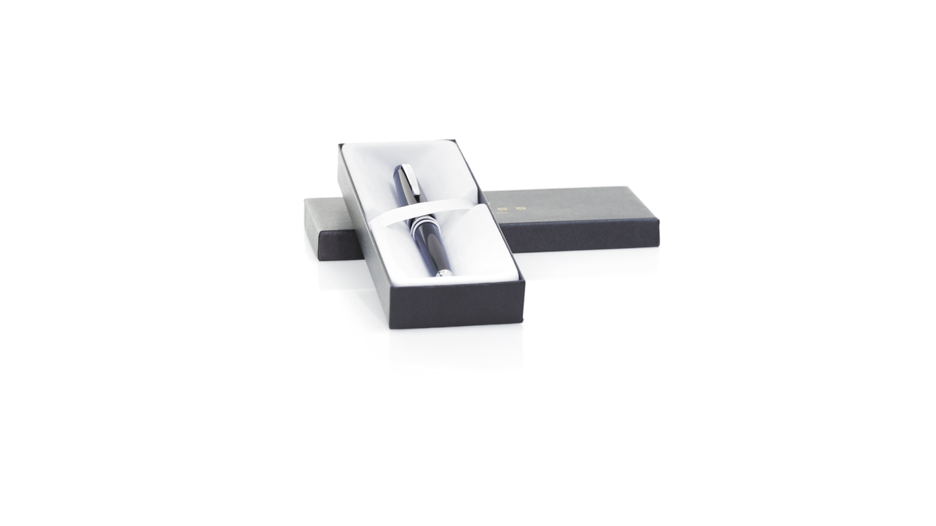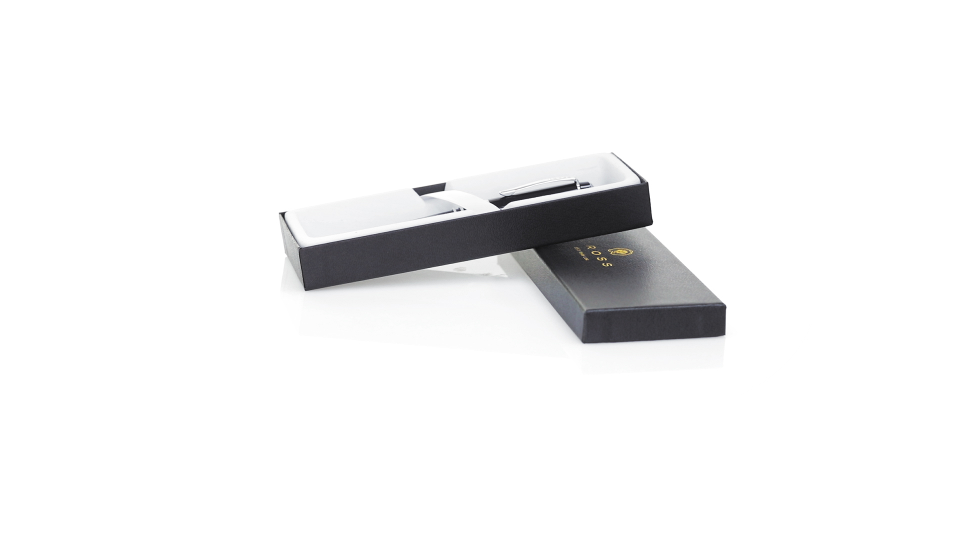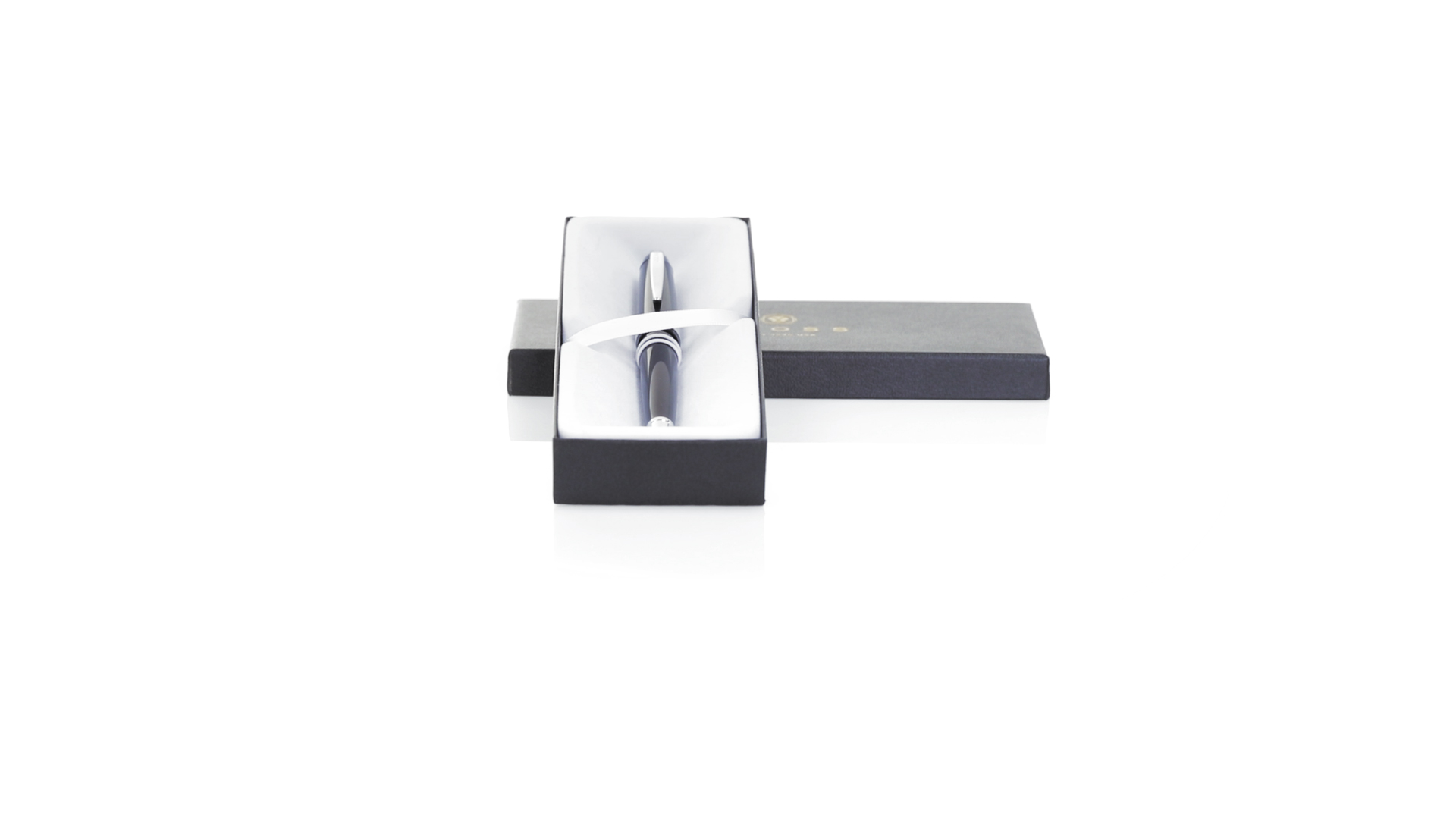 Kugelschreiber Cross Bailey Light, kombiniert ein hochglänzendes Harz mit einem polierten Chrom, metallisches Finish. Jumbo-Patrone in schwarzer Tinte. Präsentiert in einem eleganten, schwarzen Etui mit Markenlogo und weichem Wildlederfutter.