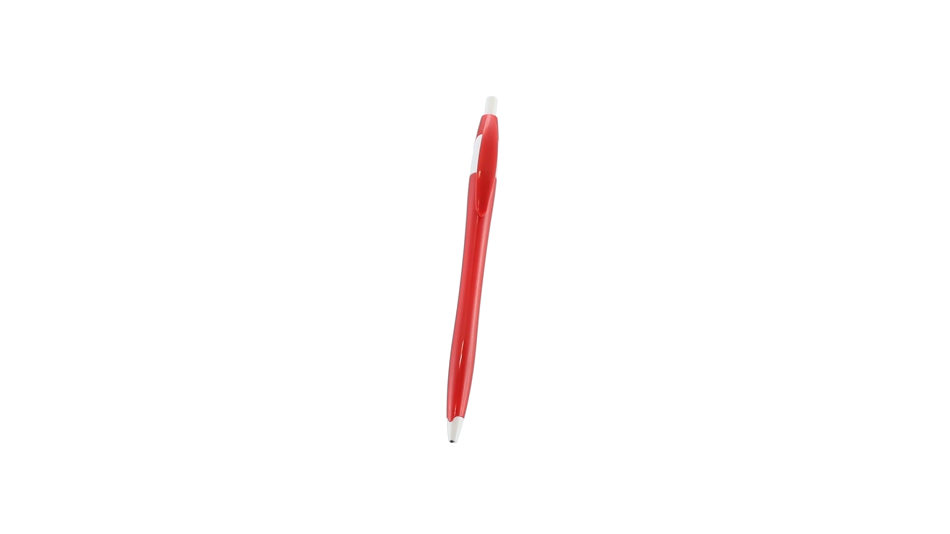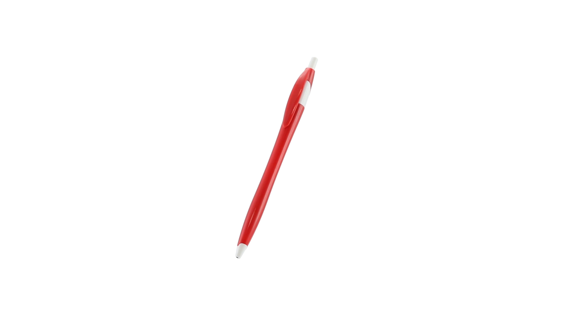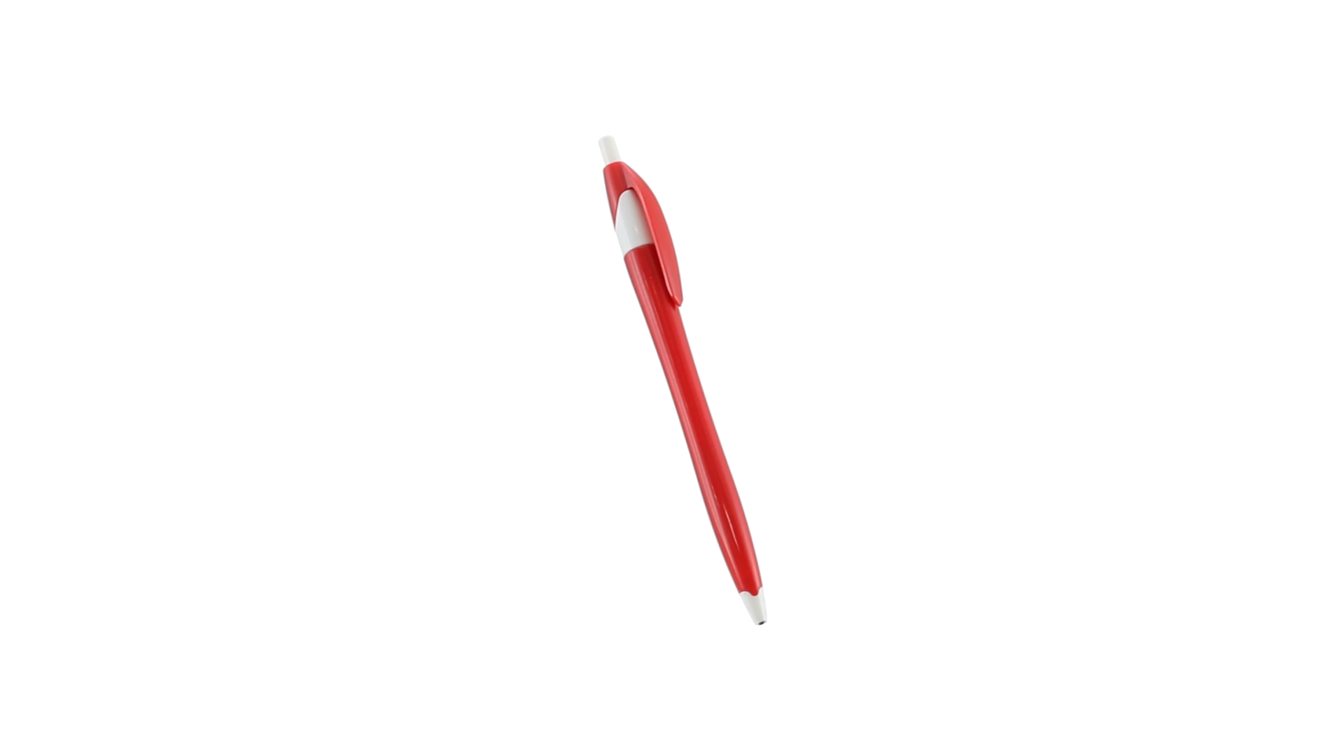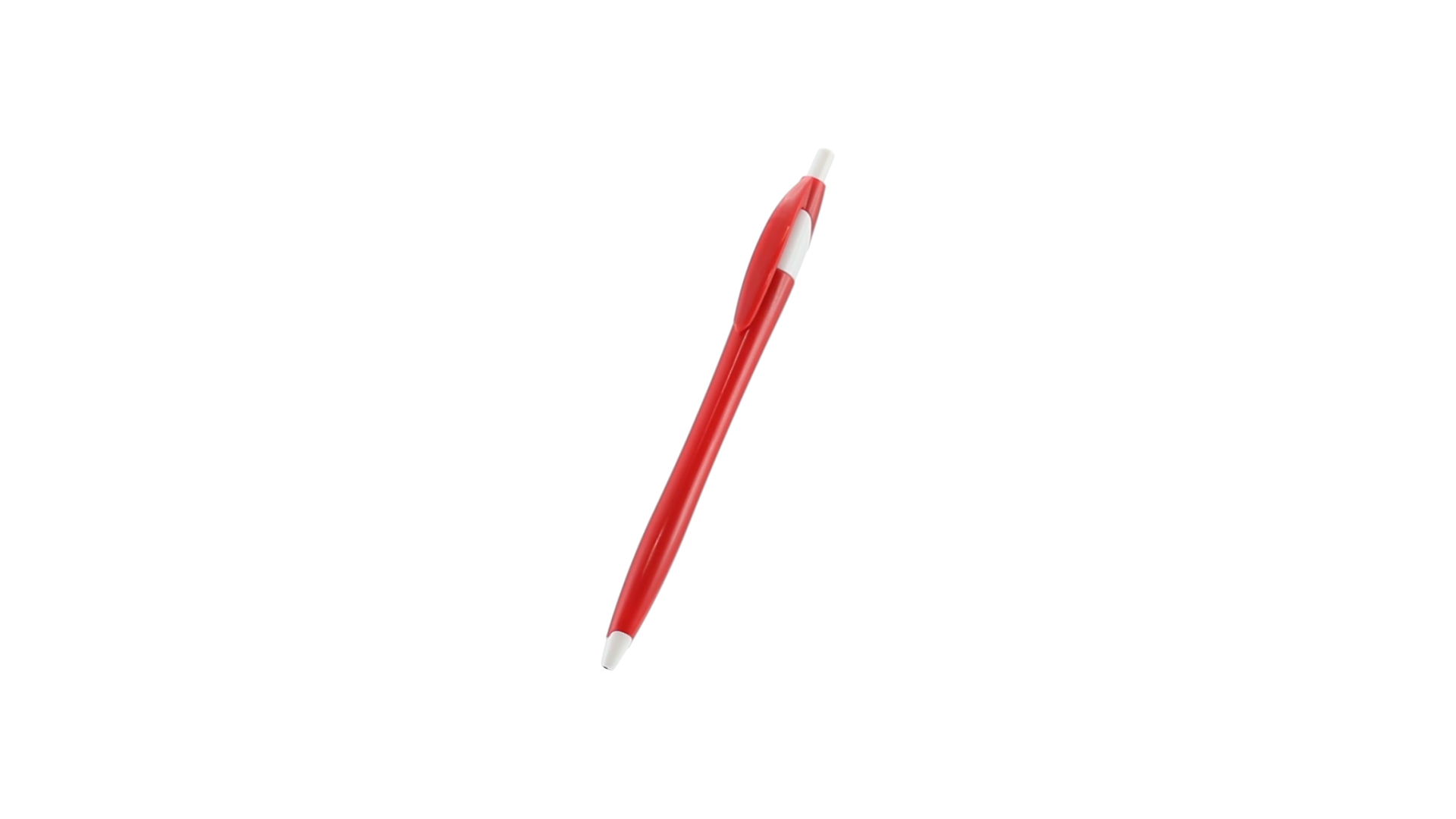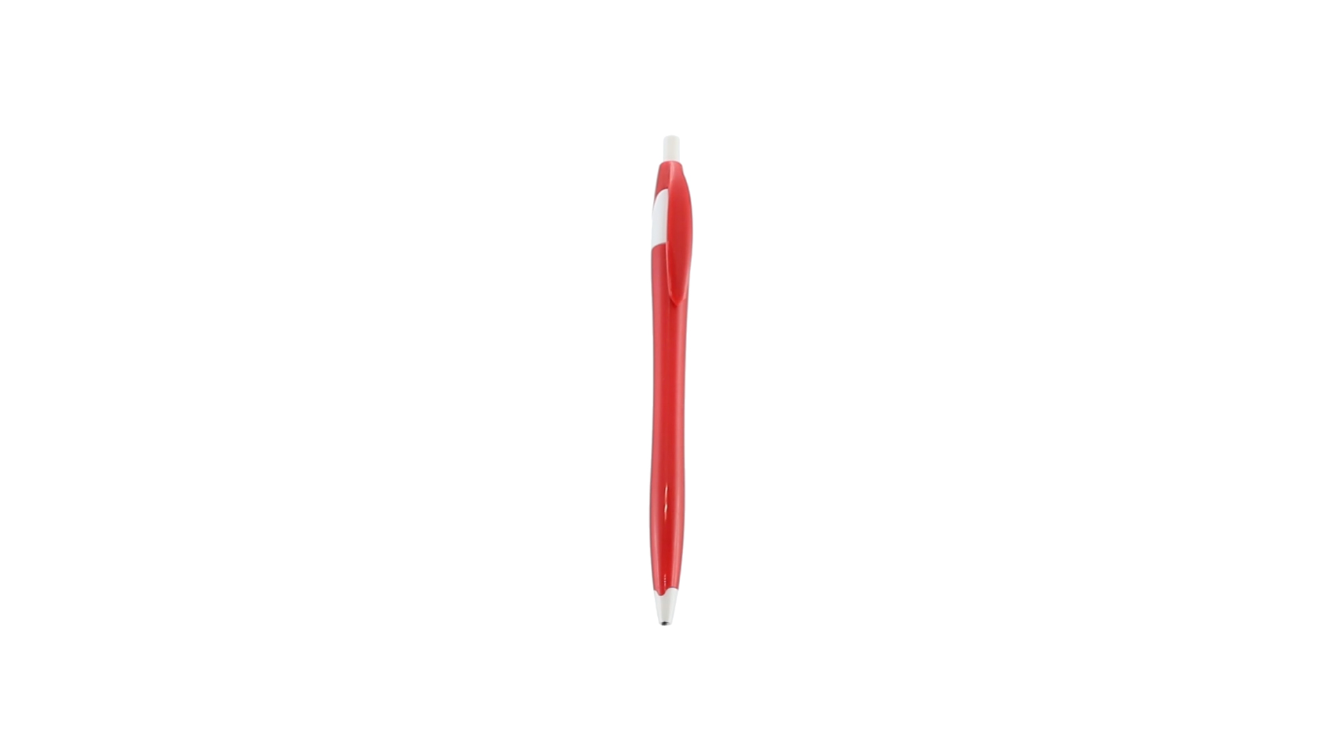 Druck-Kugelschreiber mit zweifarbigem Design und geschwungenem Körper in fröhlichen kräftigen Farben. Mit farblich passendem Clip und blauer Tinte.