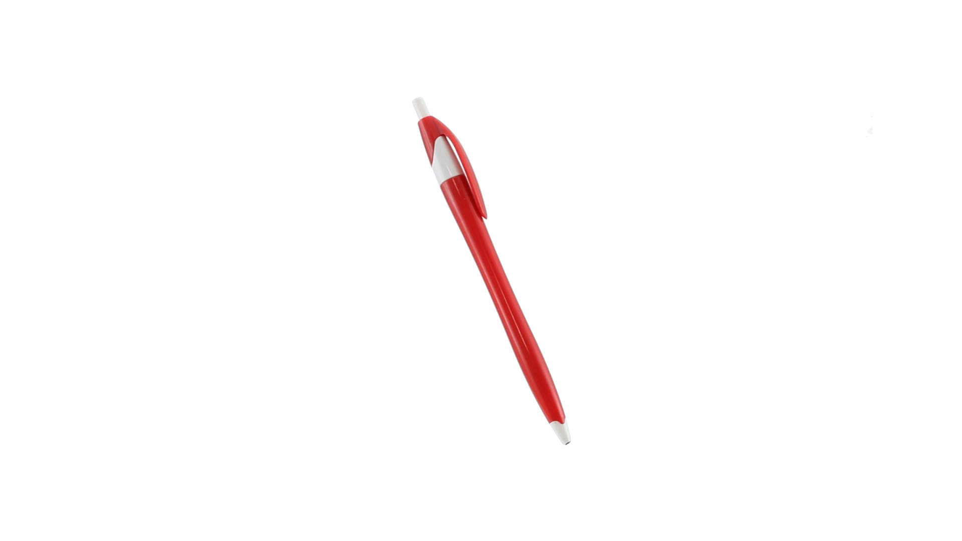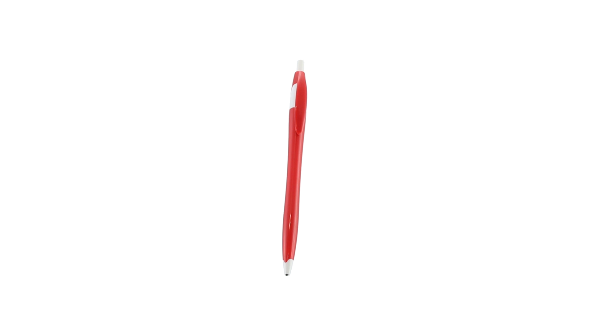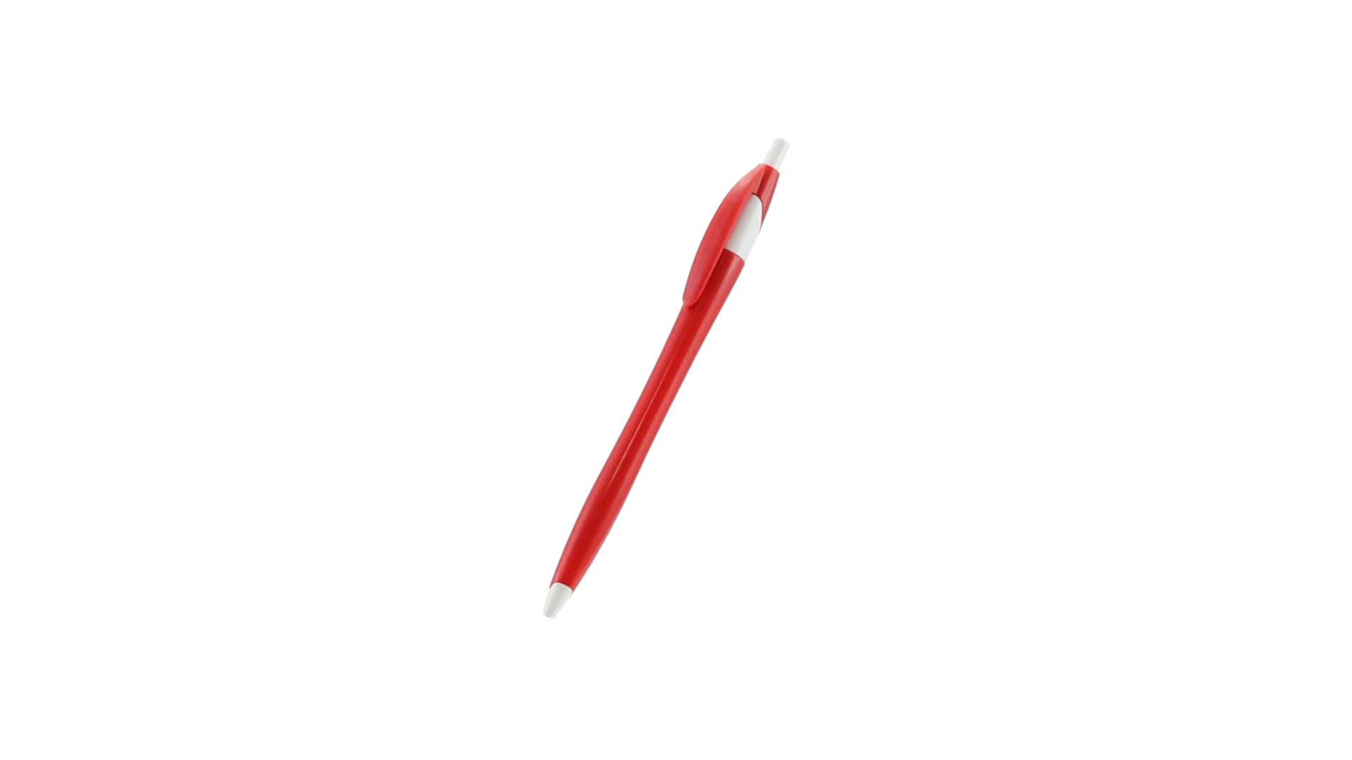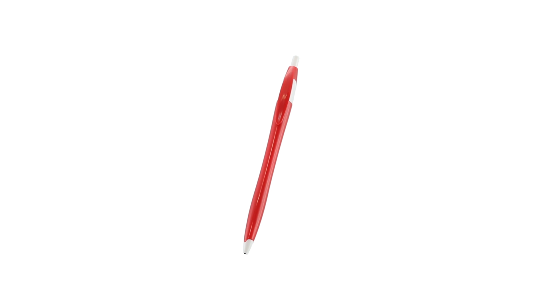 Druck-Kugelschreiber mit zweifarbigem Design und geschwungenem Körper in fröhlichen kräftigen Farben. Mit farblich passendem Clip und blauer Tinte.