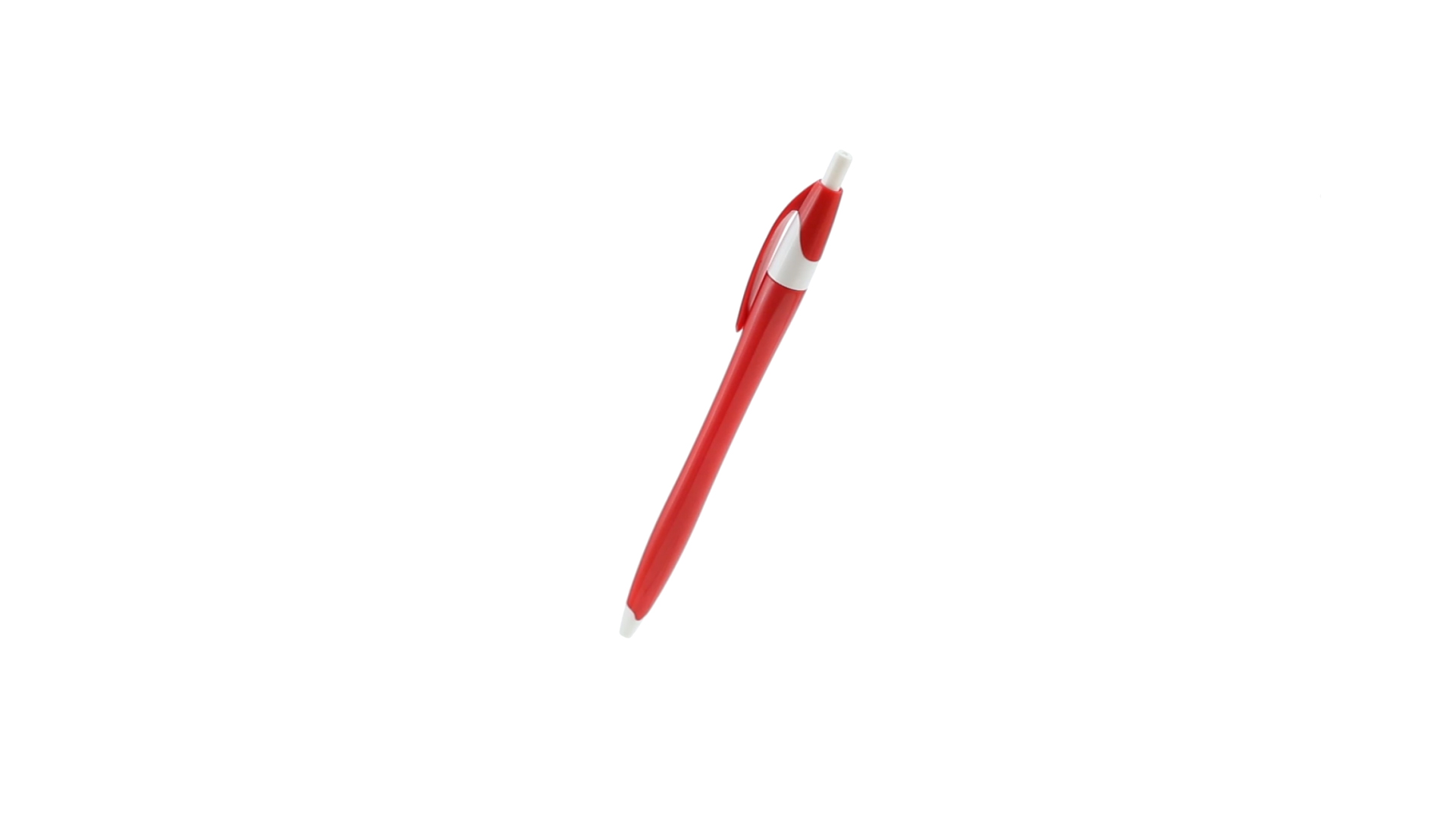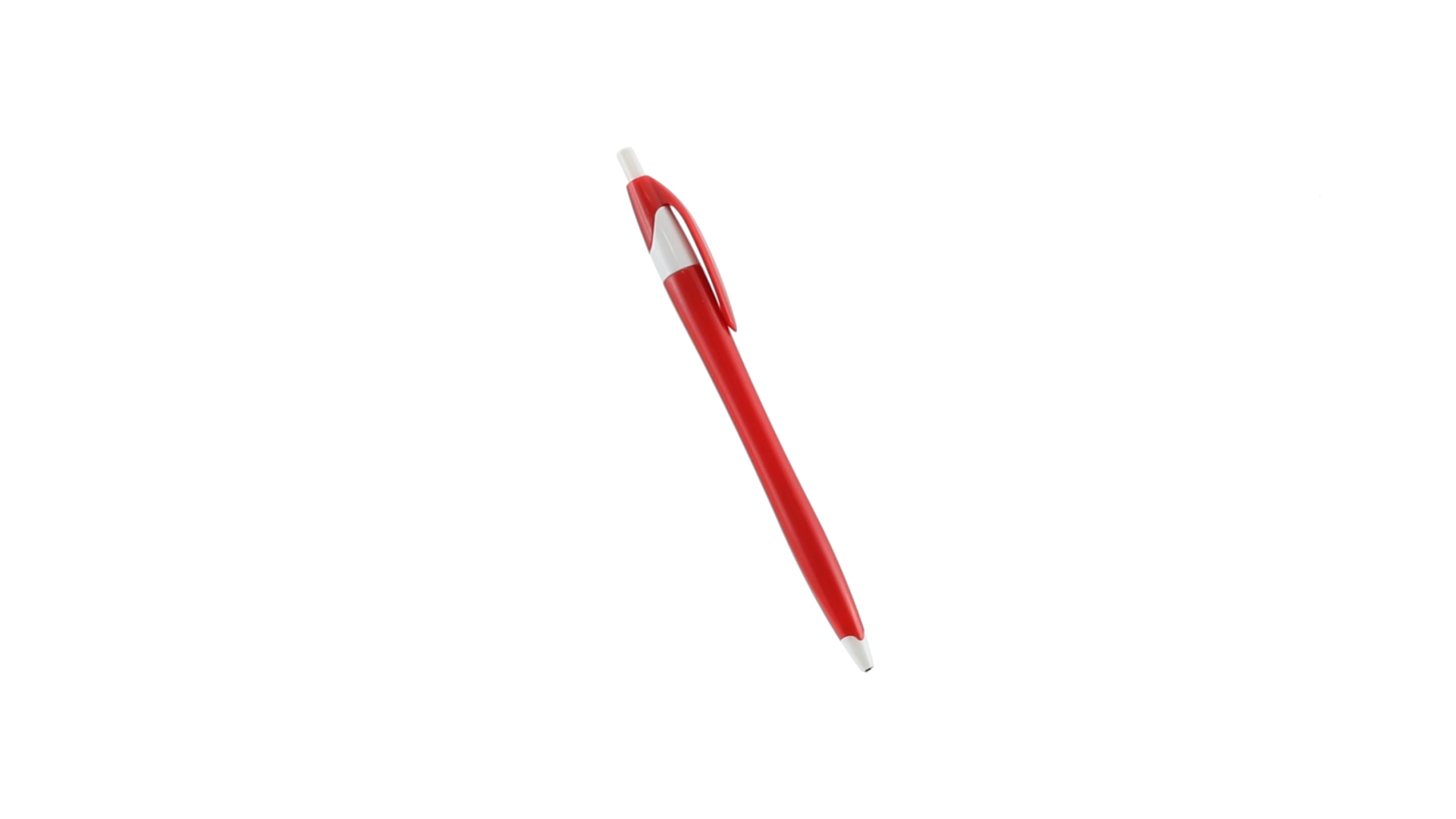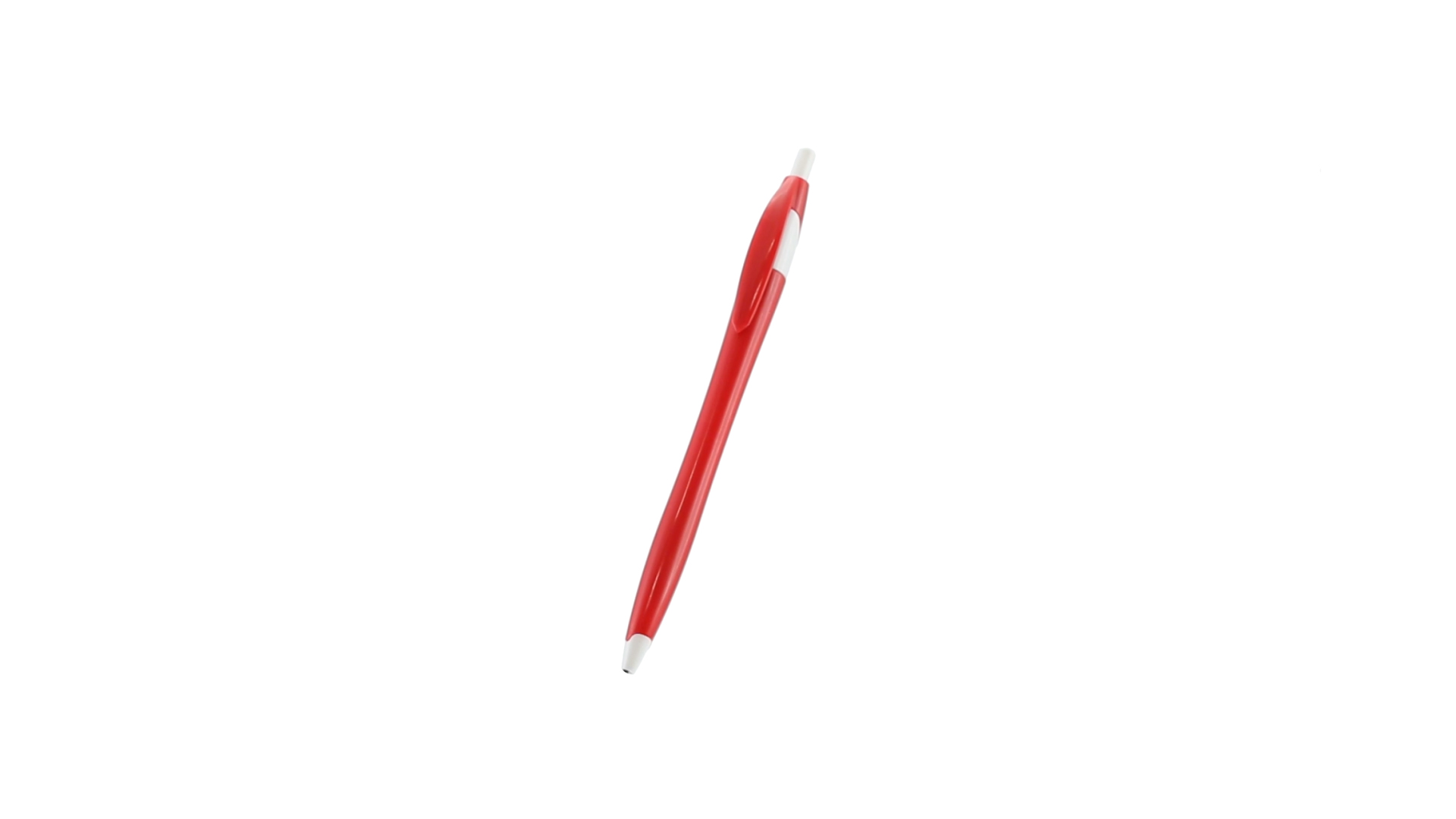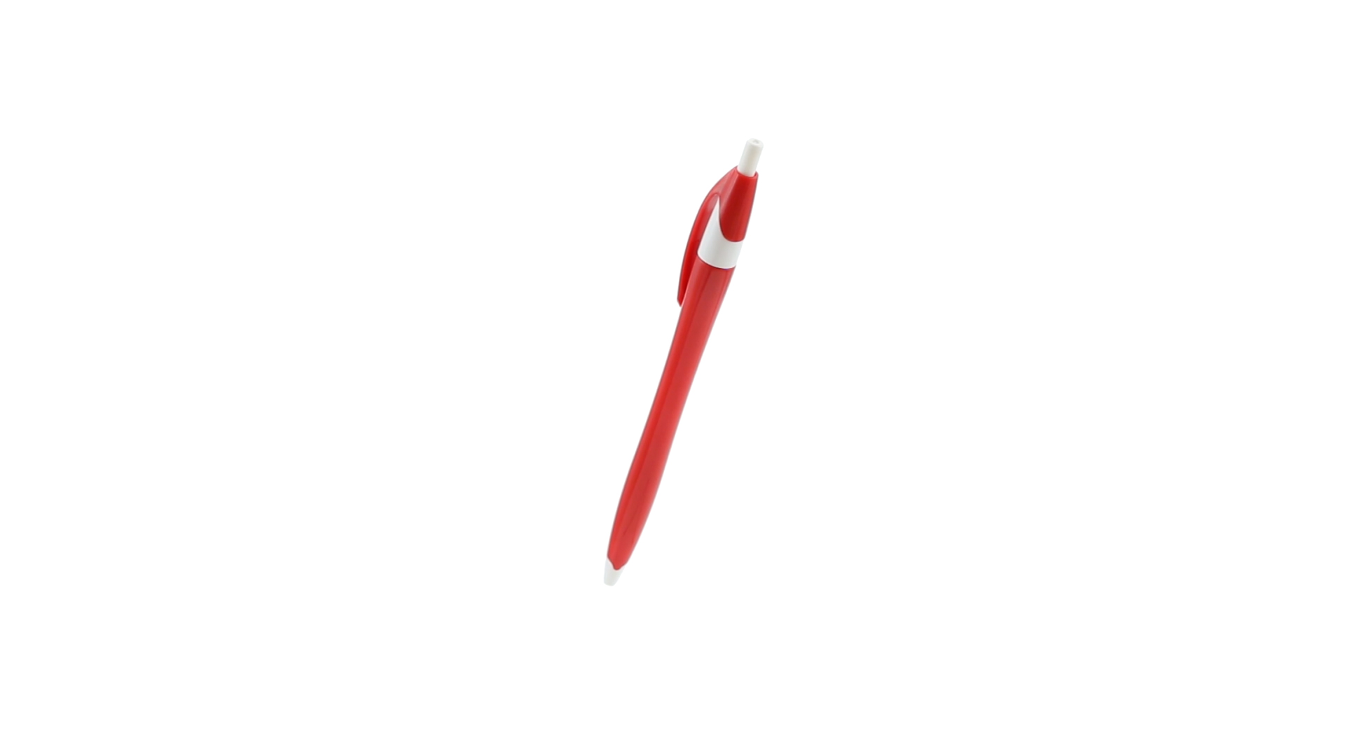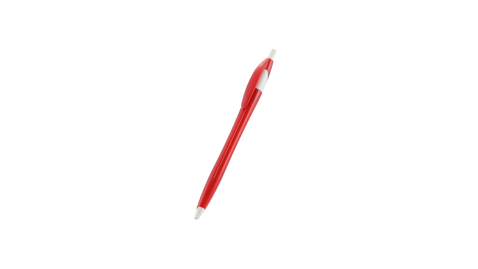 Druck-Kugelschreiber mit zweifarbigem Design und geschwungenem Körper in fröhlichen kräftigen Farben. Mit farblich passendem Clip und blauer Tinte.