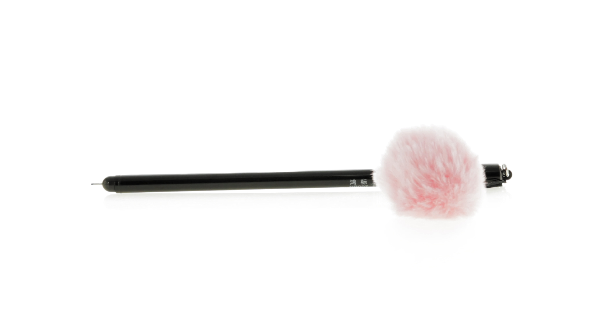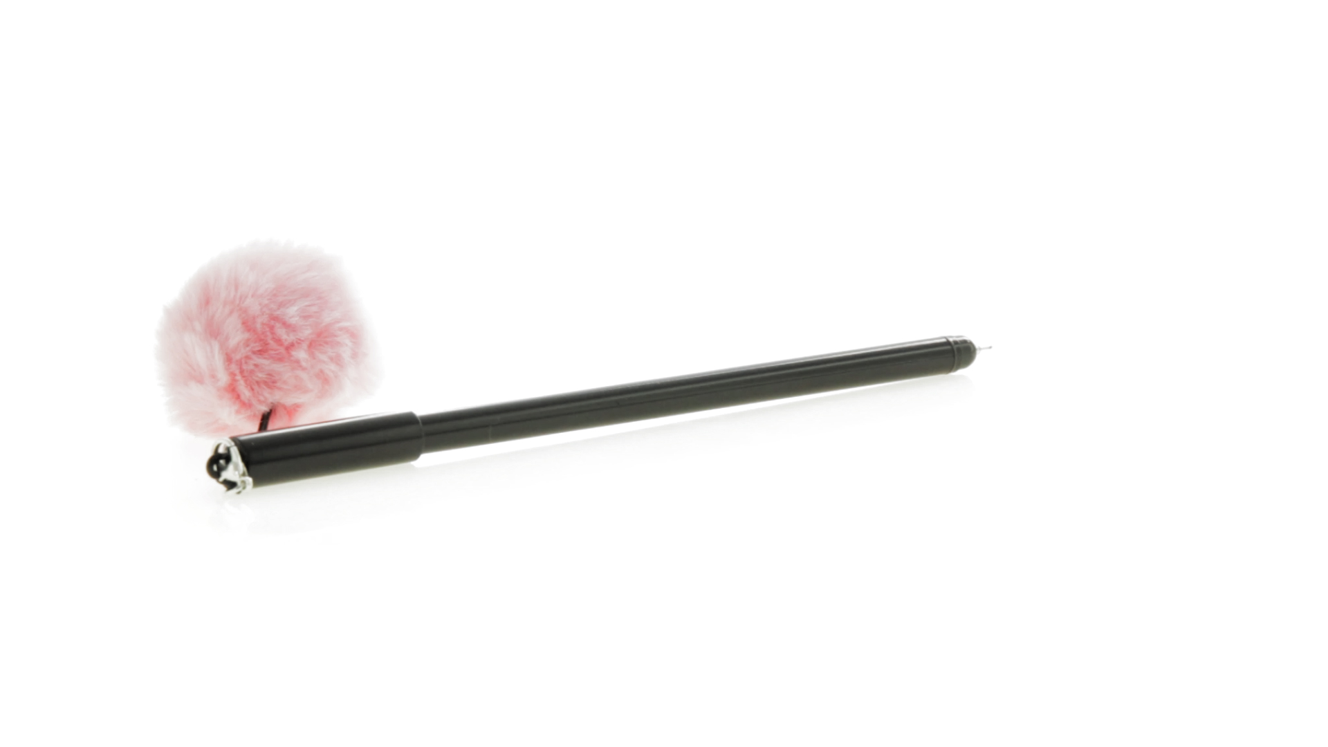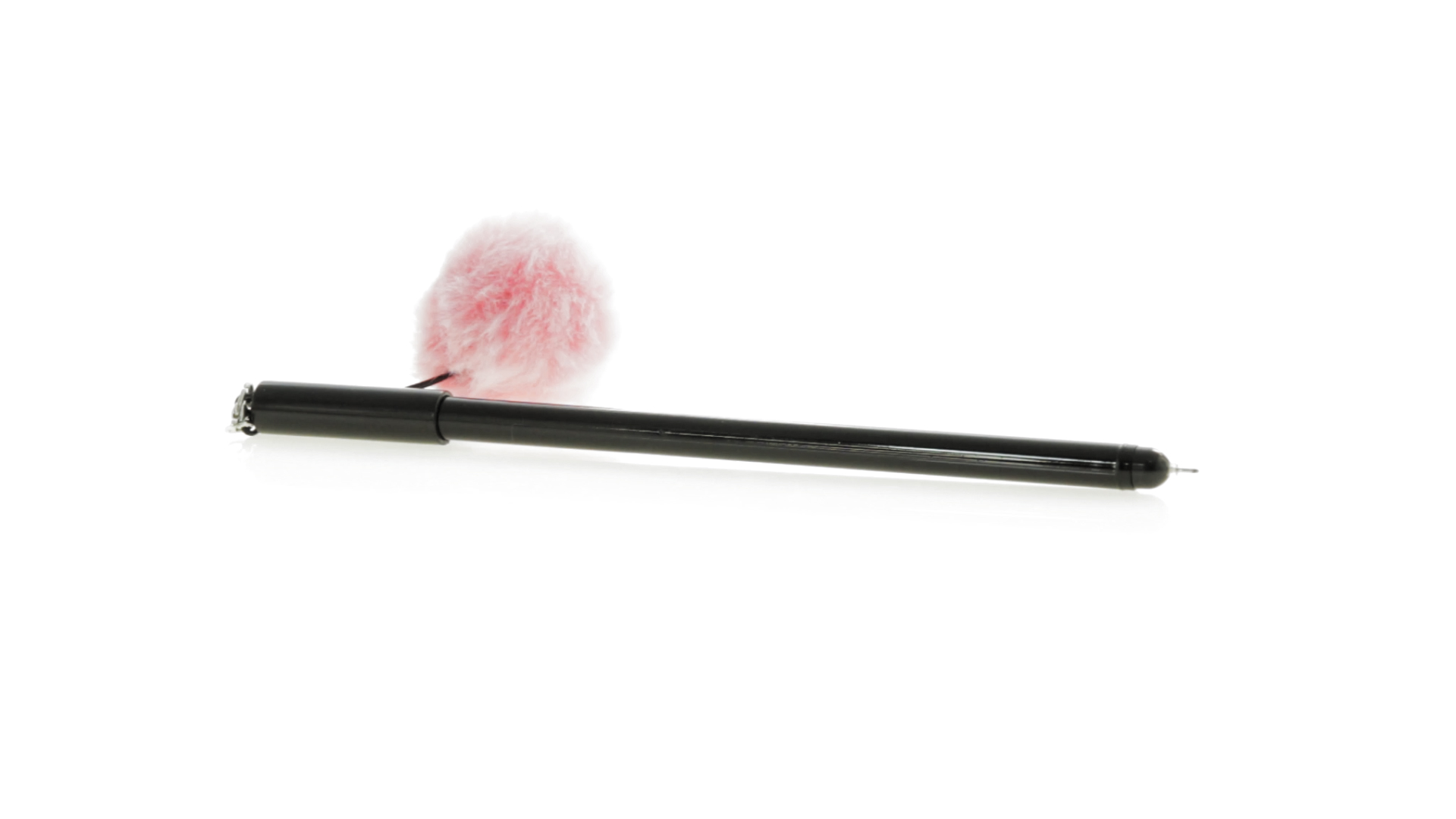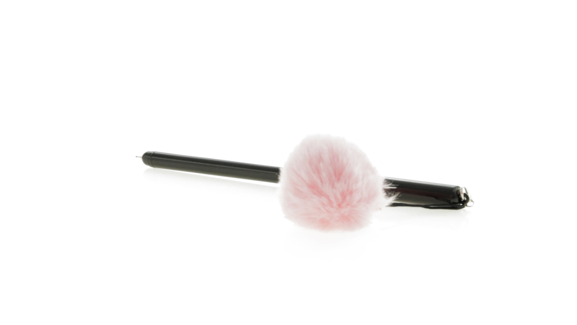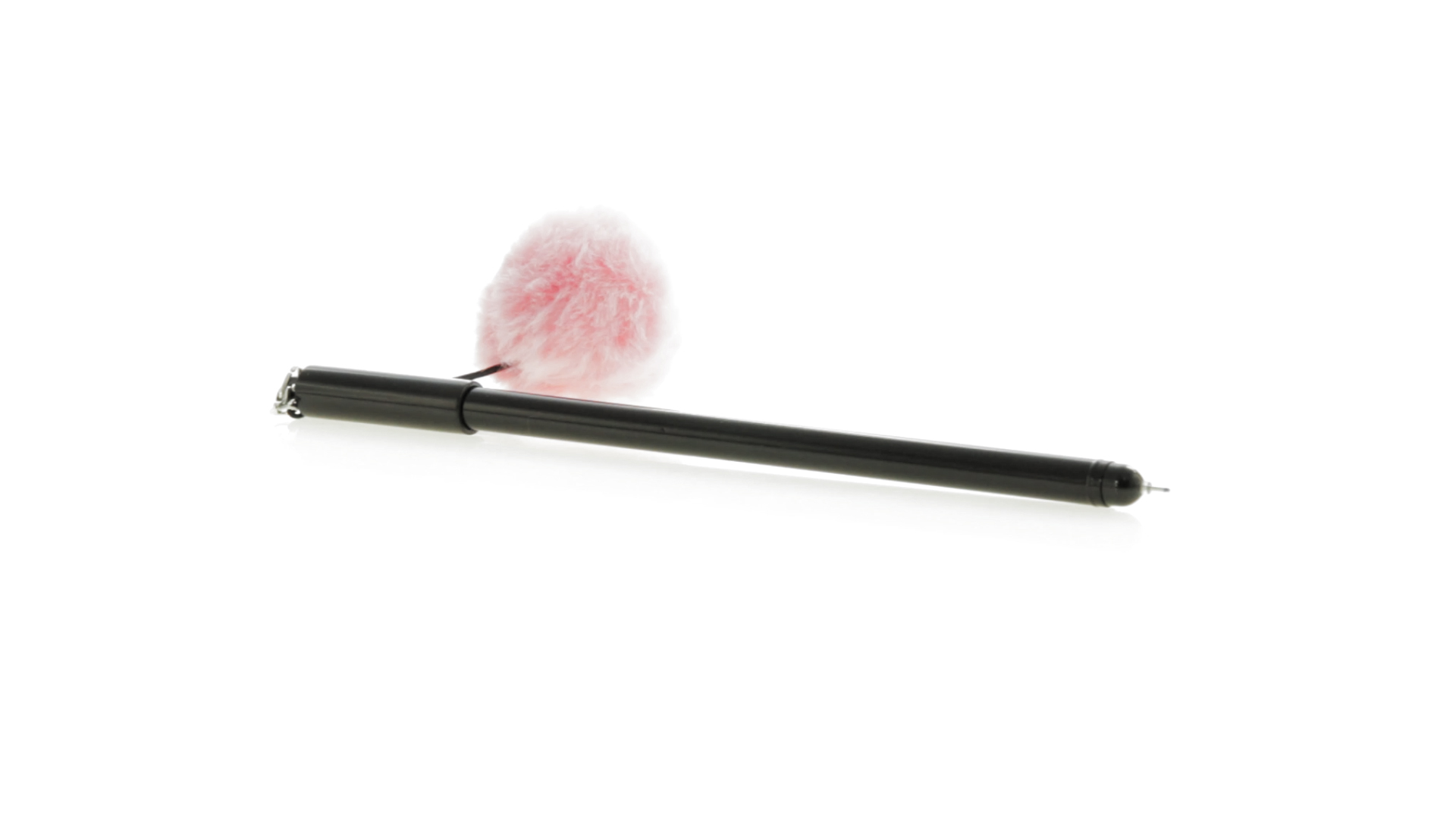Auffälliger Kugelschreiber mit Kappe, Gel-Tinte und Bommel. Mit Gehäuse in mattem Schwarz und Bommel in Weiss oder Rosa. Jumbo-Patrone mit blauer Tinte.