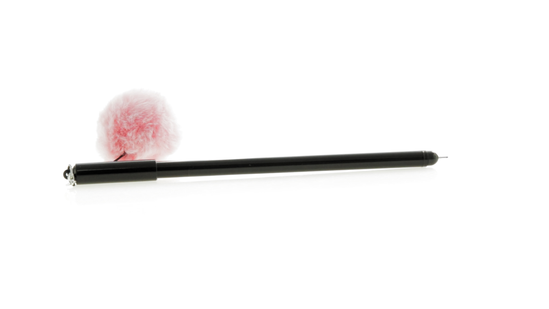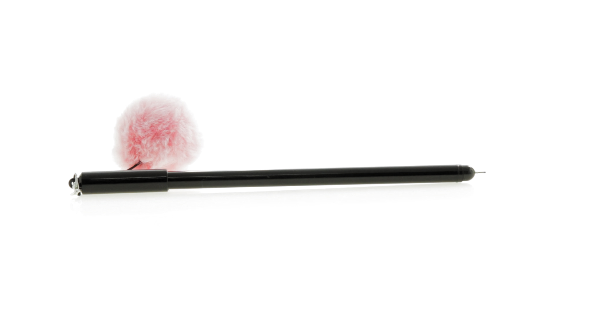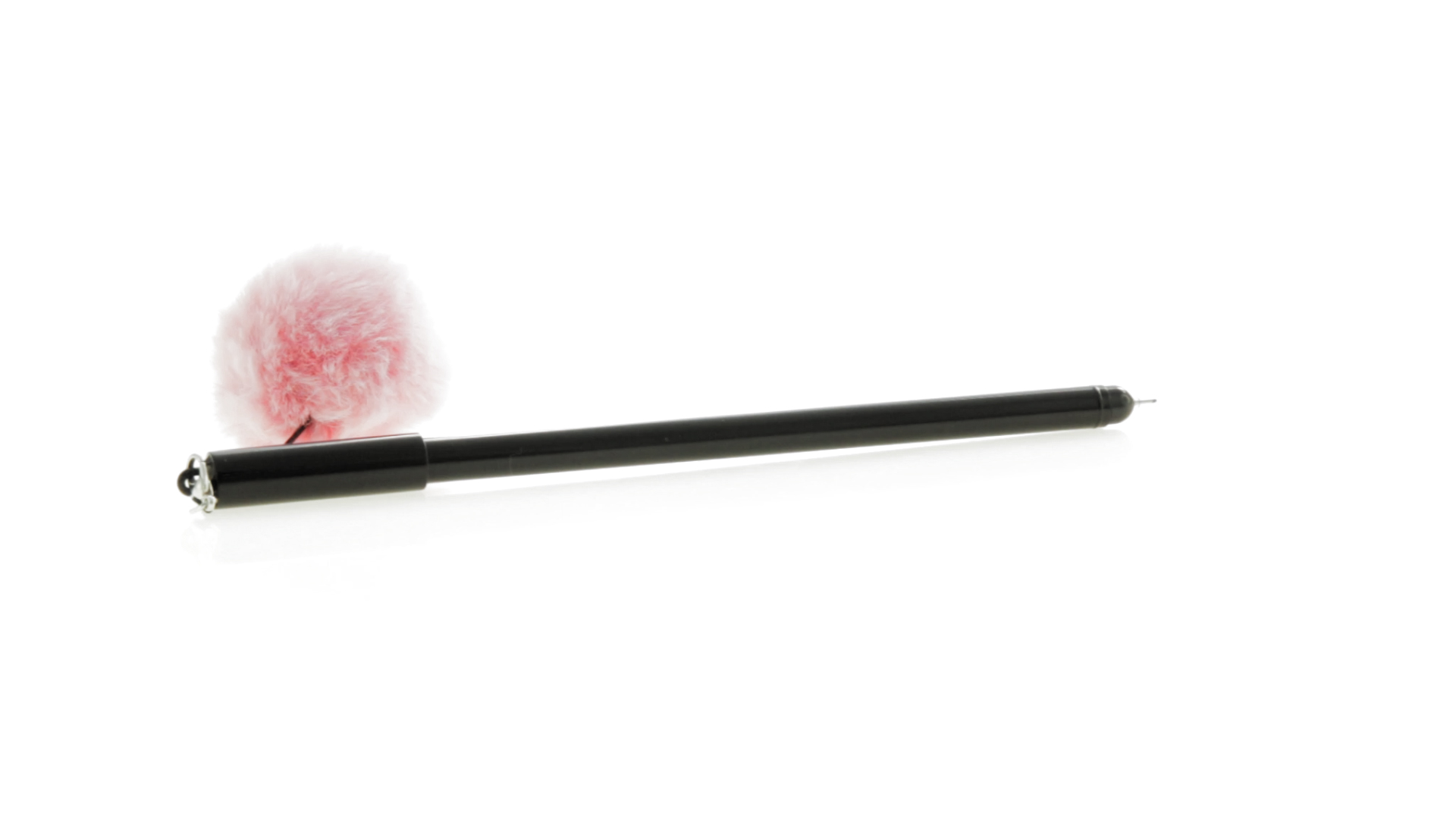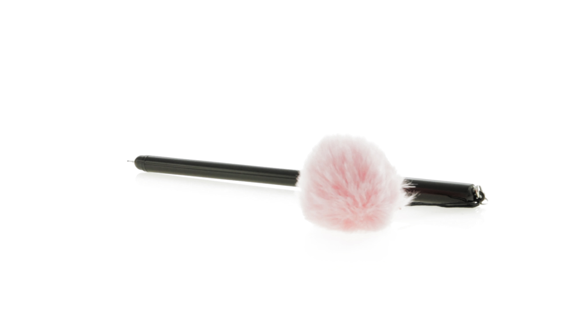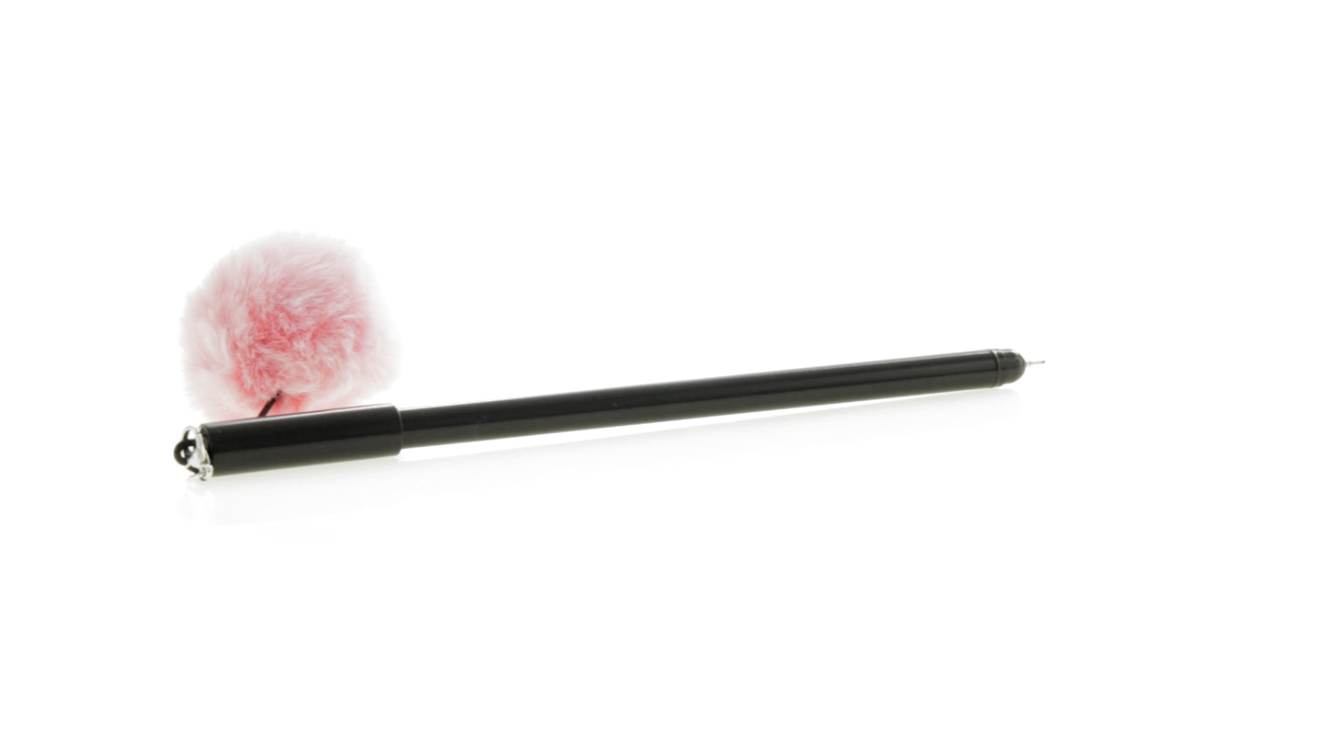 Auffälliger Kugelschreiber mit Kappe, Gel-Tinte und Bommel. Mit Gehäuse in mattem Schwarz und Bommel in Weiss oder Rosa. Jumbo-Patrone mit blauer Tinte.