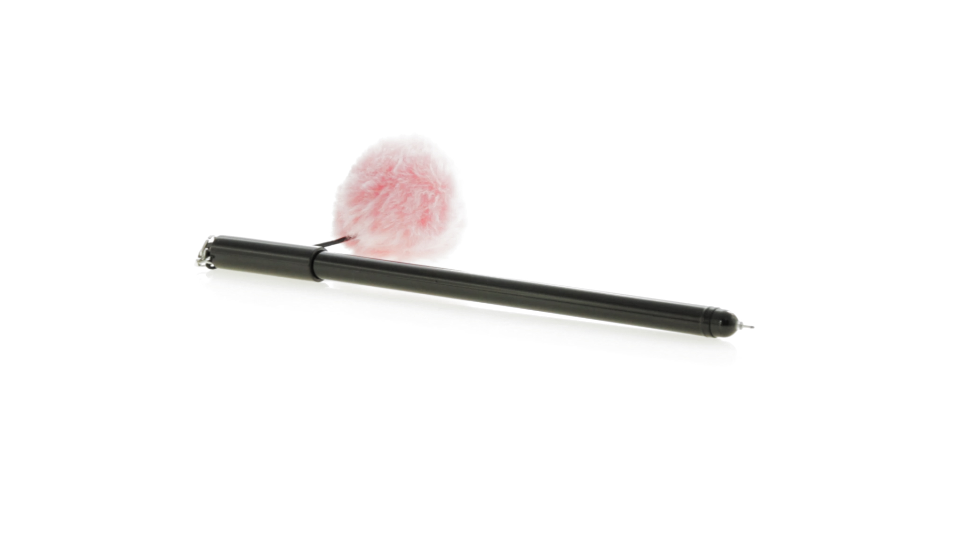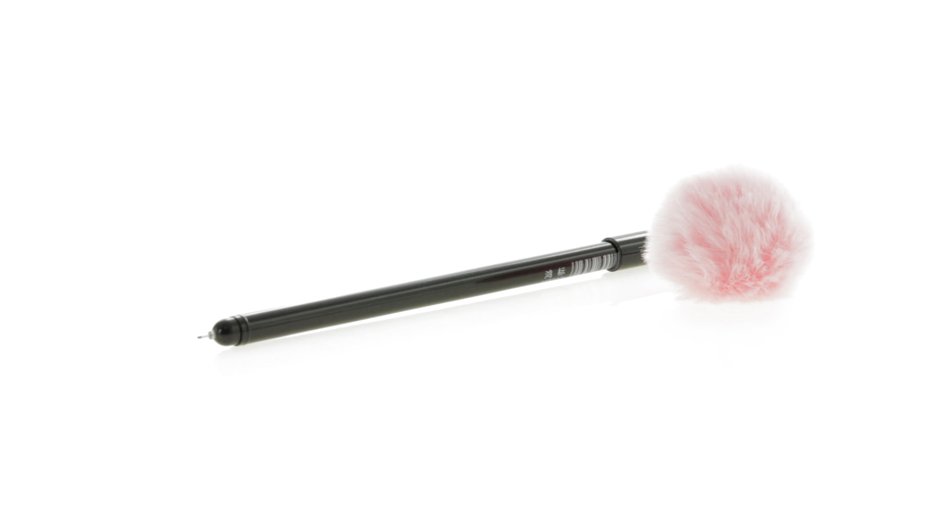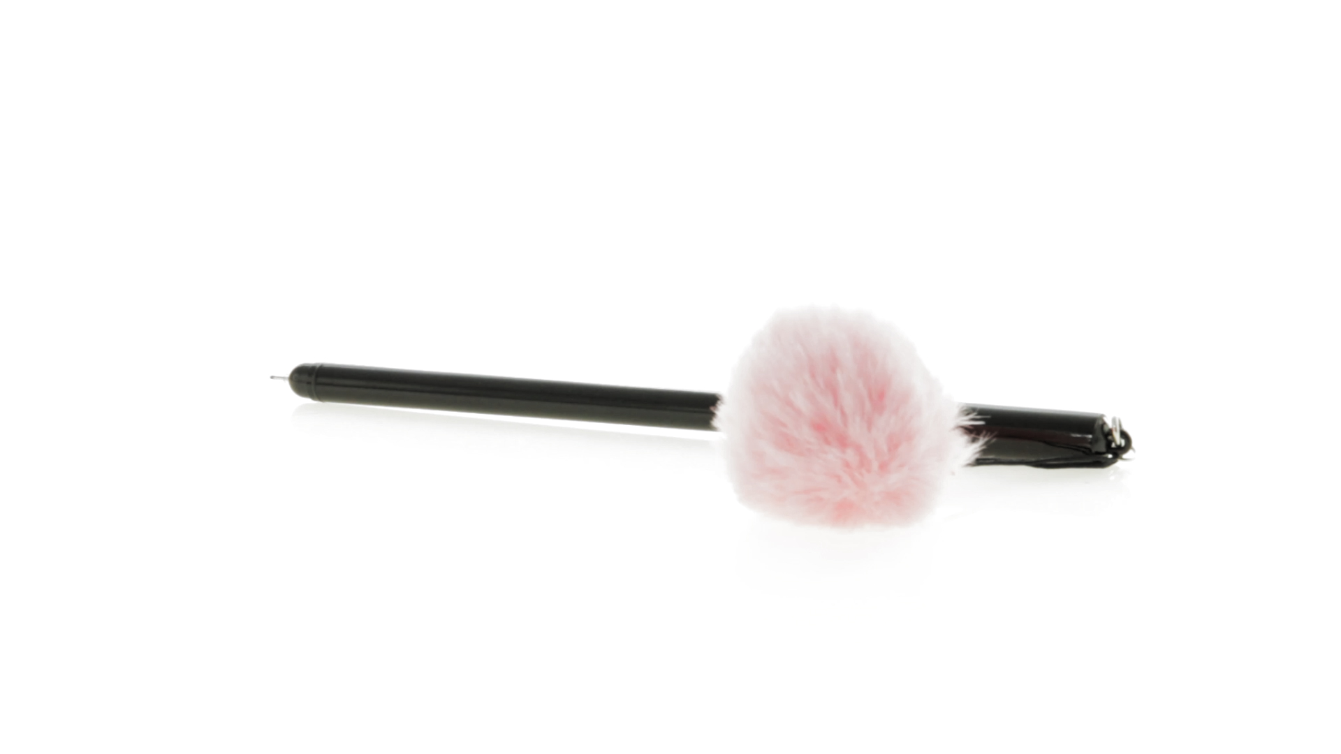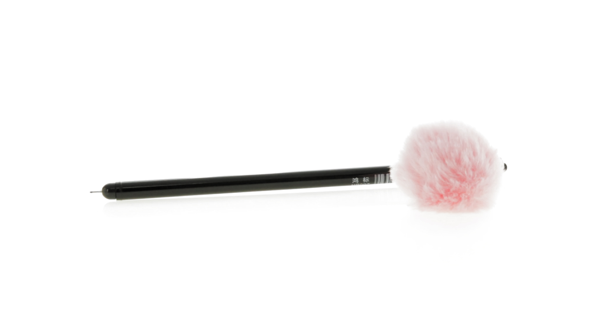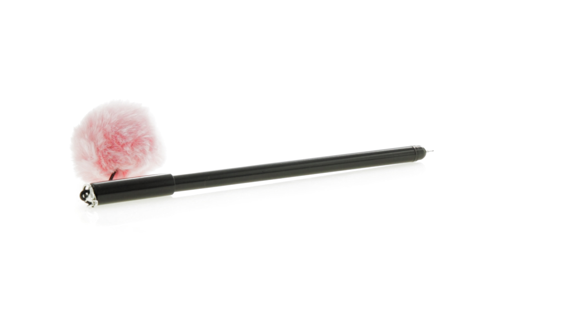 Auffälliger Kugelschreiber mit Kappe, Gel-Tinte und Bommel. Mit Gehäuse in mattem Schwarz und Bommel in Weiss oder Rosa. Jumbo-Patrone mit blauer Tinte.