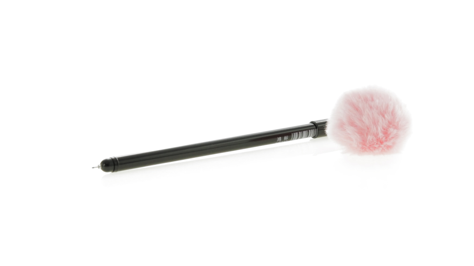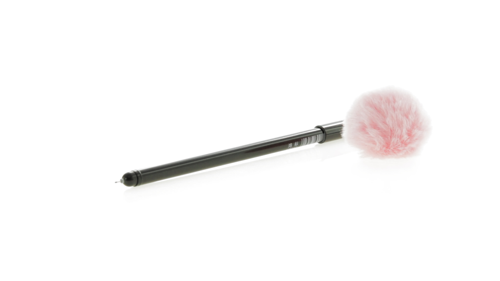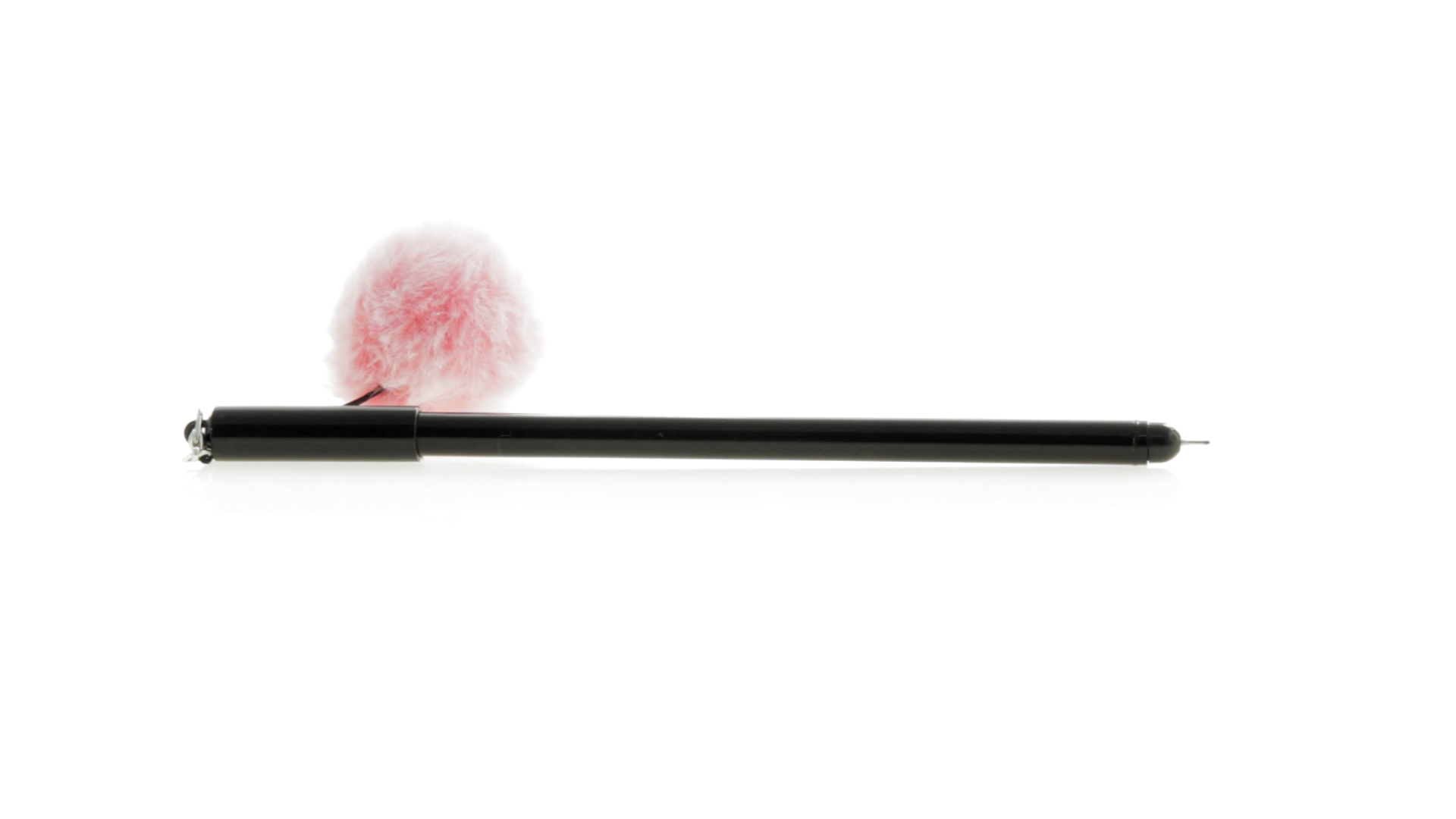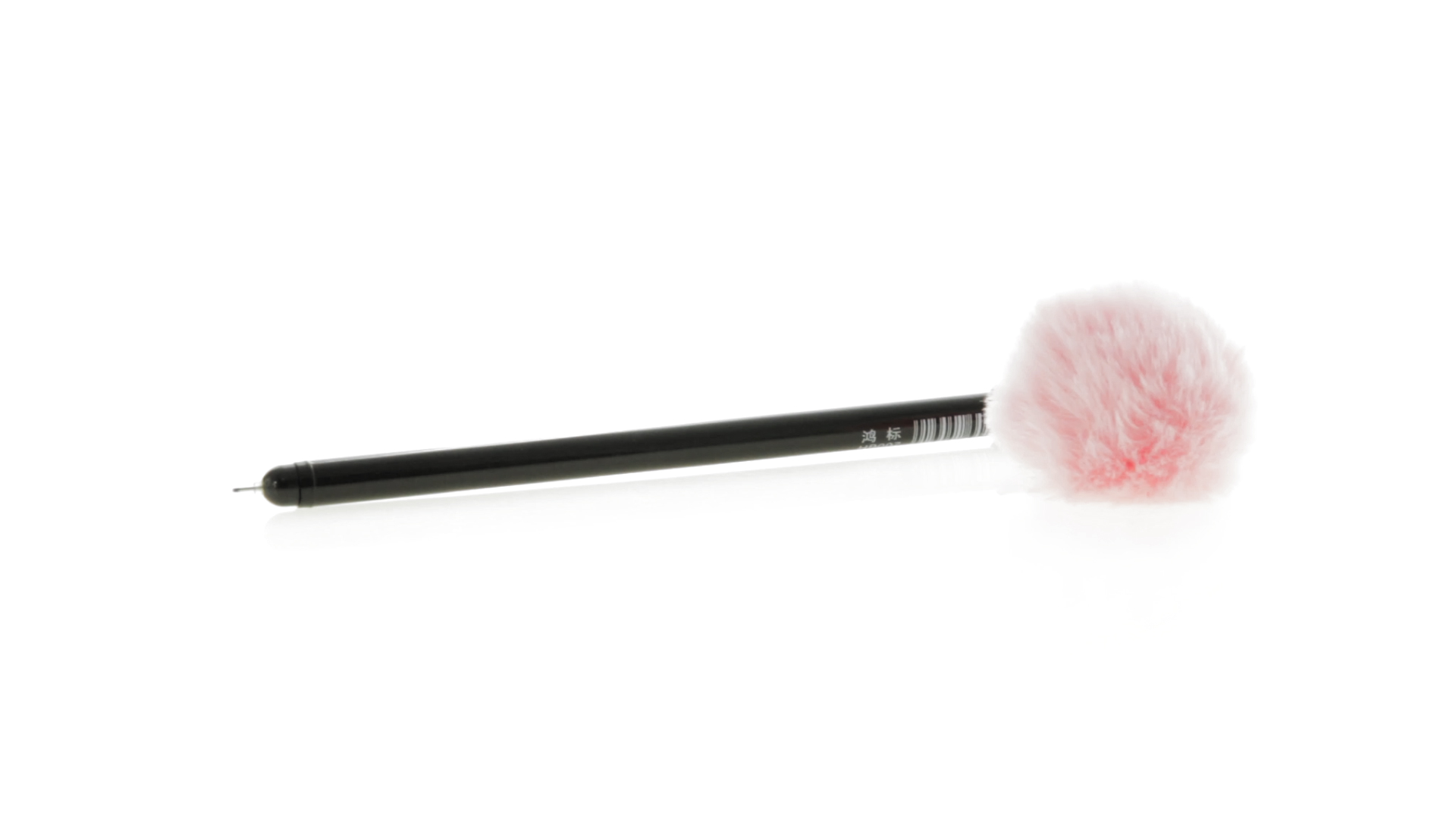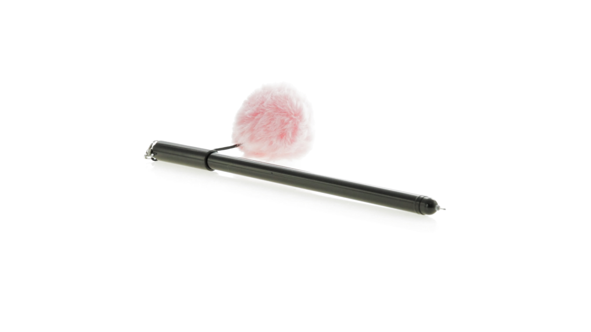 Auffälliger Kugelschreiber mit Kappe, Gel-Tinte und Bommel. Mit Gehäuse in mattem Schwarz und Bommel in Weiss oder Rosa. Jumbo-Patrone mit blauer Tinte.