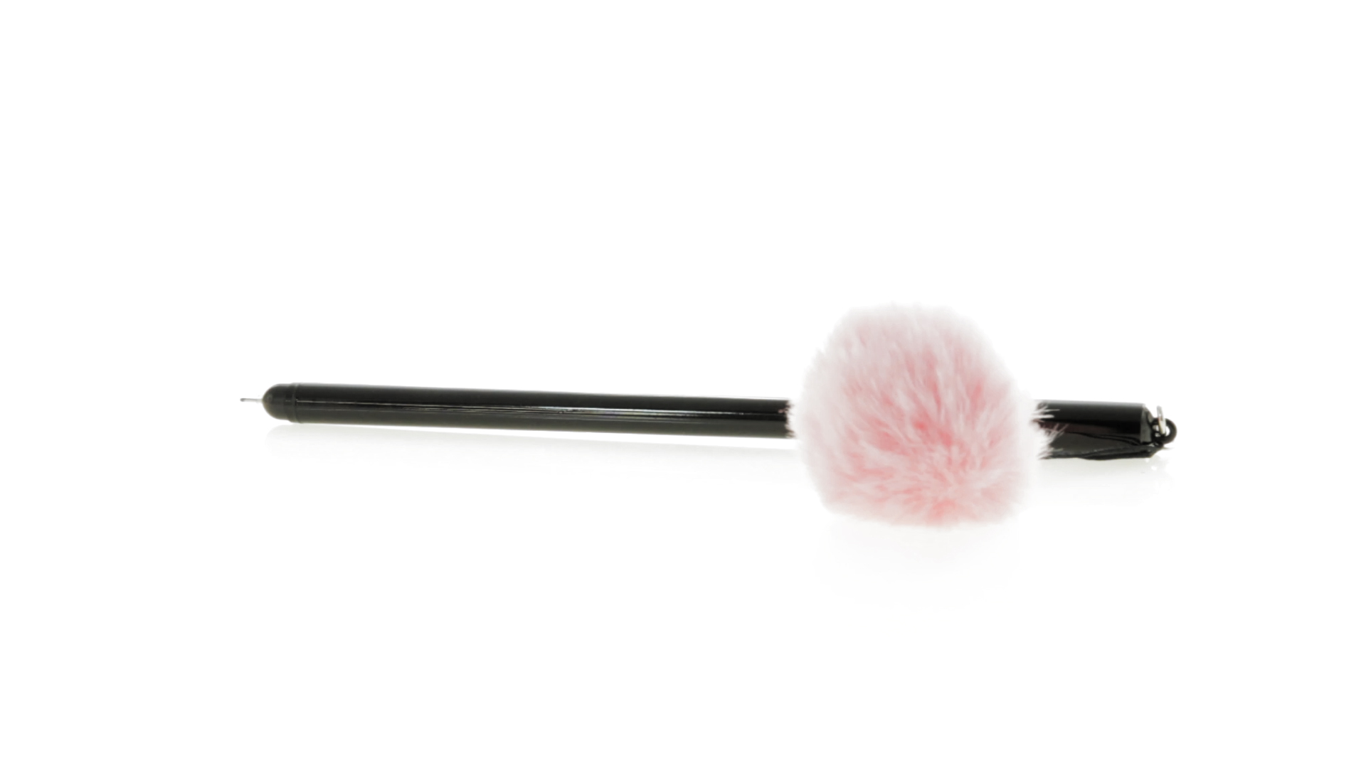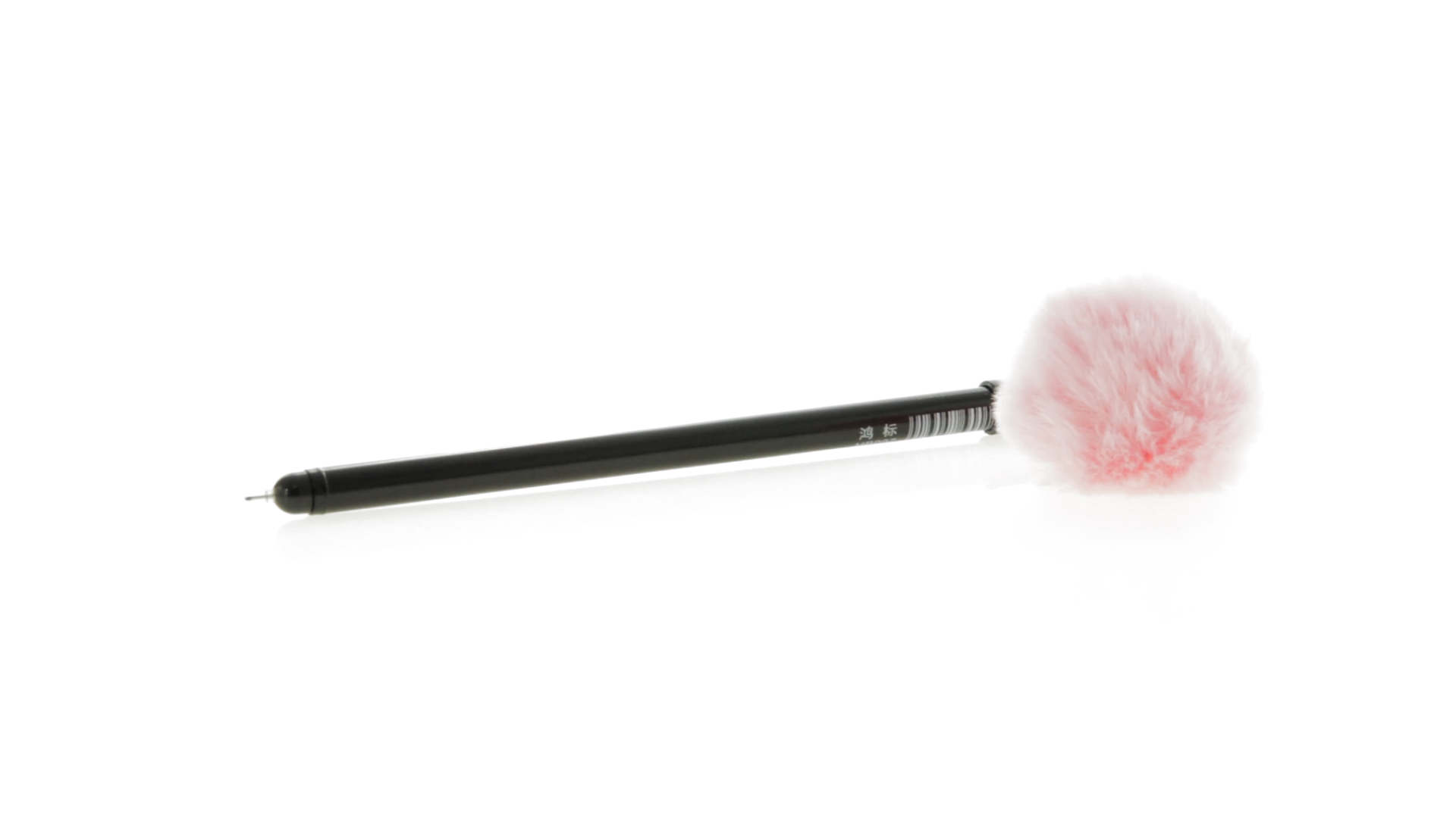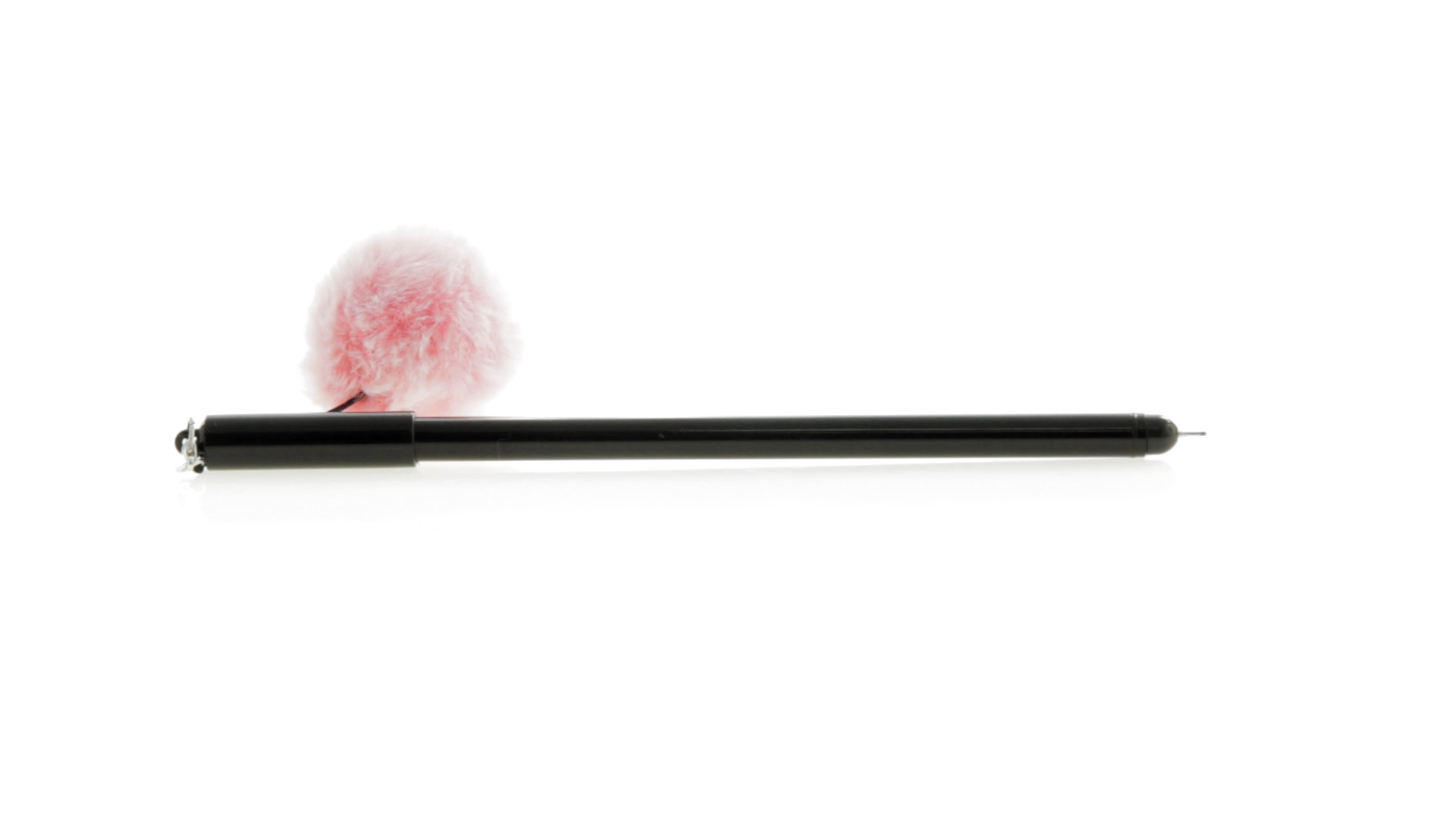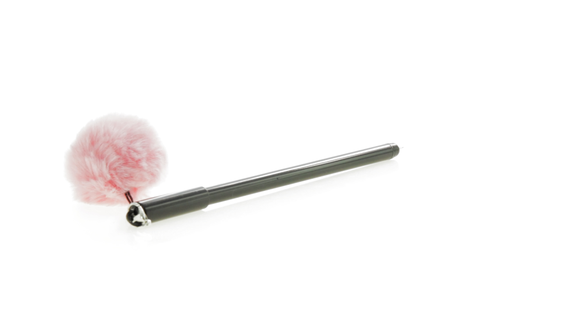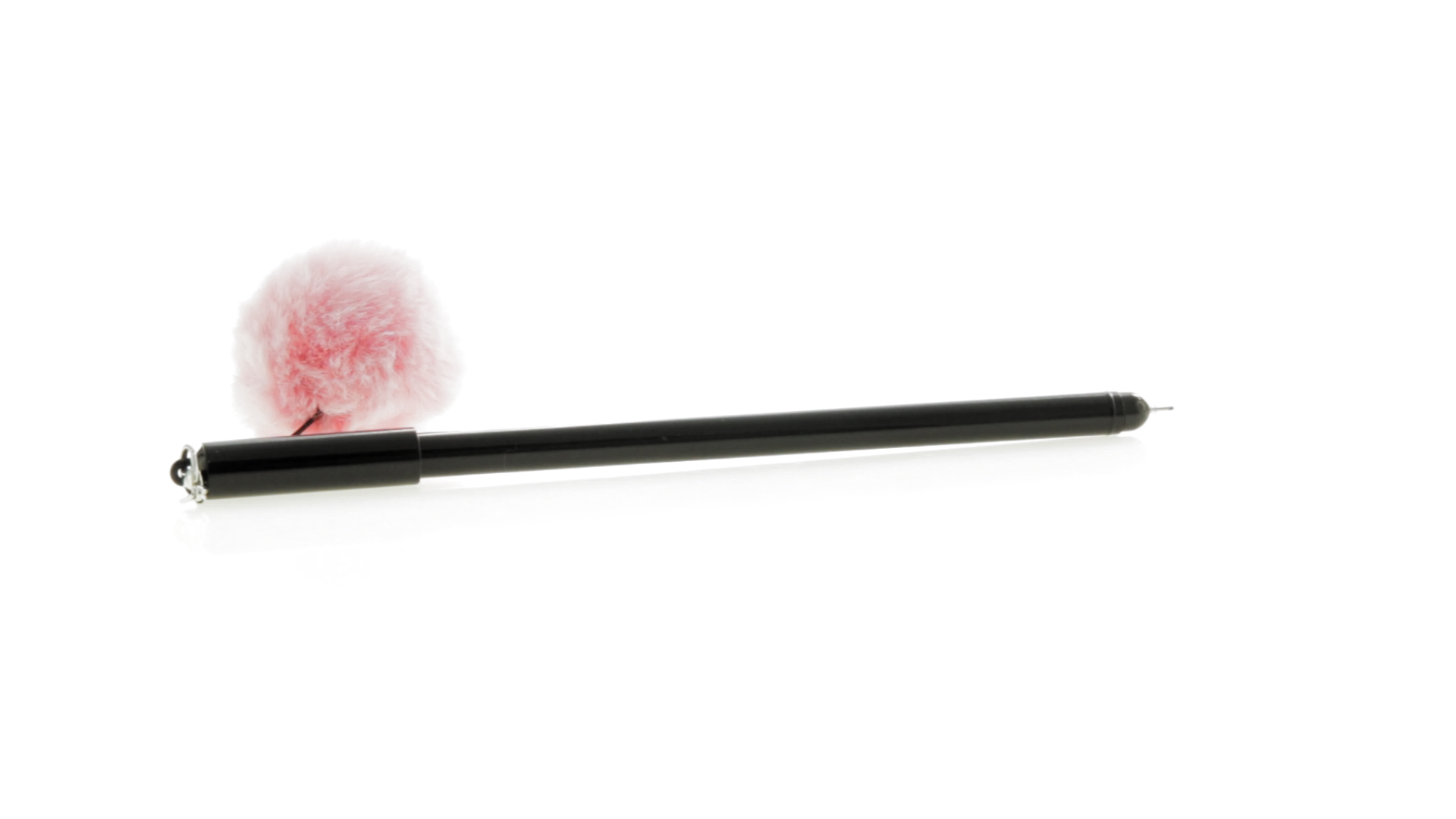 Auffälliger Kugelschreiber mit Kappe, Gel-Tinte und Bommel. Mit Gehäuse in mattem Schwarz und Bommel in Weiss oder Rosa. Jumbo-Patrone mit blauer Tinte.