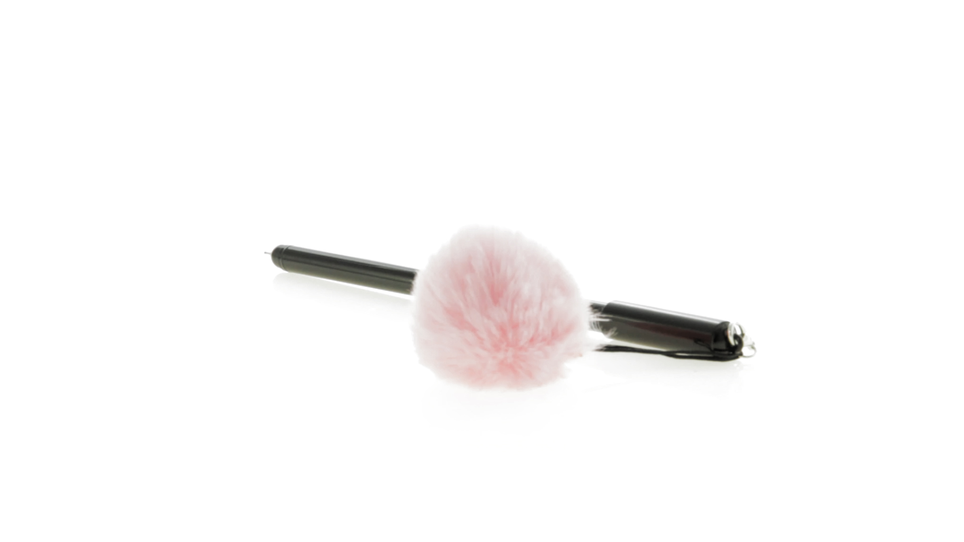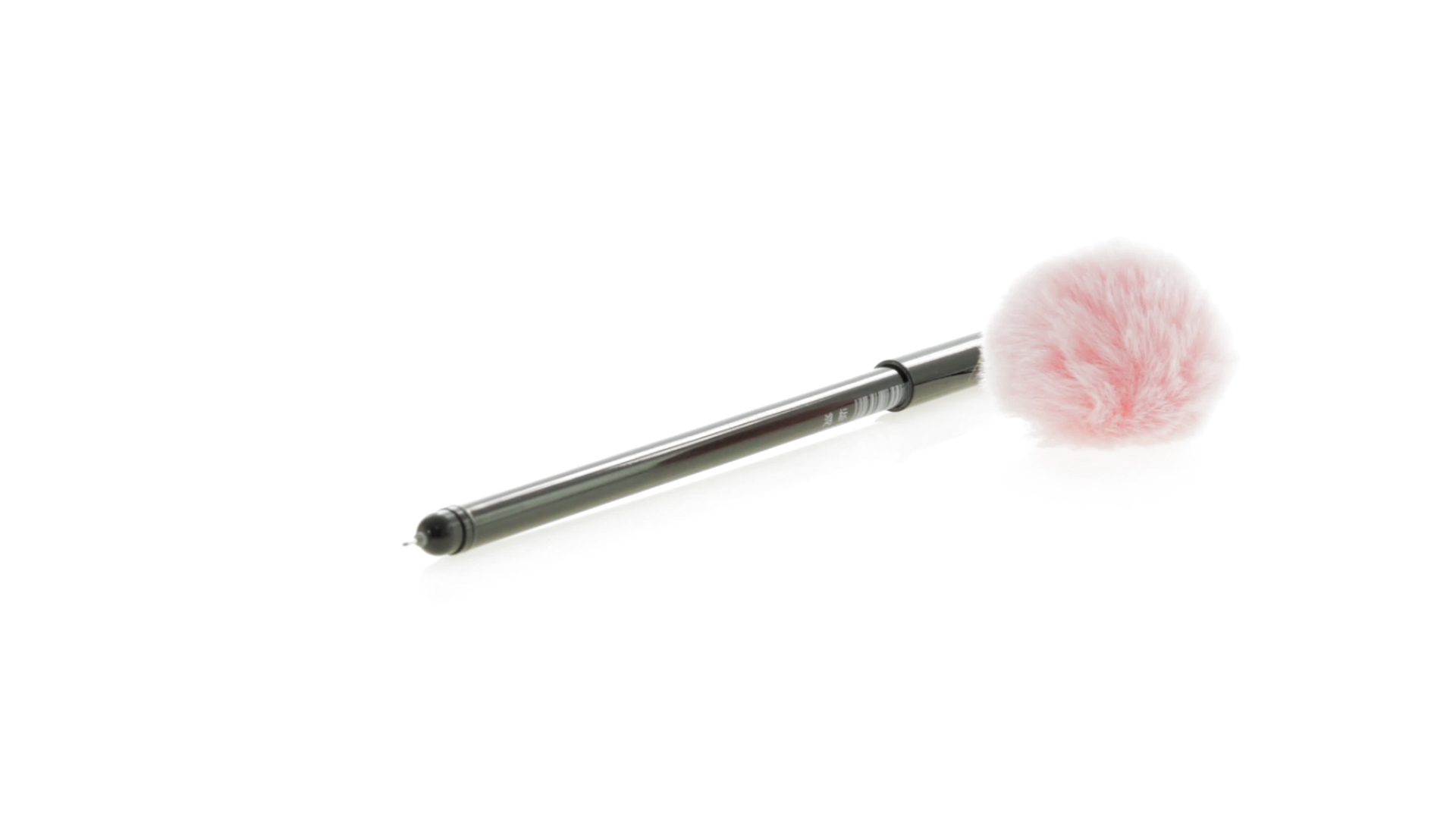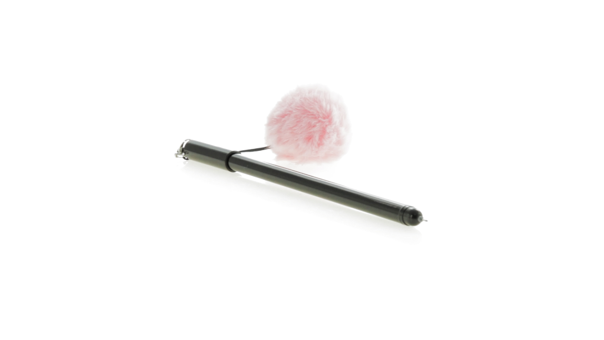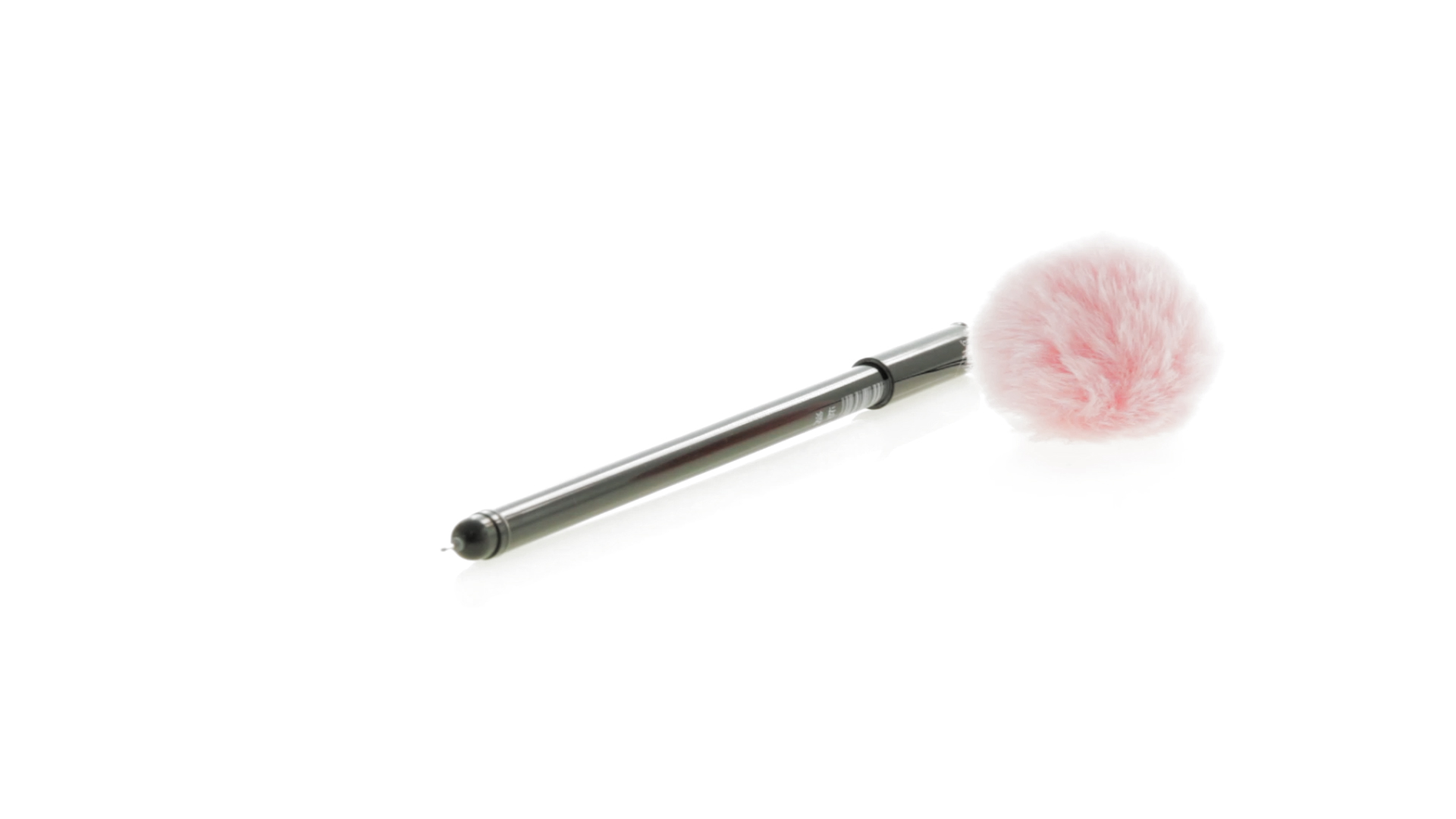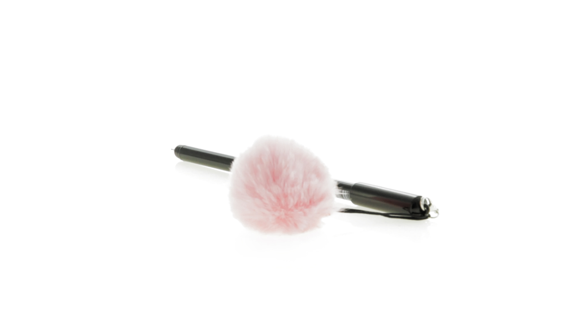 Auffälliger Kugelschreiber mit Kappe, Gel-Tinte und Bommel. Mit Gehäuse in mattem Schwarz und Bommel in Weiss oder Rosa. Jumbo-Patrone mit blauer Tinte.