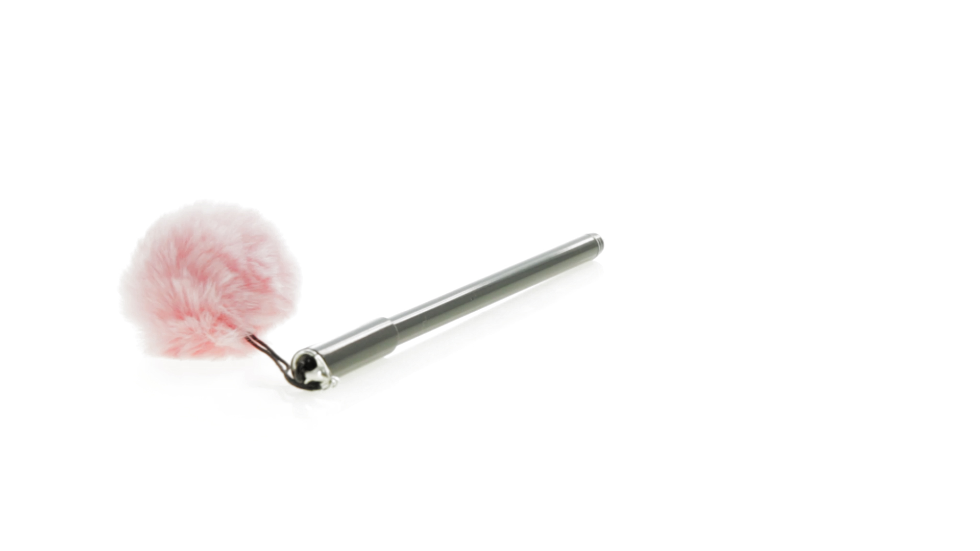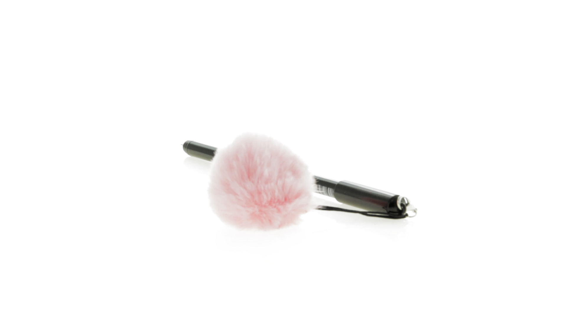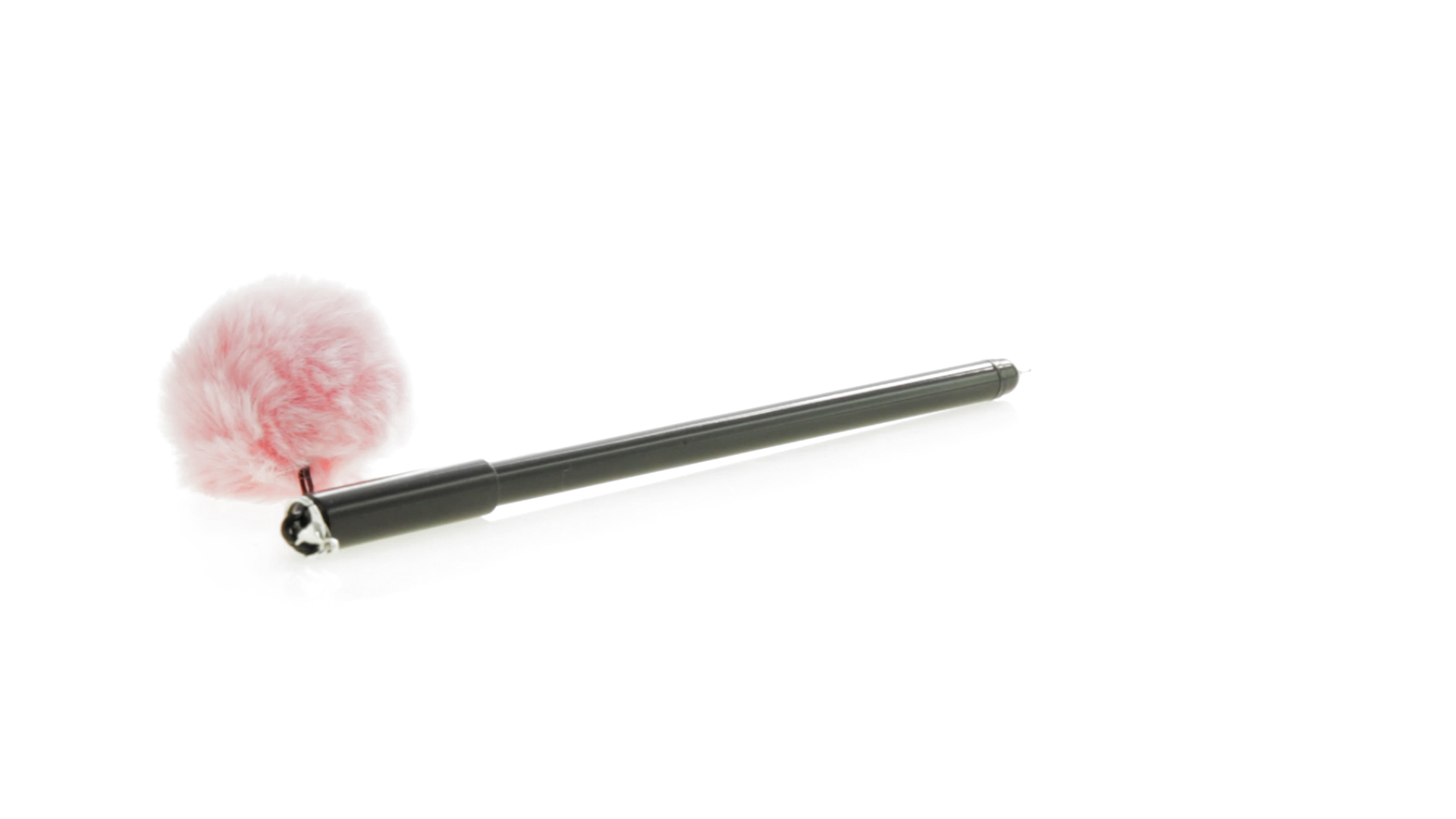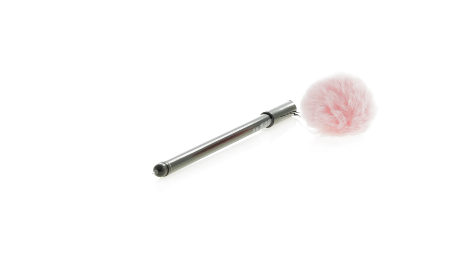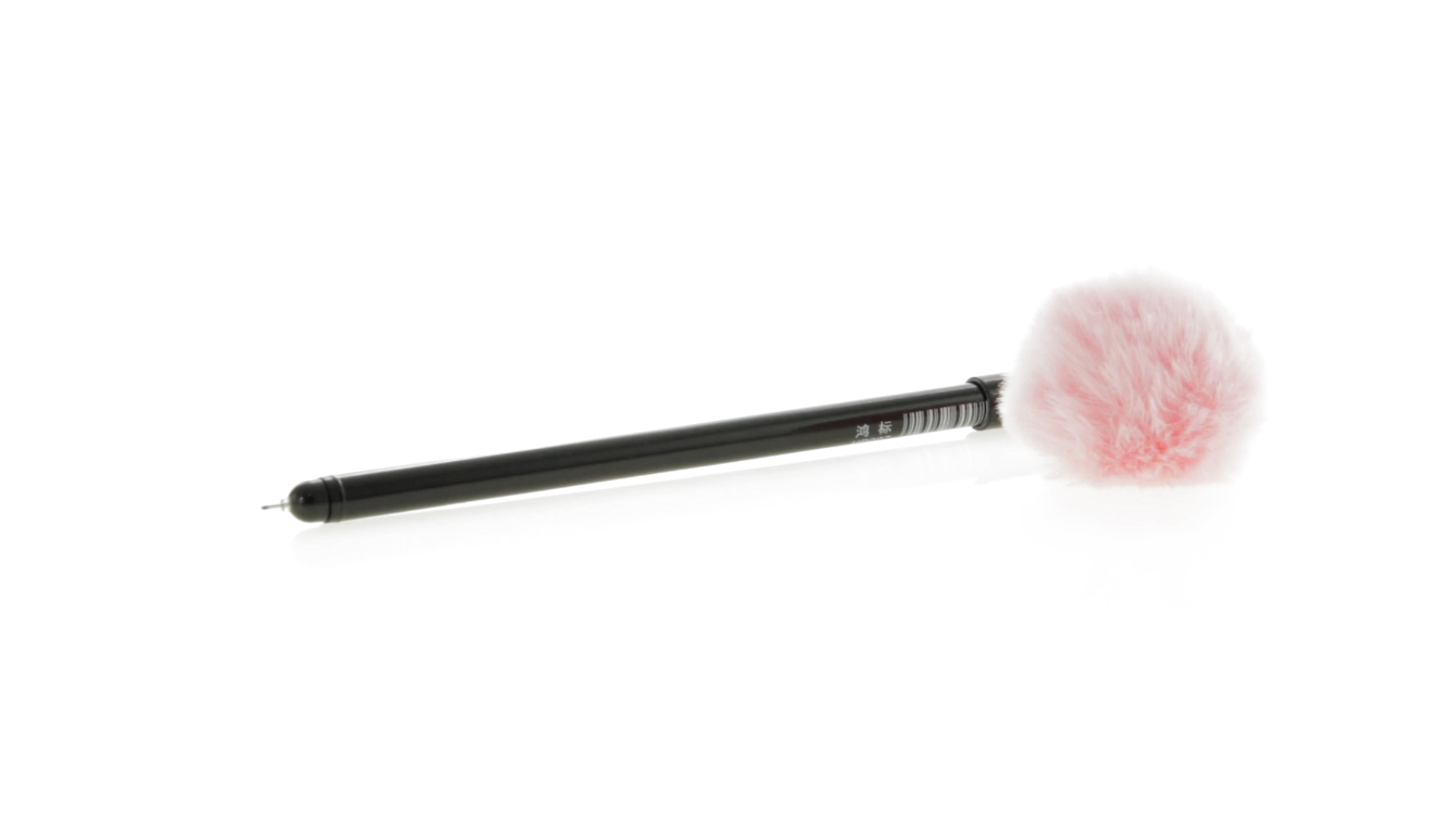 Auffälliger Kugelschreiber mit Kappe, Gel-Tinte und Bommel. Mit Gehäuse in mattem Schwarz und Bommel in Weiss oder Rosa. Jumbo-Patrone mit blauer Tinte.