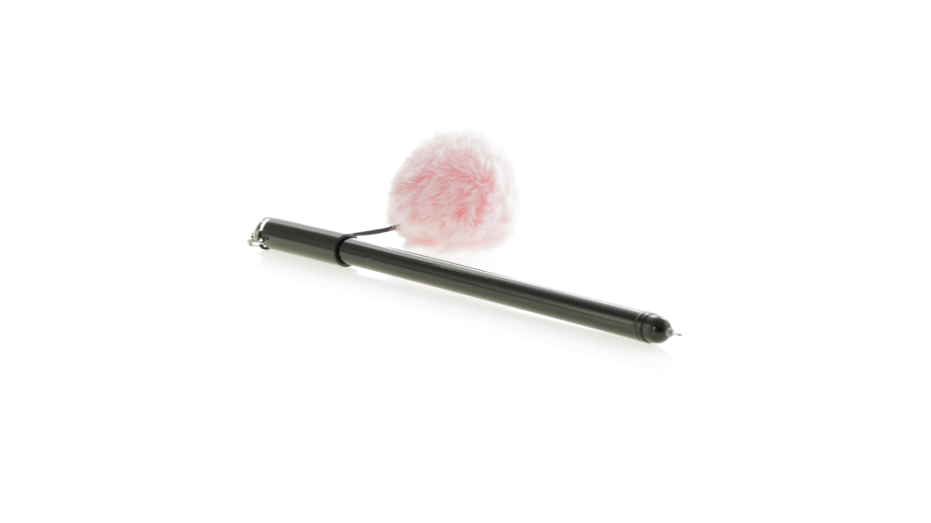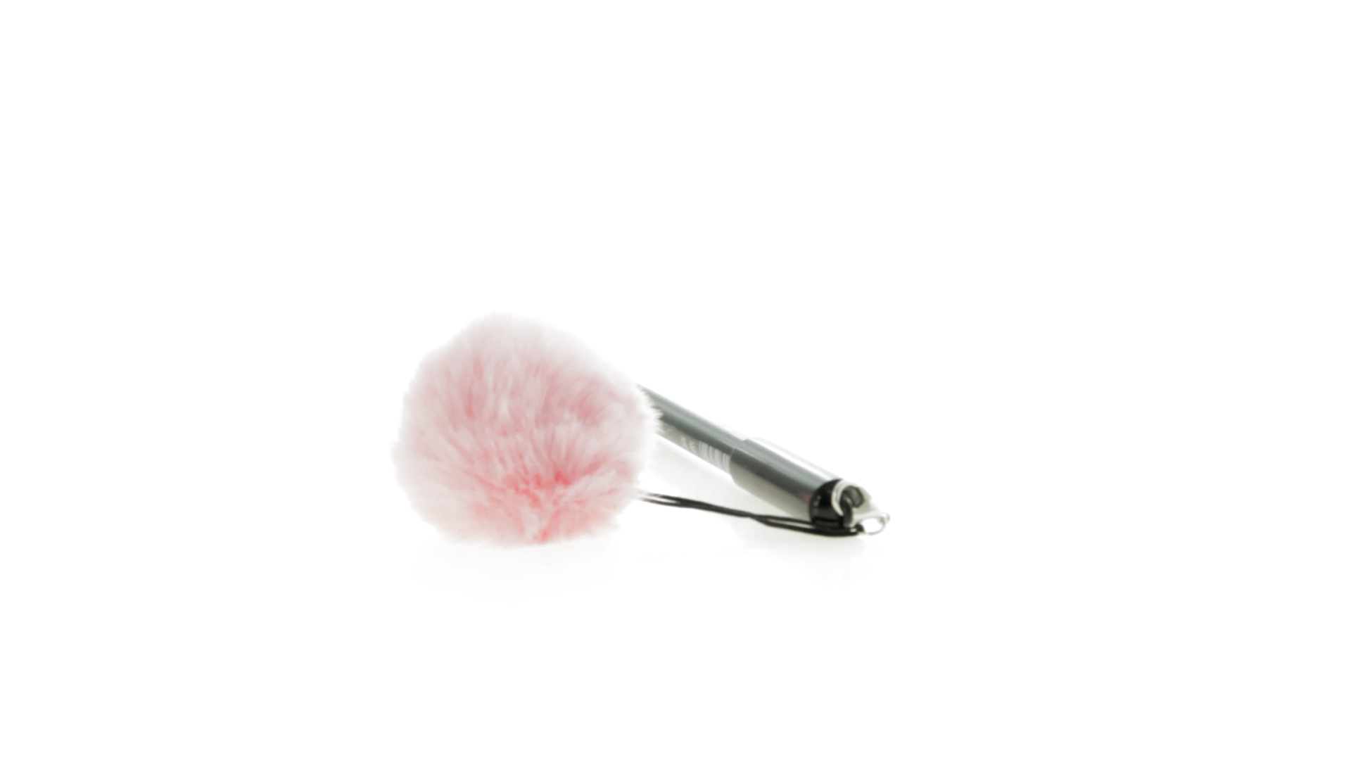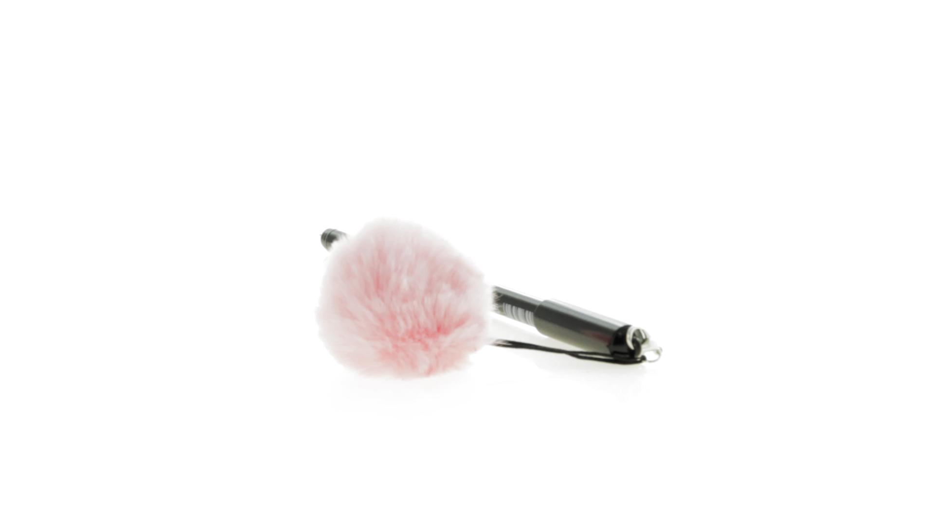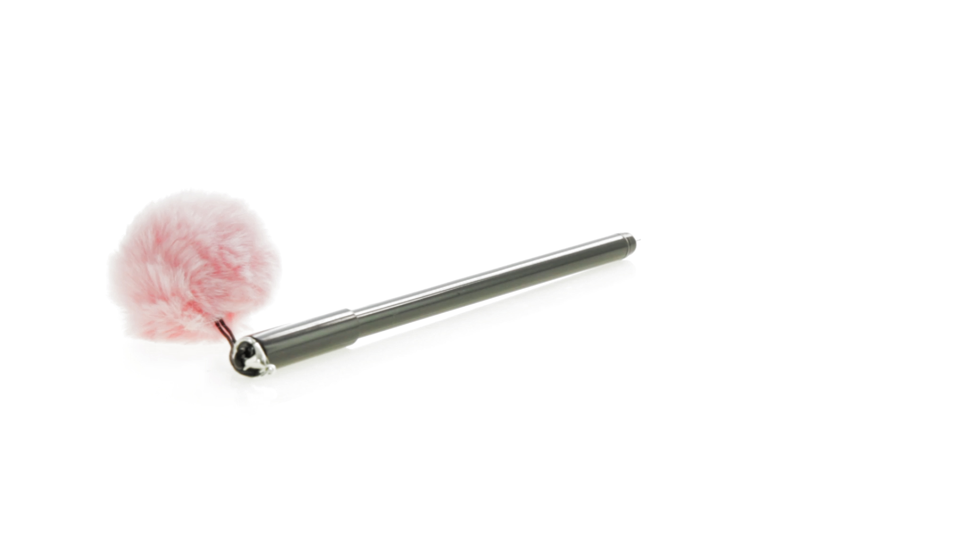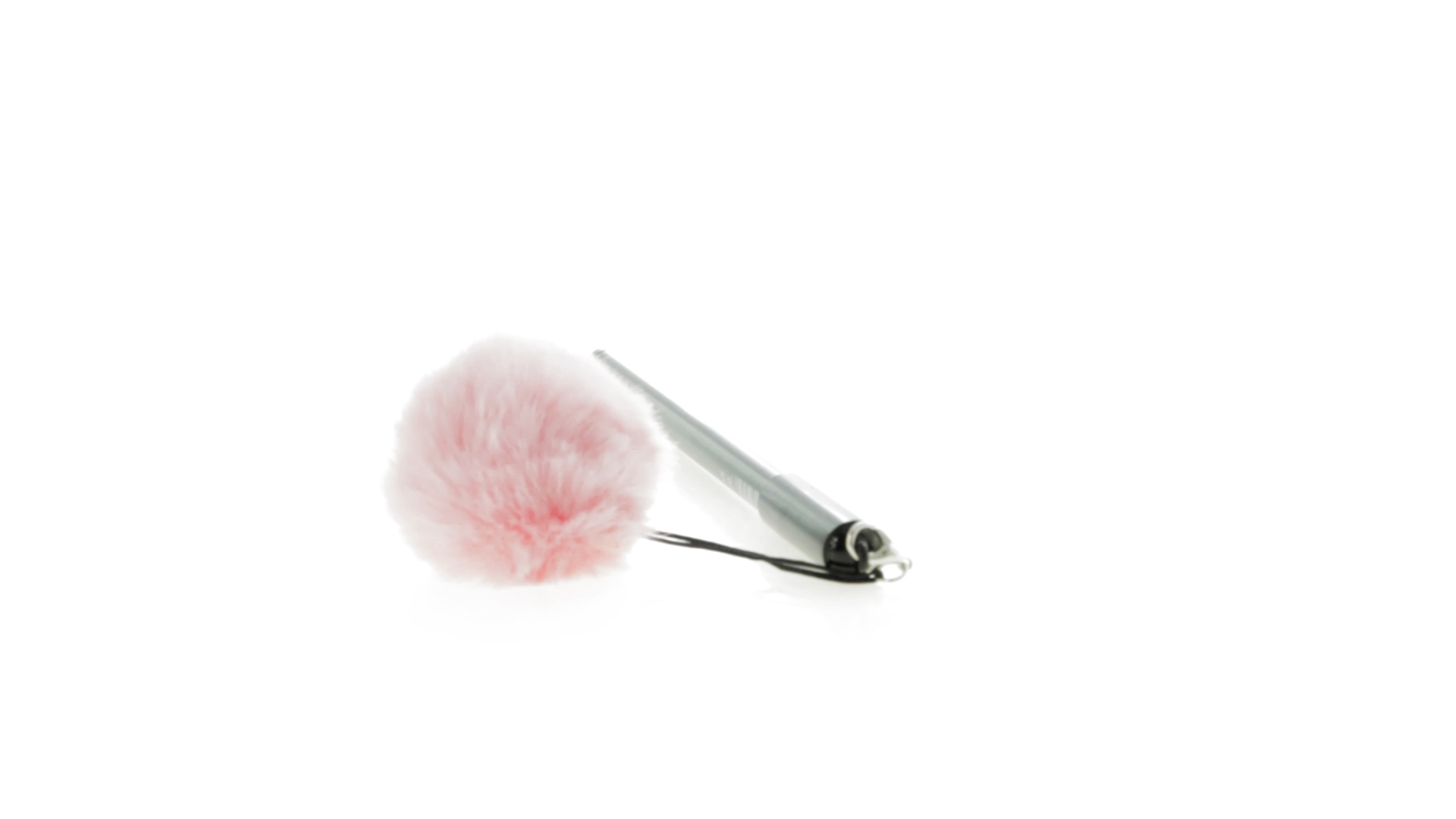 Auffälliger Kugelschreiber mit Kappe, Gel-Tinte und Bommel. Mit Gehäuse in mattem Schwarz und Bommel in Weiss oder Rosa. Jumbo-Patrone mit blauer Tinte.