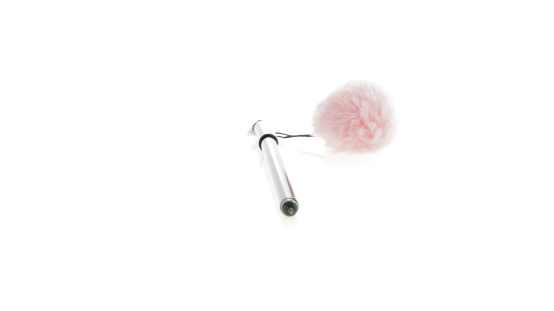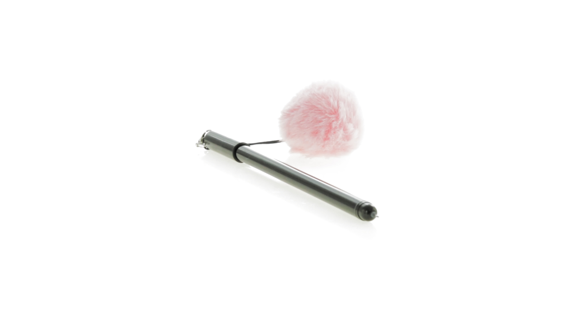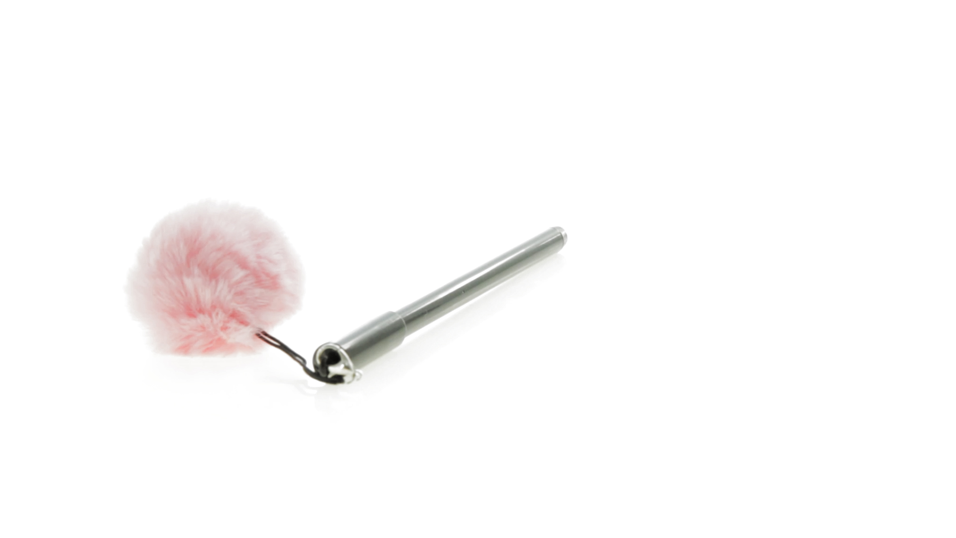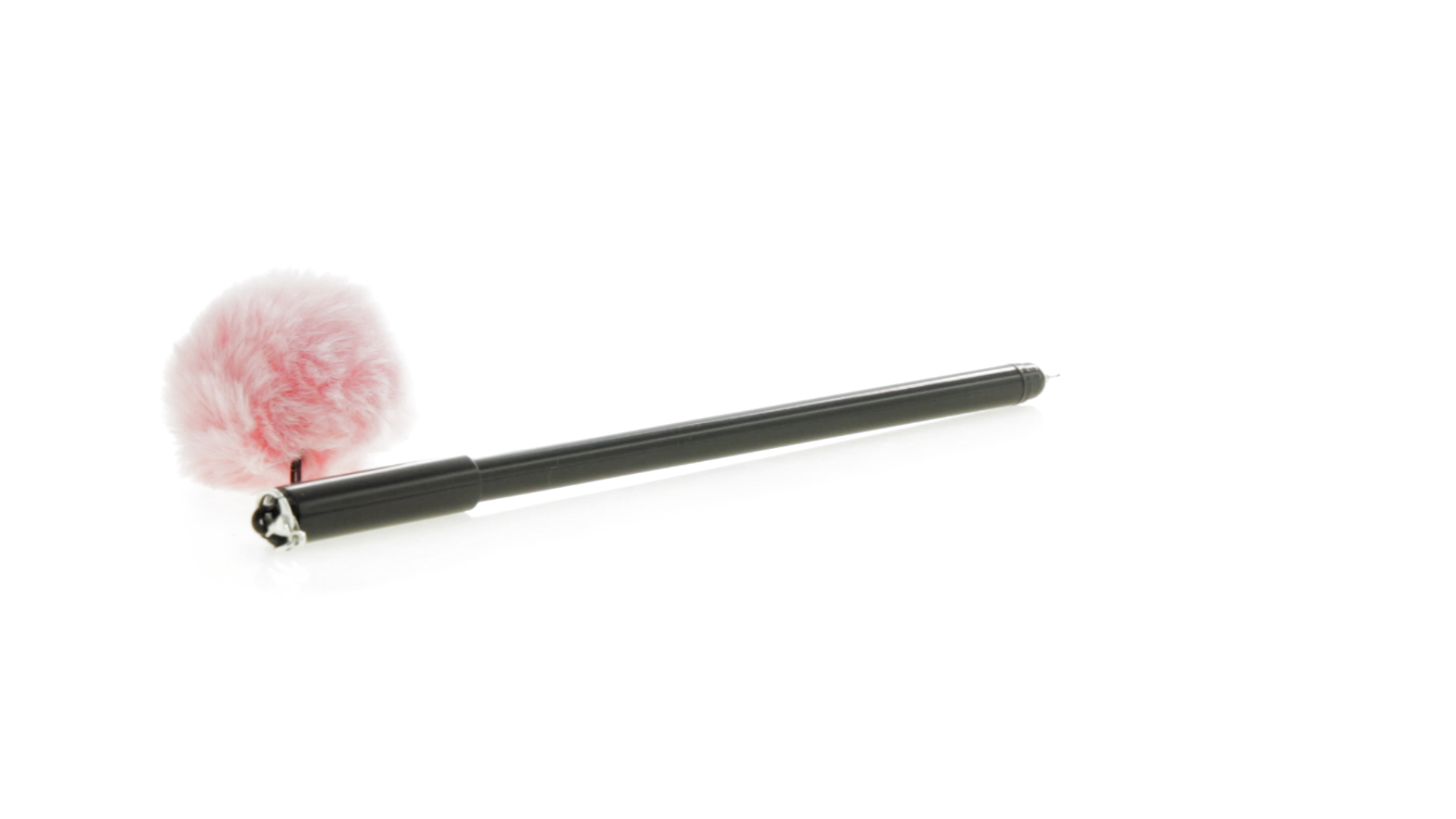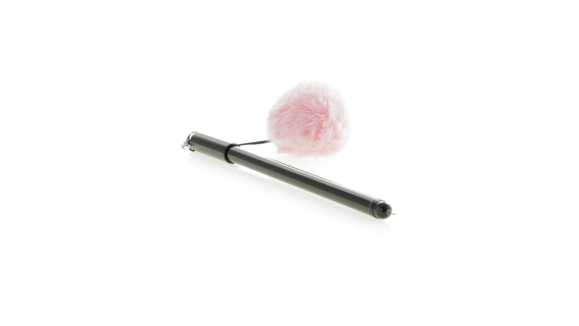 Auffälliger Kugelschreiber mit Kappe, Gel-Tinte und Bommel. Mit Gehäuse in mattem Schwarz und Bommel in Weiss oder Rosa. Jumbo-Patrone mit blauer Tinte.