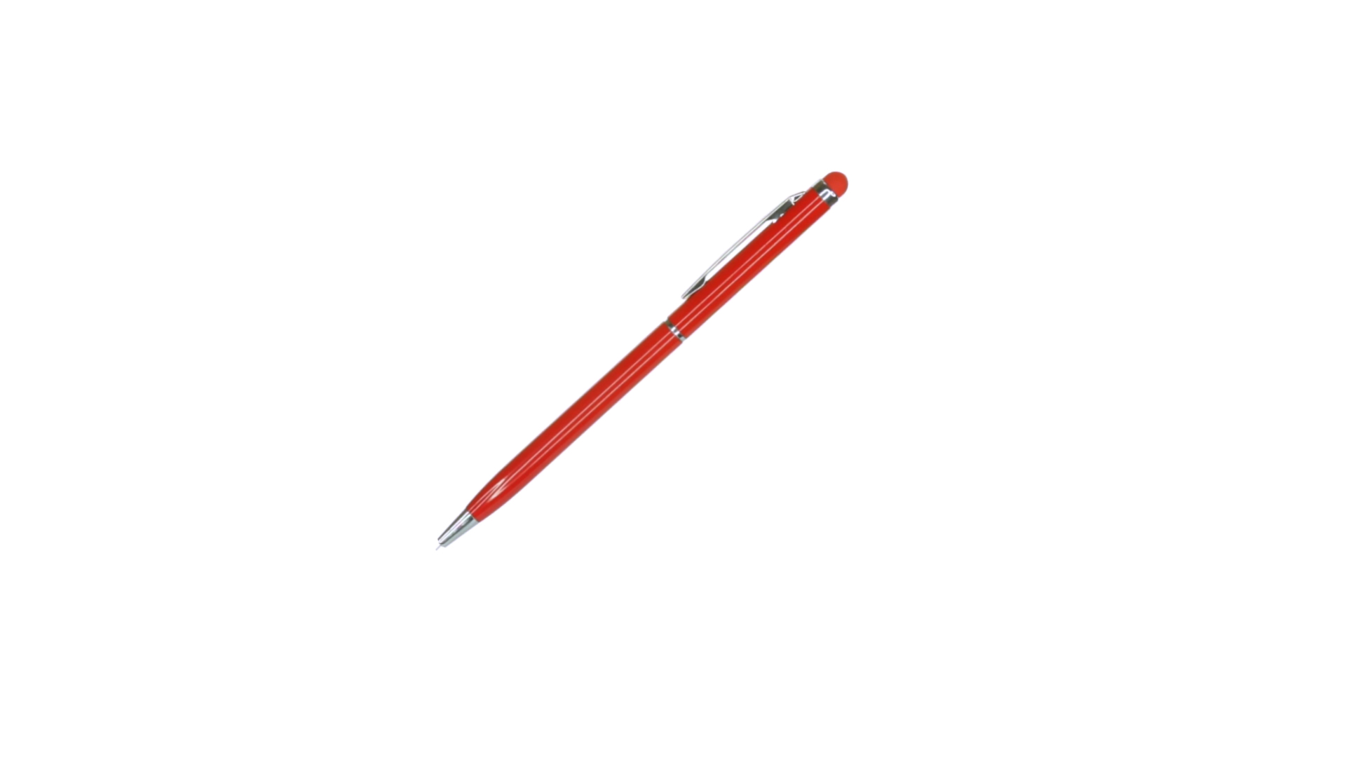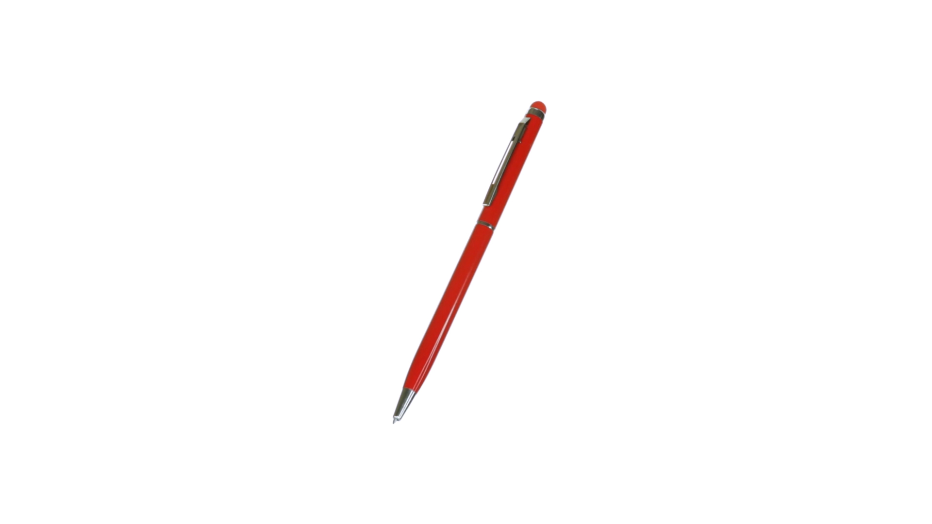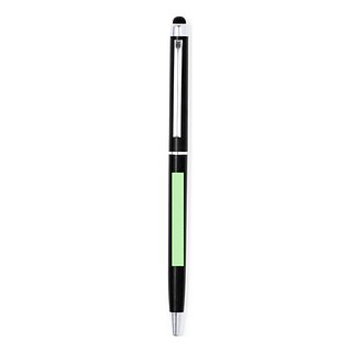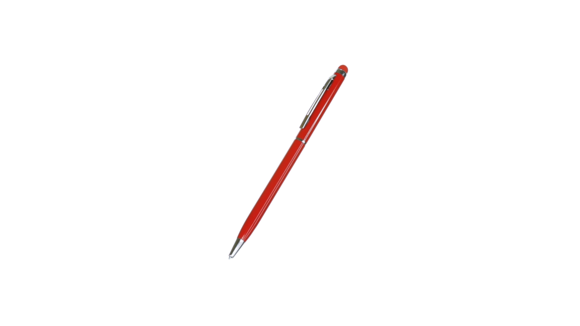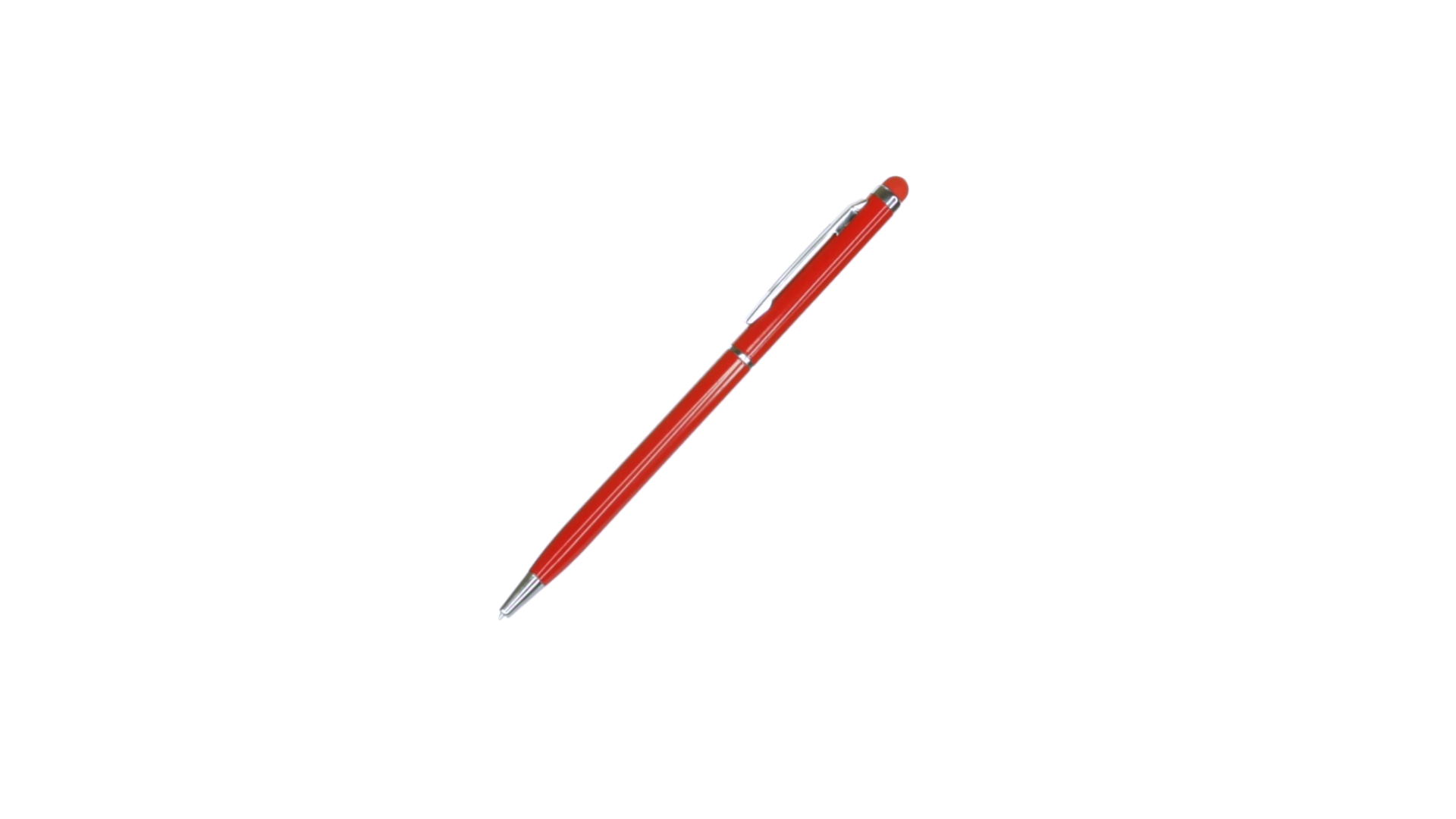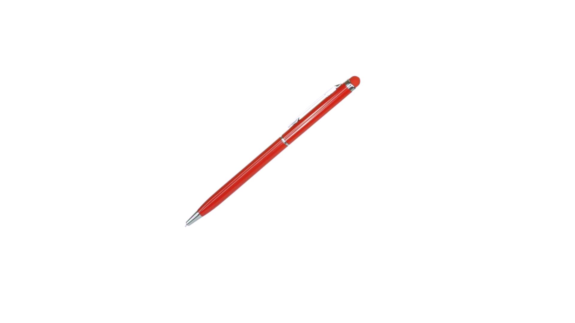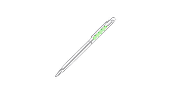 Dreh-Kugelschreiber mit integriertem Stylus und ultradünnem Gehäuse aus Aluminium mit geschmeidigem Metallic-Finish in verschiedenen Farben und farblich passendem Stylus. Kontrastdetails und Ringe in Silber. Blaue Tinte.
