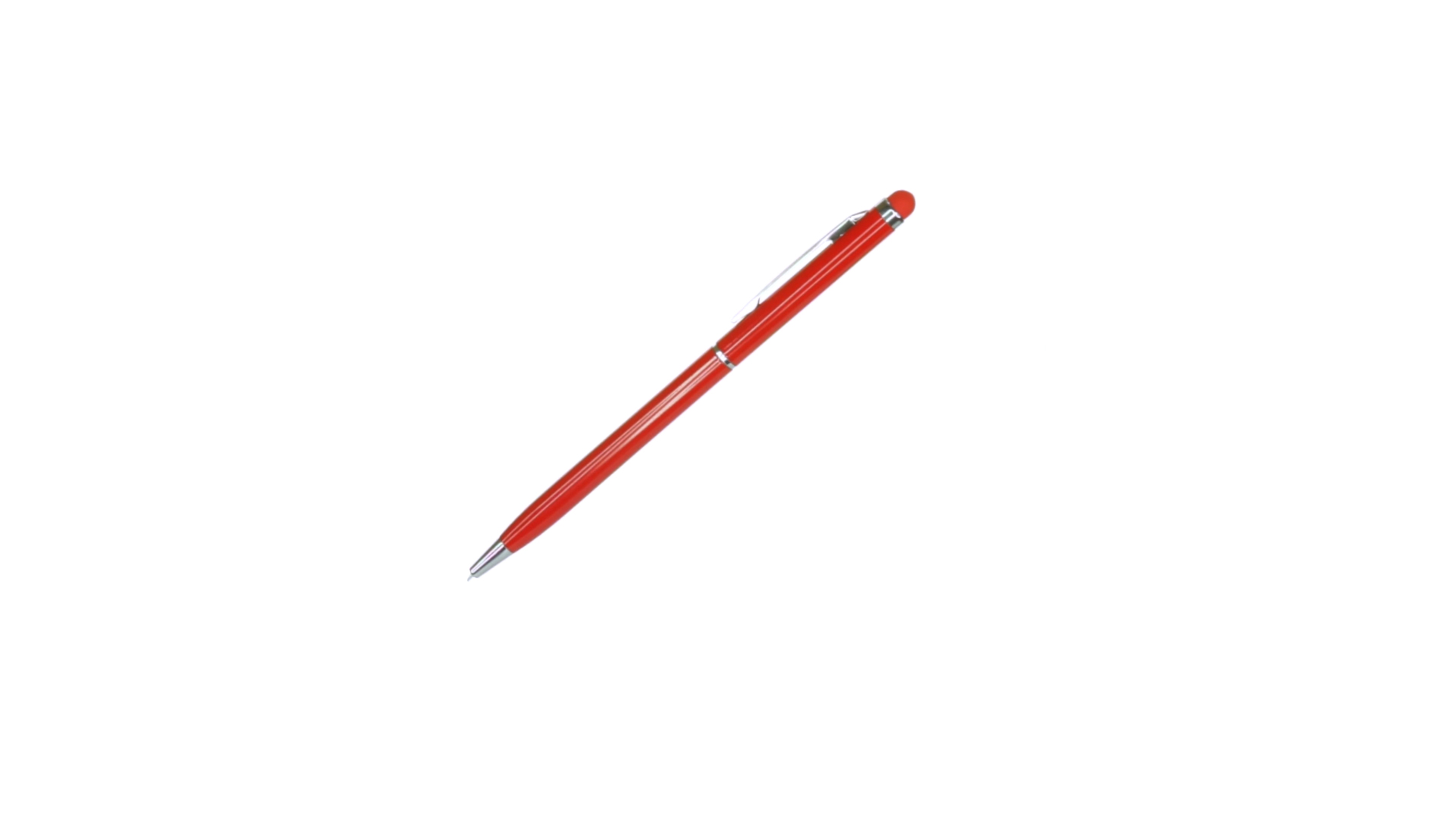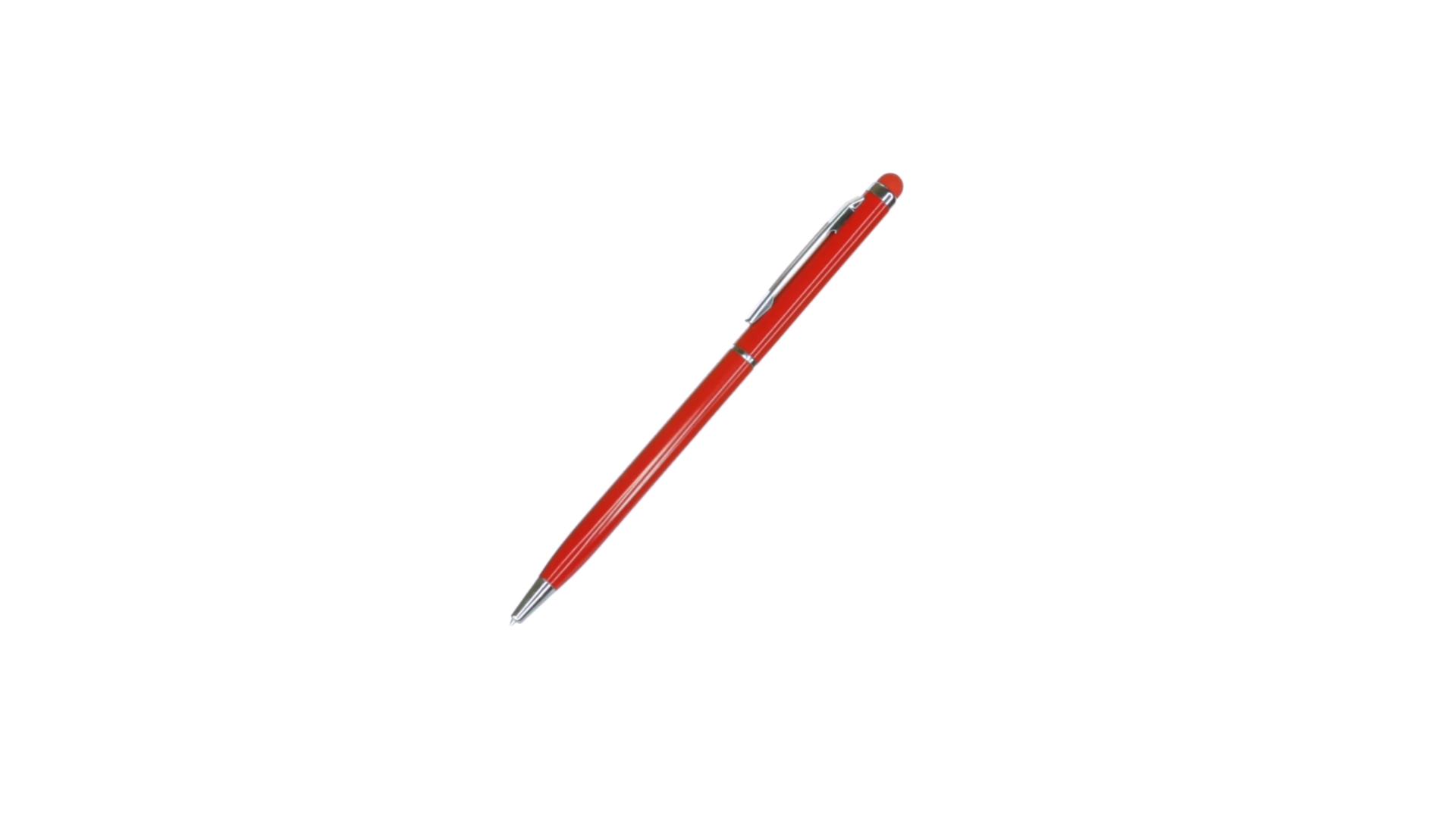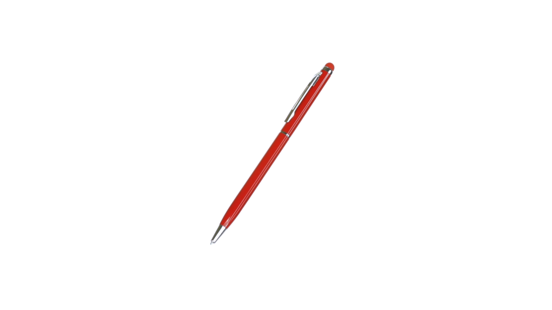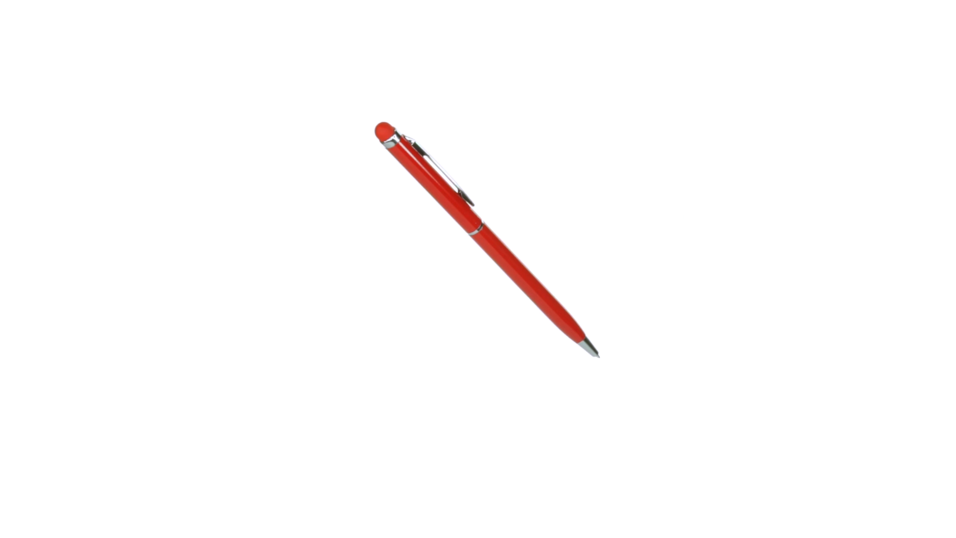 Dreh-Kugelschreiber mit integriertem Stylus und ultradünnem Gehäuse aus Aluminium mit geschmeidigem Metallic-Finish in verschiedenen Farben und farblich passendem Stylus. Kontrastdetails und Ringe in Silber. Blaue Tinte.