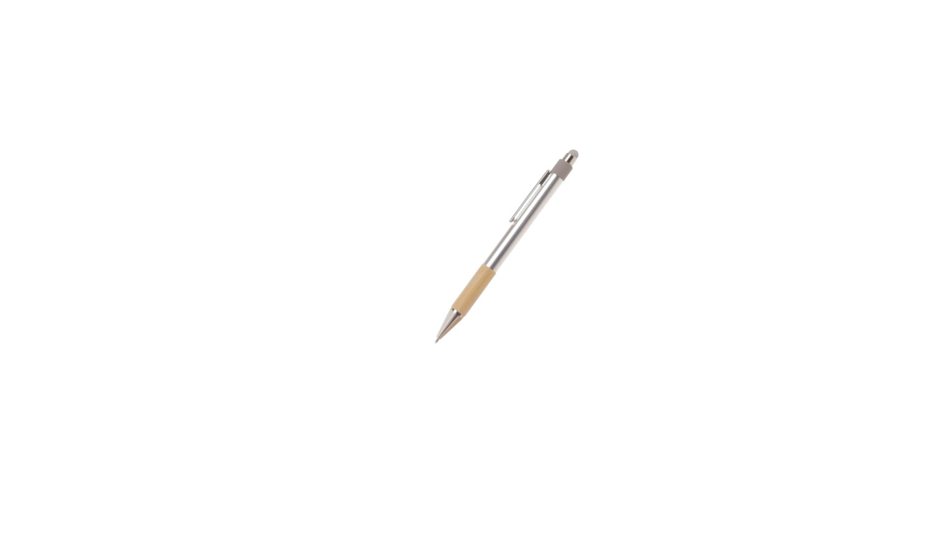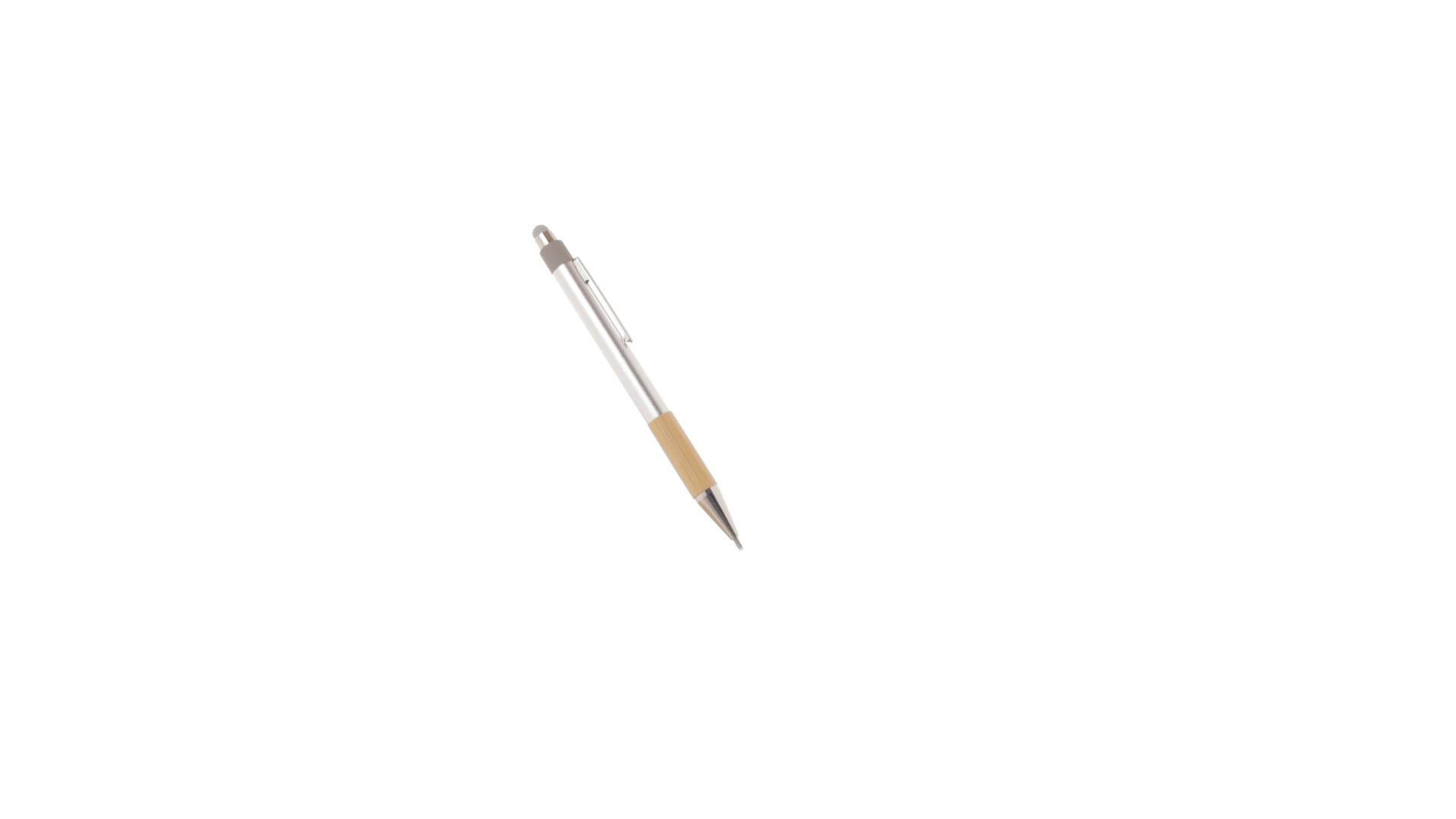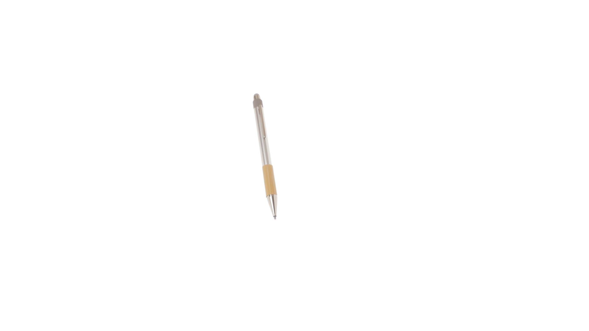 Stilvoller Kugelschreiber aus recyceltem Aluminium und Bambus mit Druckknopfmechanismus. Robuster Schaft aus recyceltem Aluminium mit mattem Finish, mit Bambusgriff und grauem Zeiger oben. Metallclip, mit blauer Tinte und mit Grossraummine. Präsentiert in einer einzelnen recycelten Tasche.