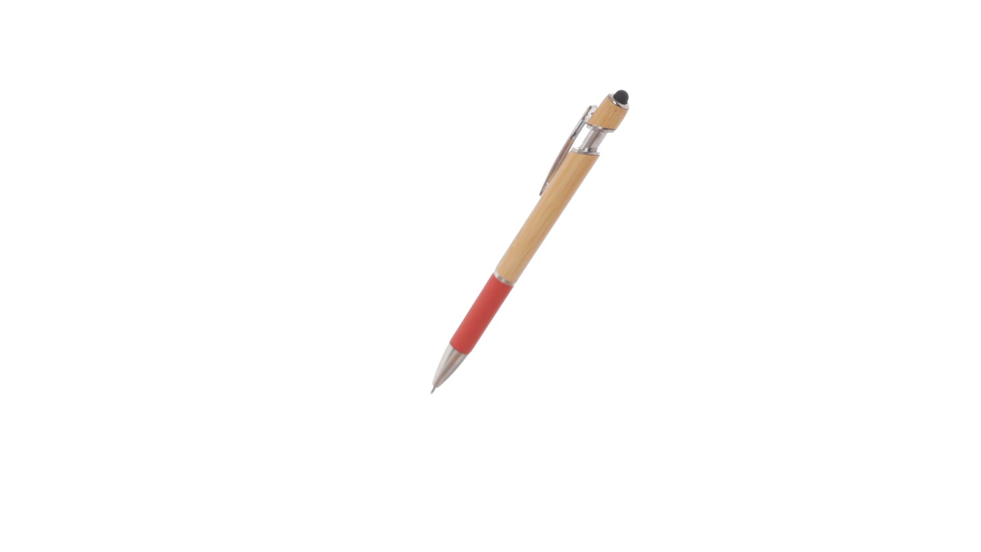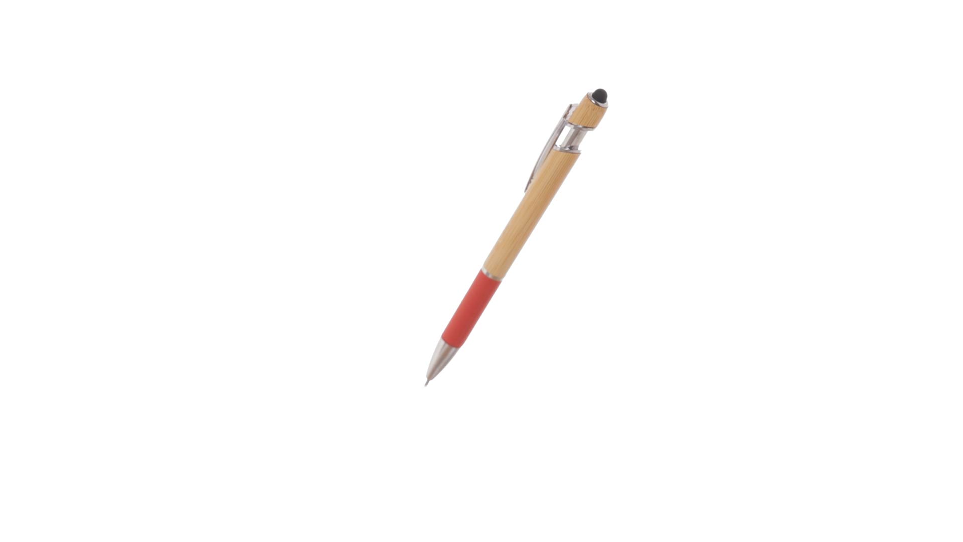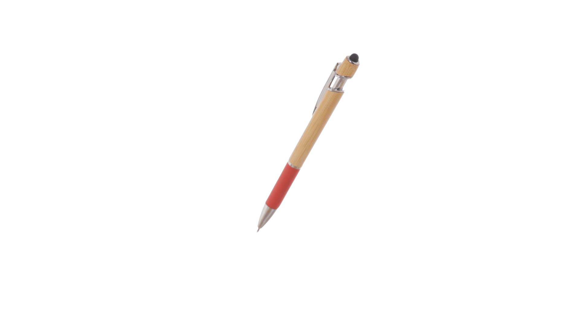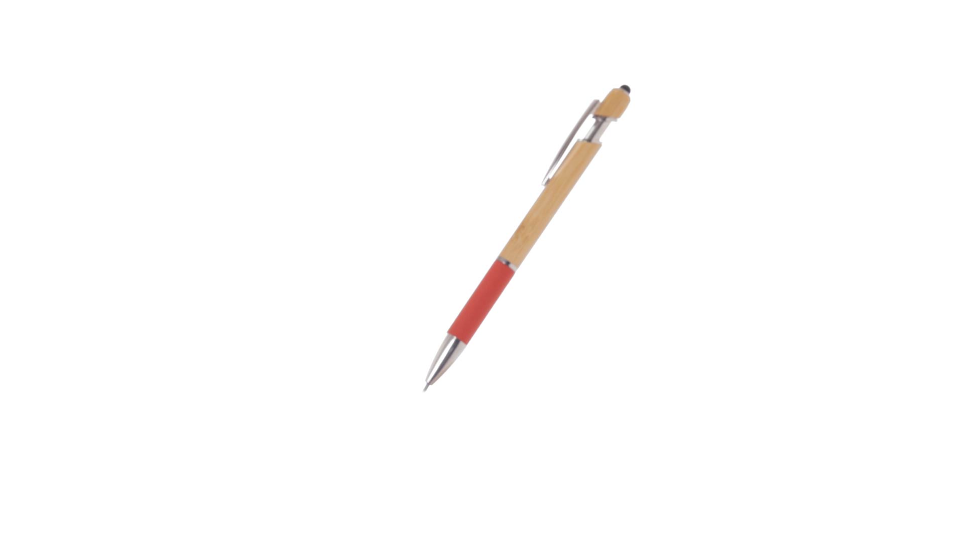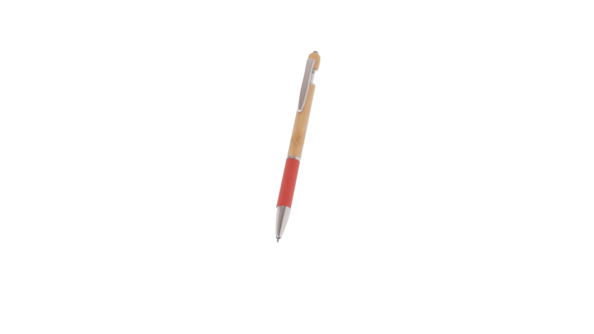 Kugelschreiberzeiger mit Bambusschaft. und Griff aus recyceltem Strukturkarton, in verschiedenen Farben. Oben schwarzer Zeiger, mit Metallclip und verchromten Beschlägen. Druckknopfmechanismus und blaue Tinte. Hergestellt aus pflanzlichen Bestandteilen, um die Verwendung natürlicher Rohstoffe zu fördern und Schadstoffemissionen zu reduzieren.