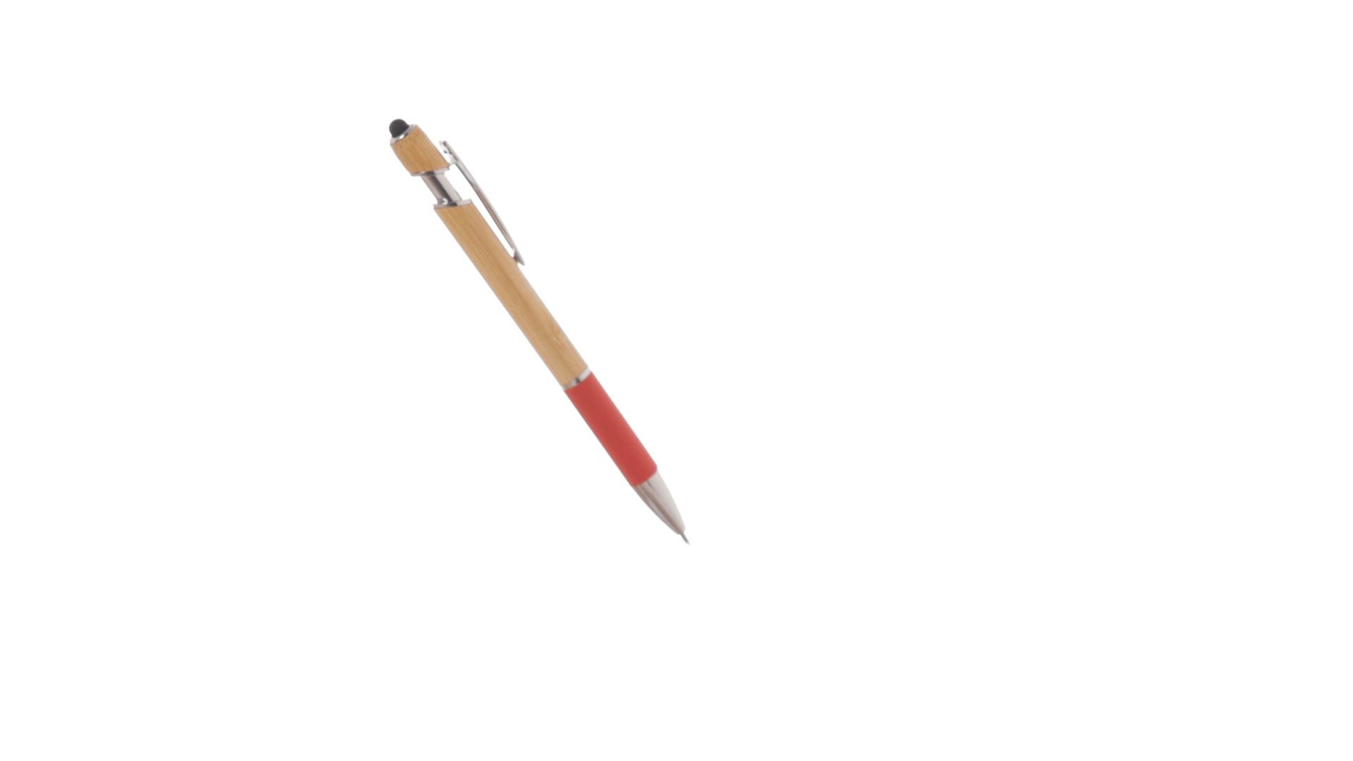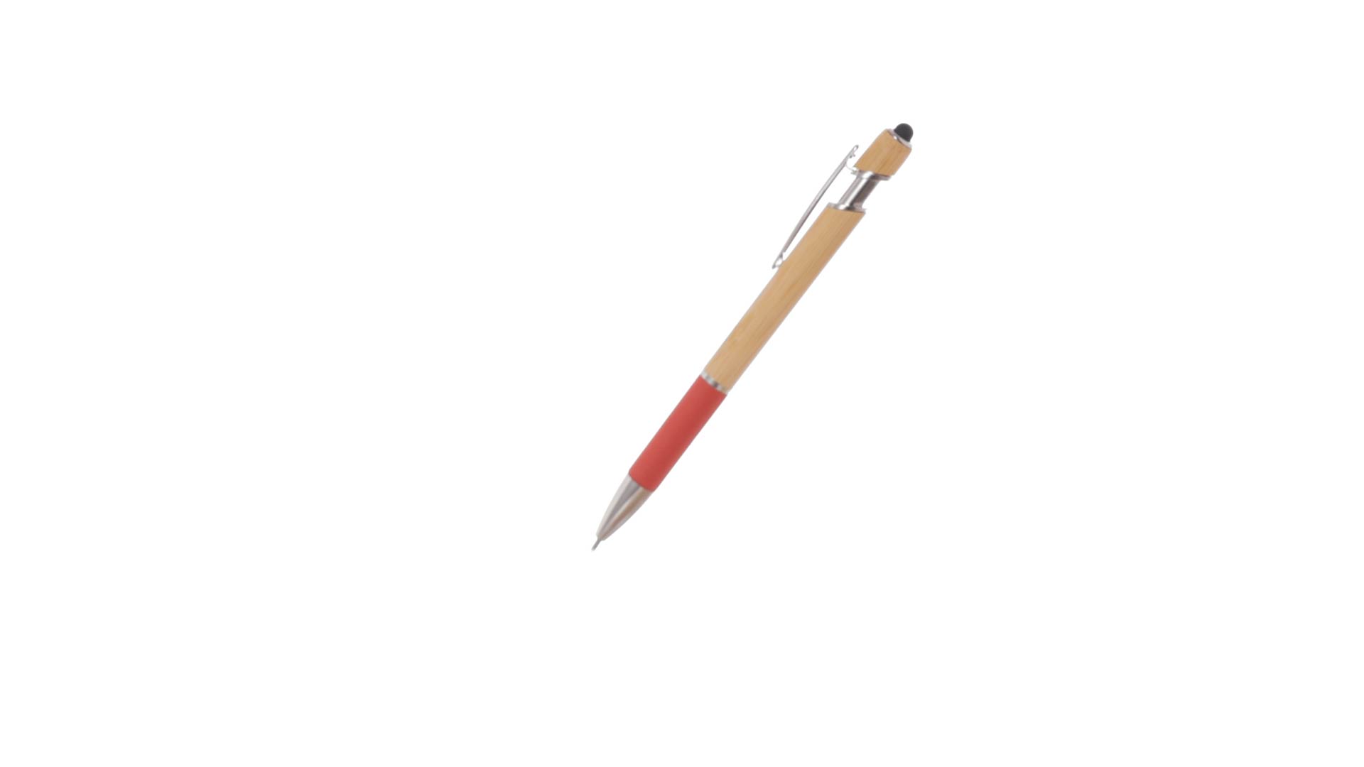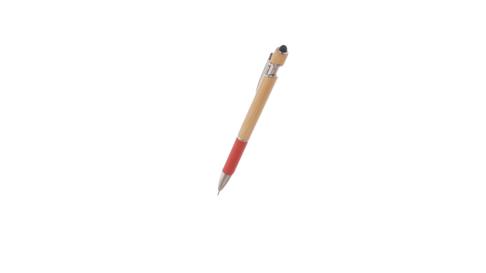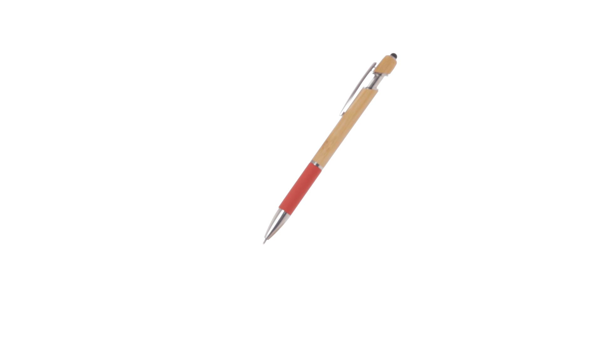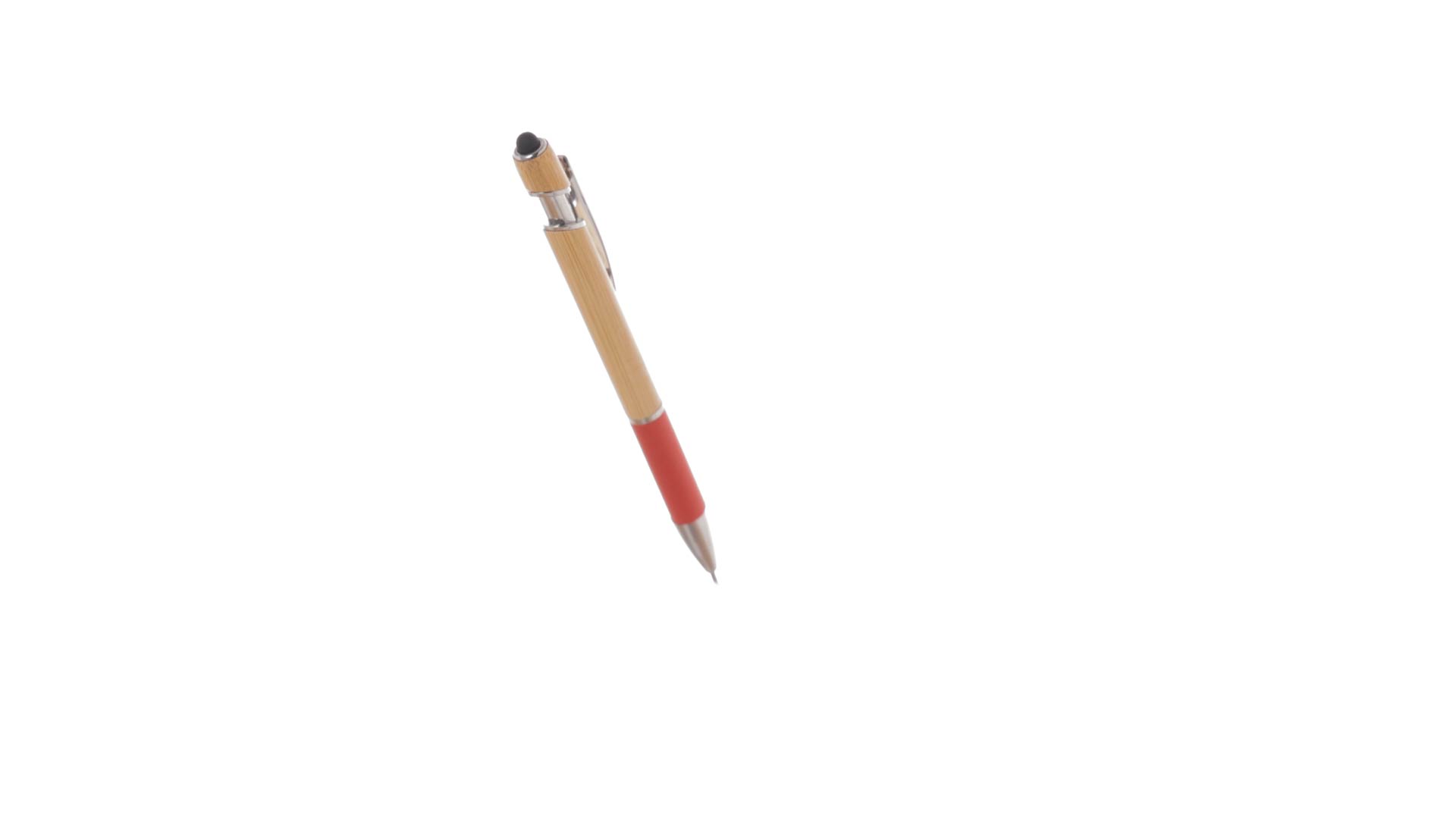Kugelschreiberzeiger mit Bambusschaft. und Griff aus recyceltem Strukturkarton, in verschiedenen Farben. Oben schwarzer Zeiger, mit Metallclip und verchromten Beschlägen. Druckknopfmechanismus und blaue Tinte. Hergestellt aus pflanzlichen Bestandteilen, um die Verwendung natürlicher Rohstoffe zu fördern und Schadstoffemissionen zu reduzieren.